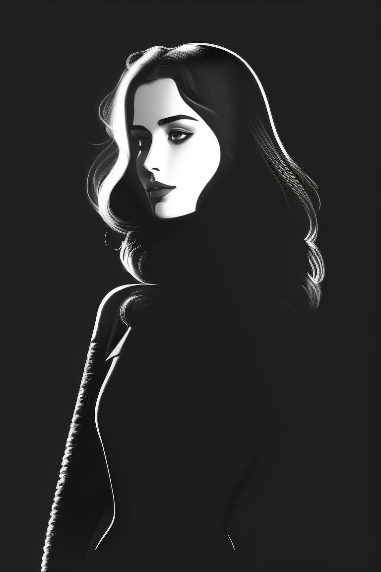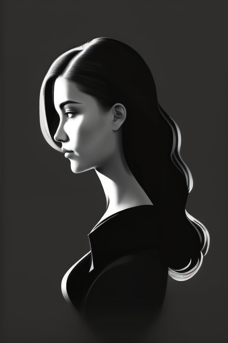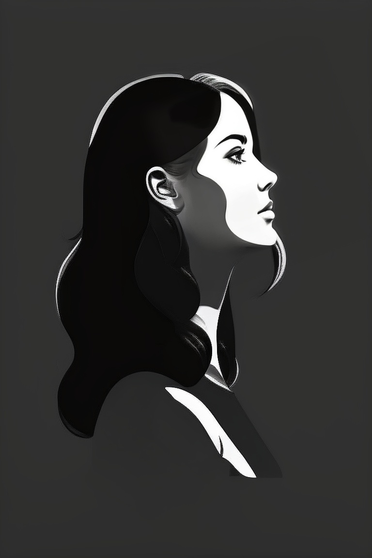 Monochrome silhouette of a face, full body shot of european female humanoid, black and white, 2d, side view, long hair, smirk, flat, illustration