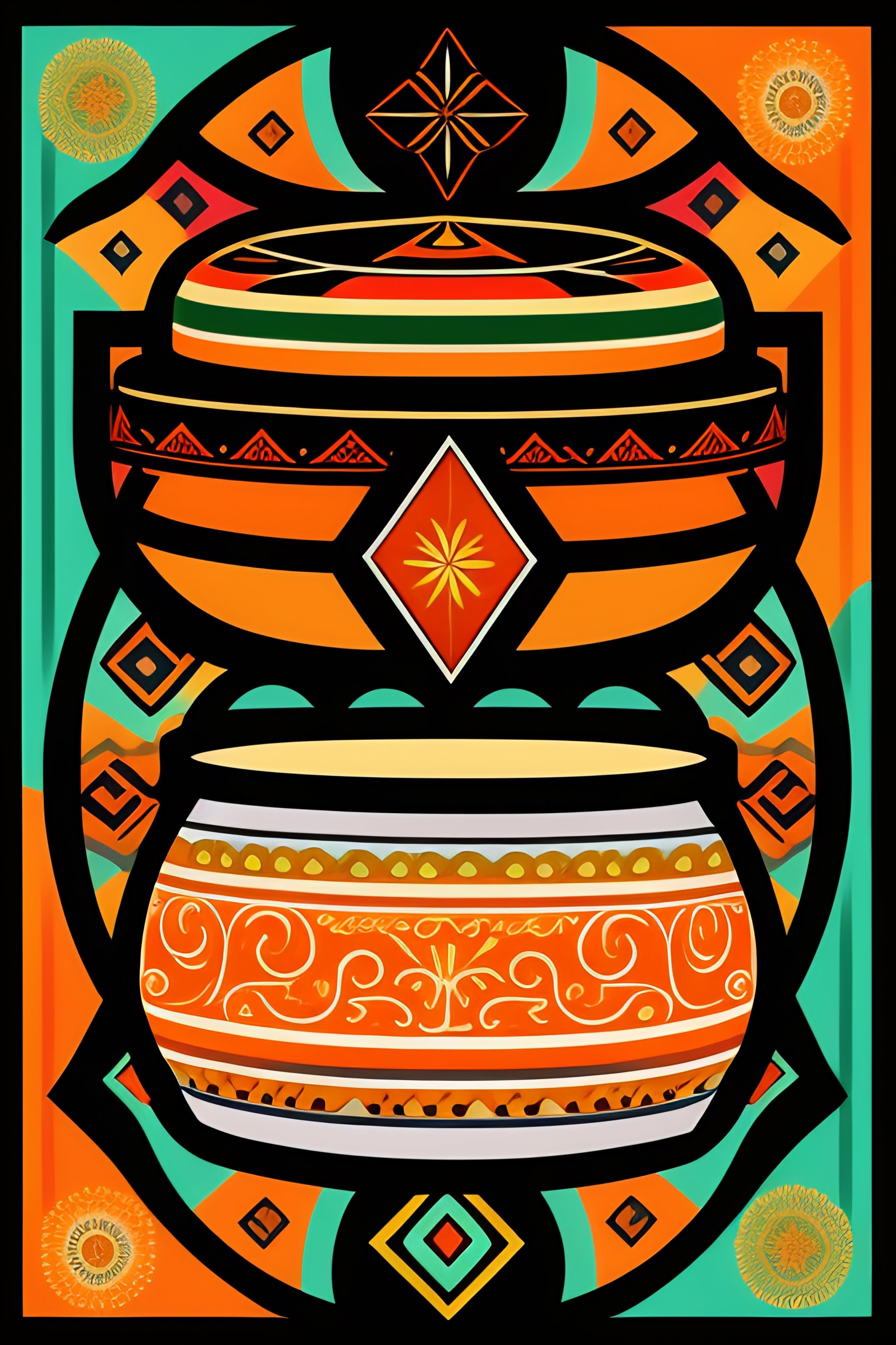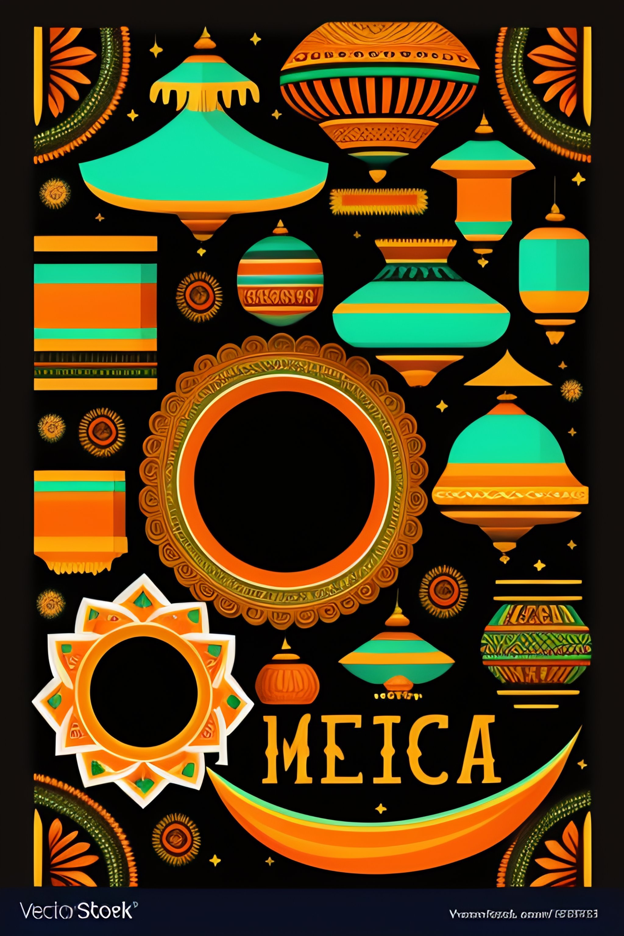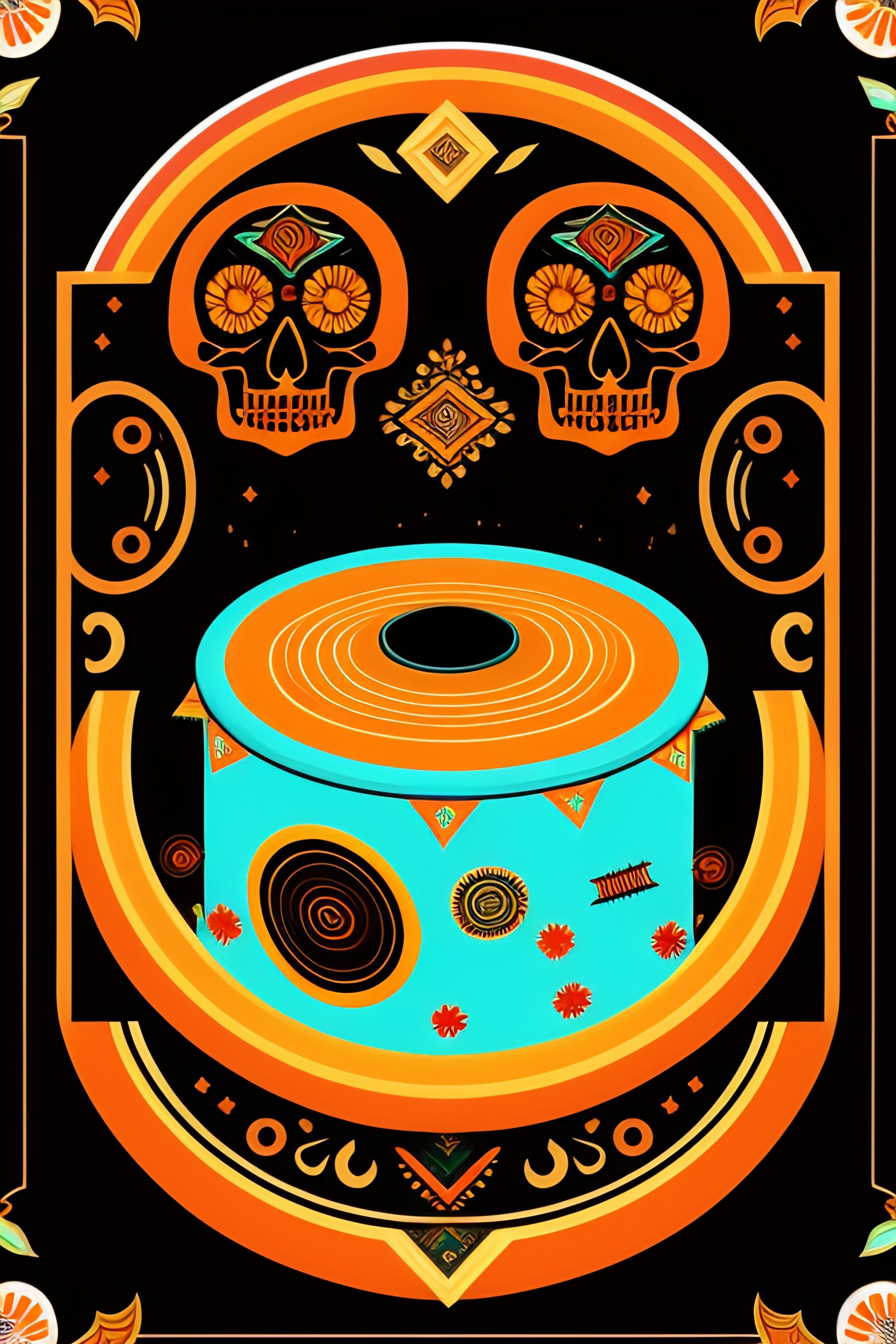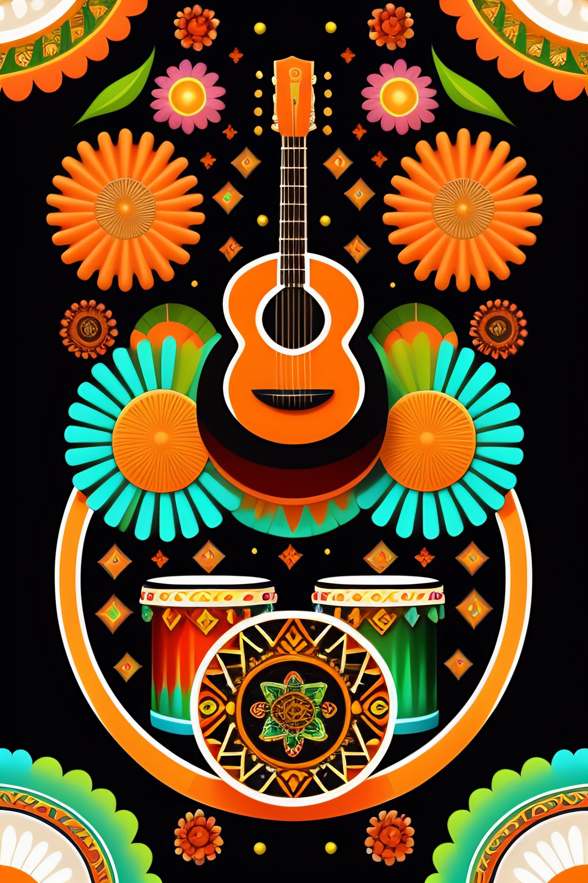 Vector flat flyer, flyer flat vector 2d image of a large drum set surrounded by mexican ornamental elements such as mates, skulls, garlands of lights and native plants, colors orange, turquoise and black