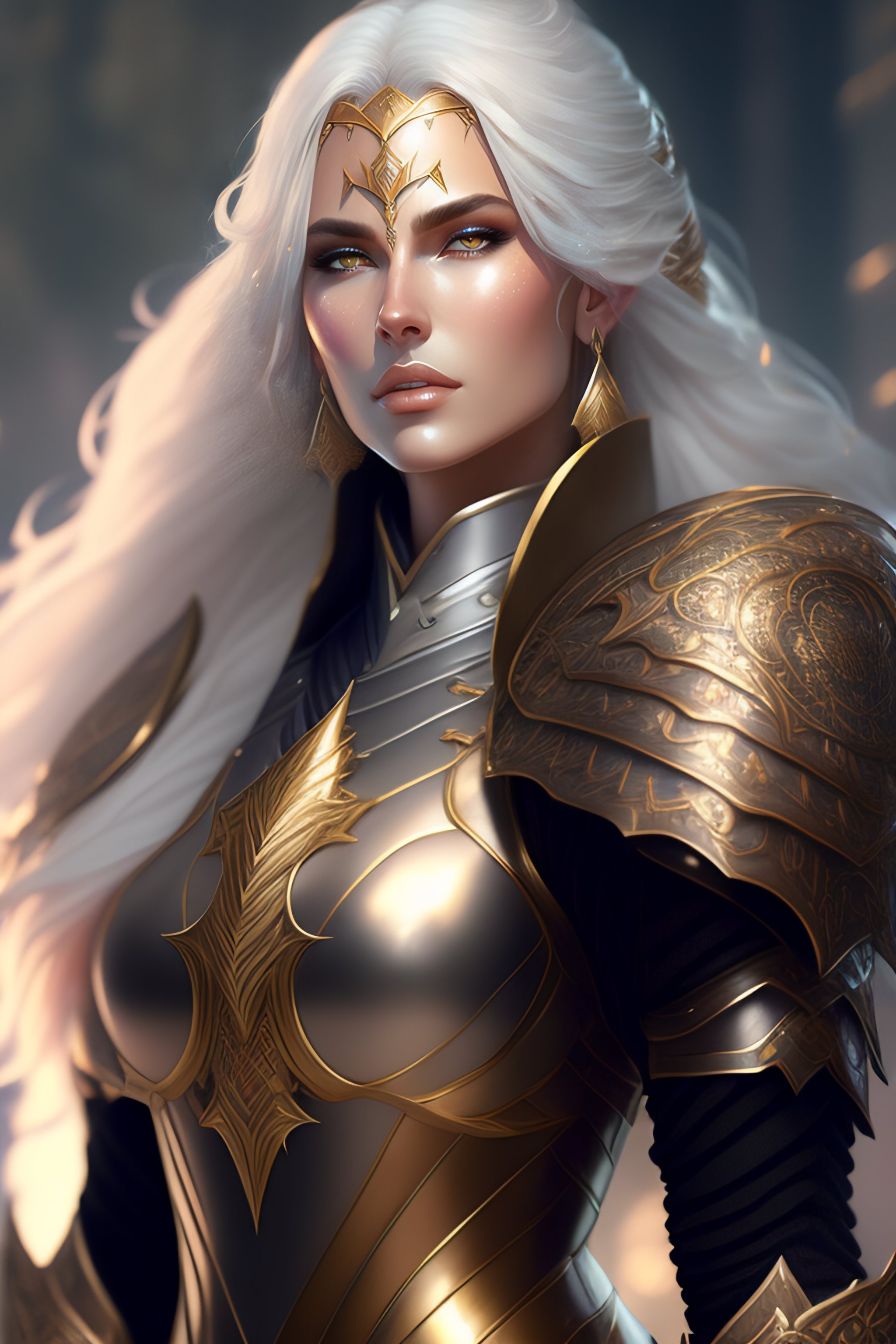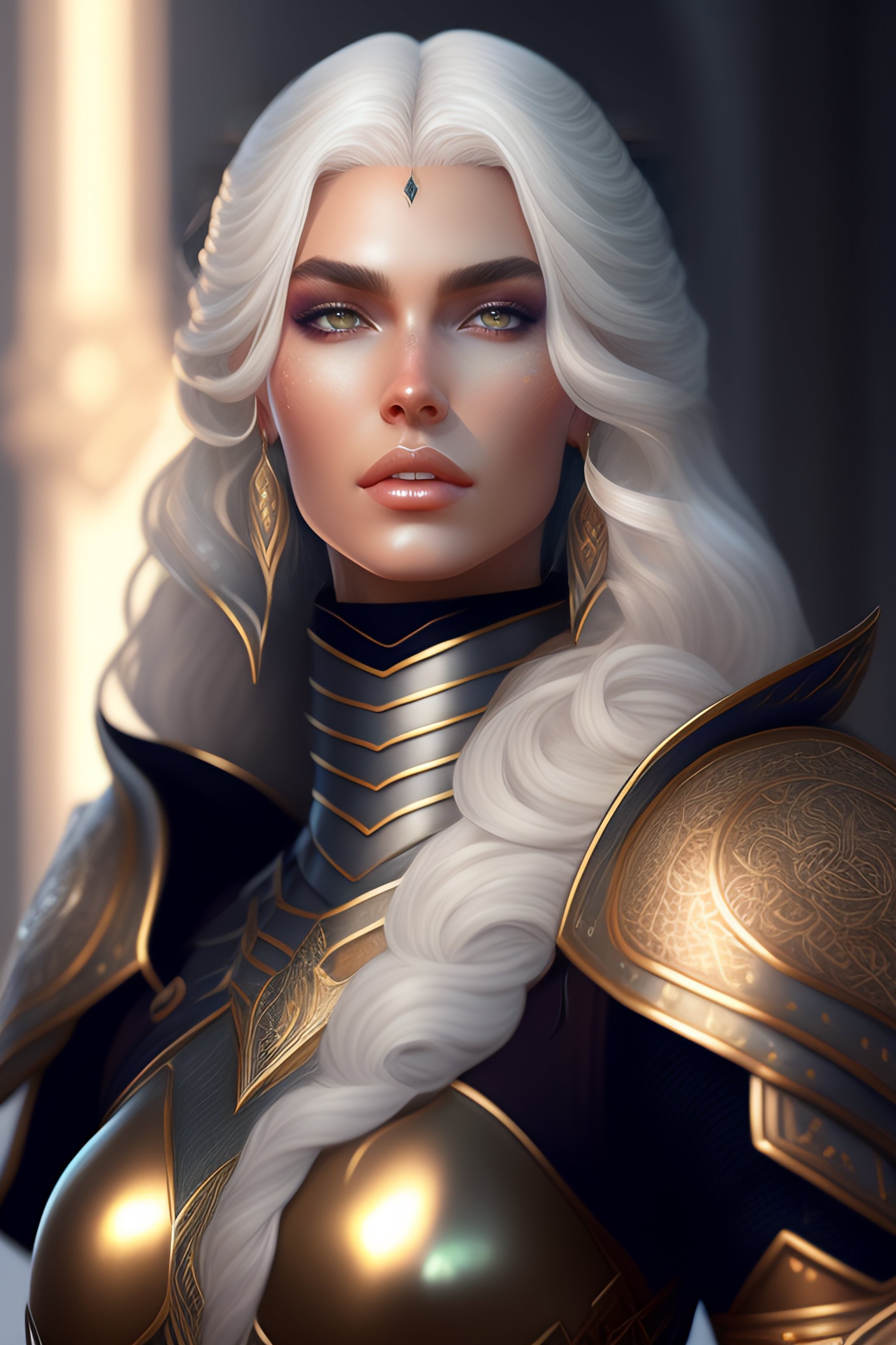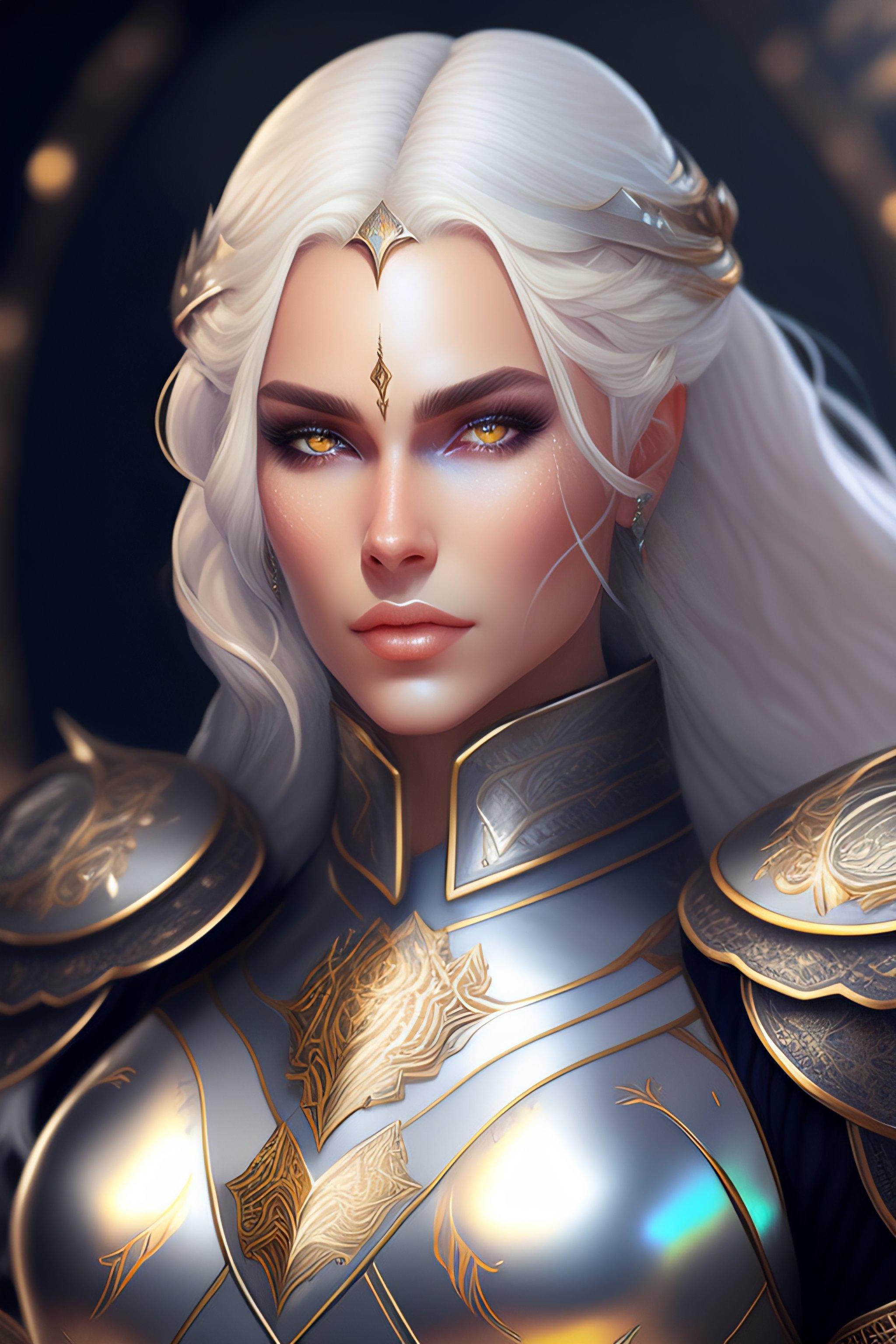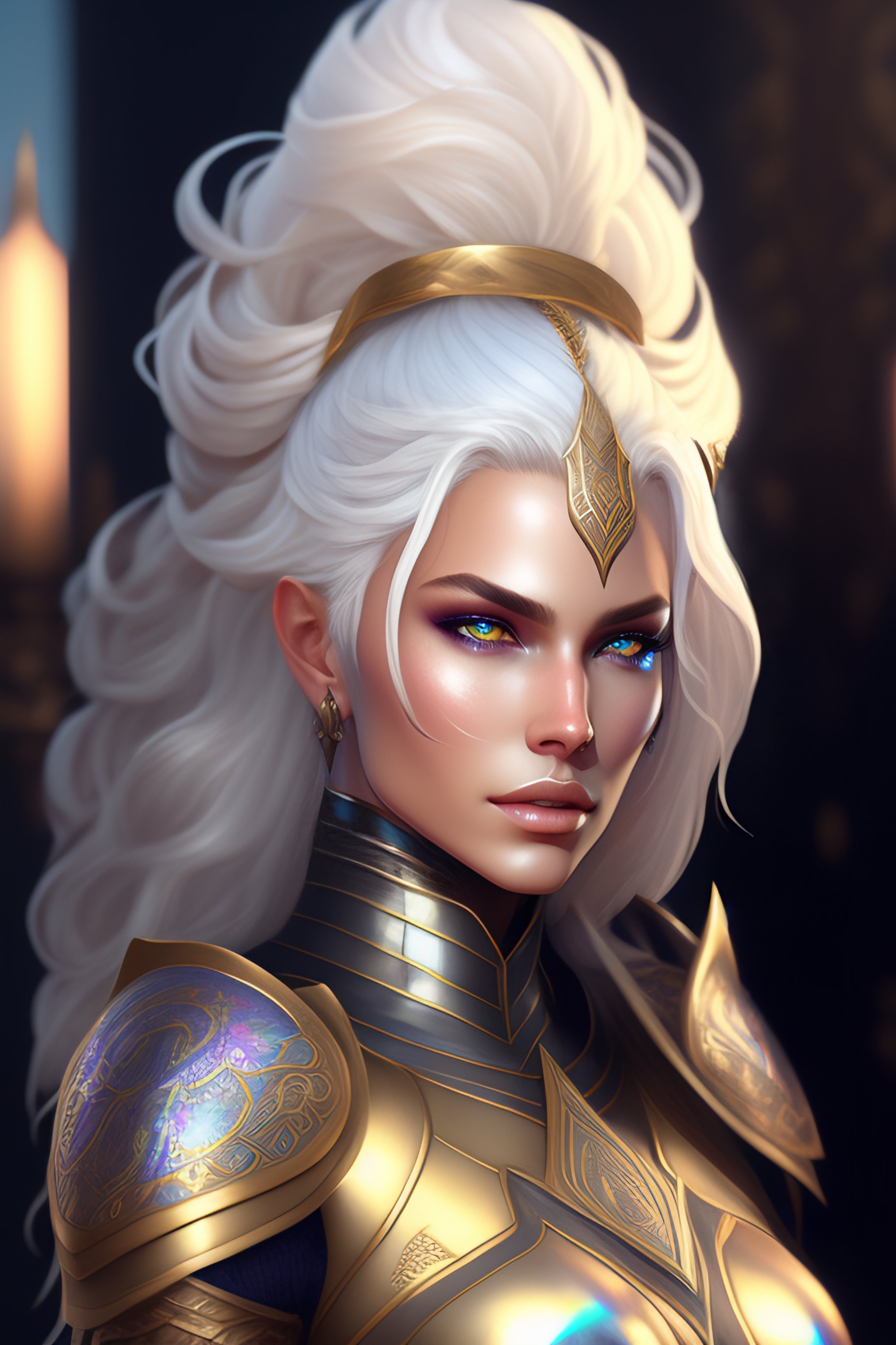 Light iridescent armor!!! long wild white hair!! covered chest!!! fantasy, d & d, intricate ornate details, digital painting, pretty face!!, symmetry, concept art, sharp focus, illustration, art by artgerm! greg rutkowski magali villeneuve wlop! ilya kuvshinov!!, octane render