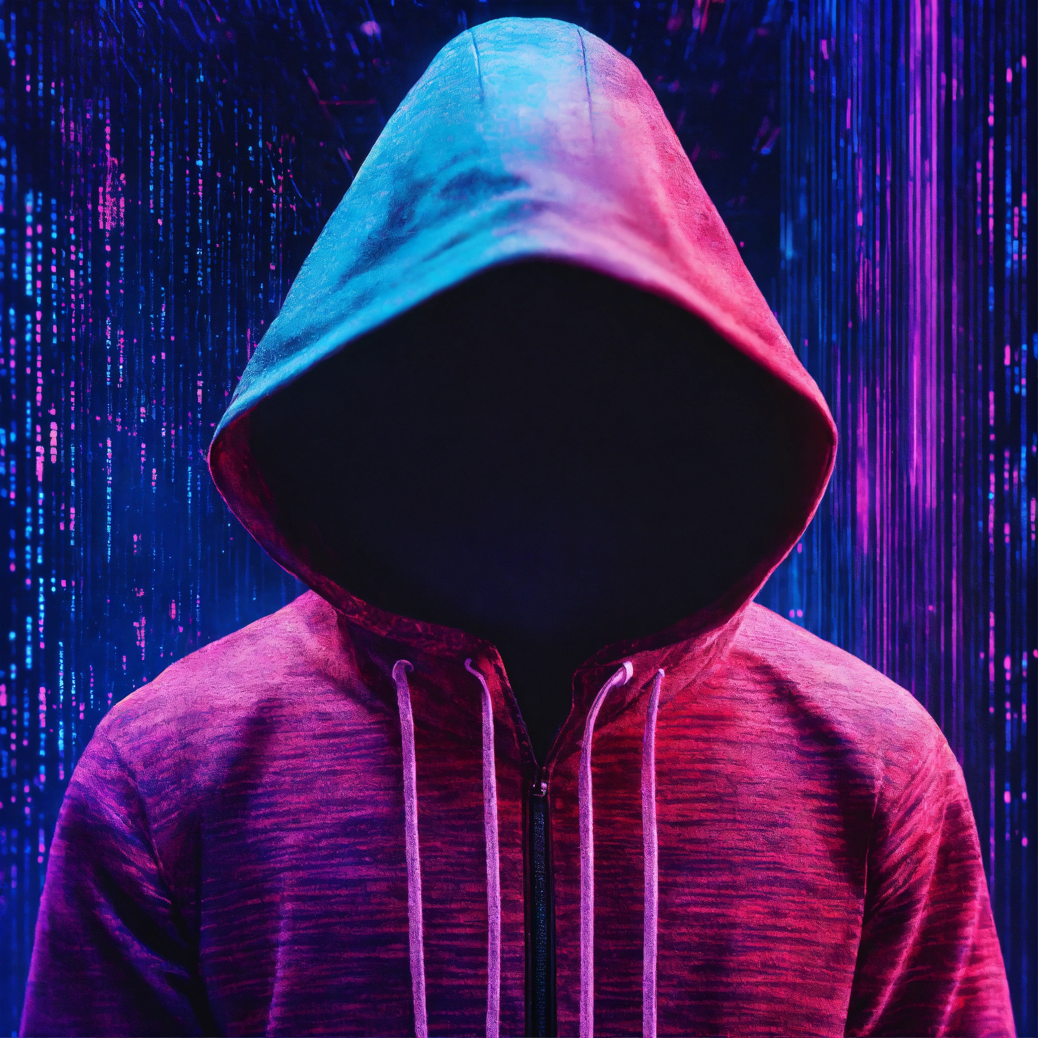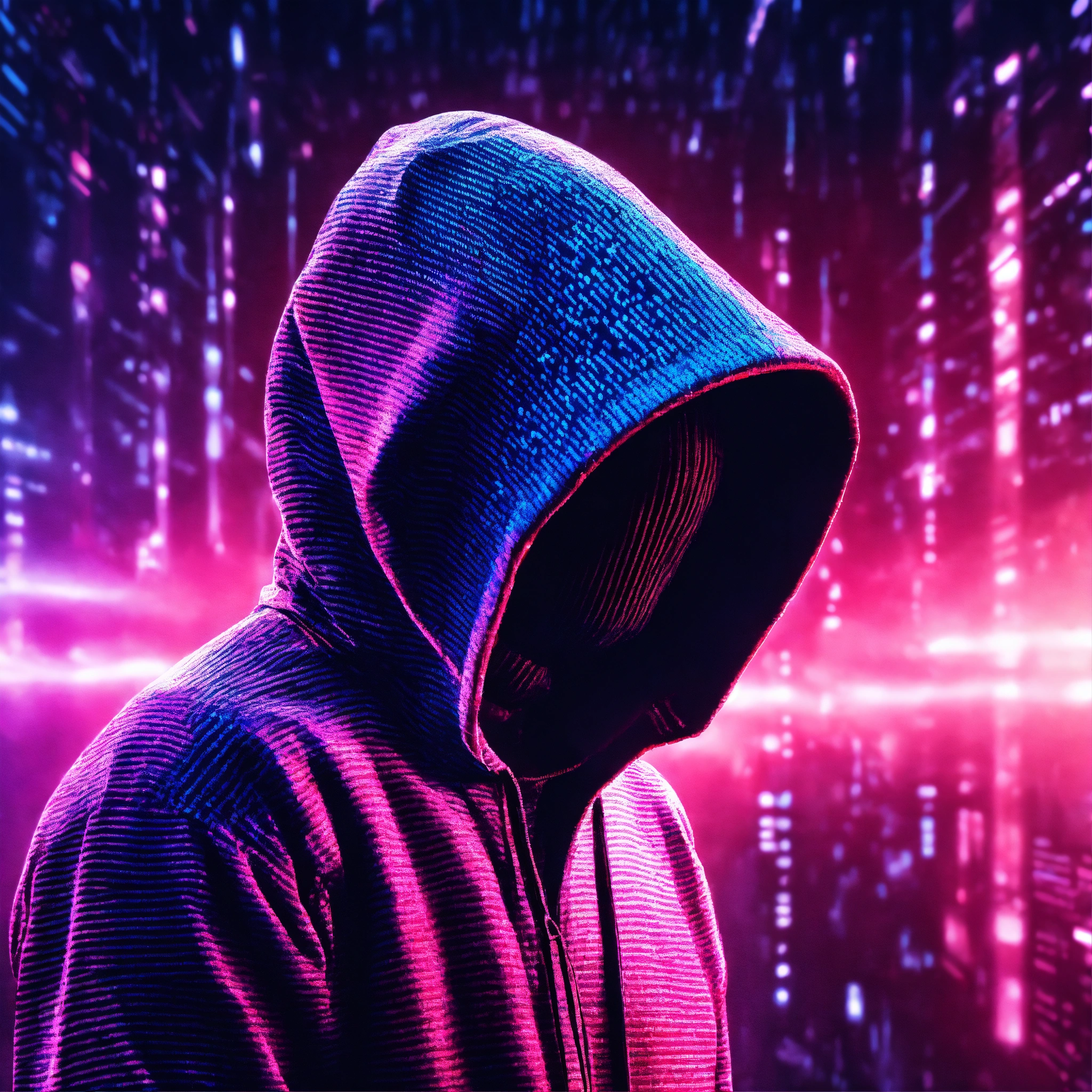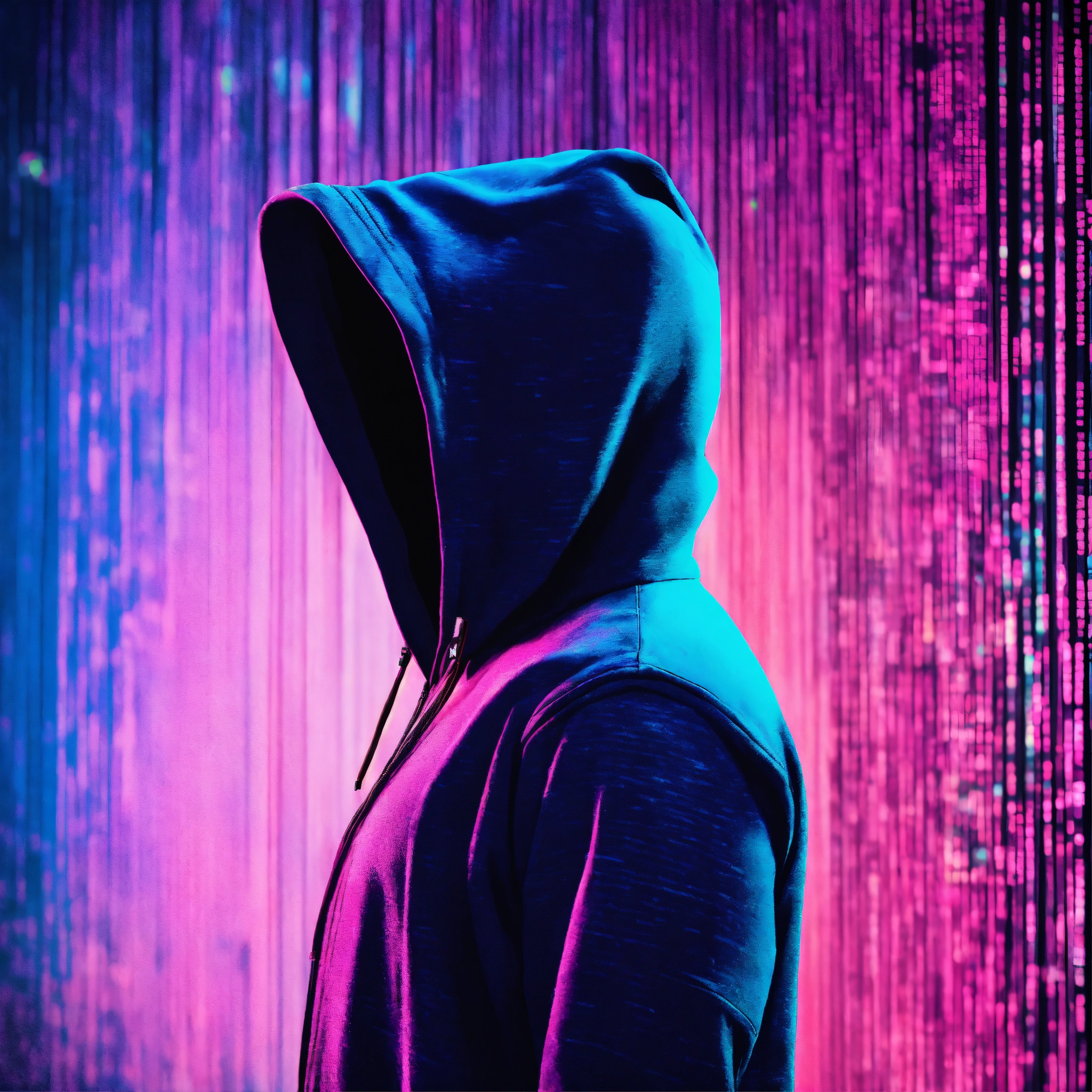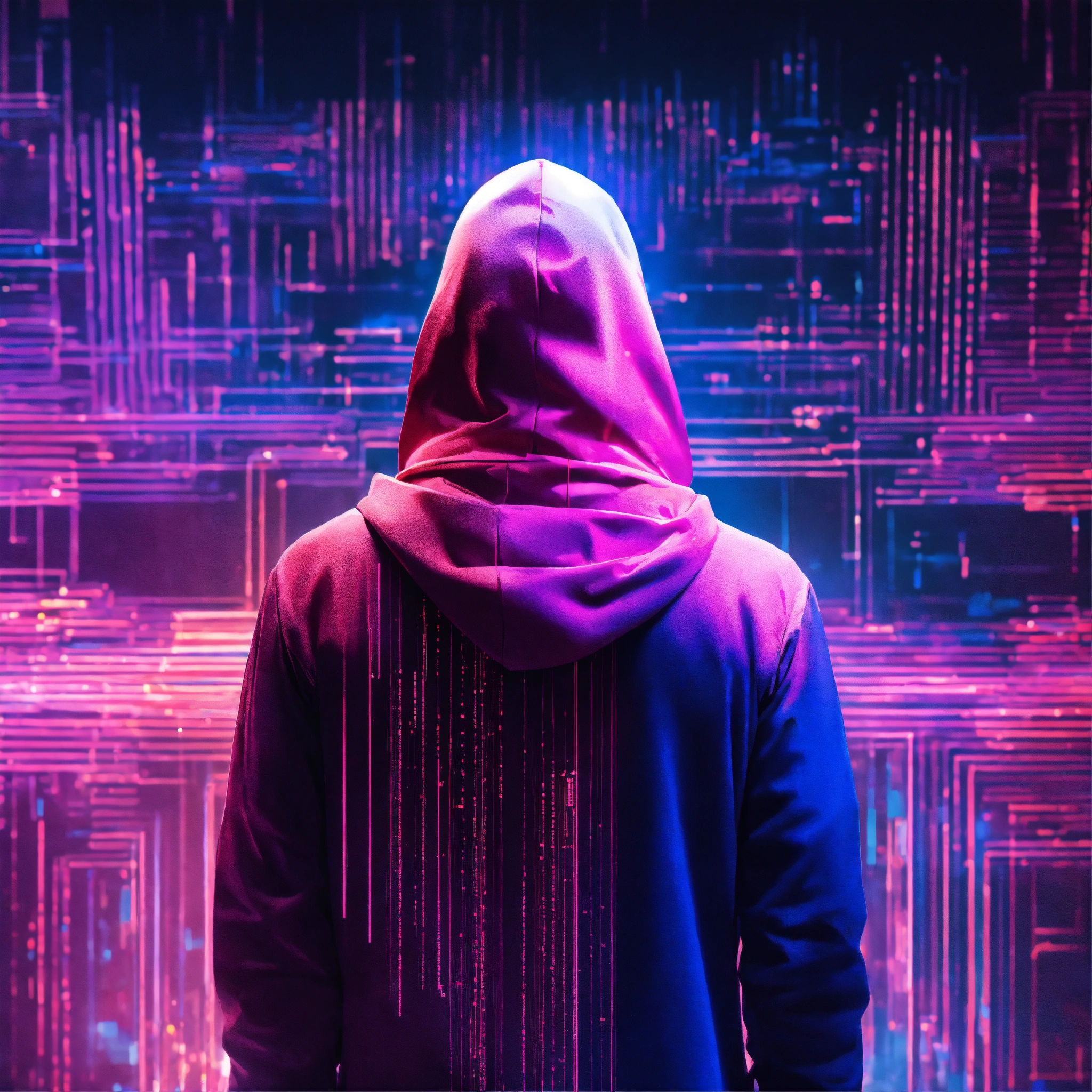 Un homme vu de dos avec une capuche dans un univers galactique et une ligne de code informatique. des couleurs rose, violet et bleu. un effet glitch sur la photo.