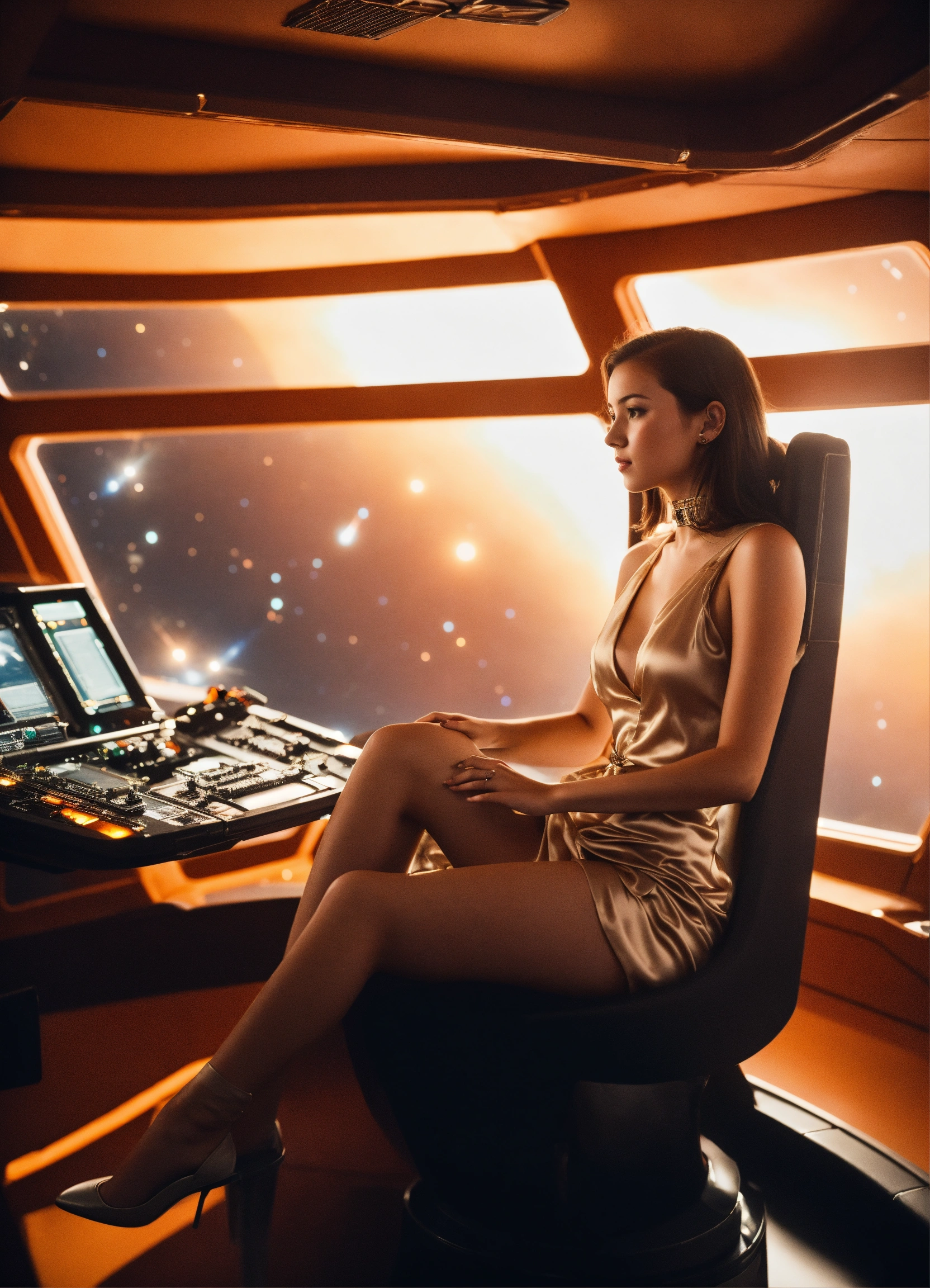 A real photo of a cute 22 year old very hot girl wearing a thin silk dress, she is sitting in the captains-chair of a spaceship. through a window we see space.