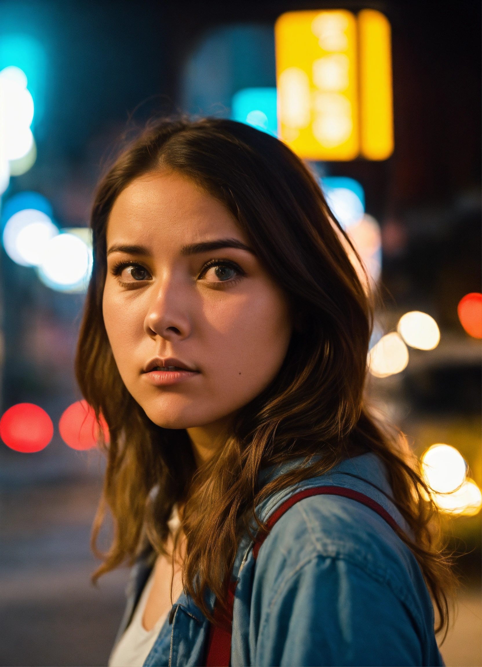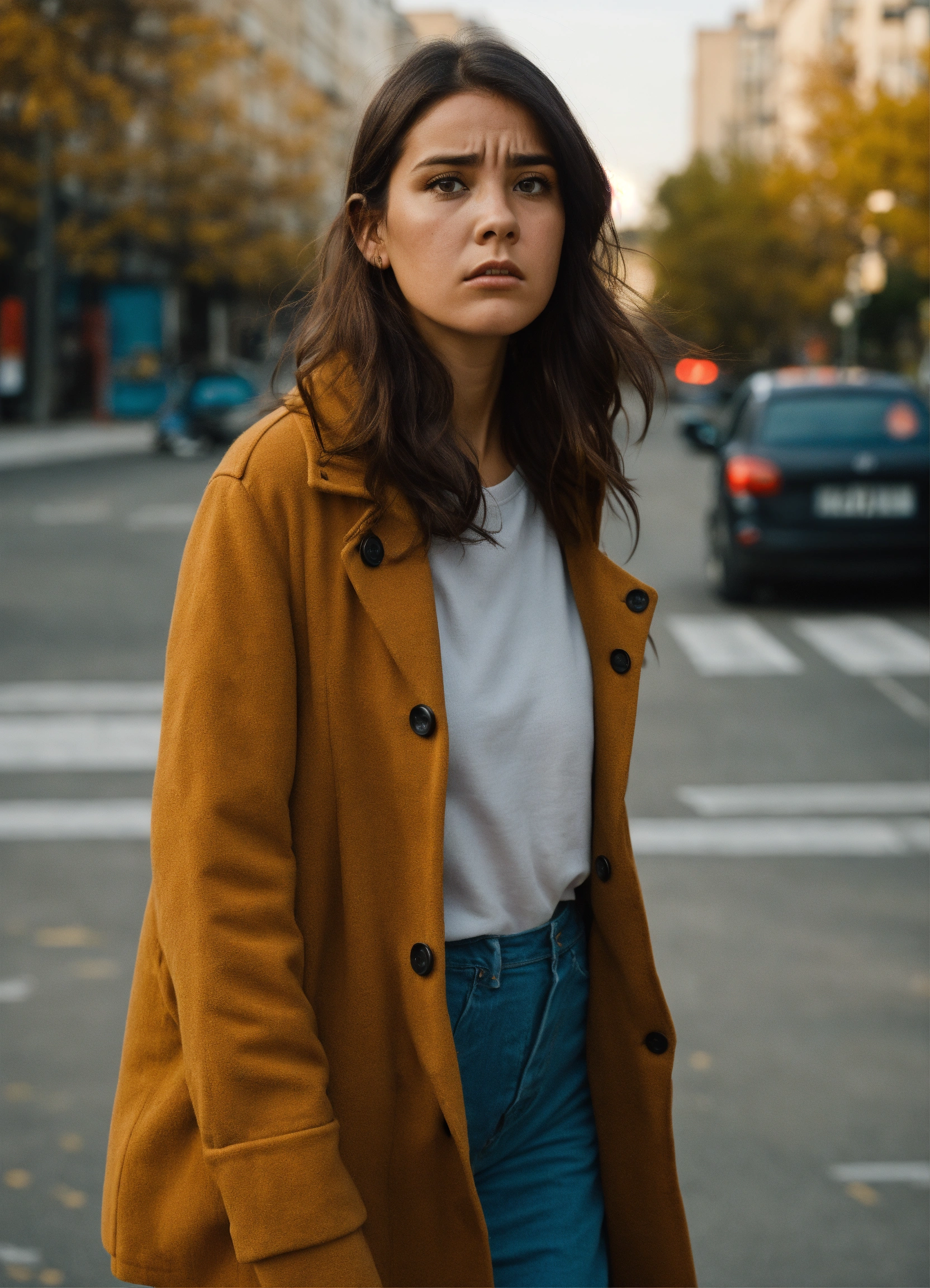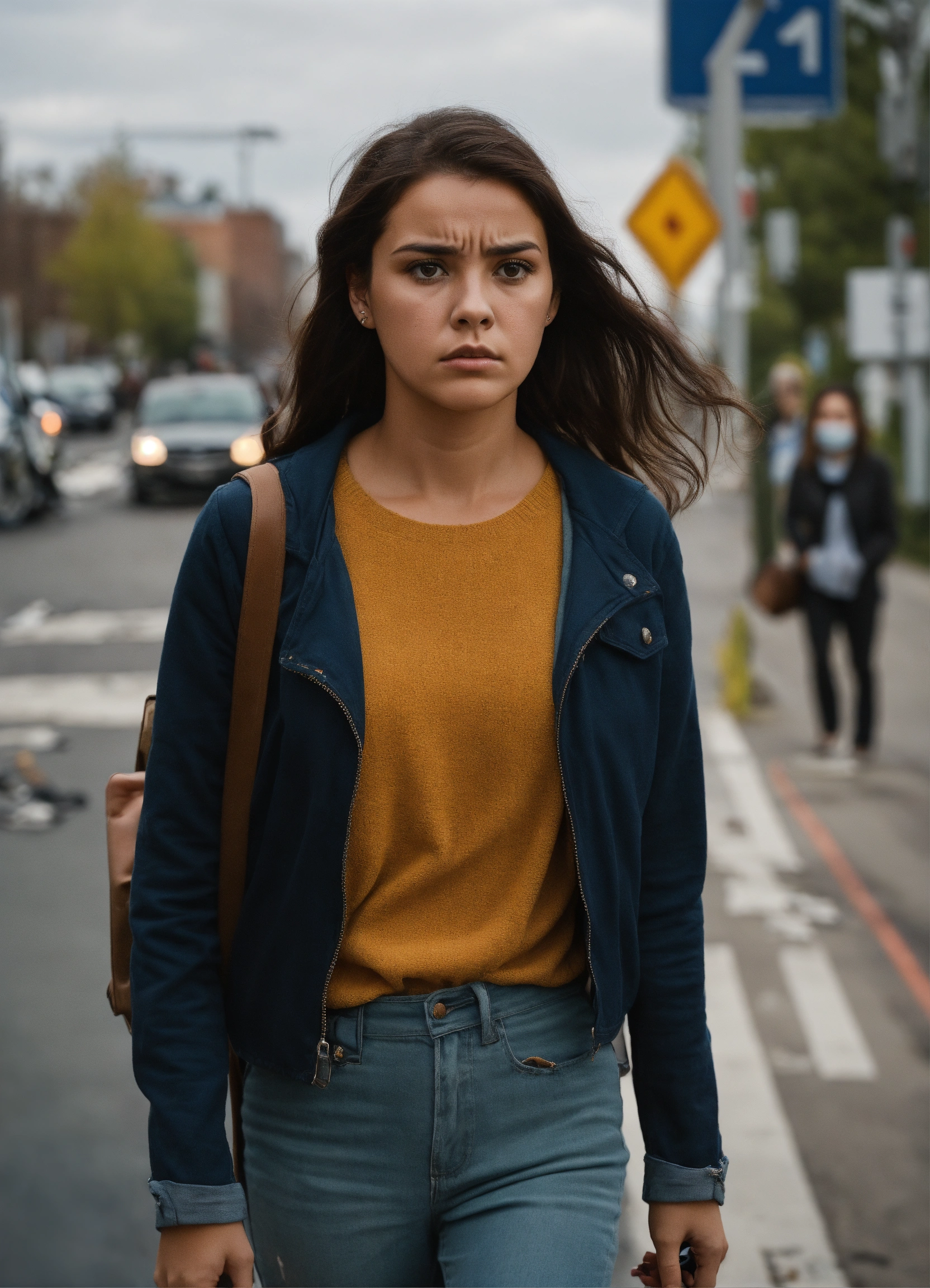 A 29-year-old girl who is crossing the street with a worried look looks behind her and does not know that an accident is imminent