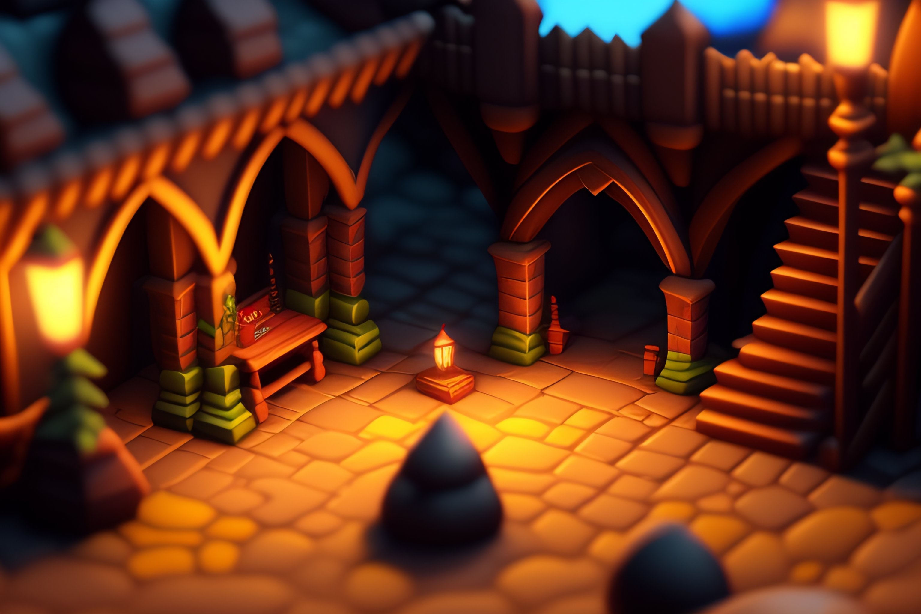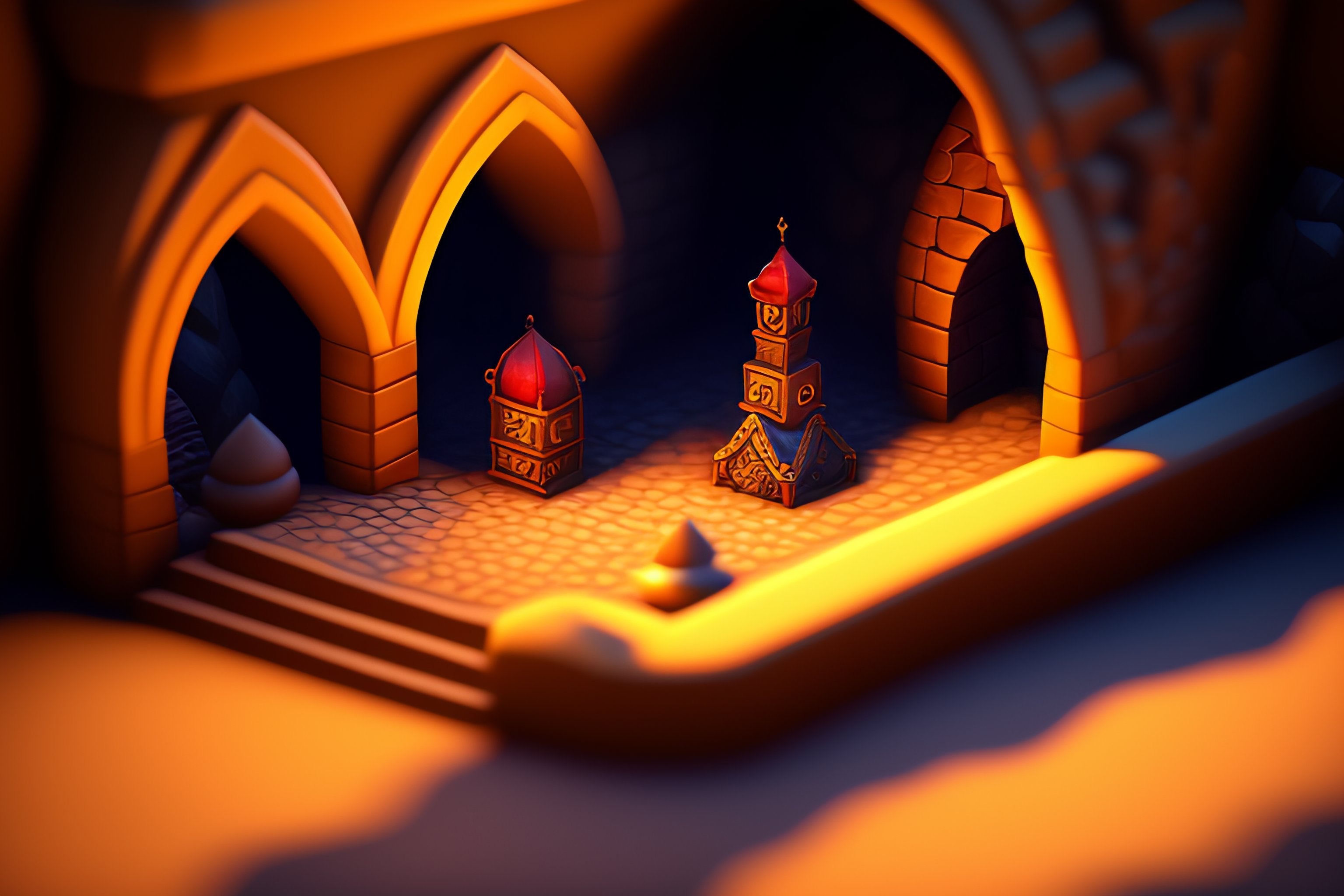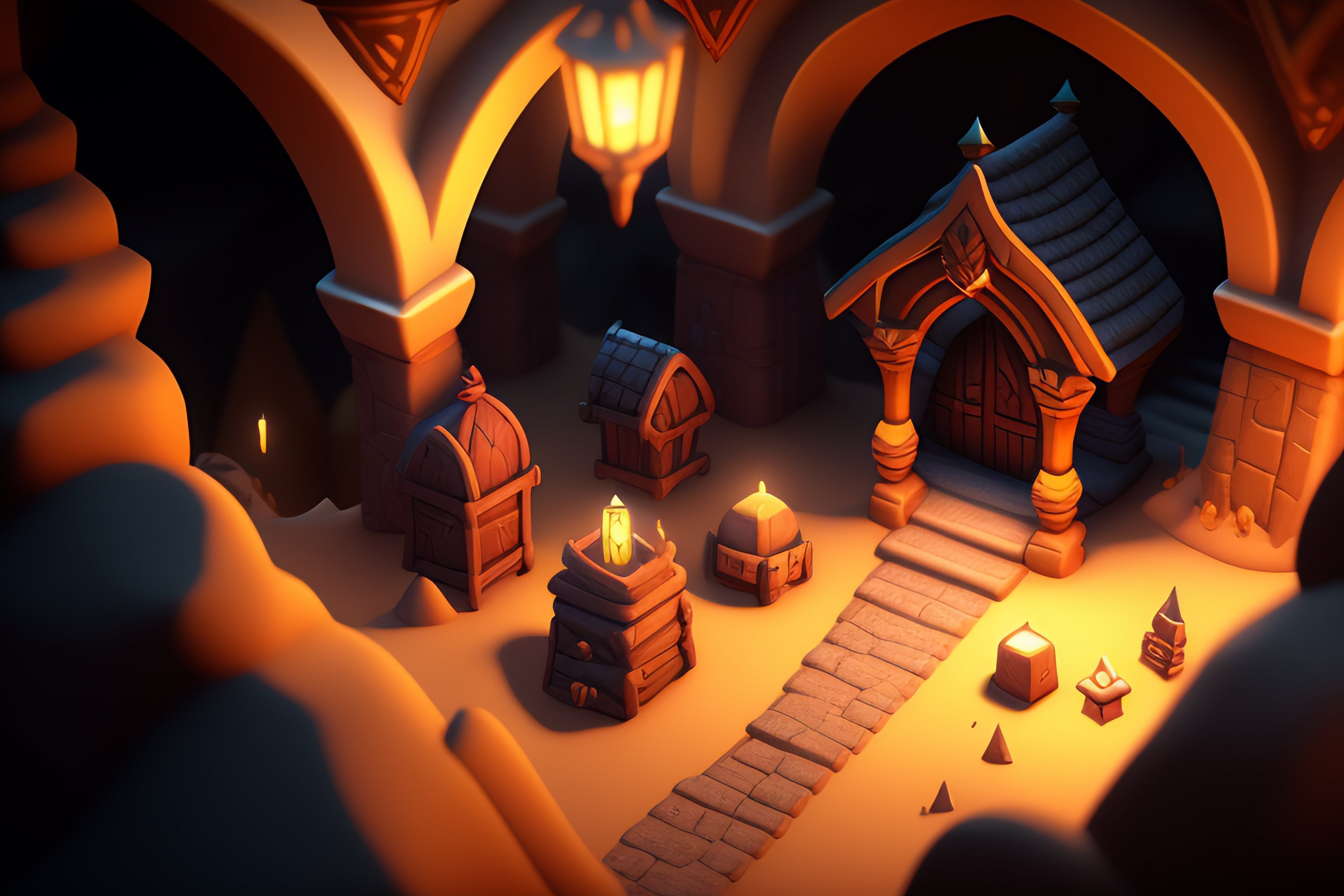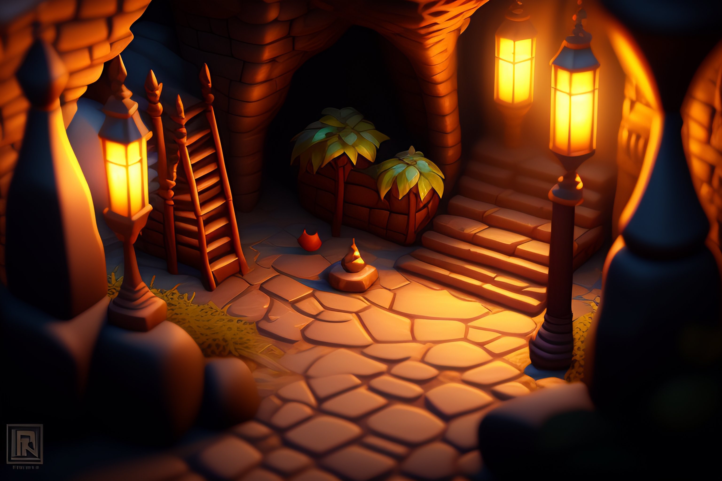 Evil dungeon isometric 2. 5 d game level, myvmk, with detailed sand, cartoon, lanterns, pixar, disney, toon shader, arnold maya render, artgerm, artstation by miha rinne