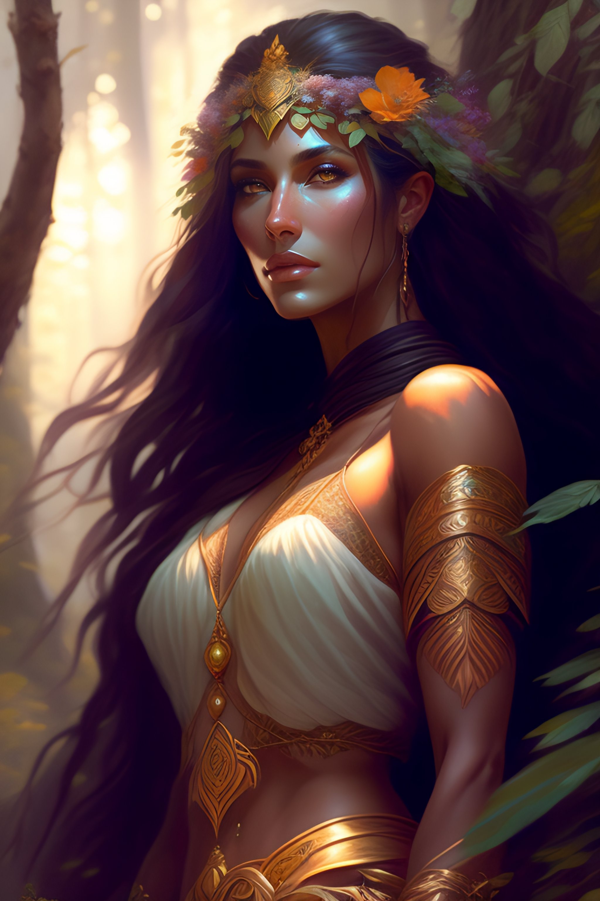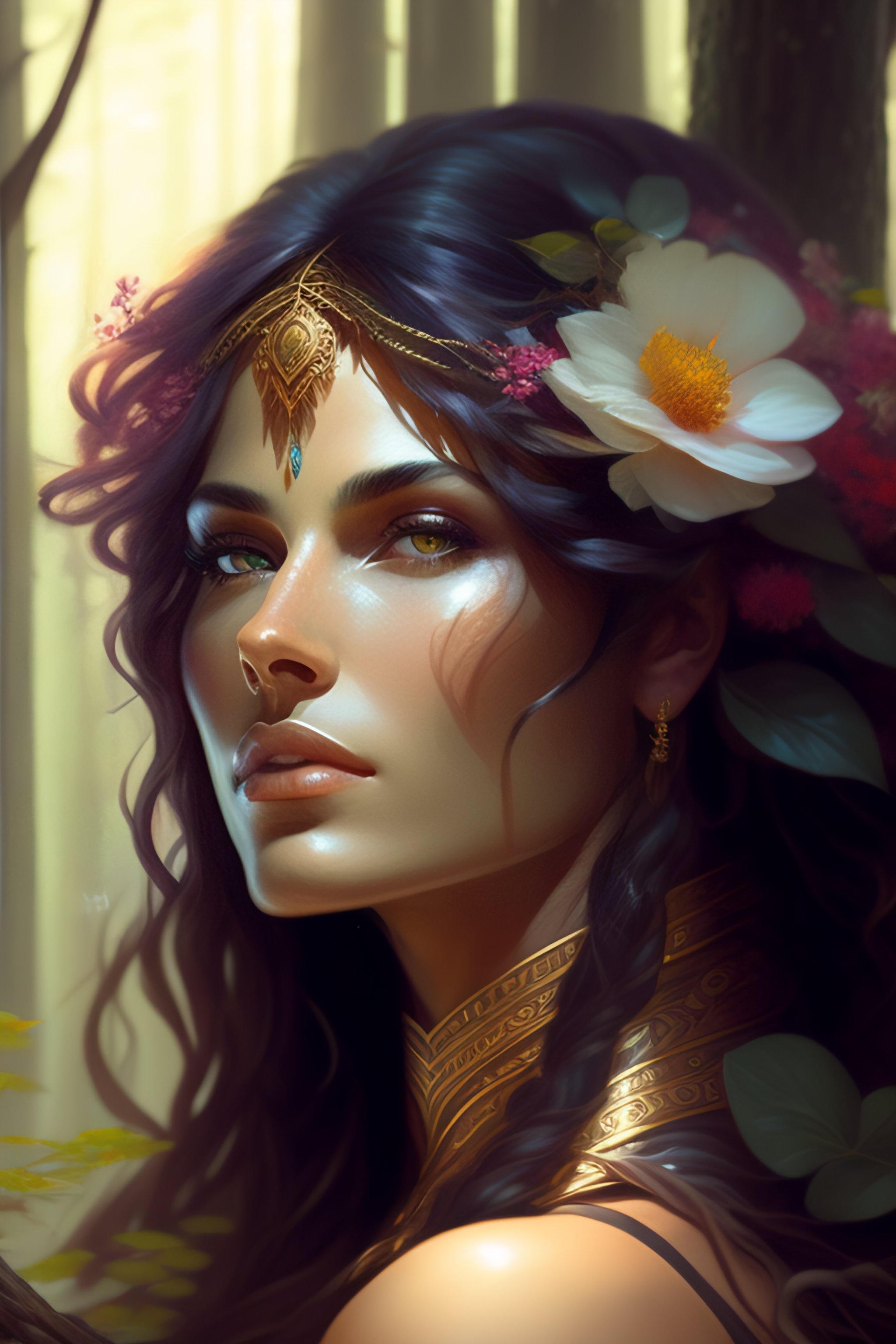 Goddess of the forest, 30 years old, rugged, female, gorgeous, detailed face, amazing, full body, flowers, muscular, intricate, highly detailed, digital painting, artstation, concept art, sharp focus, illustration, art by greg rutkowski and alphonse mucha