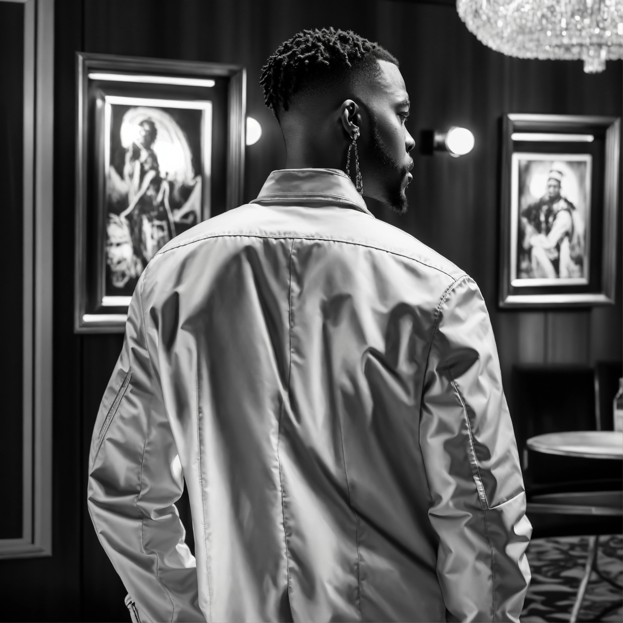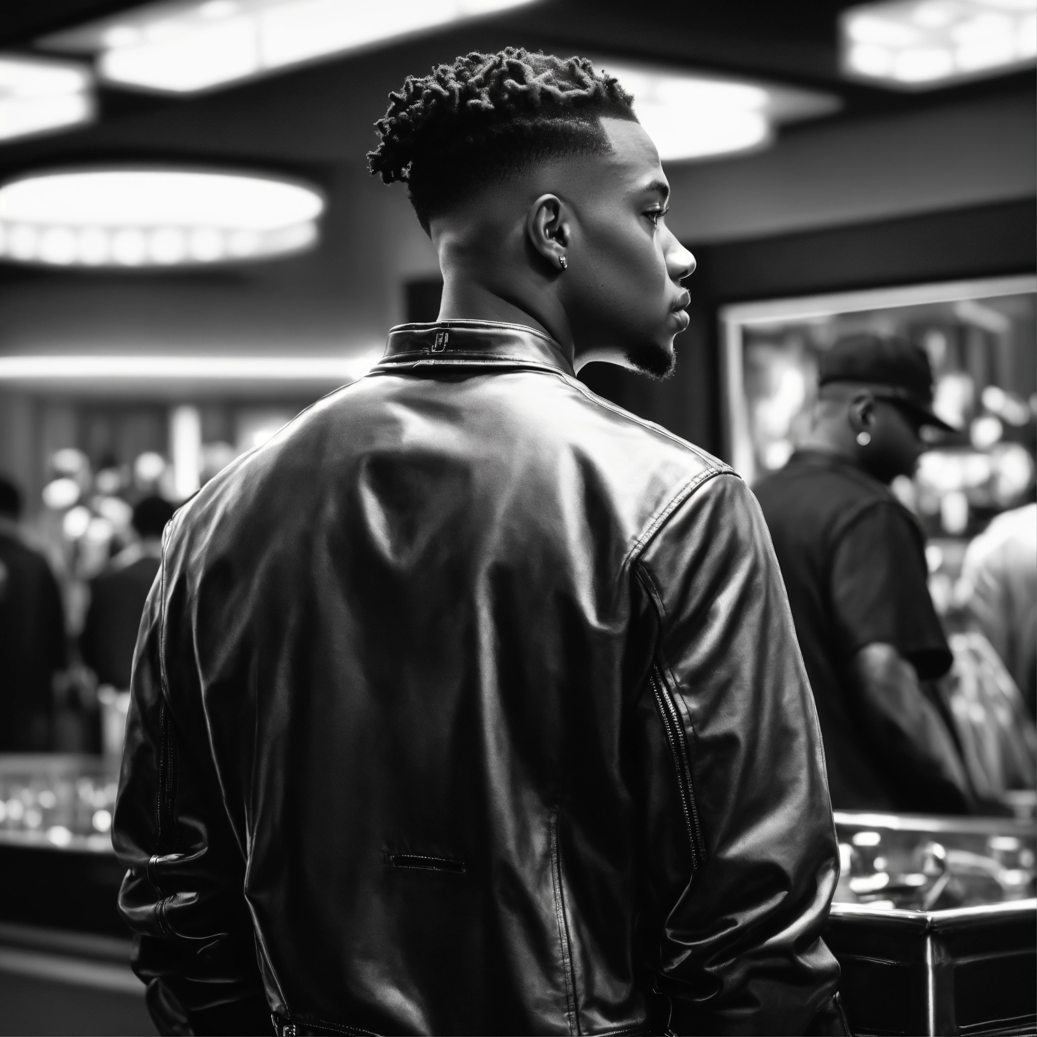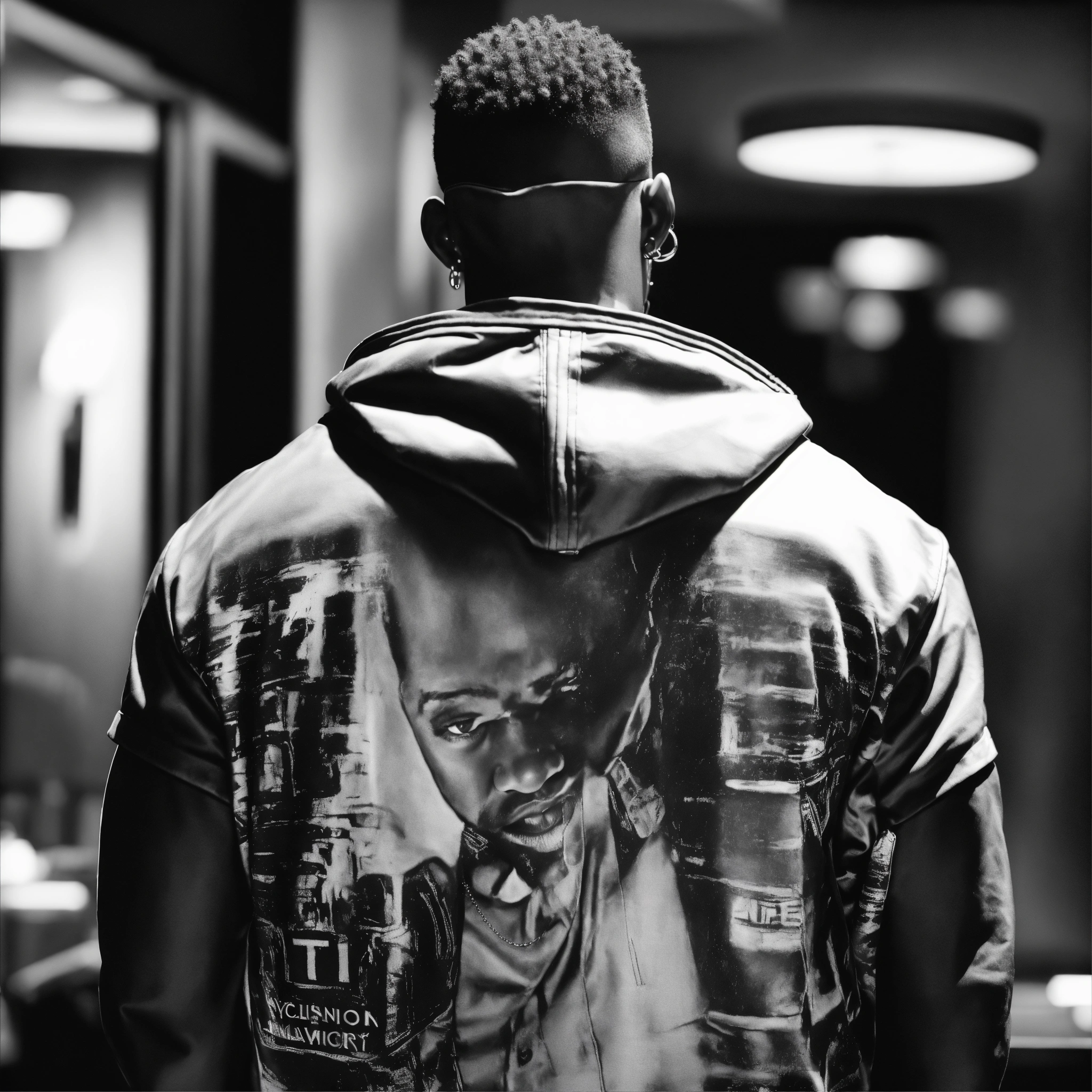 Back view pop art, hyperrealist portrait of black rapper "ti clifford joseph harris jr." at a las vegas hotel., black and white painting, fantasy art, photo realistic, dynamic lighting, artstation, poster, volumetric lighting, very detailed faces, 4 k, award winning
