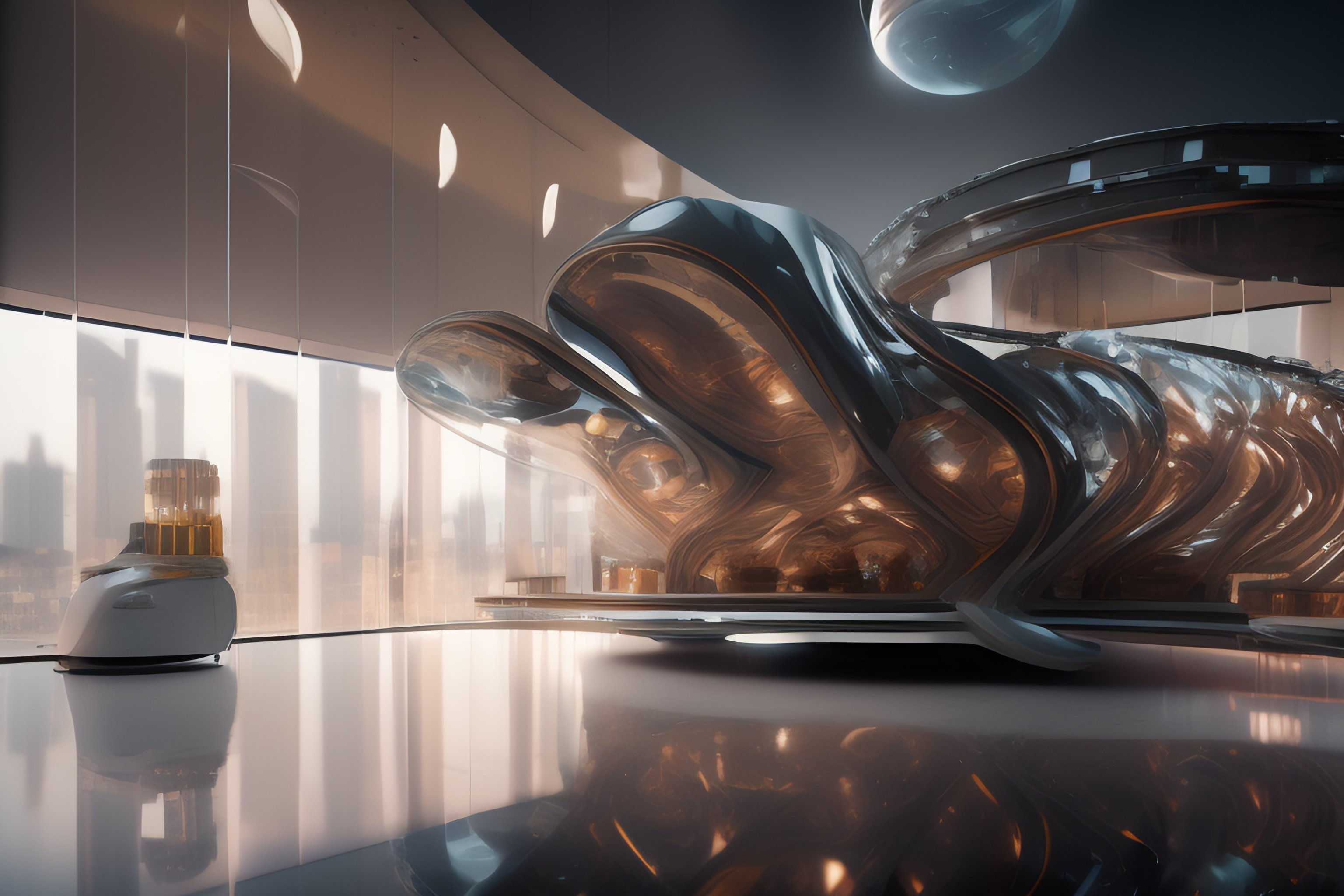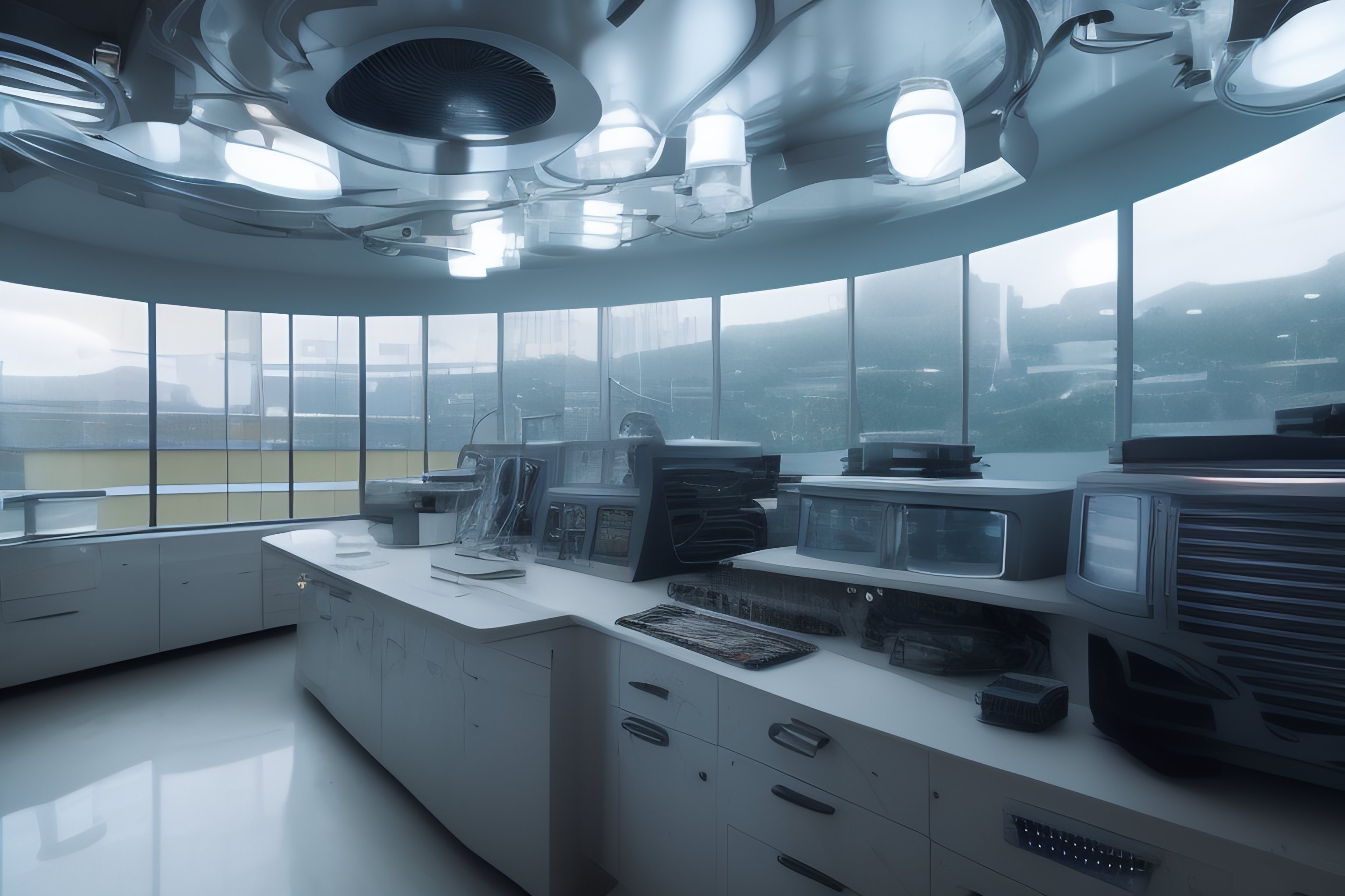 Messy strange architectural curved lines shiny metallic detailed alien spaceship science lab room with samples in glass jars and led rgb lighting machines, a complex alien technology bifurcated robotic cnc surgical arm medical facility mri 3 d printer machine making large in a biochem lab control panels sci-fi room, 4 k, large monitor screens, drone camera lens orbs, octane render, architectural photography, f 1 8, still from movie by denis villeneuve, volumetric atmospheric lighting, dark cyberpunk lighting and materials
