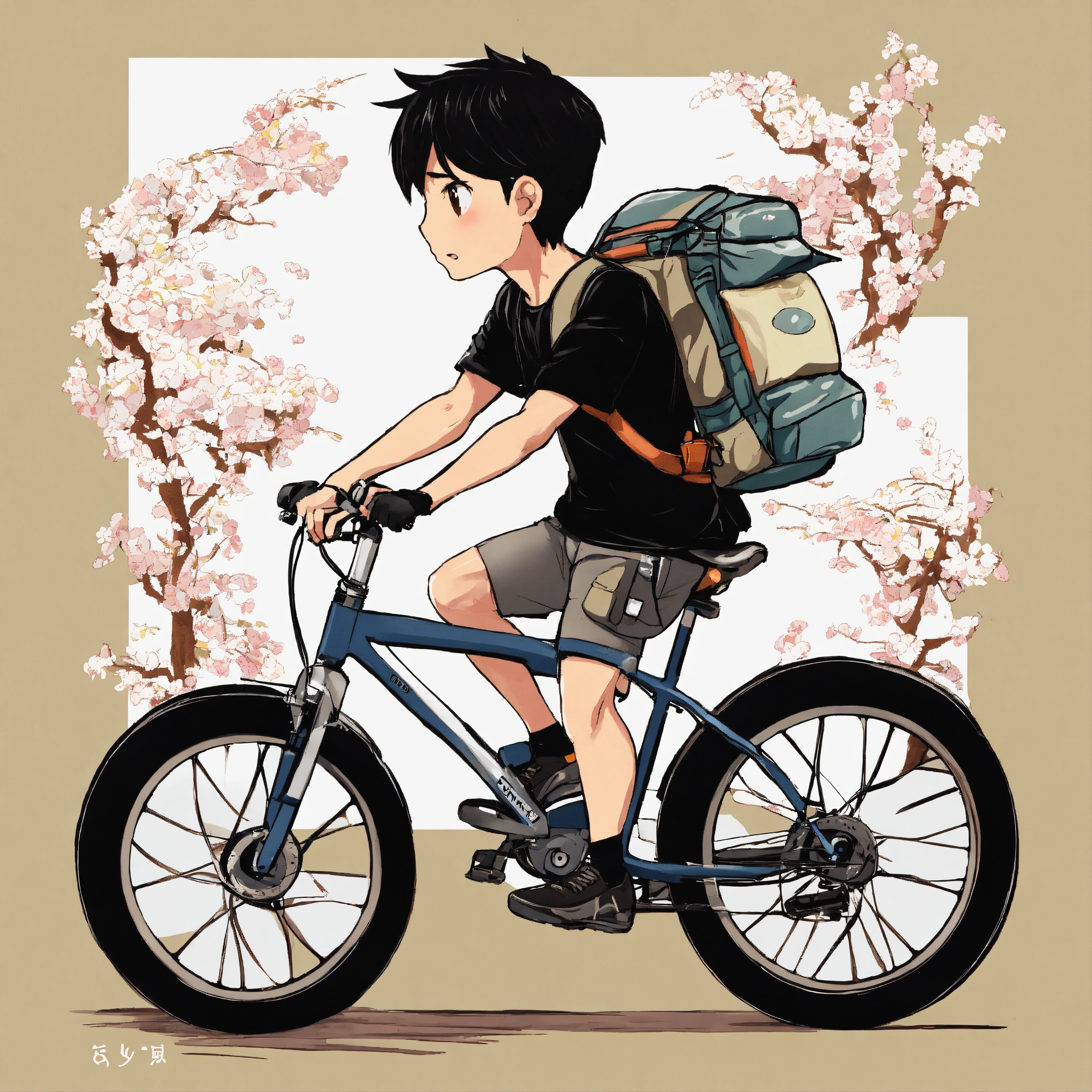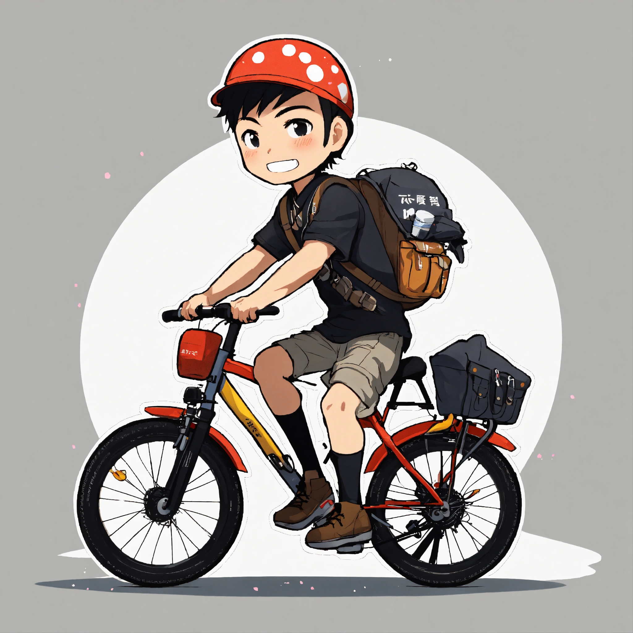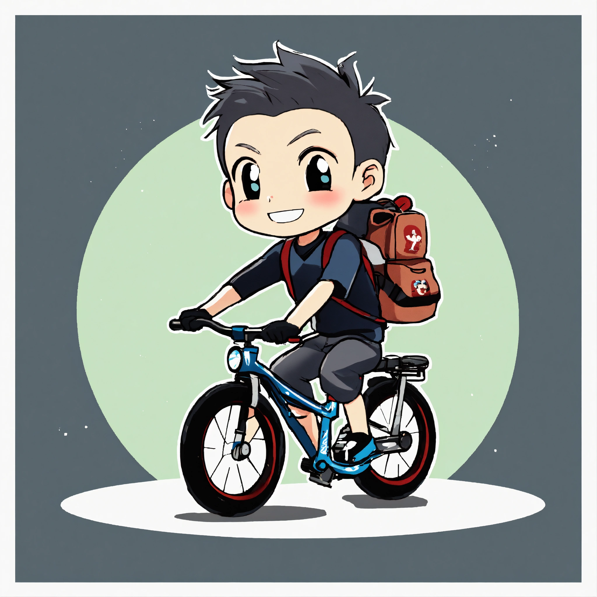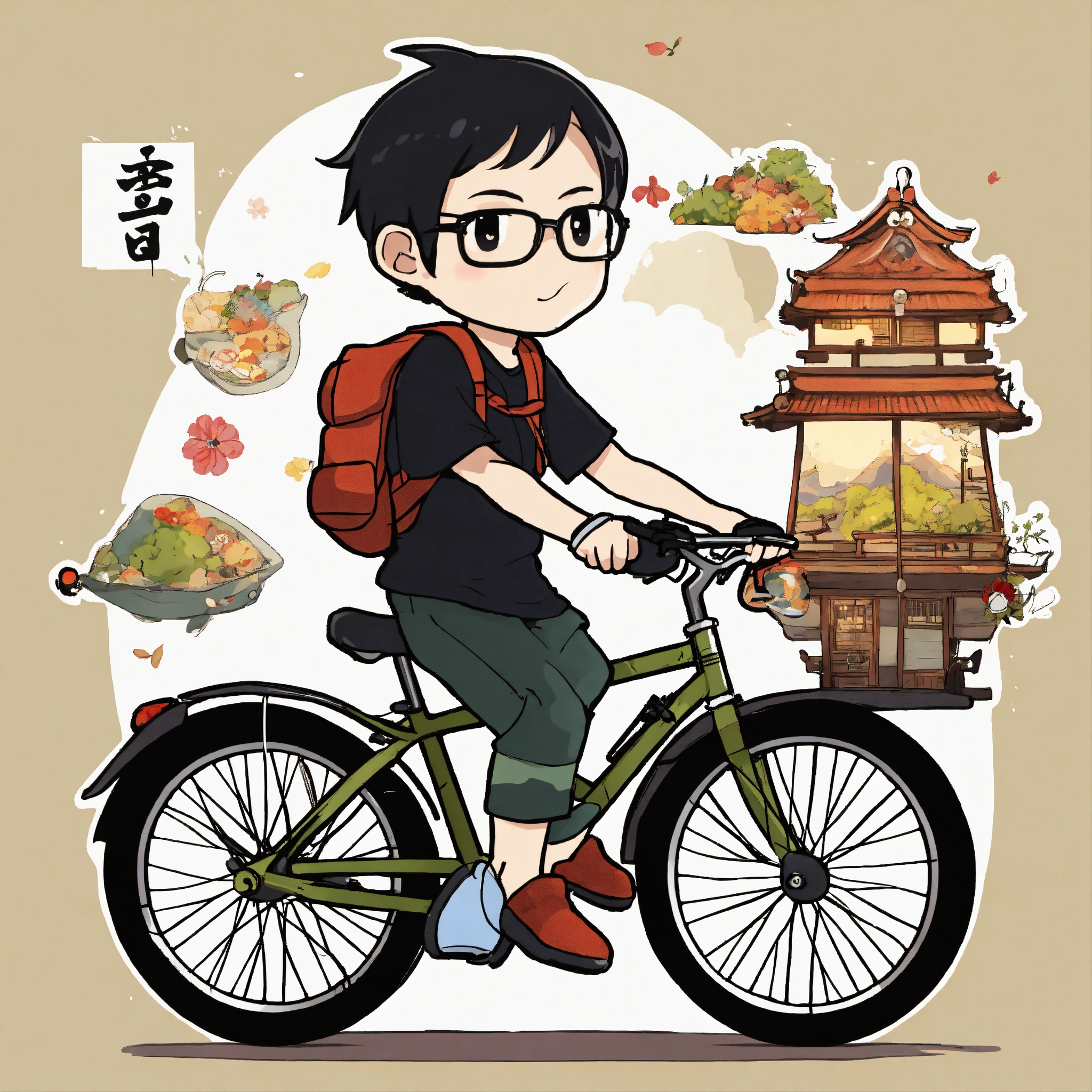 Japanese adventurer man, ride on the bicycle, black t-shirt, chibi character, anime style, 50 years old, short hair, white background, a lot of stuff on the back of the bicycle