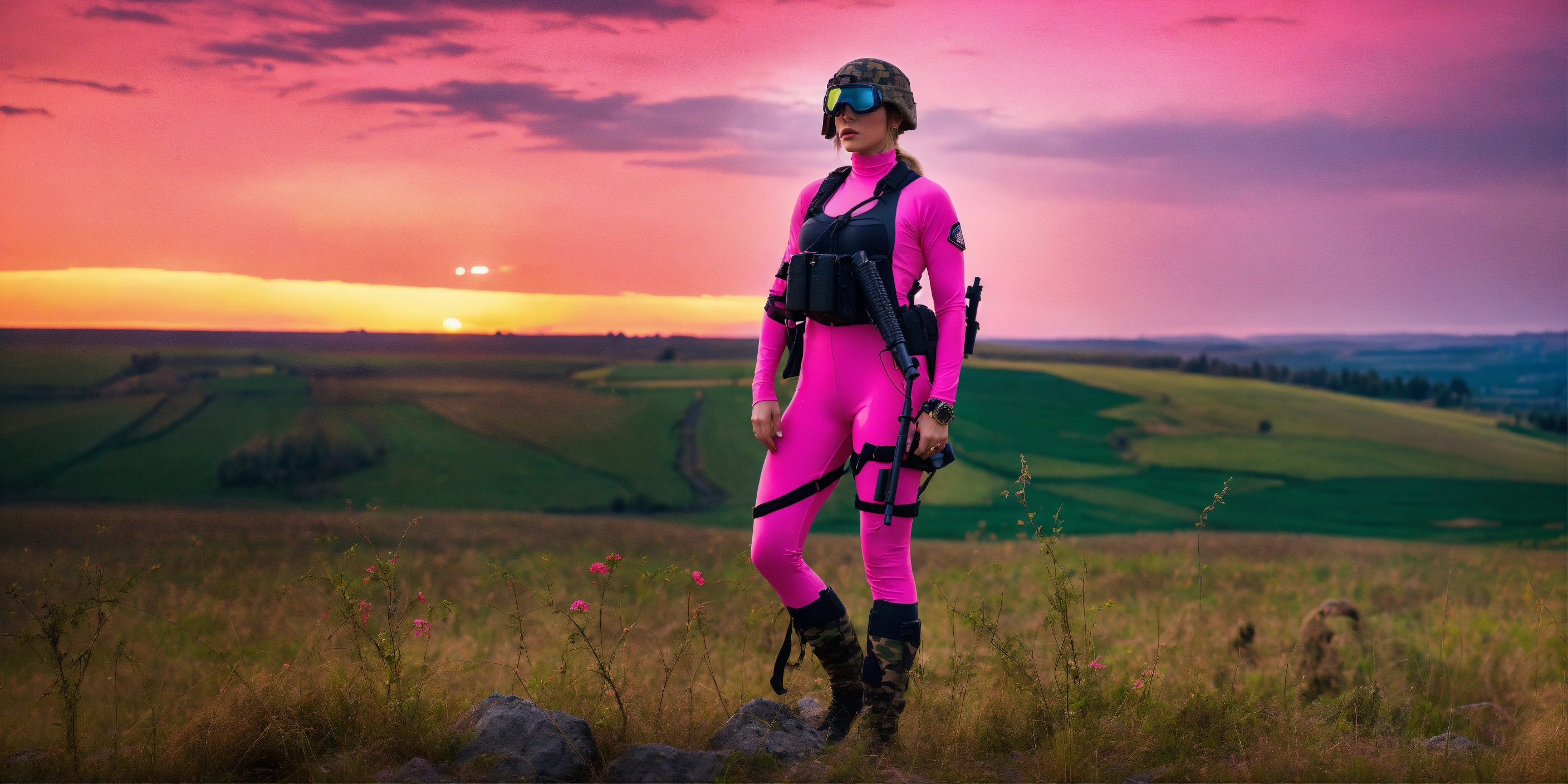 Amidst a backdrop of wilderness, a woman stands out in an unusual ensemble. her top half sports a vibrant pink swimsuit, while from the knees down, she’s decked out in tactical military gear, complete with night vision goggles, a combat knife, and camouflage leggings. all this happens in ukrainian fields
