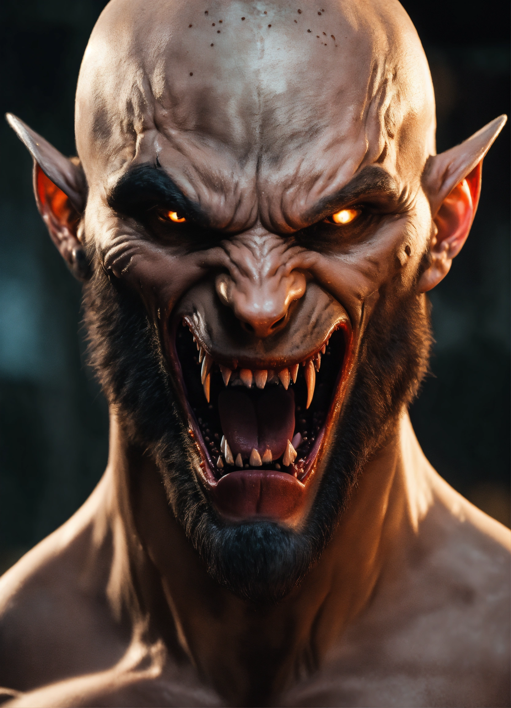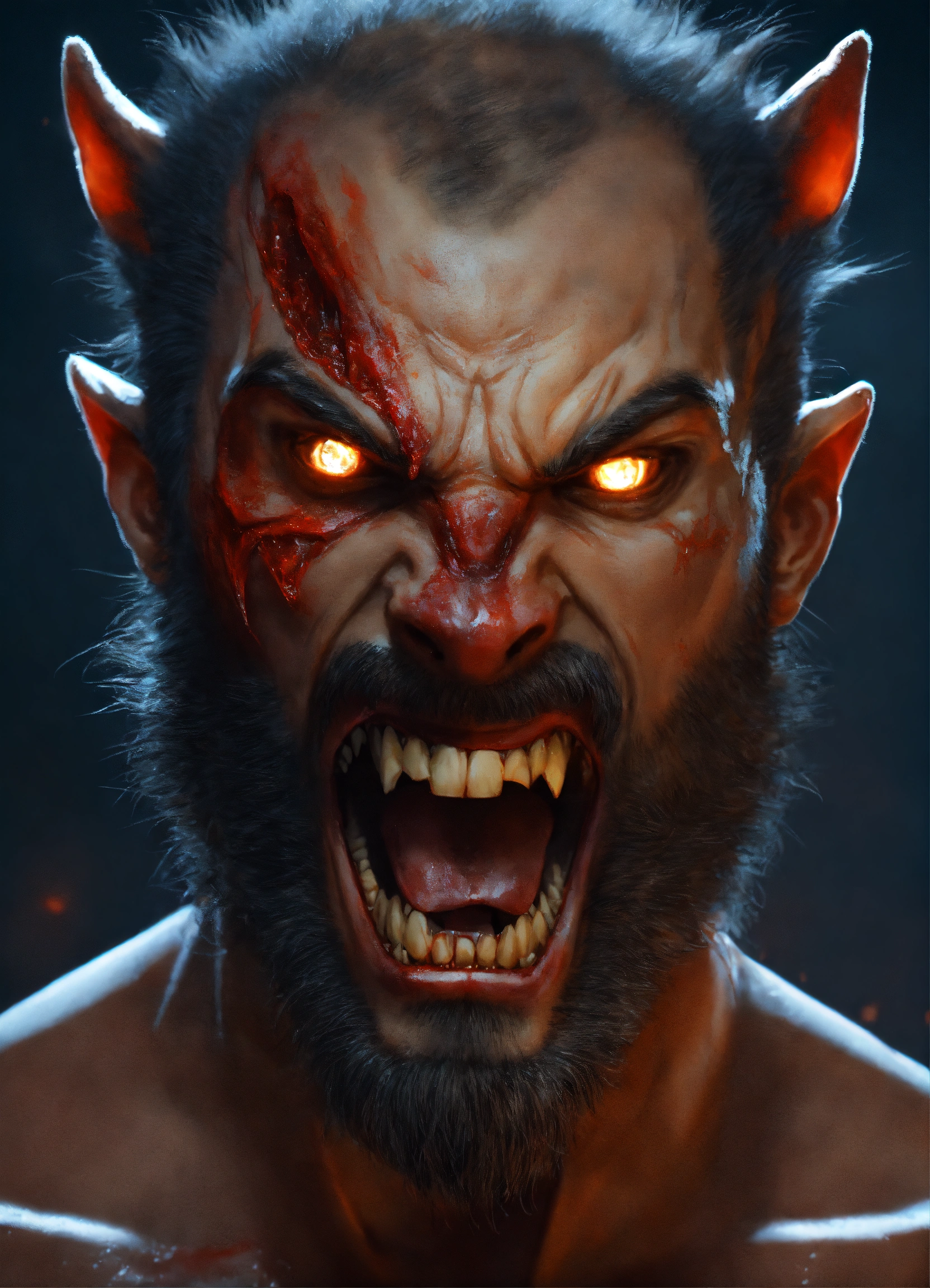 A young bald man with beard with sharp claws and bared fangs a terrifying transformation sequence of a human turning into a werewolf, capturing the shift in anatomy and features werewolf in a mid-transformation state