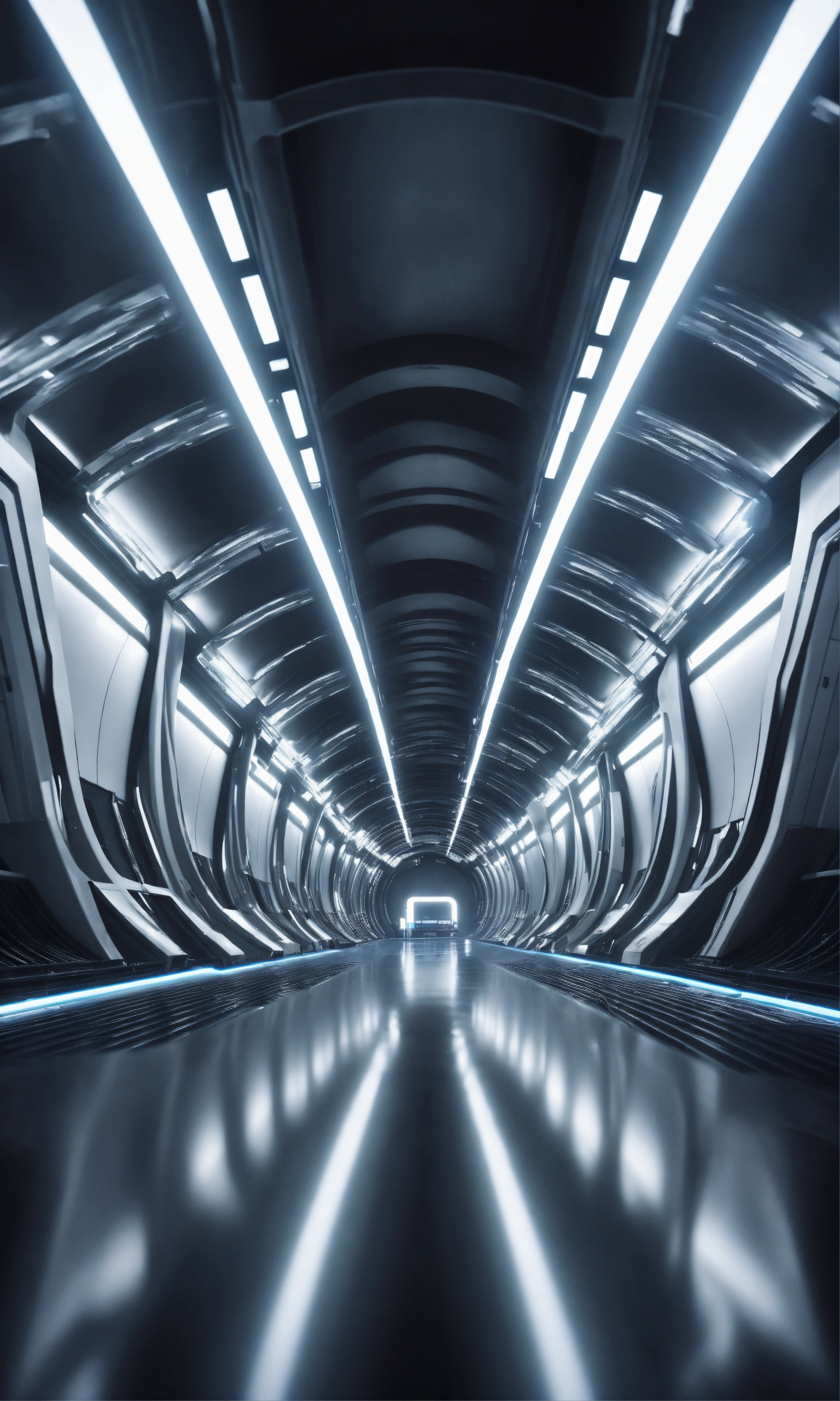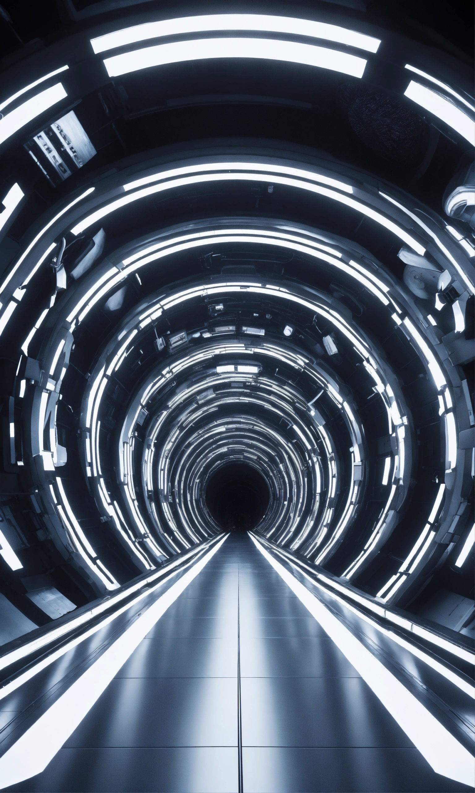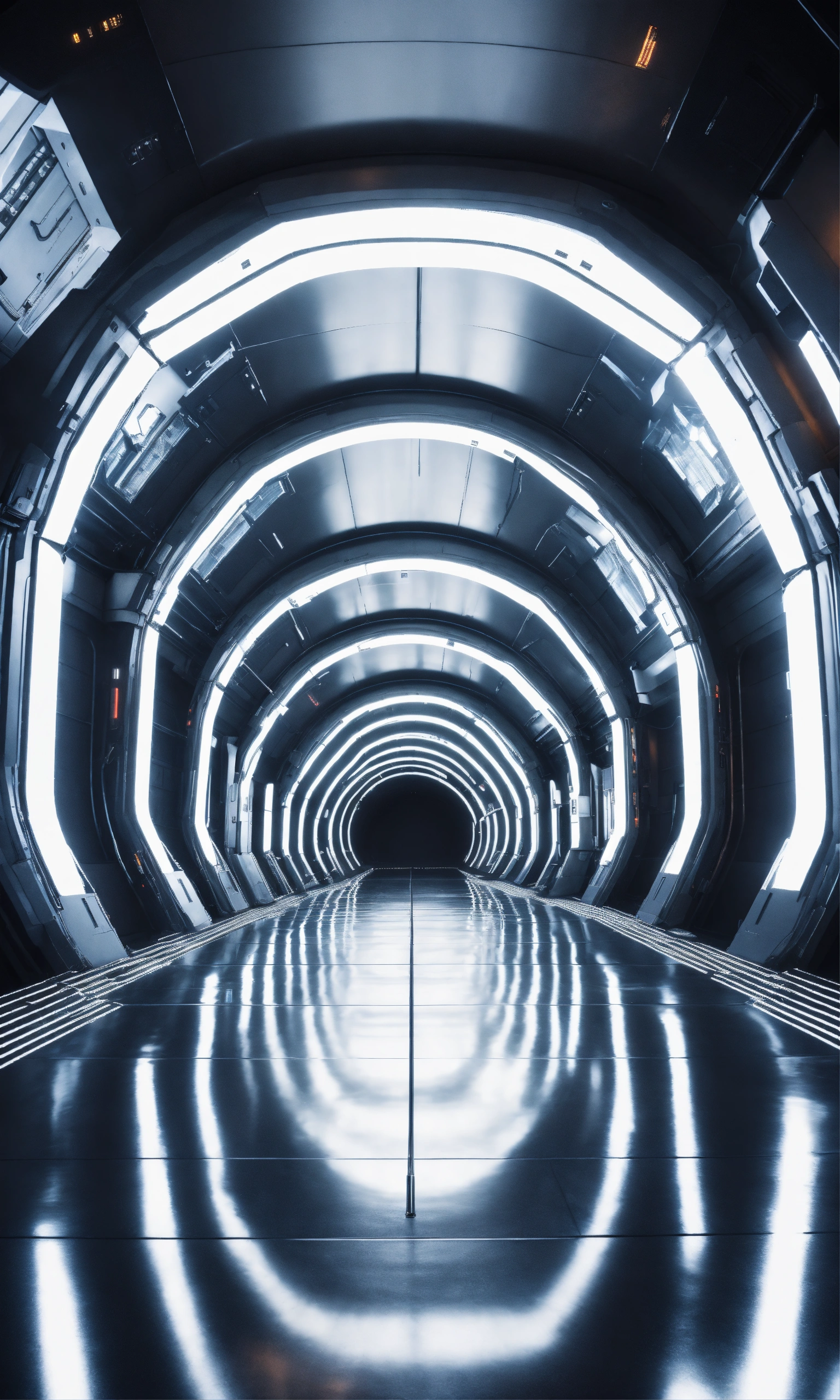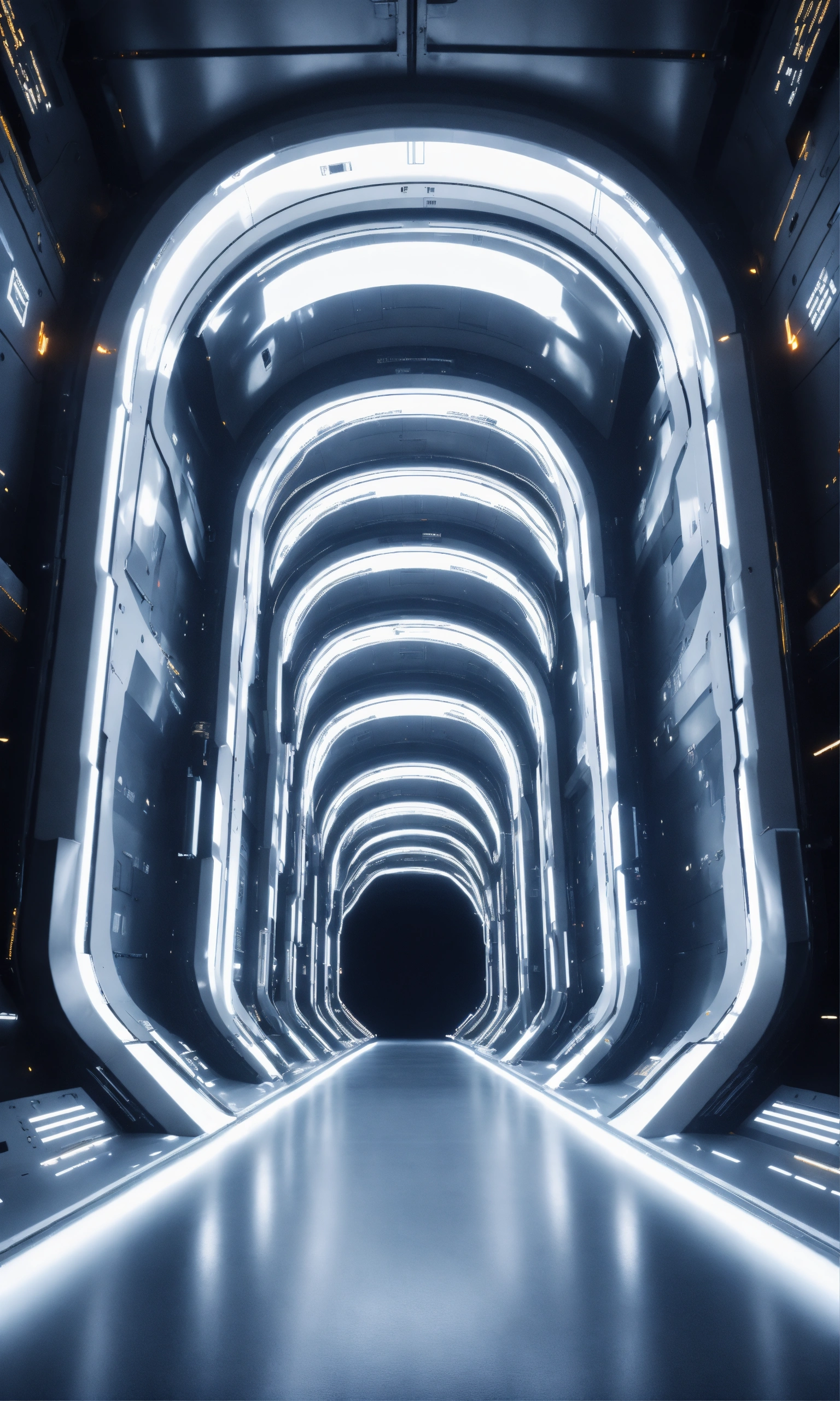 A realistic really dark photo of a sci-fi colossal endless curved upwards tunnel, futuristic, with white metallic walls, inside a space station, with white illumination, hyperrealistic, 8 k