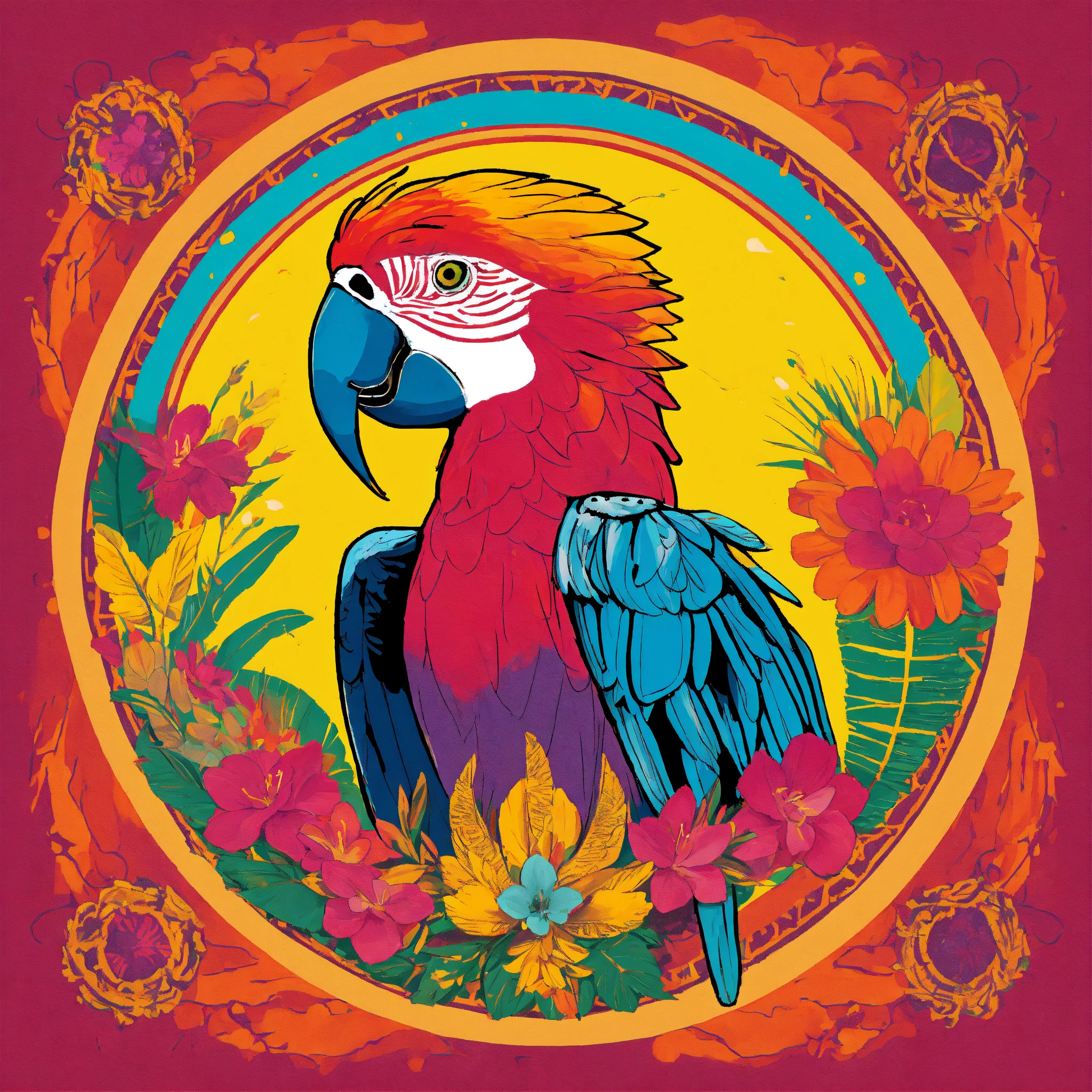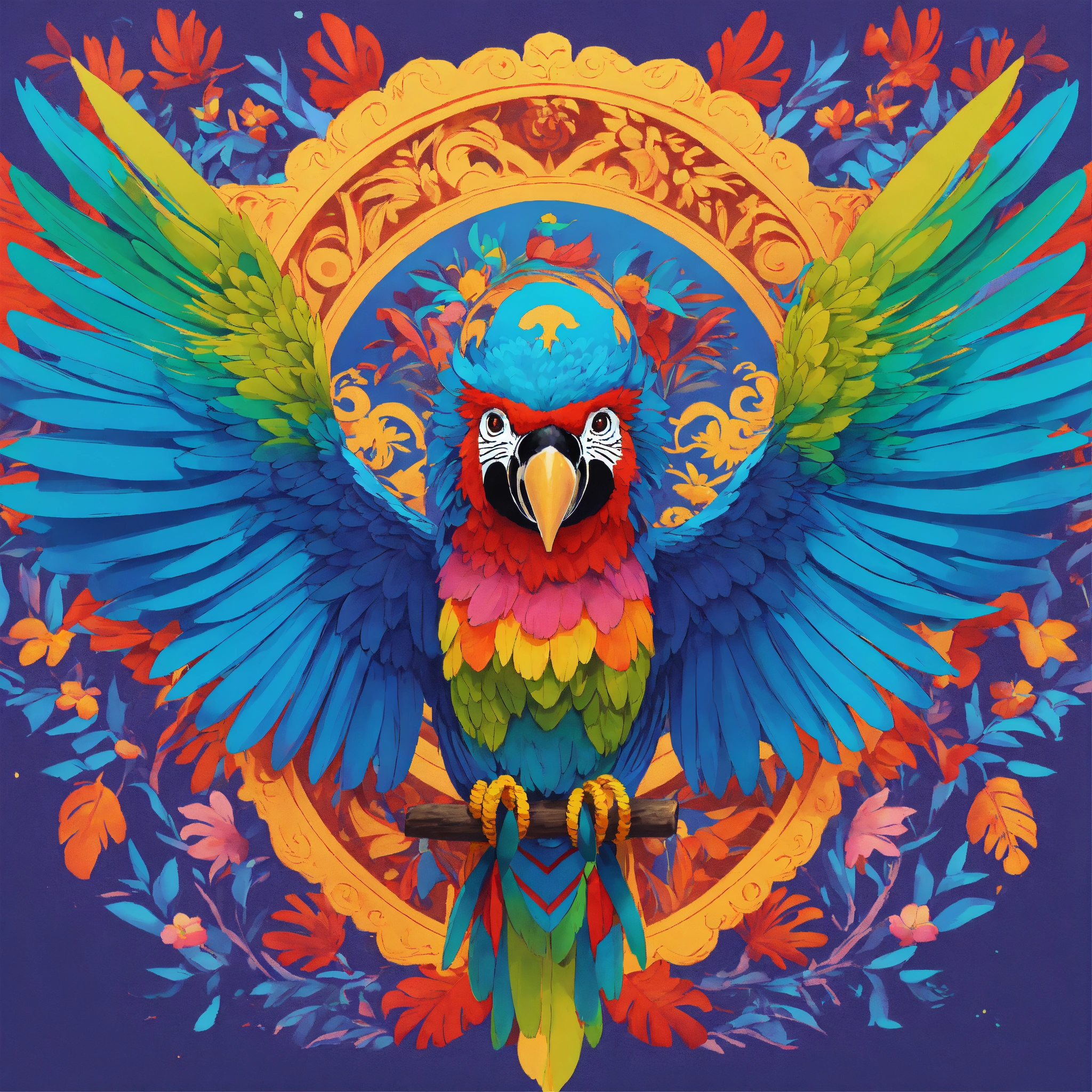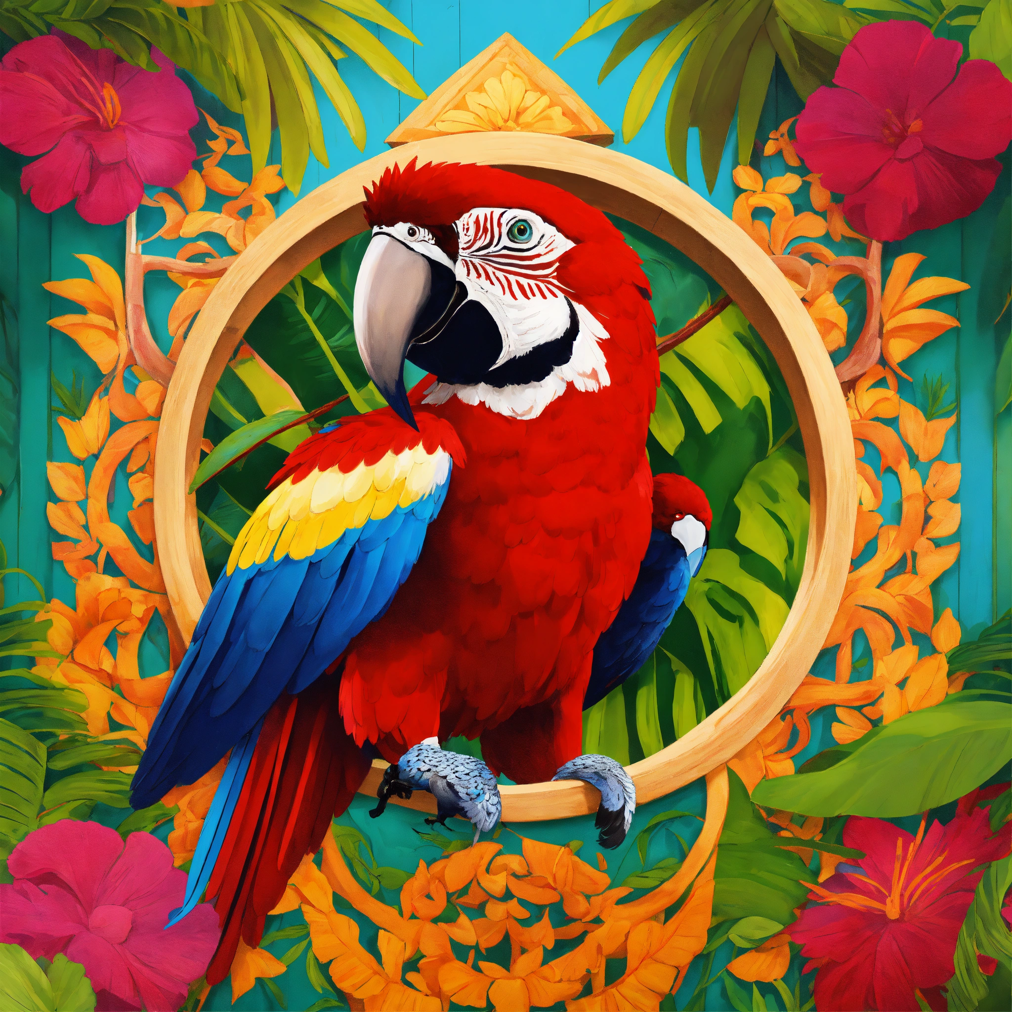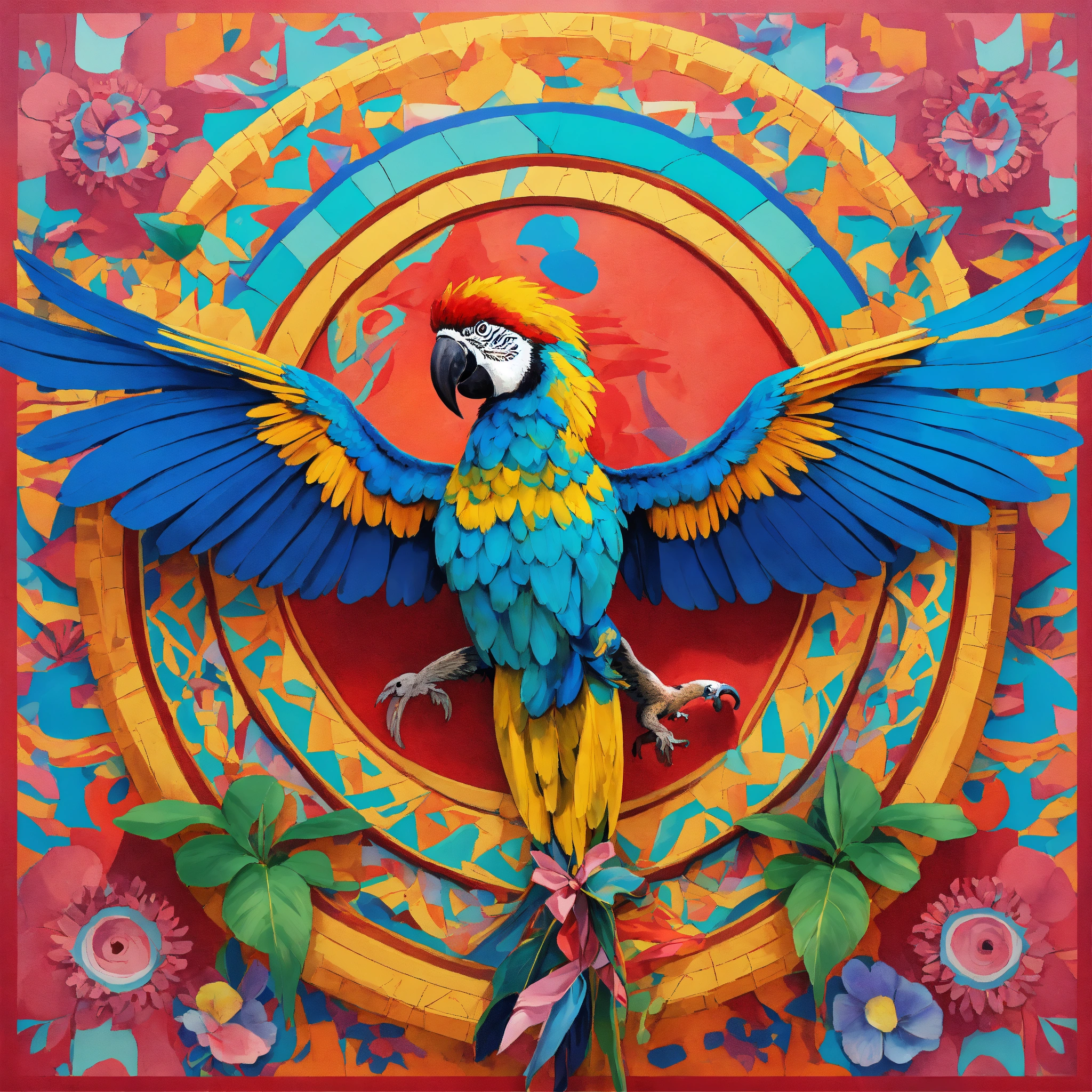 Design a powerful mural-inspired digital artwork titled 'wings of resilience.' depict a true macaw as the central figure, its vibrant plumage symbolizing the beauty of puerto rico's nature. surround the macaw with a circular frame made of coqui frogs, representing unity and resilience. in the background, use bold and vibrant colors that reflect the rich culture of puerto rico. incorporate subtle taino petroglyphs or symbols to pay homage to the island's indigenous heritage. above the mural, add a banner or ribbon with an inspiring message like 'strength in unity' or 'puerto rican pride.' your task is to bring this concept to life in a visually striking and emotionally resonant digital artwork, celebrating the resilience and identity of puerto rico.