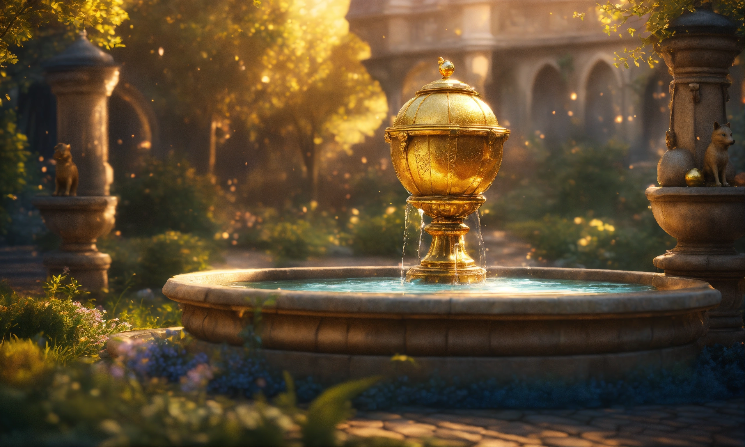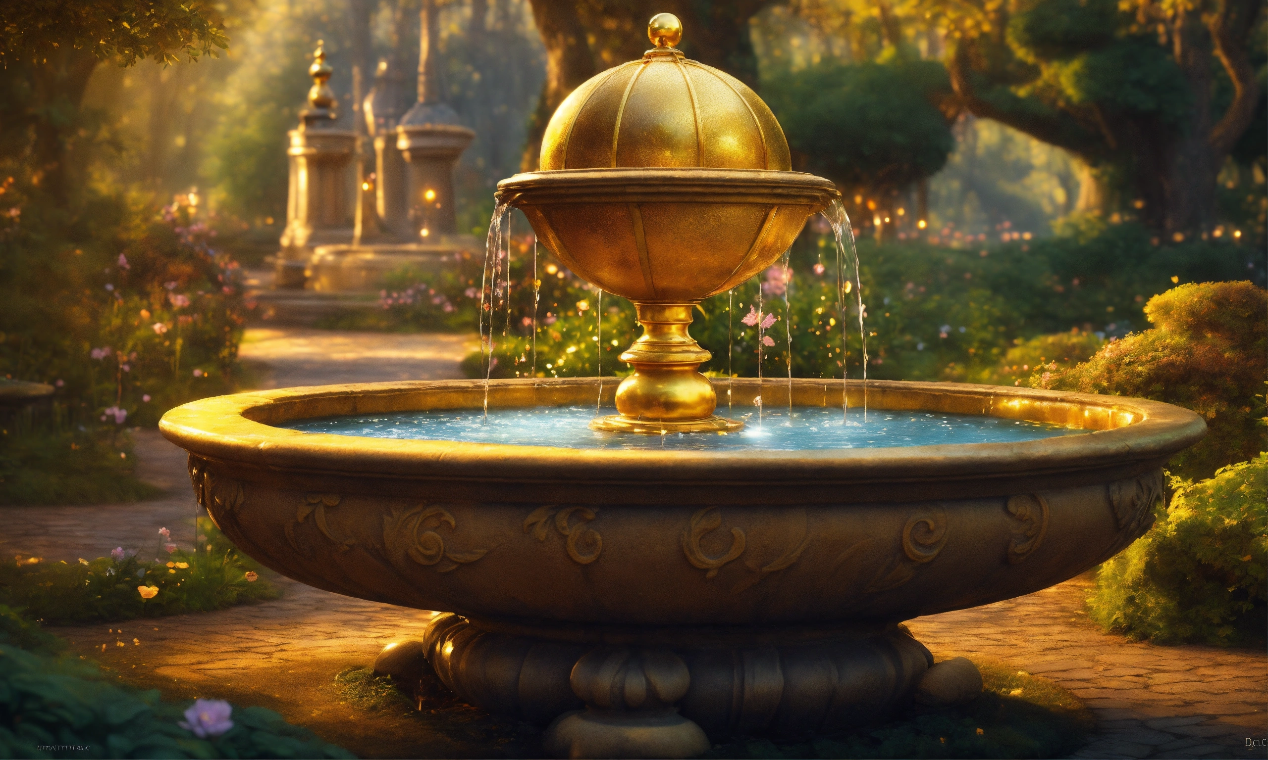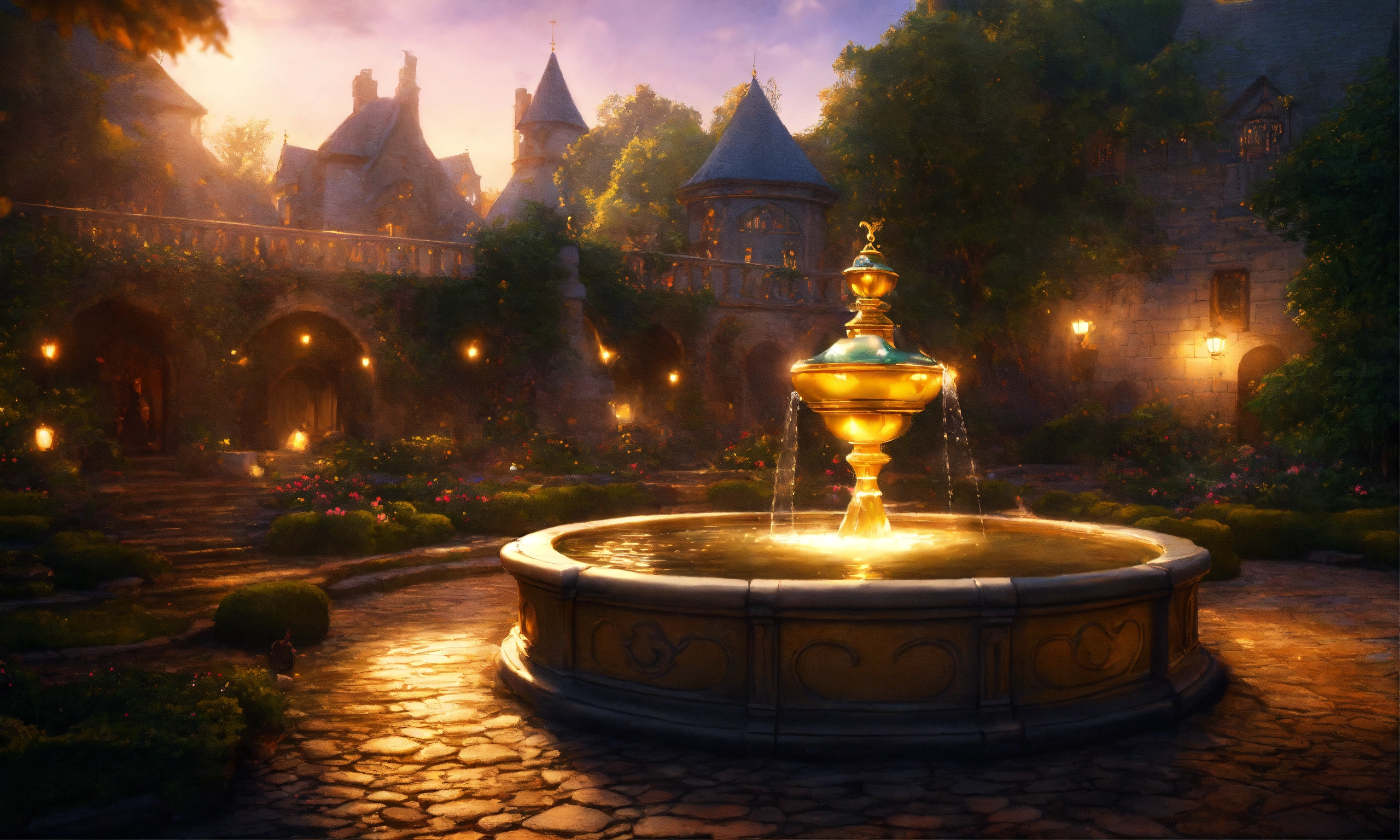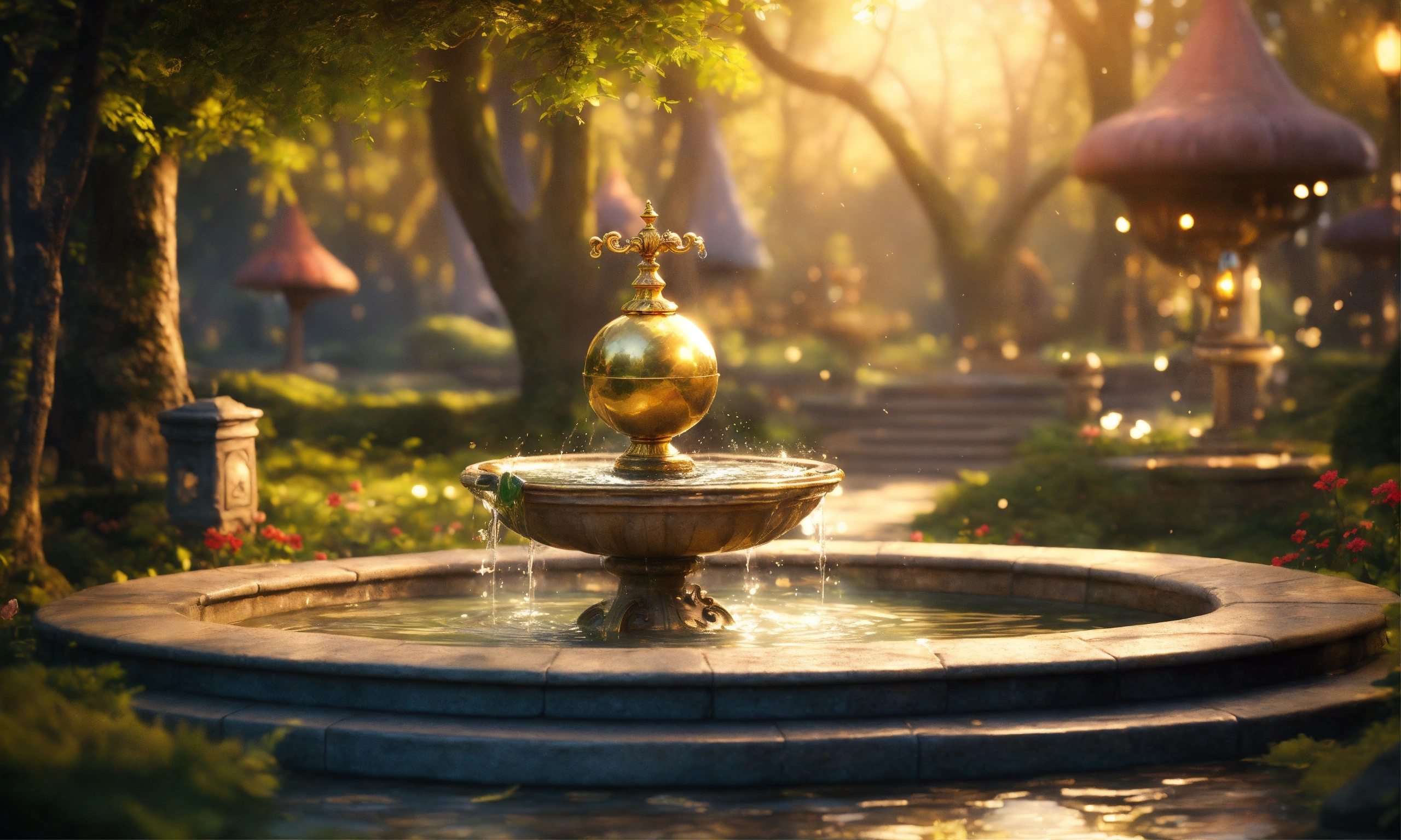 Epic shot of very detailed and beautiful medieval fountain with a golden ball in a fairytale forest, ultra detailed beautiful princess evening atmosphere, ultra cozy and inviting, style of cinderella, digital painting, little photorealistic, ultra cute, sharp focus, ultra cozy and inviting, wish to be there. very detailed, arty, should rank high on youtube for a dream trip.