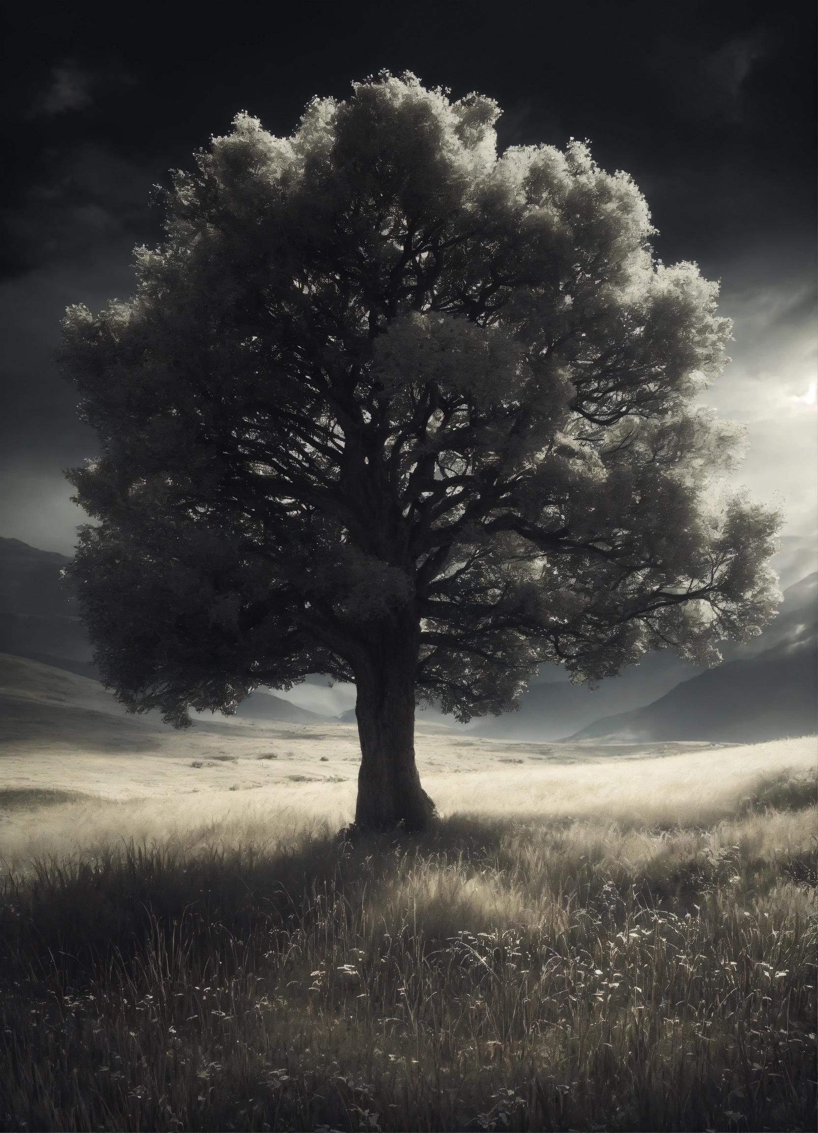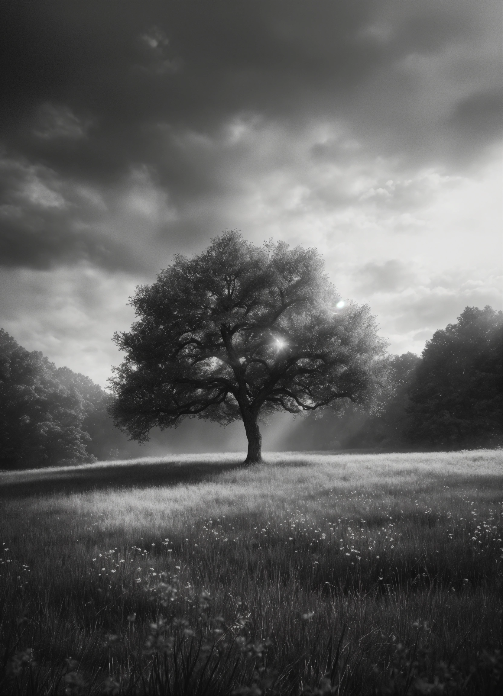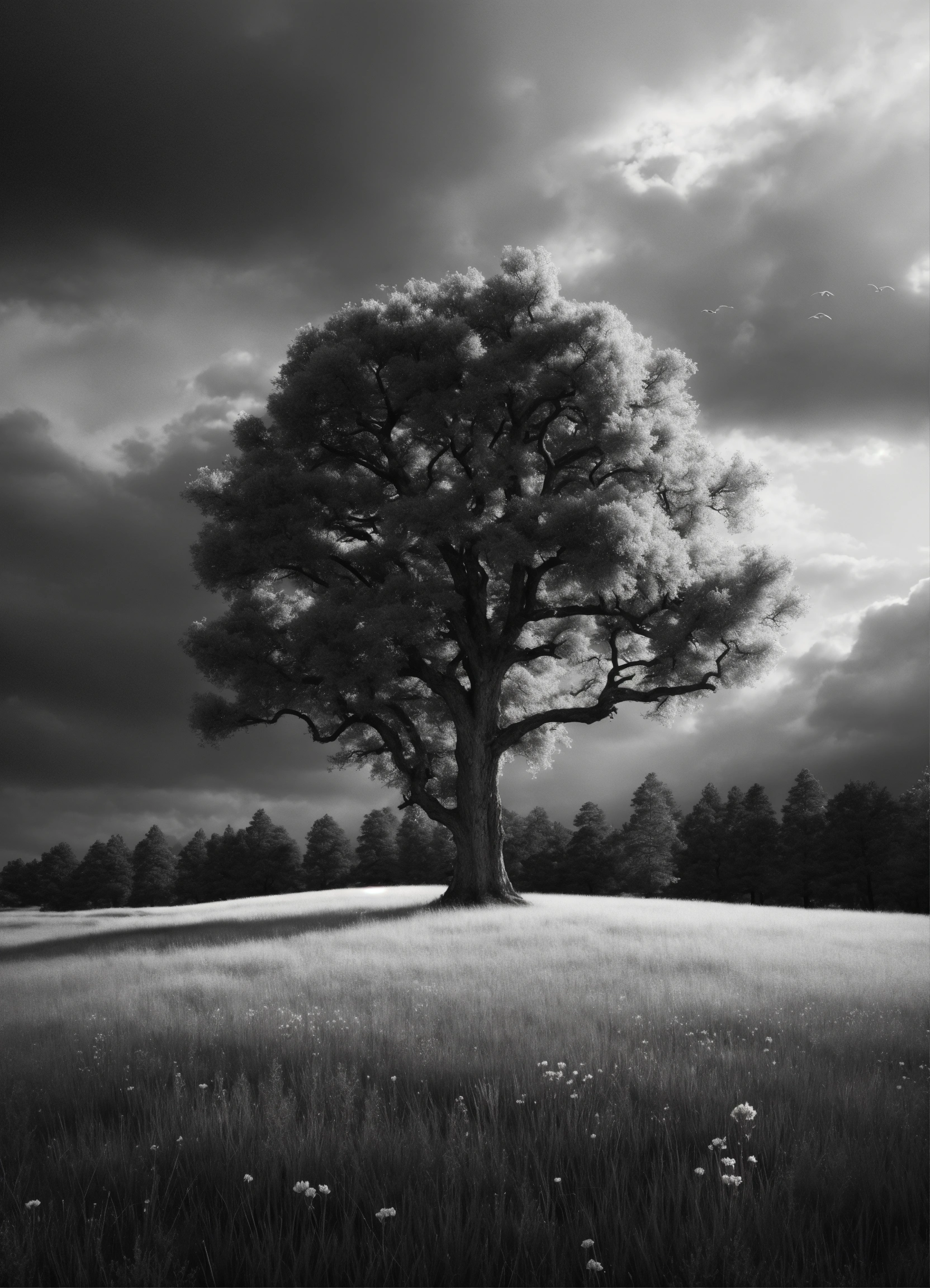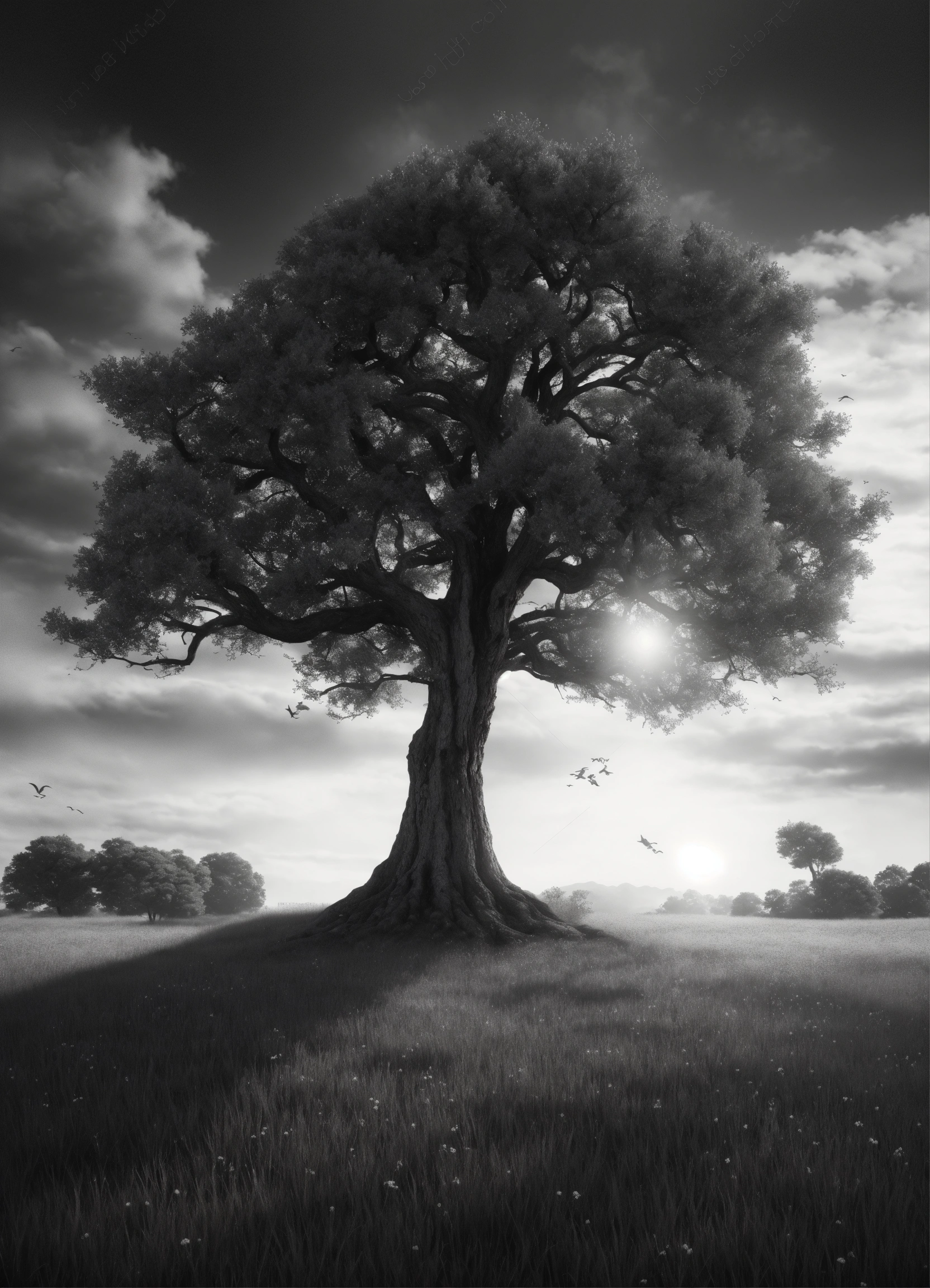 Create a realistic black and white poster of a tree in the meadow, art incorporated as complementary elements, dynamic lighting, detailed, poster, dark fantasy, photo, 3d render