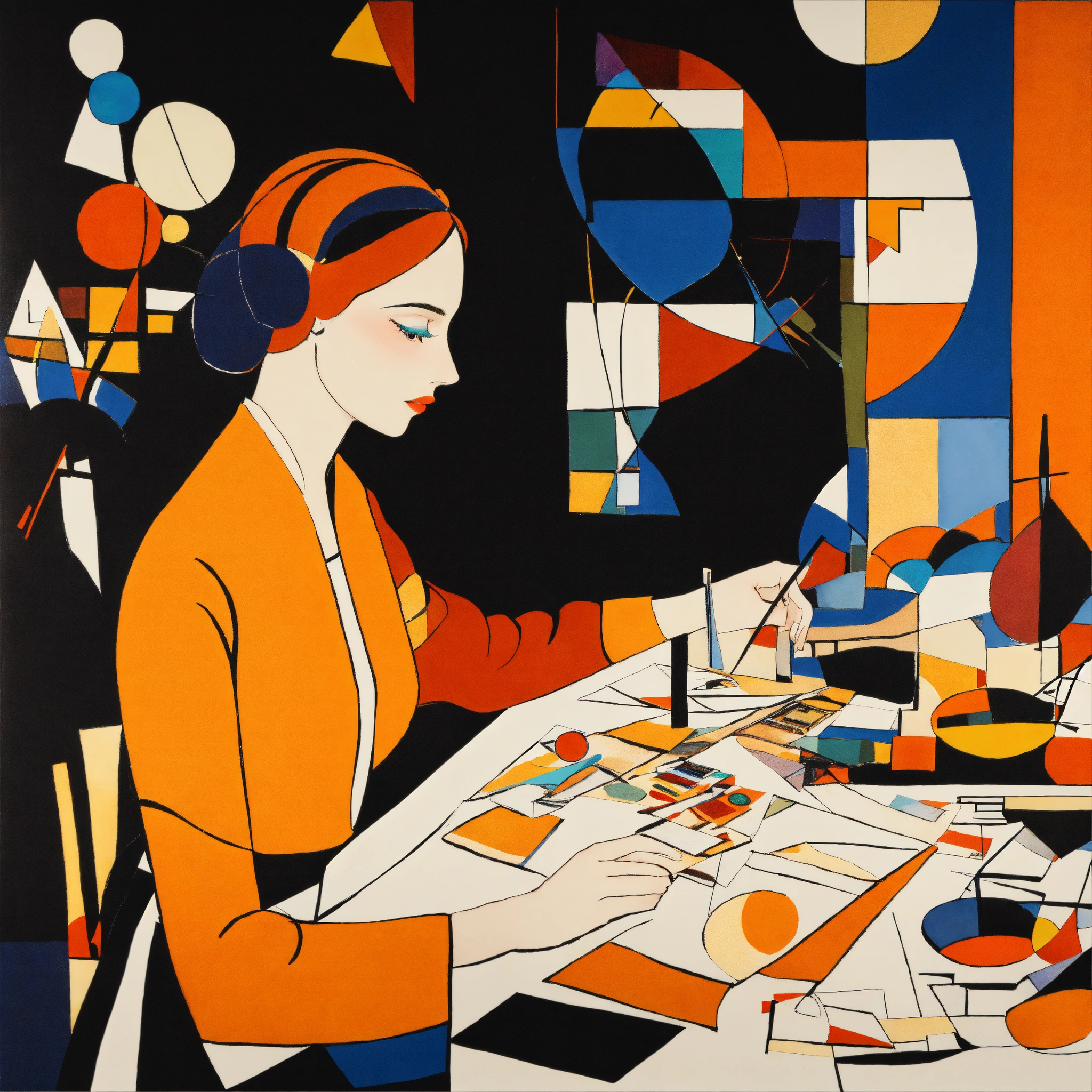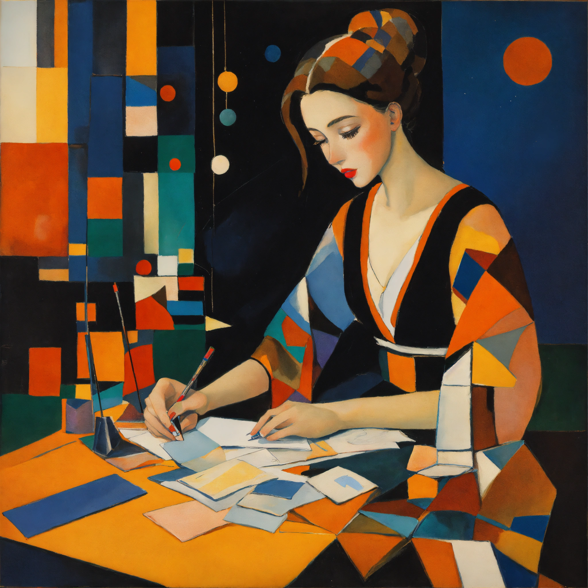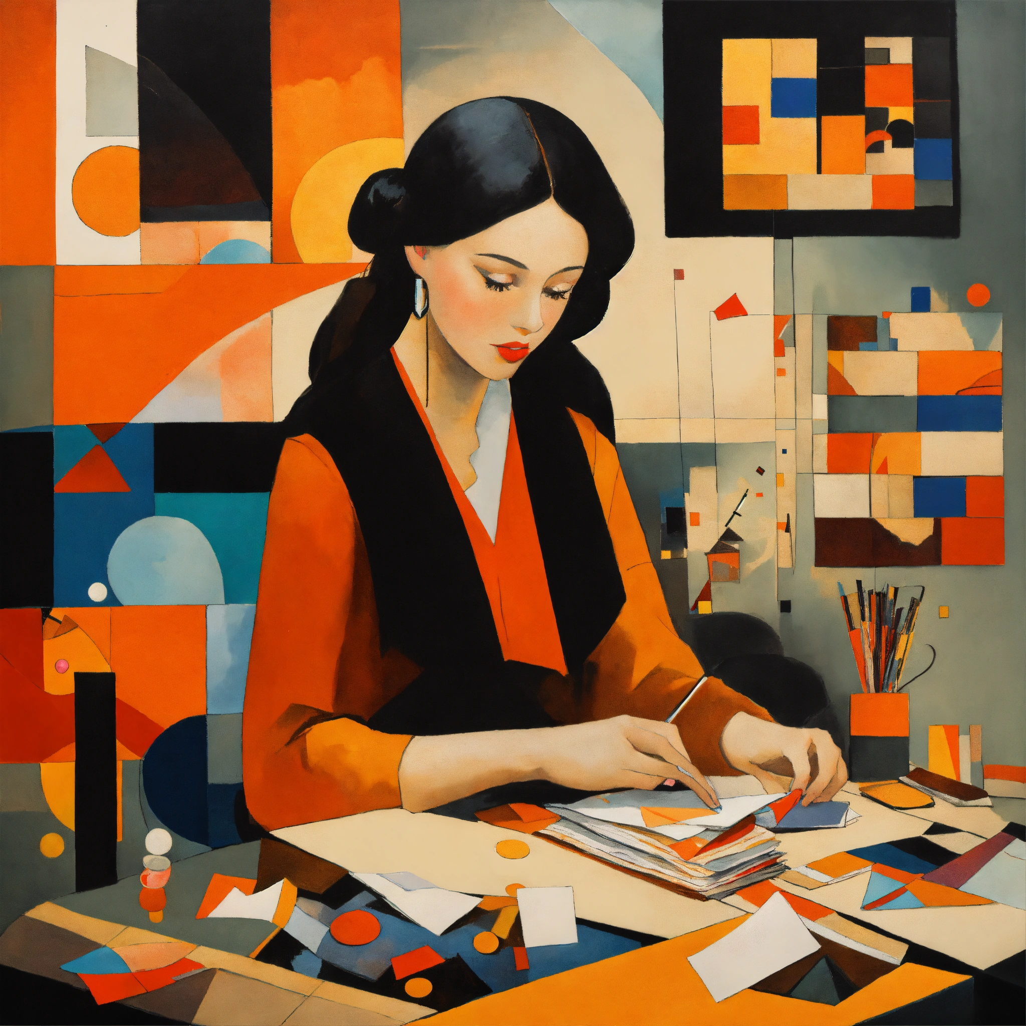 A beautiful young woman is sorting through her correspondence, the style is modern, bright, with the use of visual charms. style wassily kandinsky. colors black, bright orange