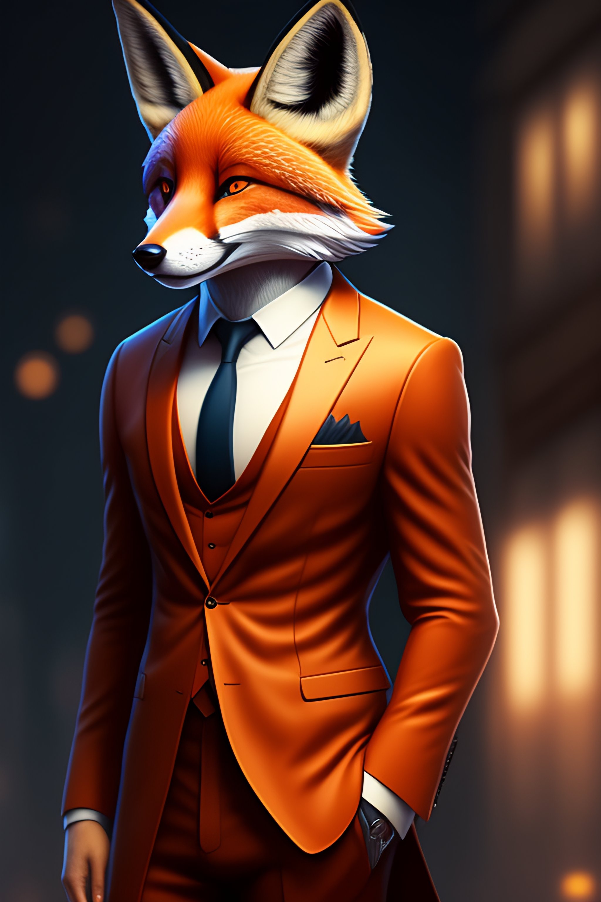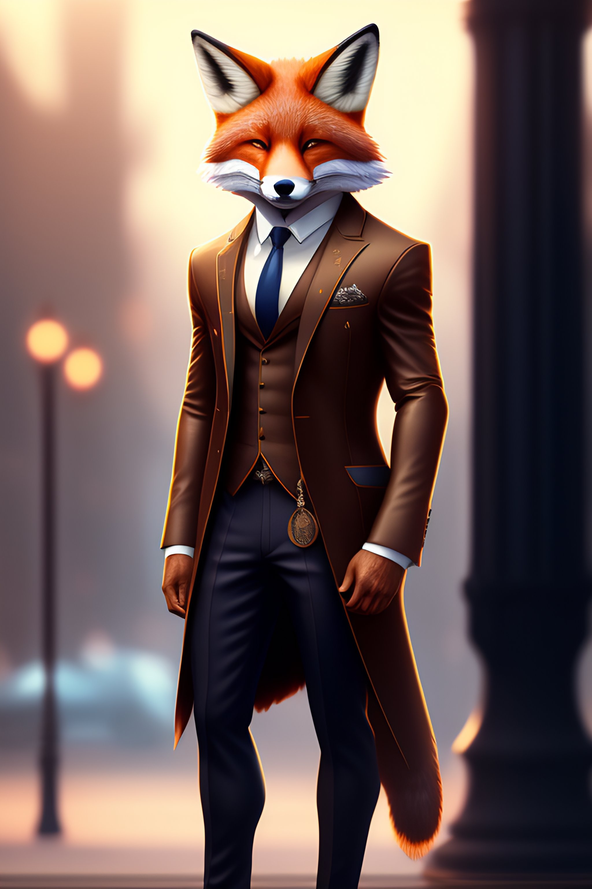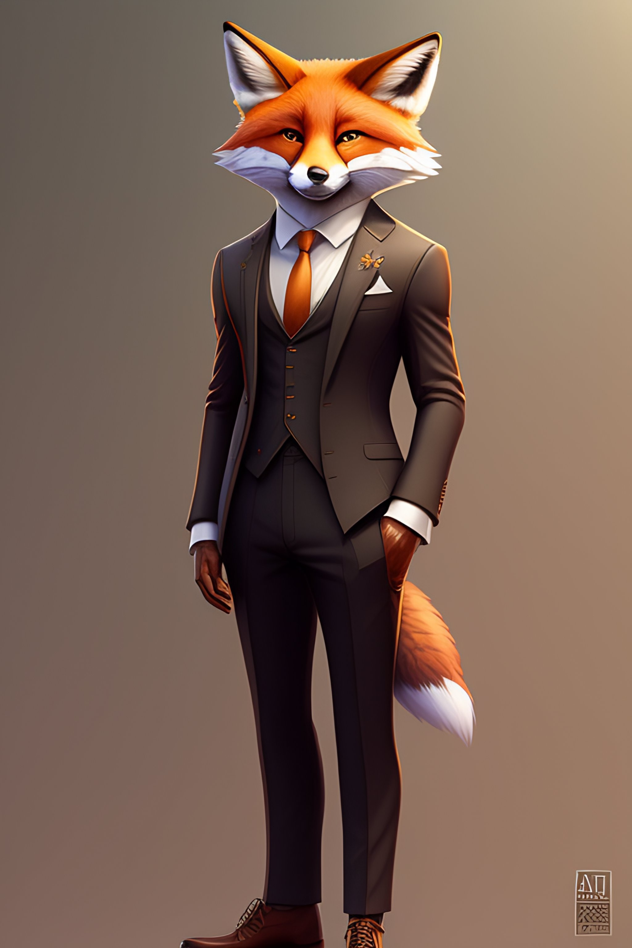 Anthro furry humanoid fox, three piece suit, checking watch, character concept design, painting, detailed, vivid, trending on artstation