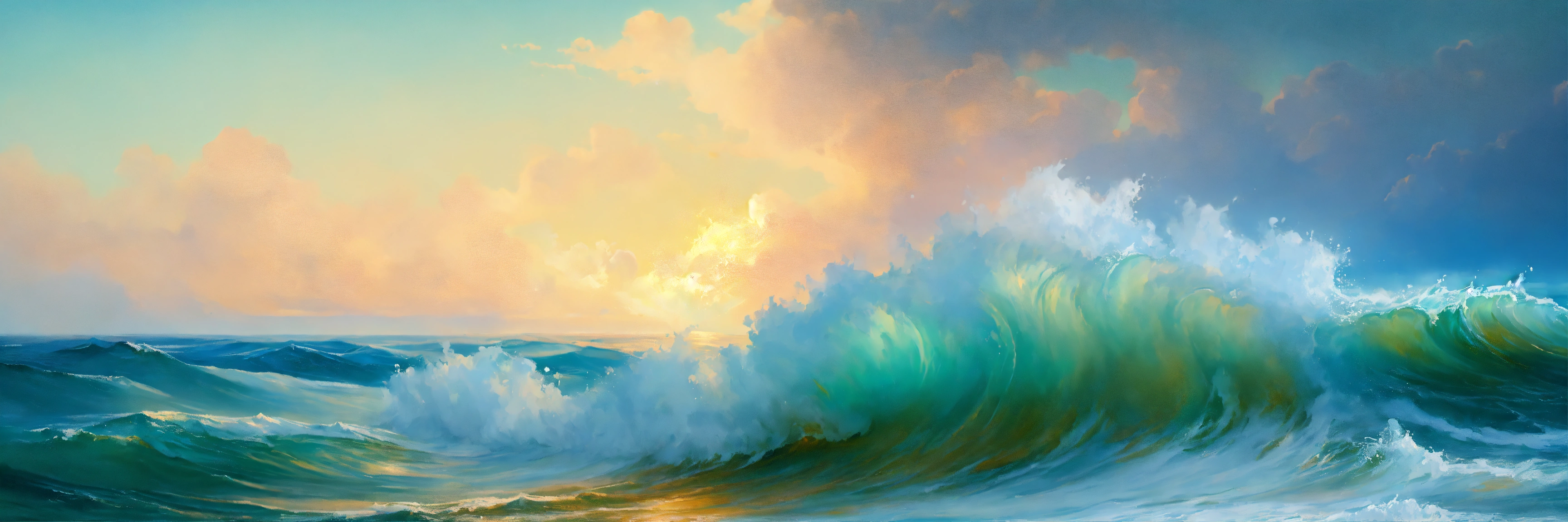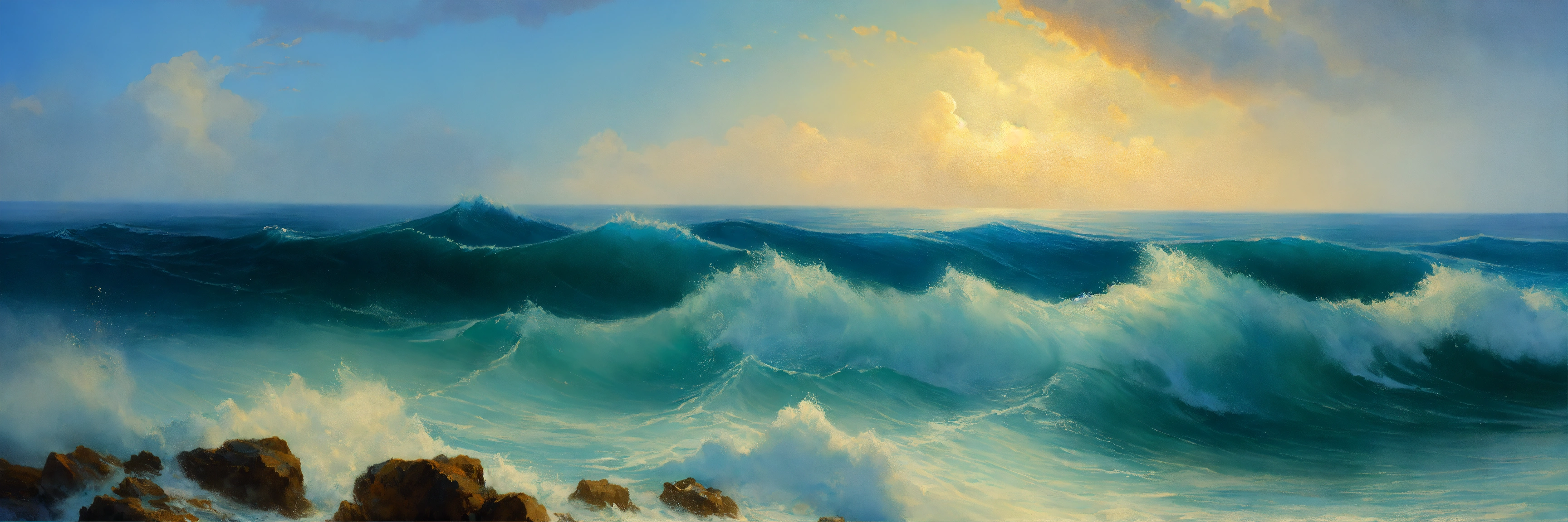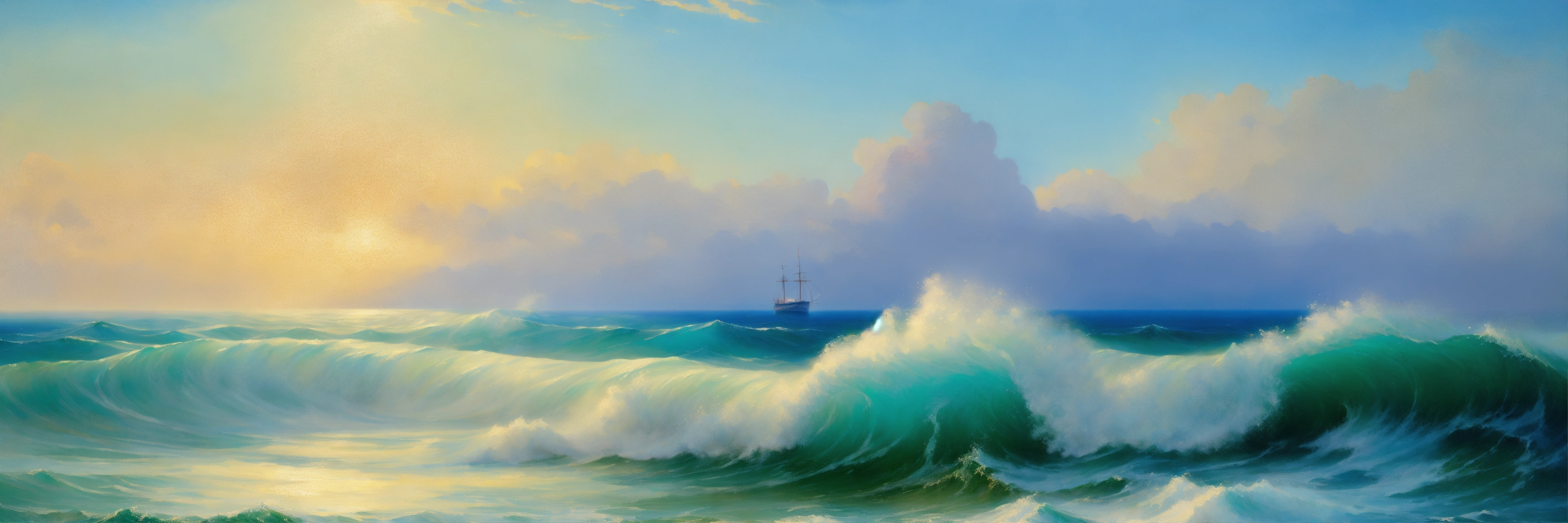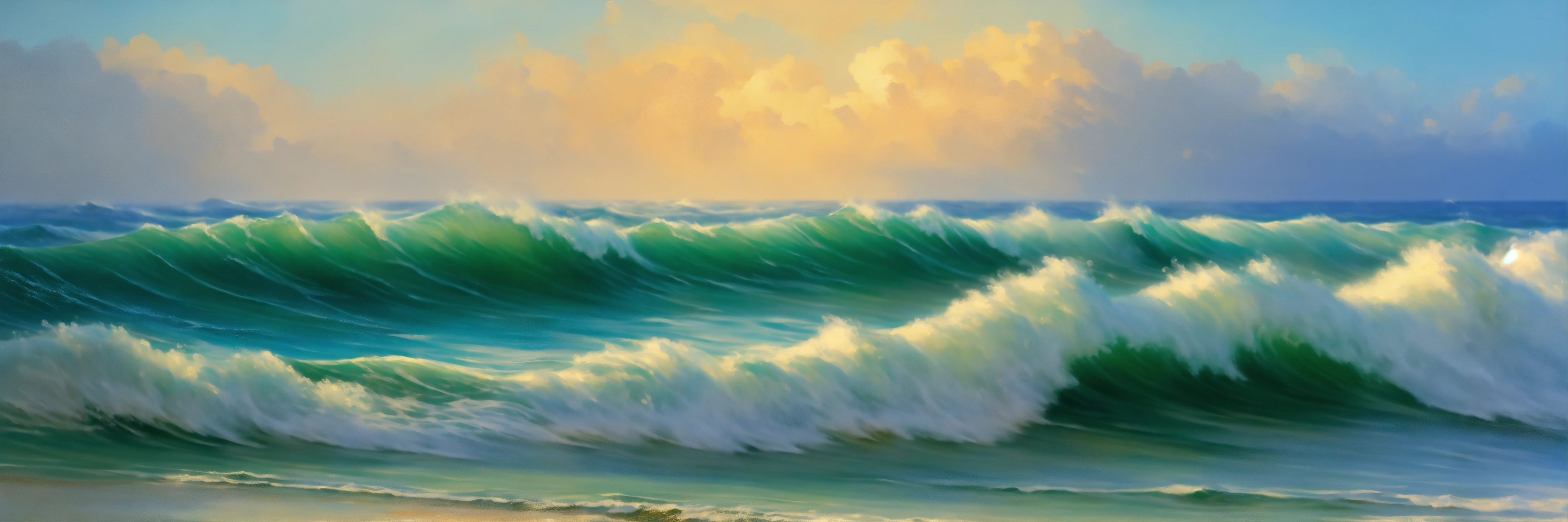 Sea waves rolling onto the shore close-up a lot of foam the color blue in the background the sky aivazovsky fineart