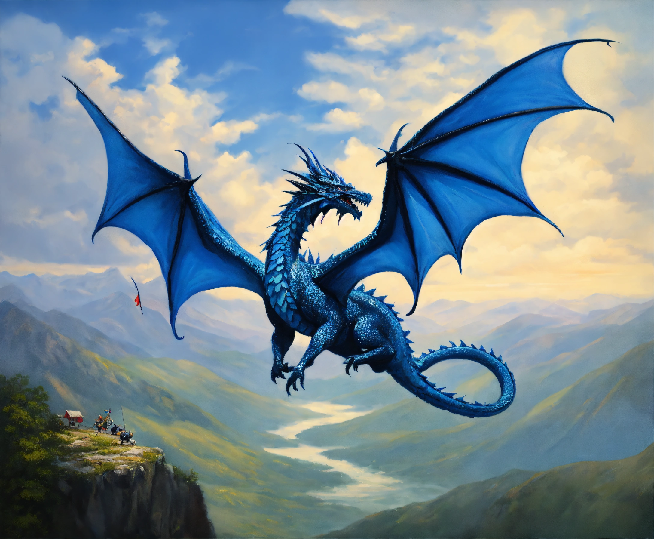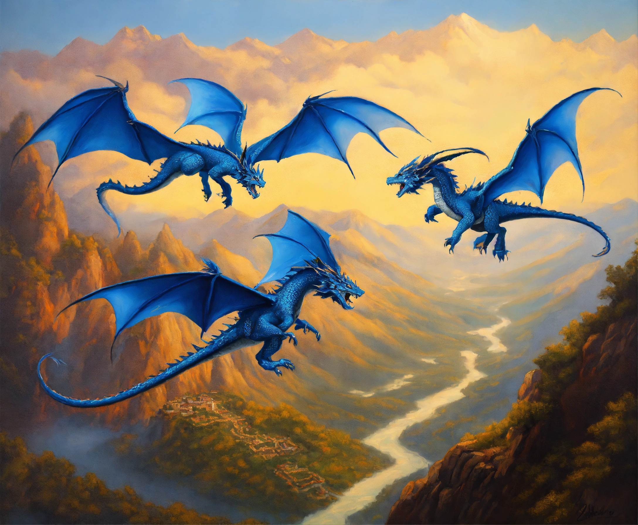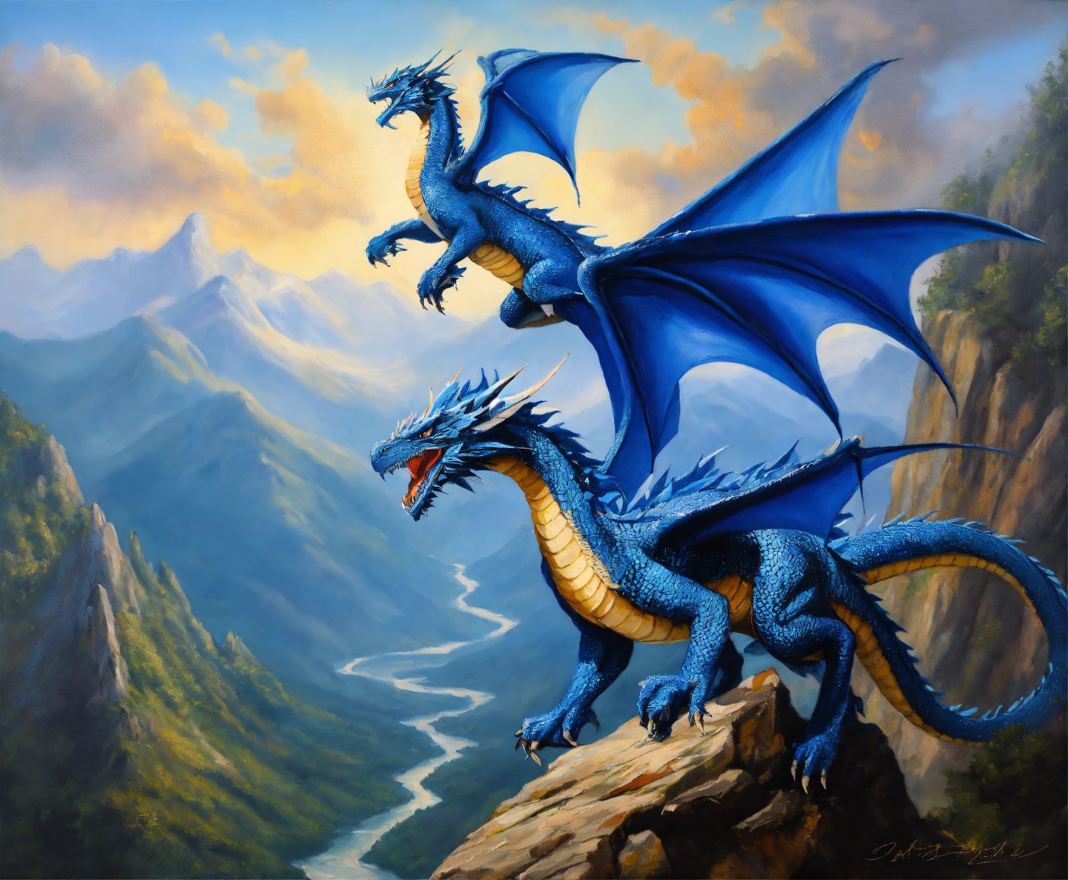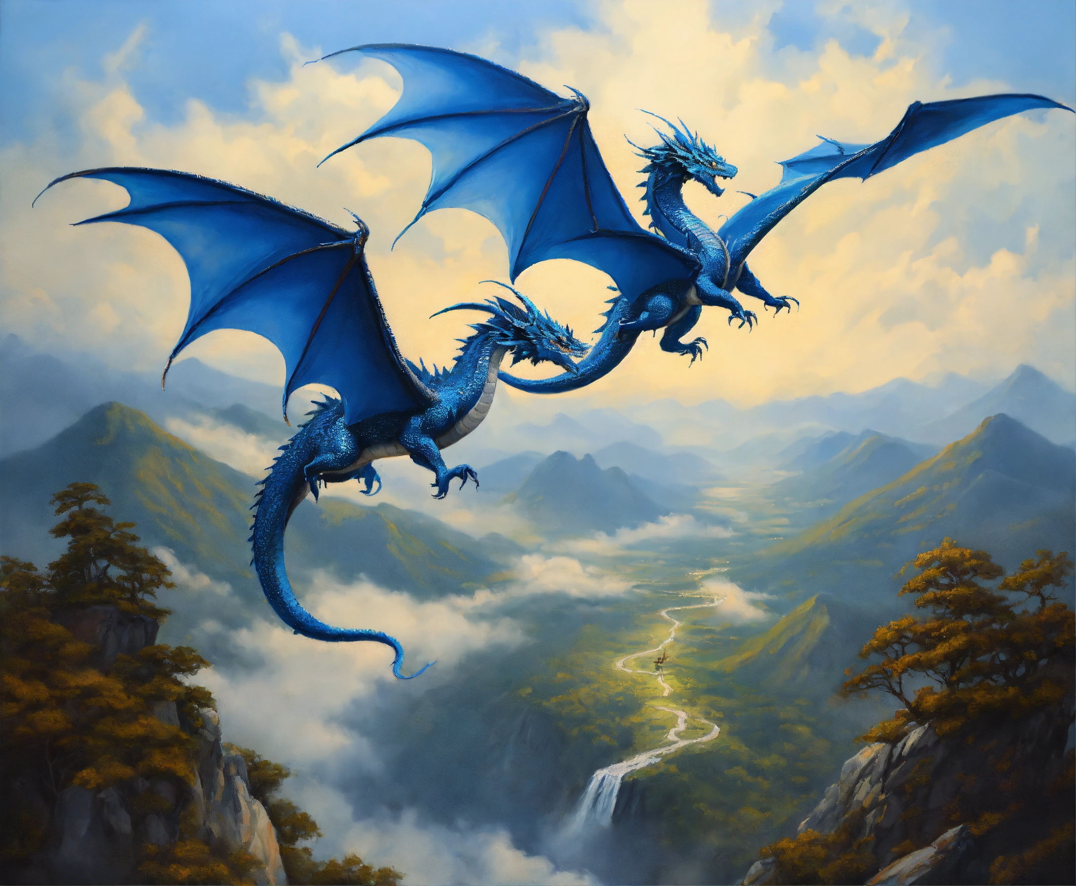 Oil painting of two blue dragons fly through the sky over a high mountain range, ultra detailled, ultra realistic