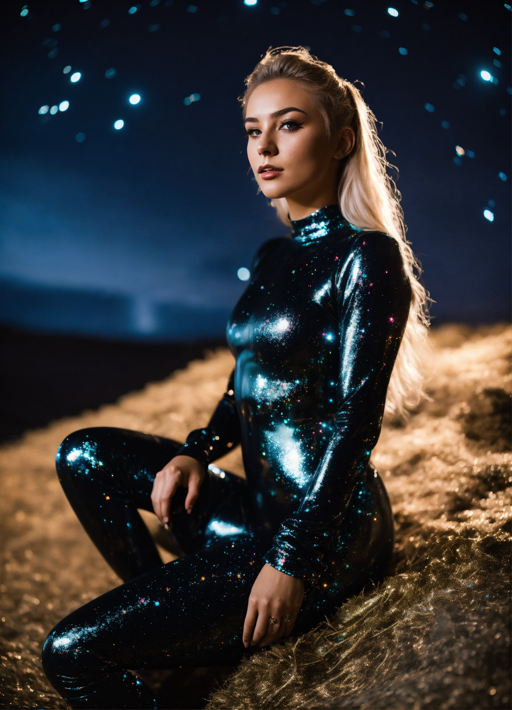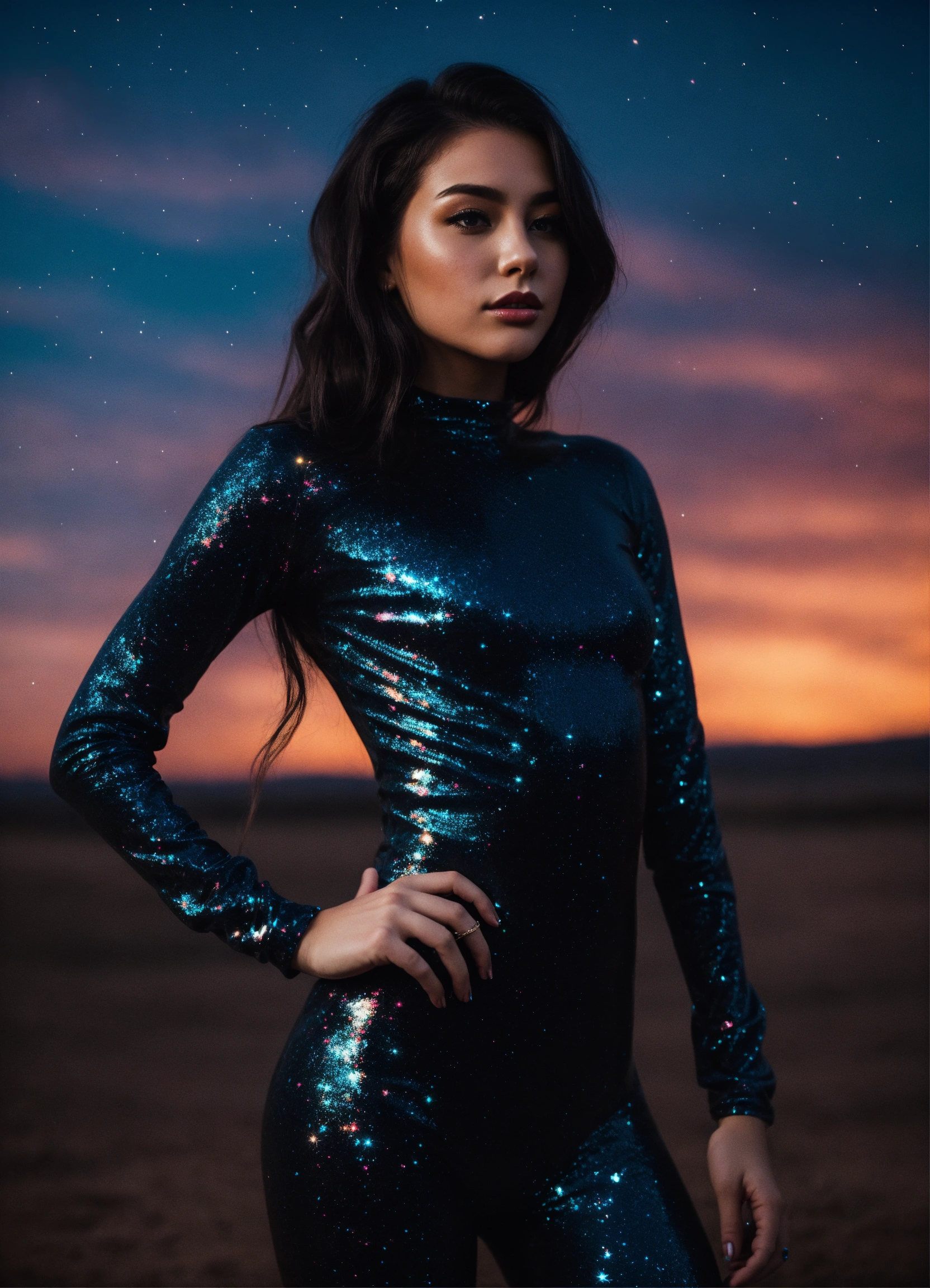 A real photo of a 23 year old girl, she is wearing a dark-metal glitter catsuit, in the sky we see the galaxy