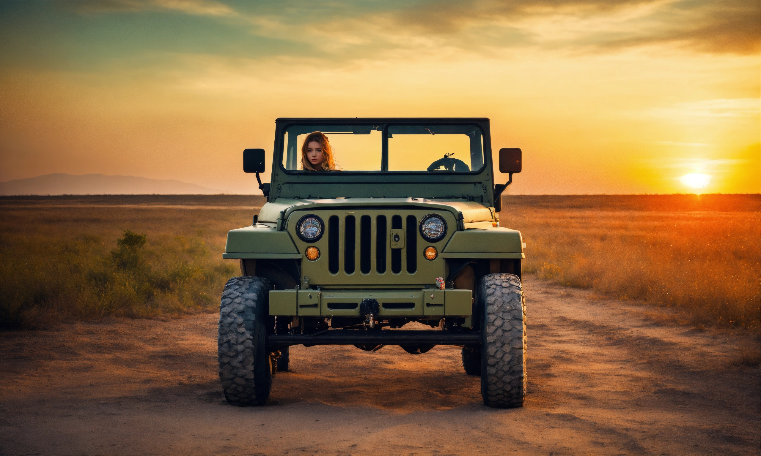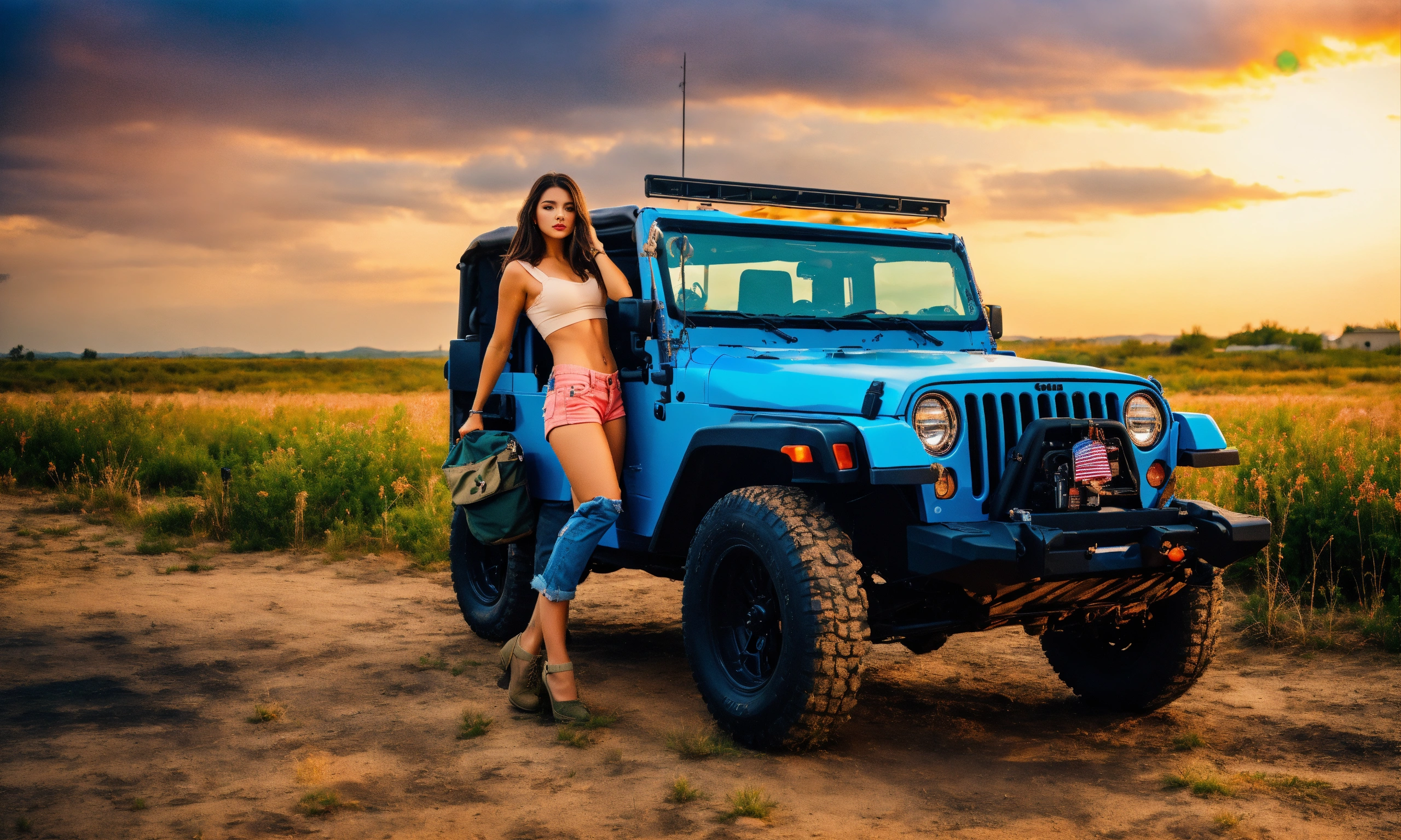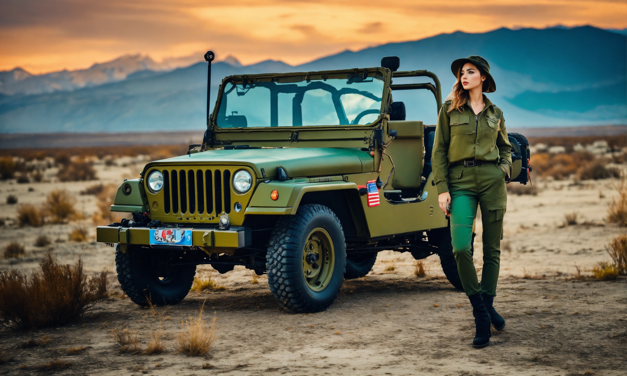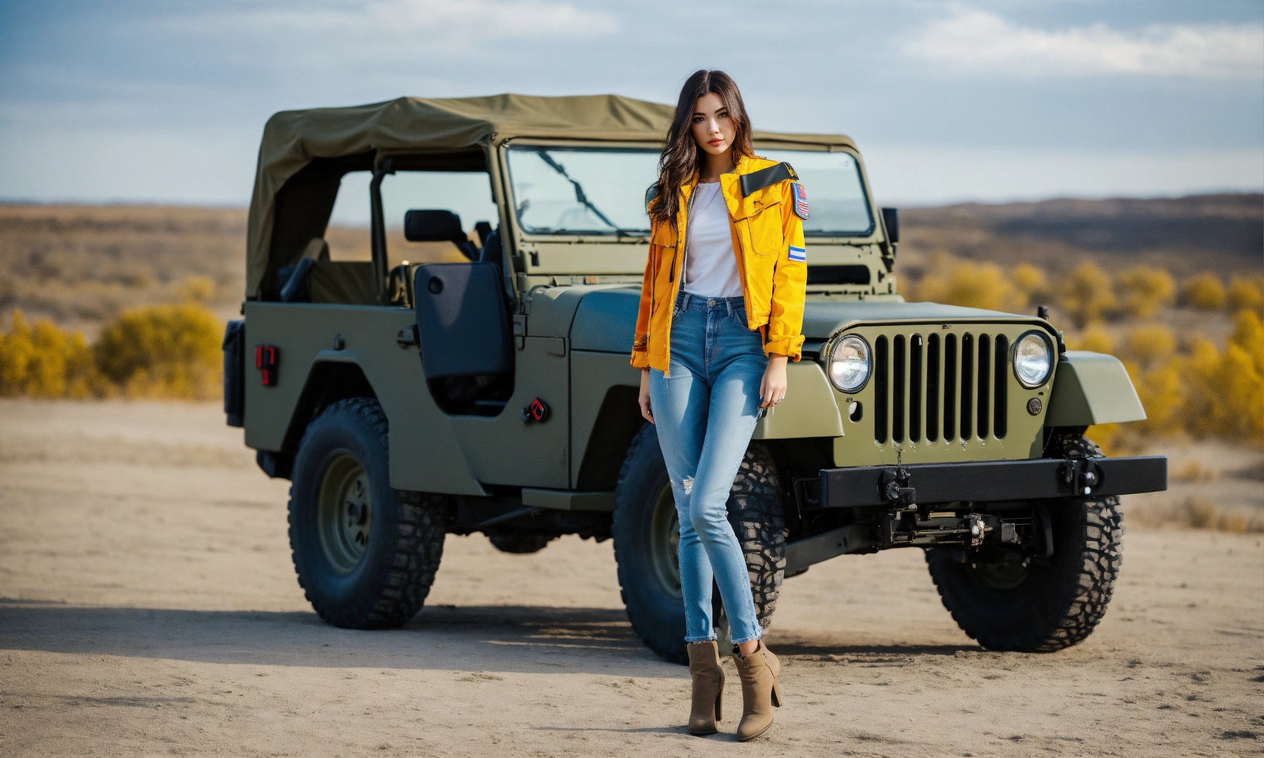 Cool models girl standing by a military jeep, hands in the pants, colorful image, 8k, high quality, perfect view