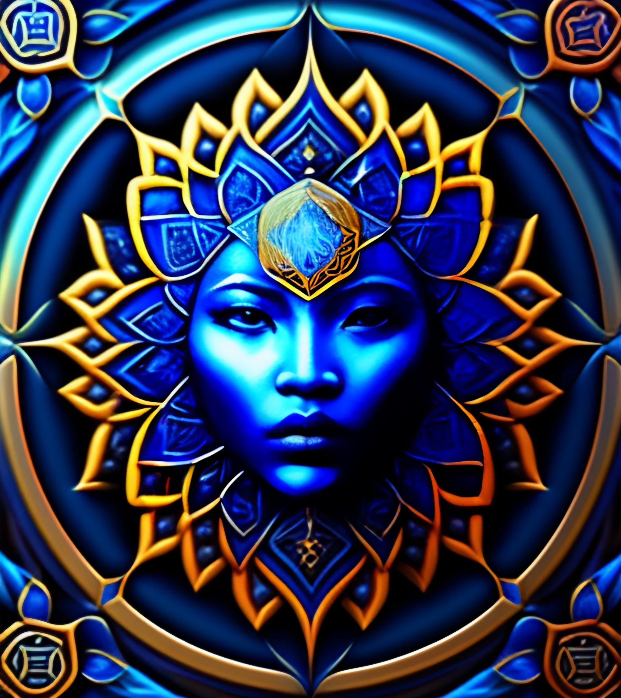 2d blue avatar humanoid drawind psychedelic, 2d flat, mandala or flower of life like, recursive, detailed.