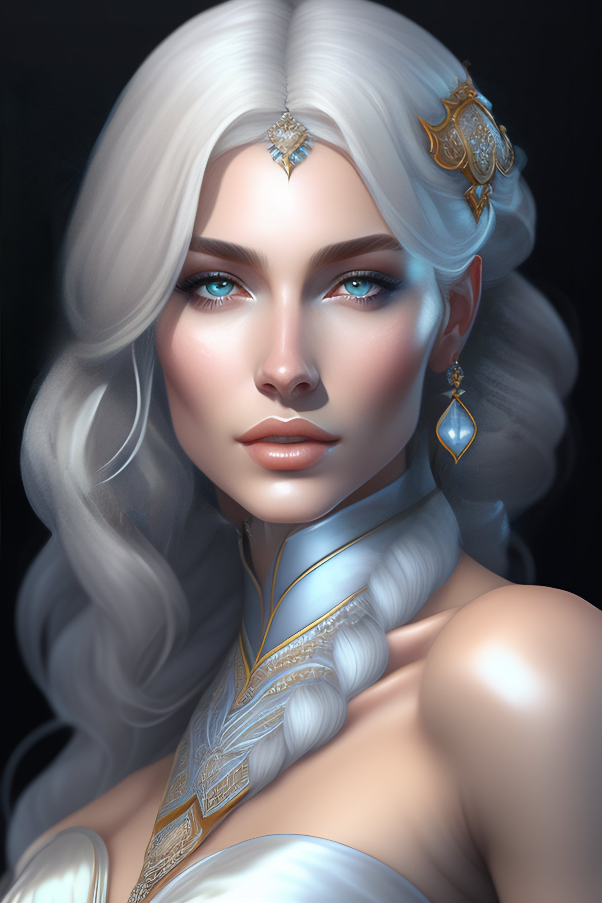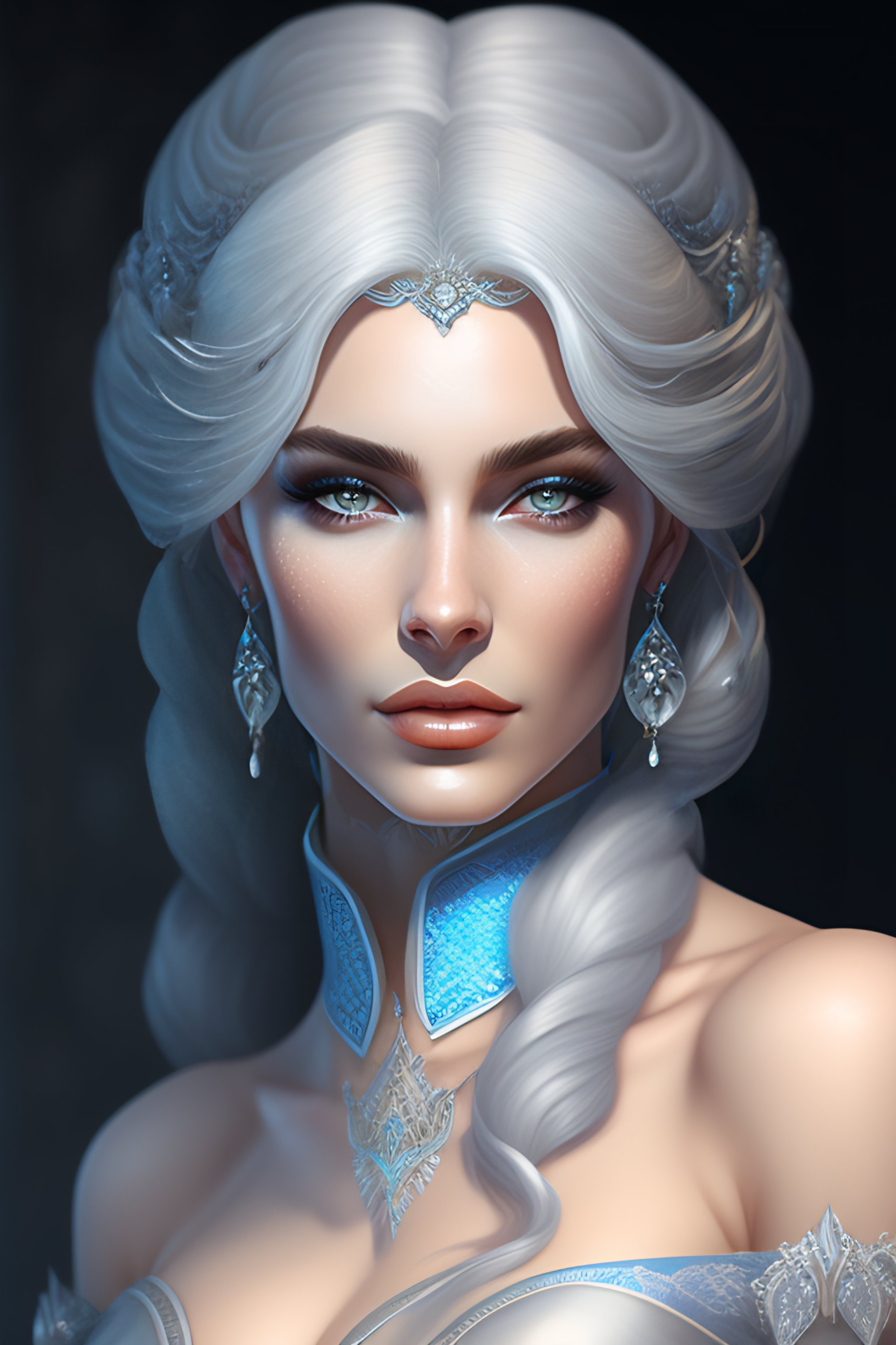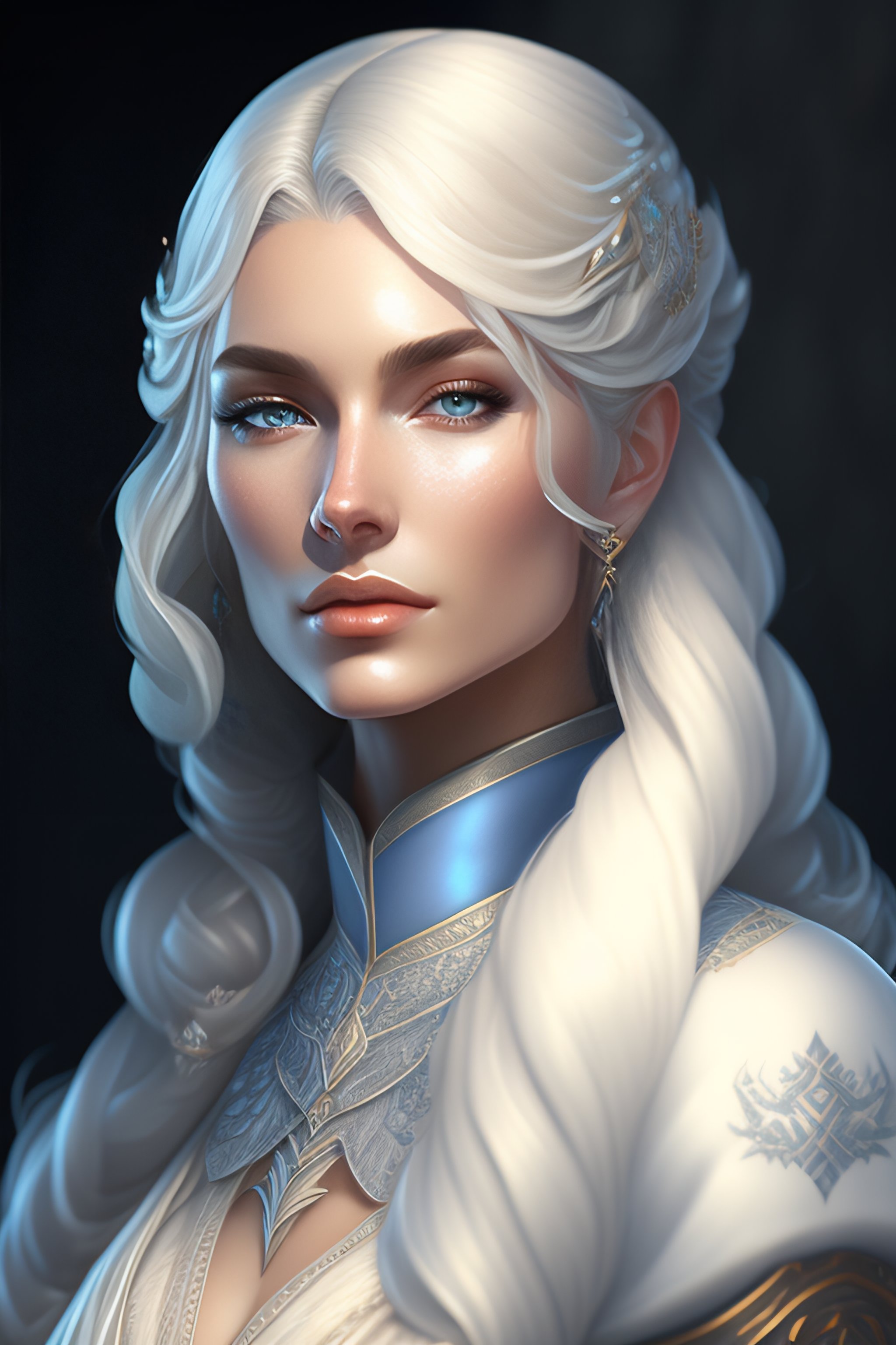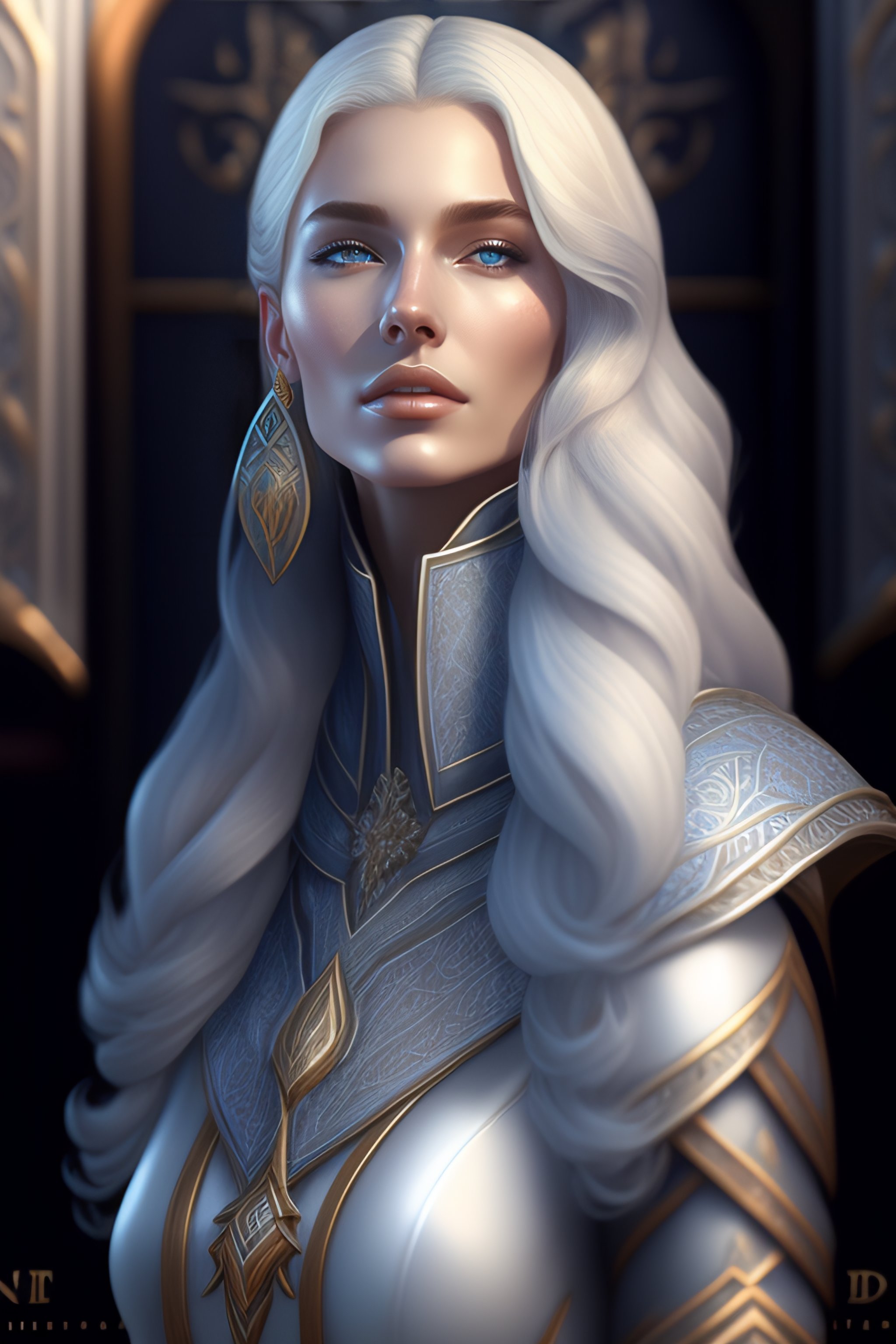 Aristocrat, white grey blue color palette, female, d & d, fantasy, intricate, elegant, highly detailed, long silver hair, digital painting, artstation, octane render, concept art, matte, sharp focus, illustration, hearthstone, art by artgerm, alphonse mucha johannes voss