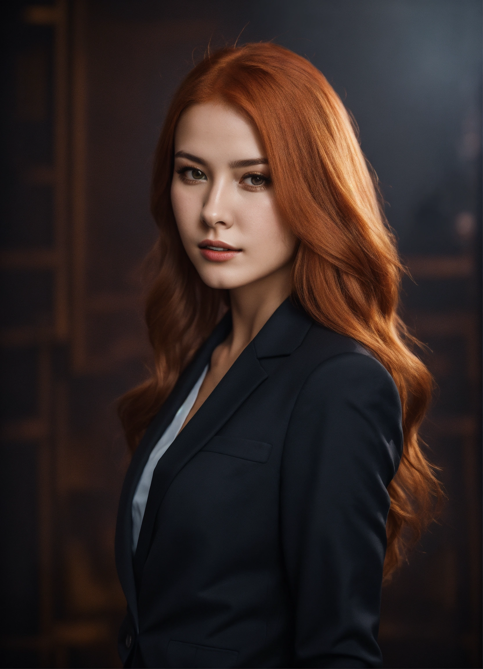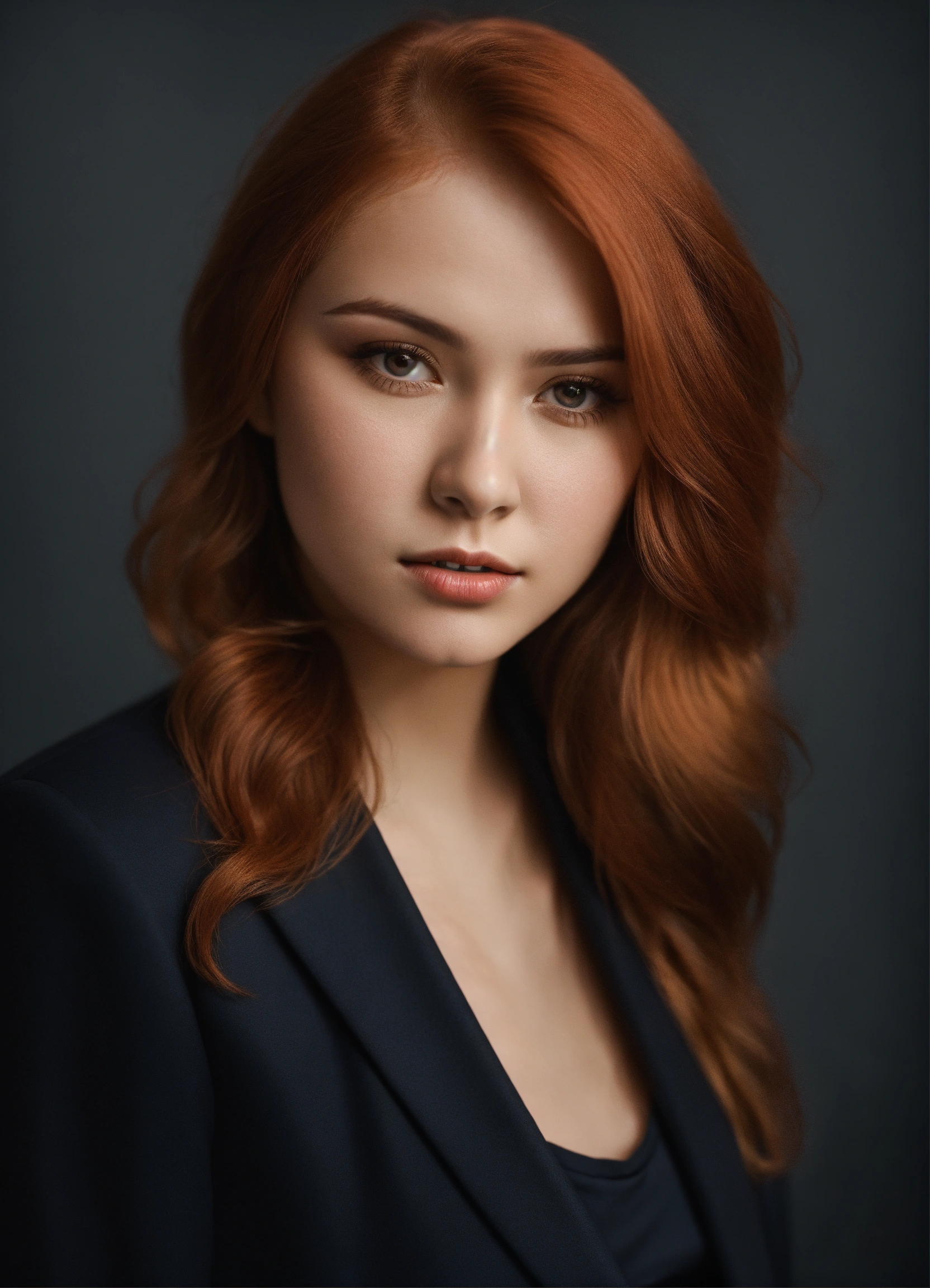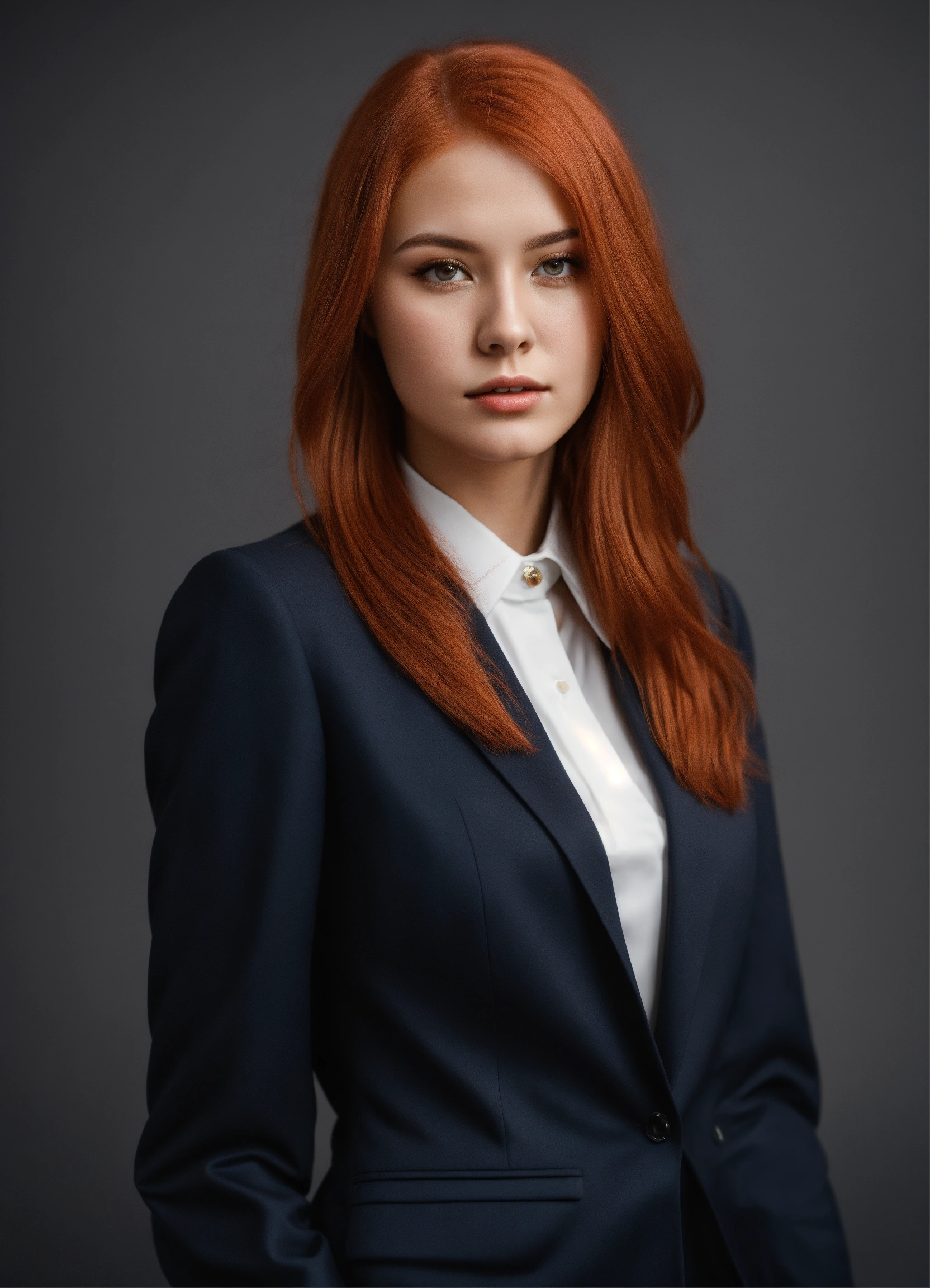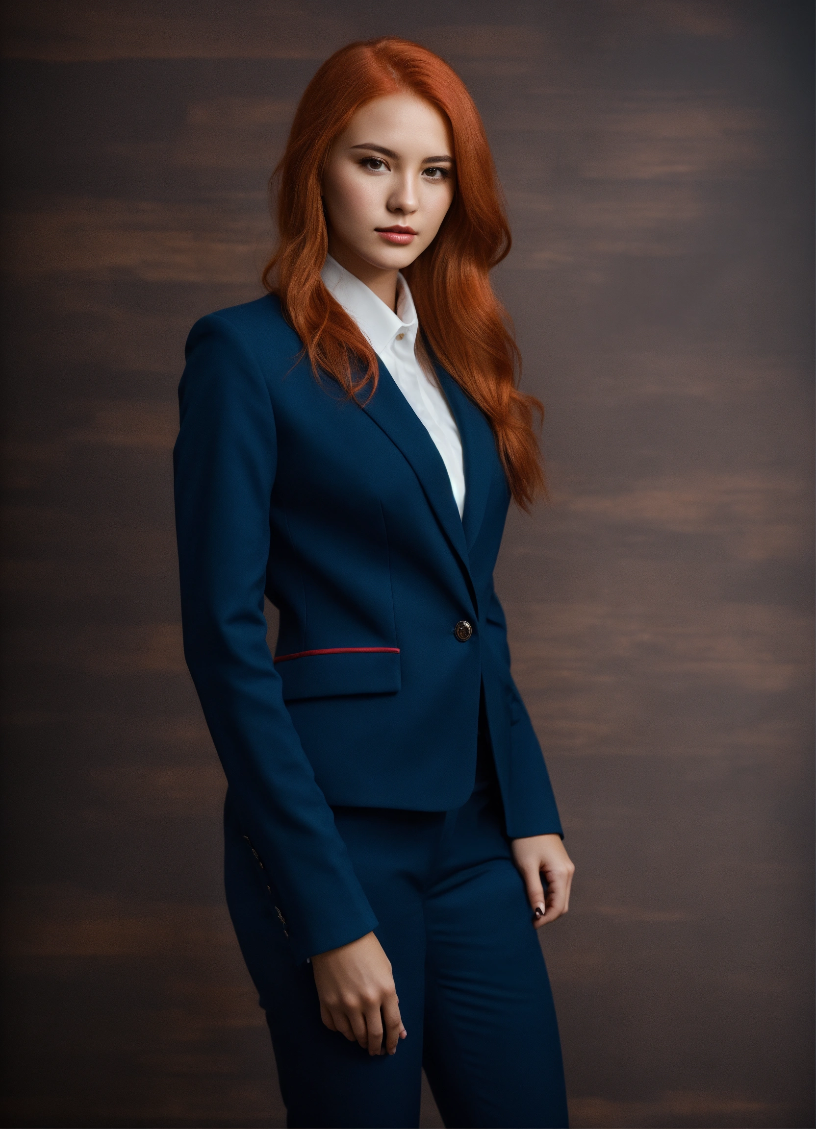 Beautiful young girl 28 years old in a formal suit, full growth, light red hair, dark background, photorealistic, studio lighting