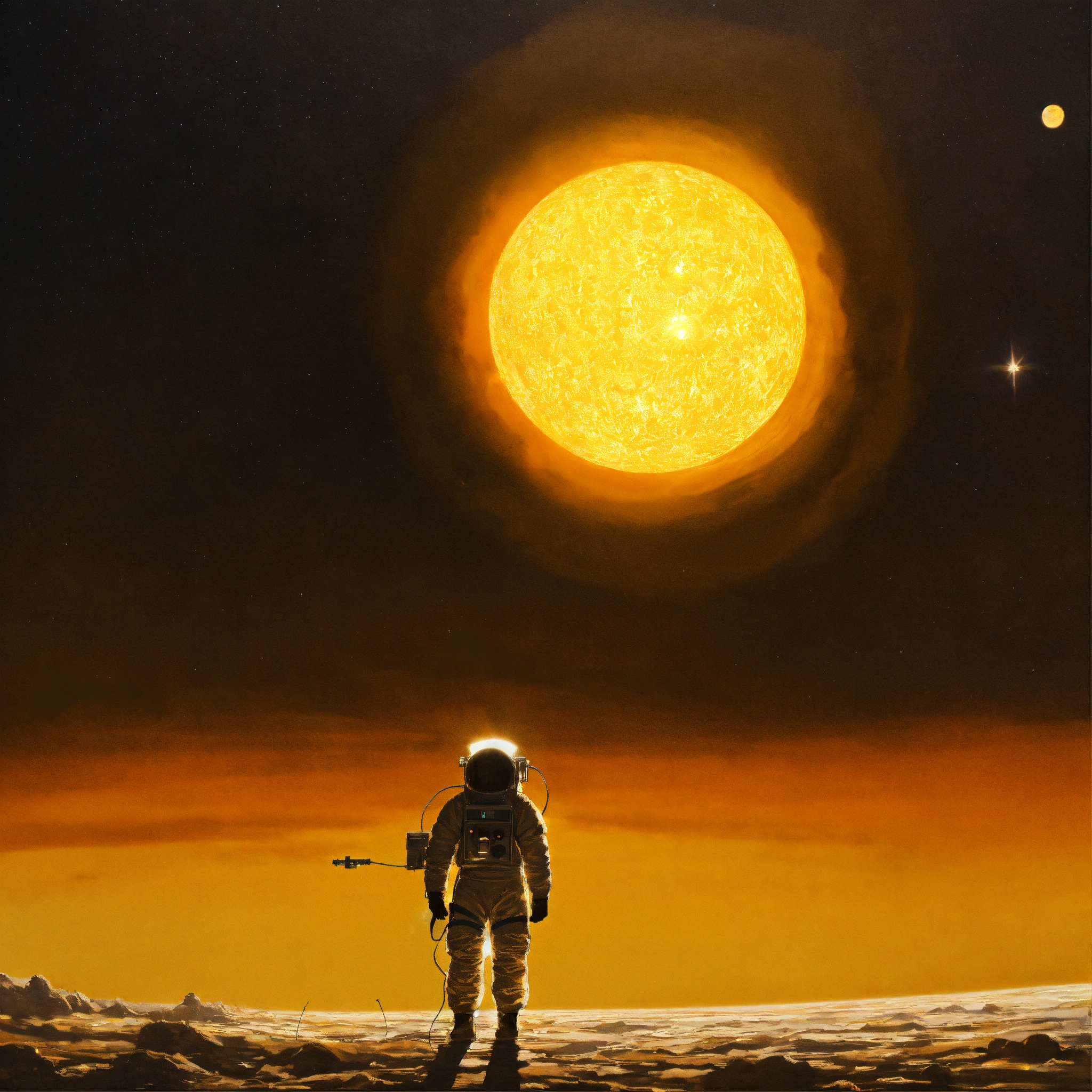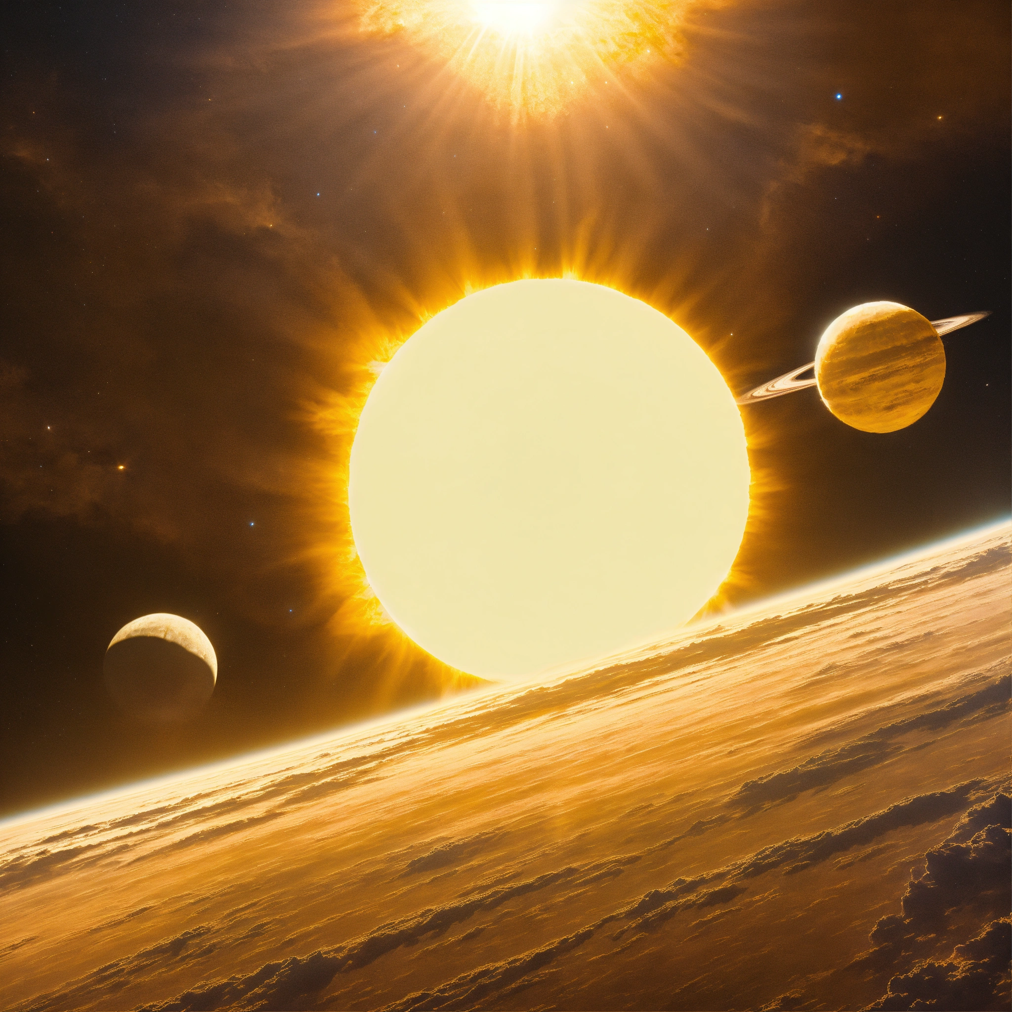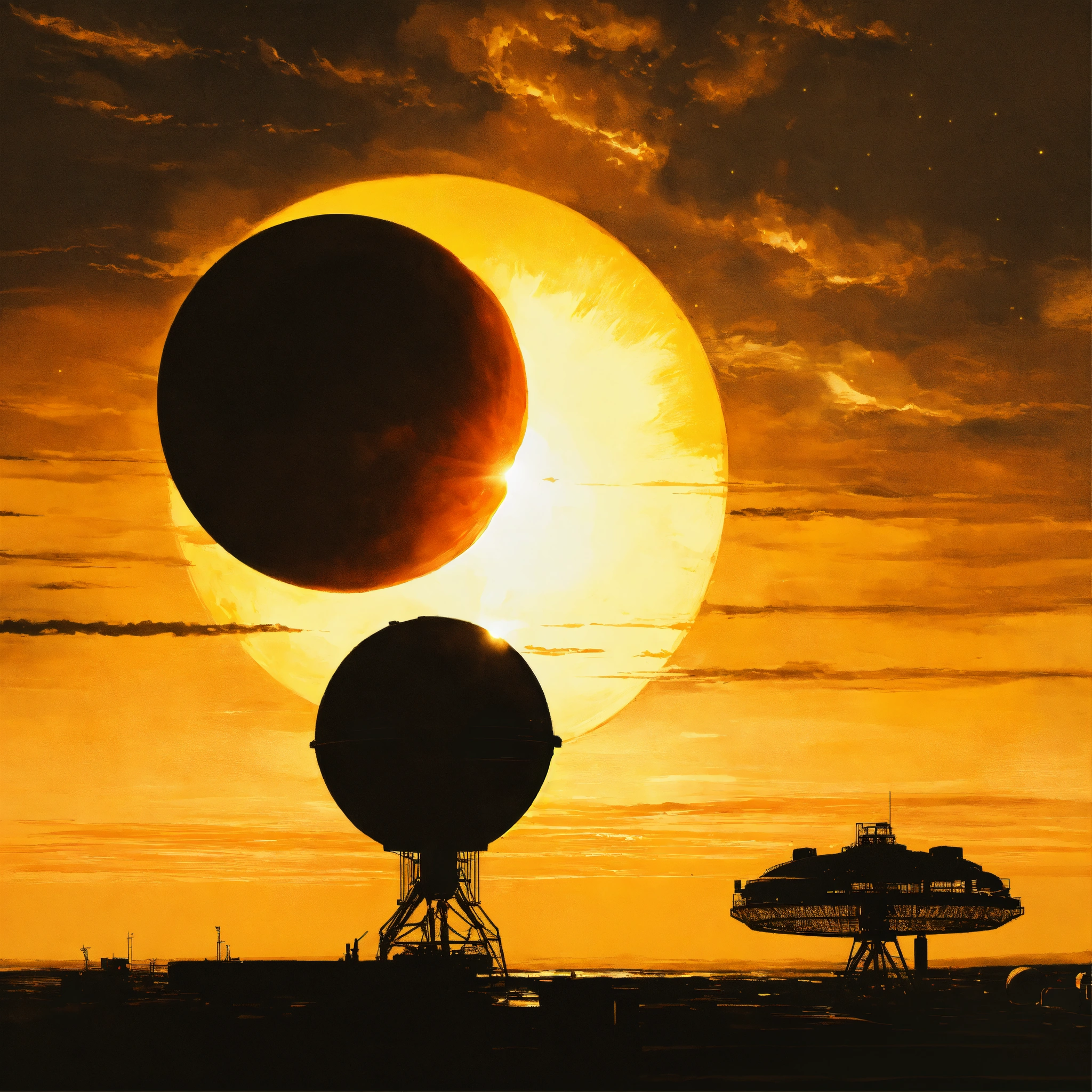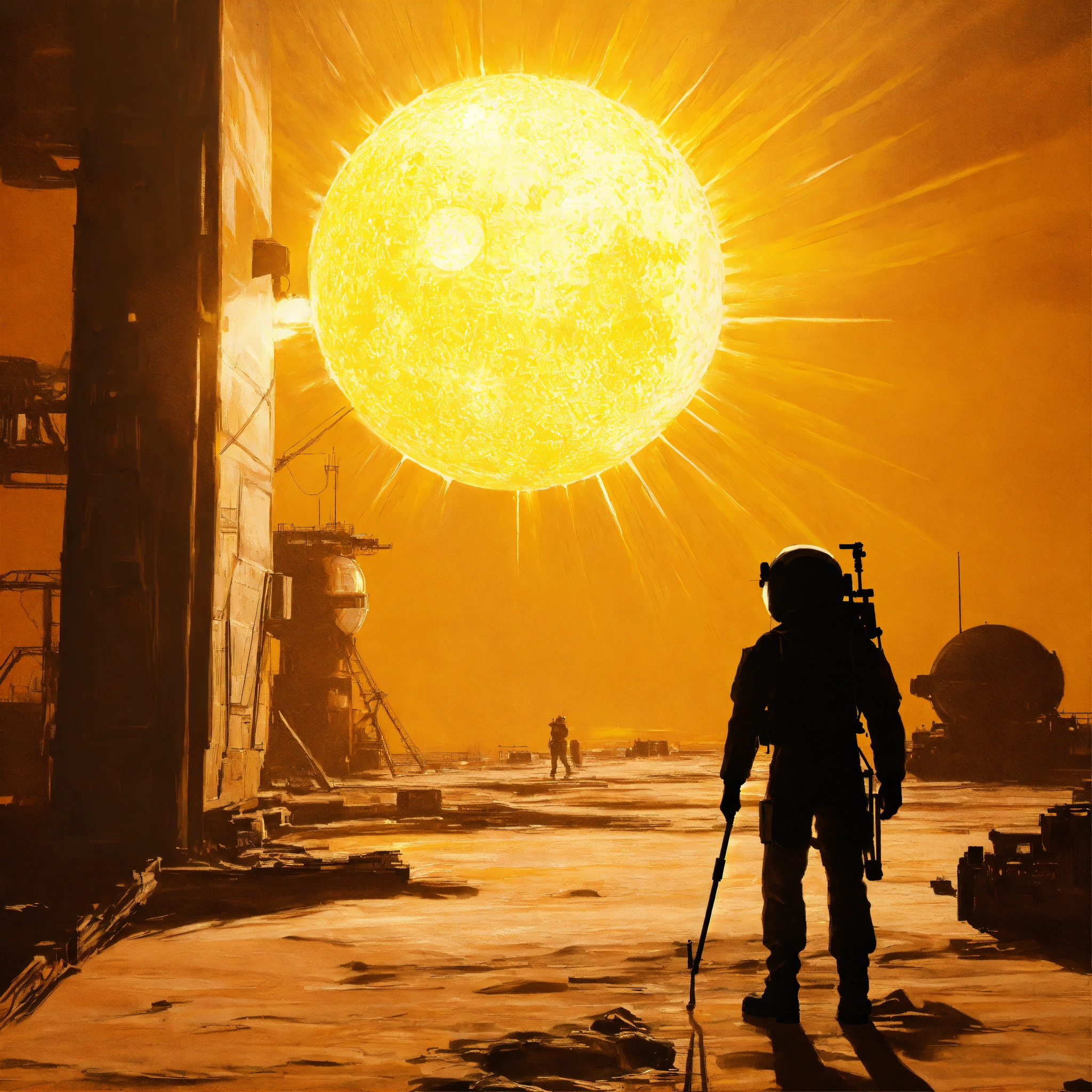 Paining, spacestation silhouette passing in front of a giant sun, close up of the sun, sun covering the entire image, bright, light, white and yellow, intense light