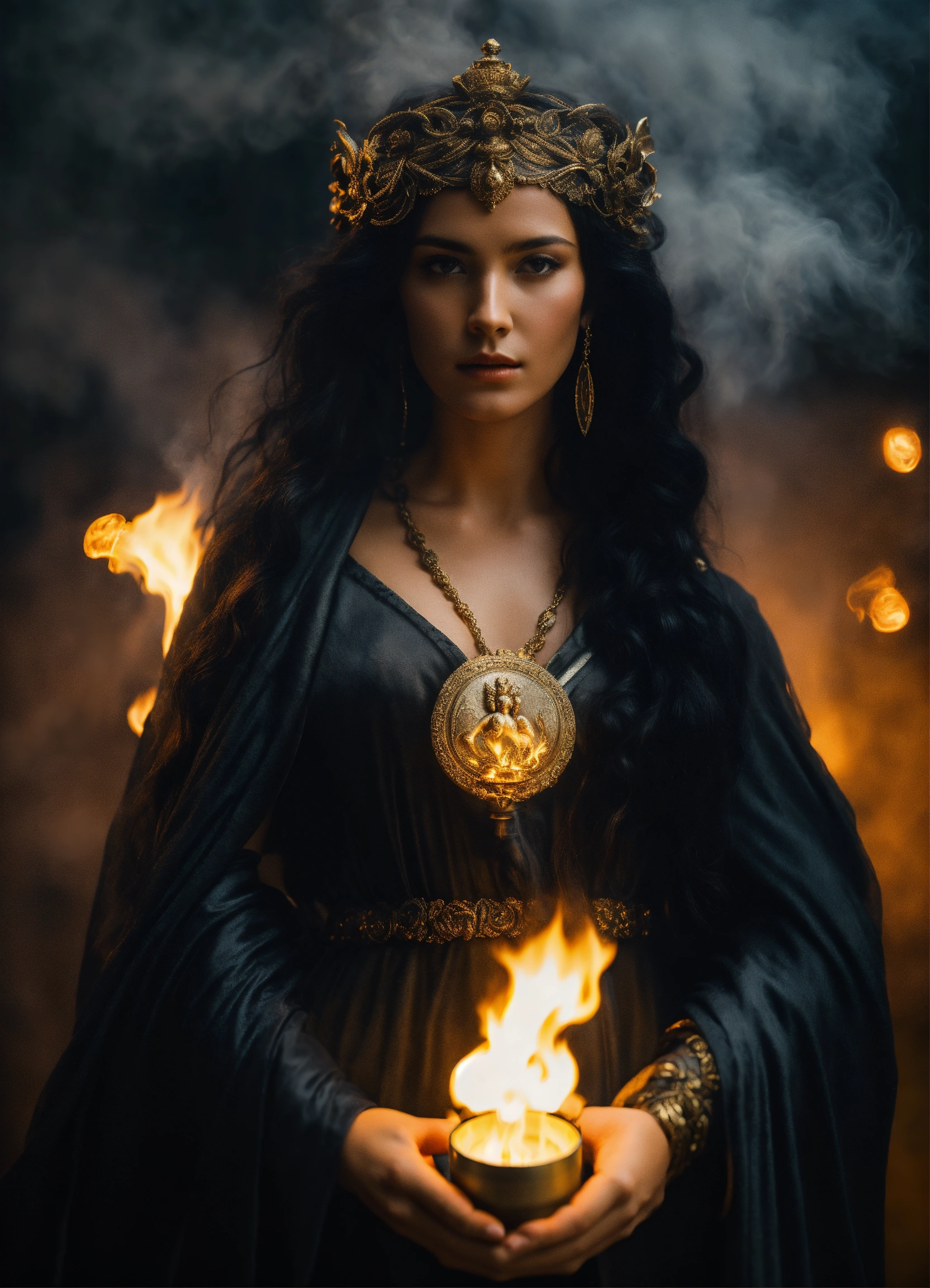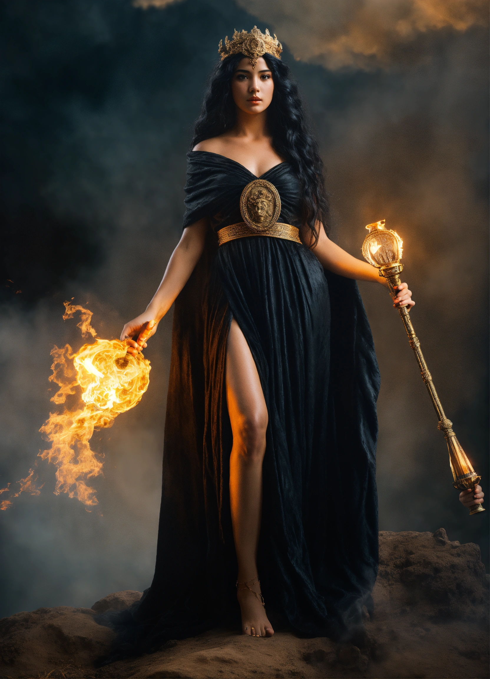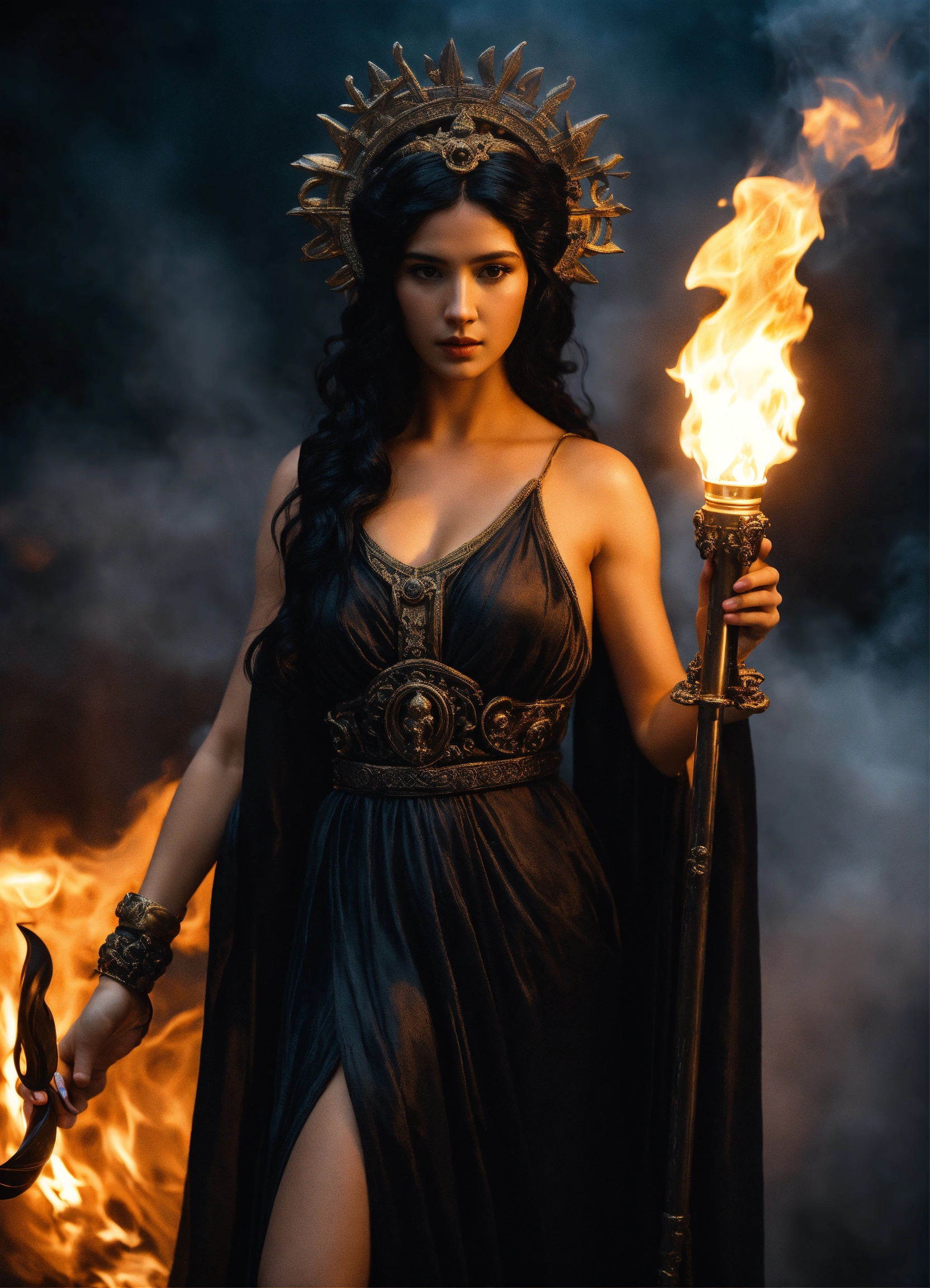Greek mythology, goddess hecate holding a torch, black hair, flowing black robe, mist, highly detailed, taken with a 50mm lens, hyper-realistic