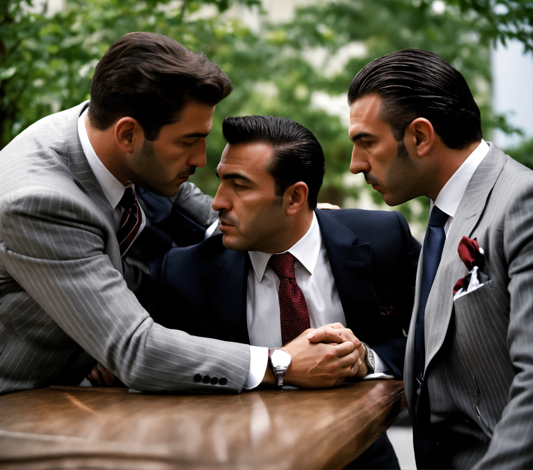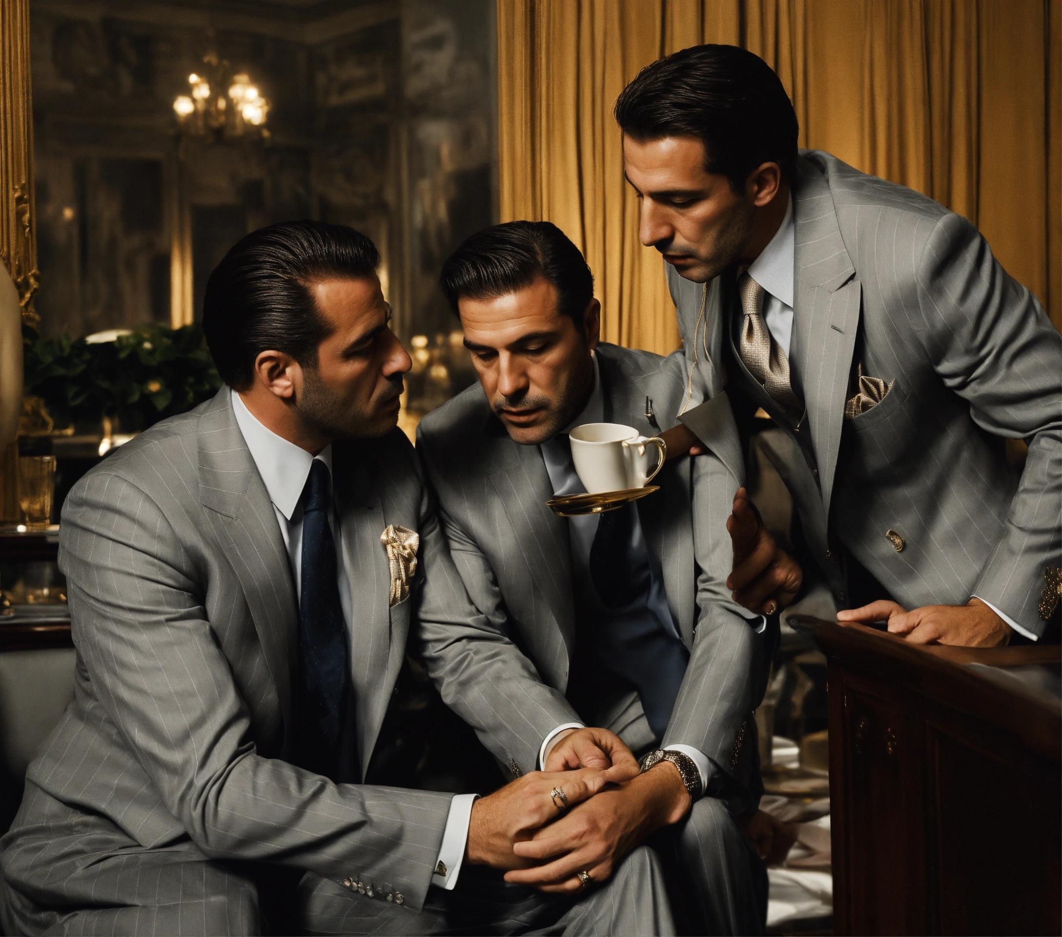 Two italian male businessmen in light grey pinstripe vested suit, club tie, kissing a mafia boss's hand