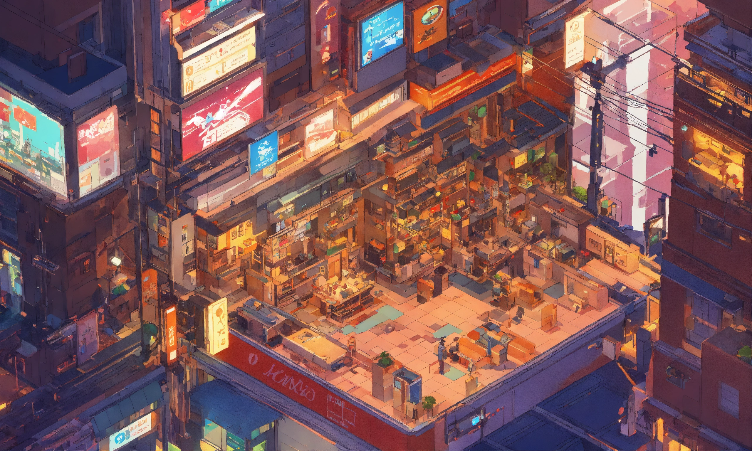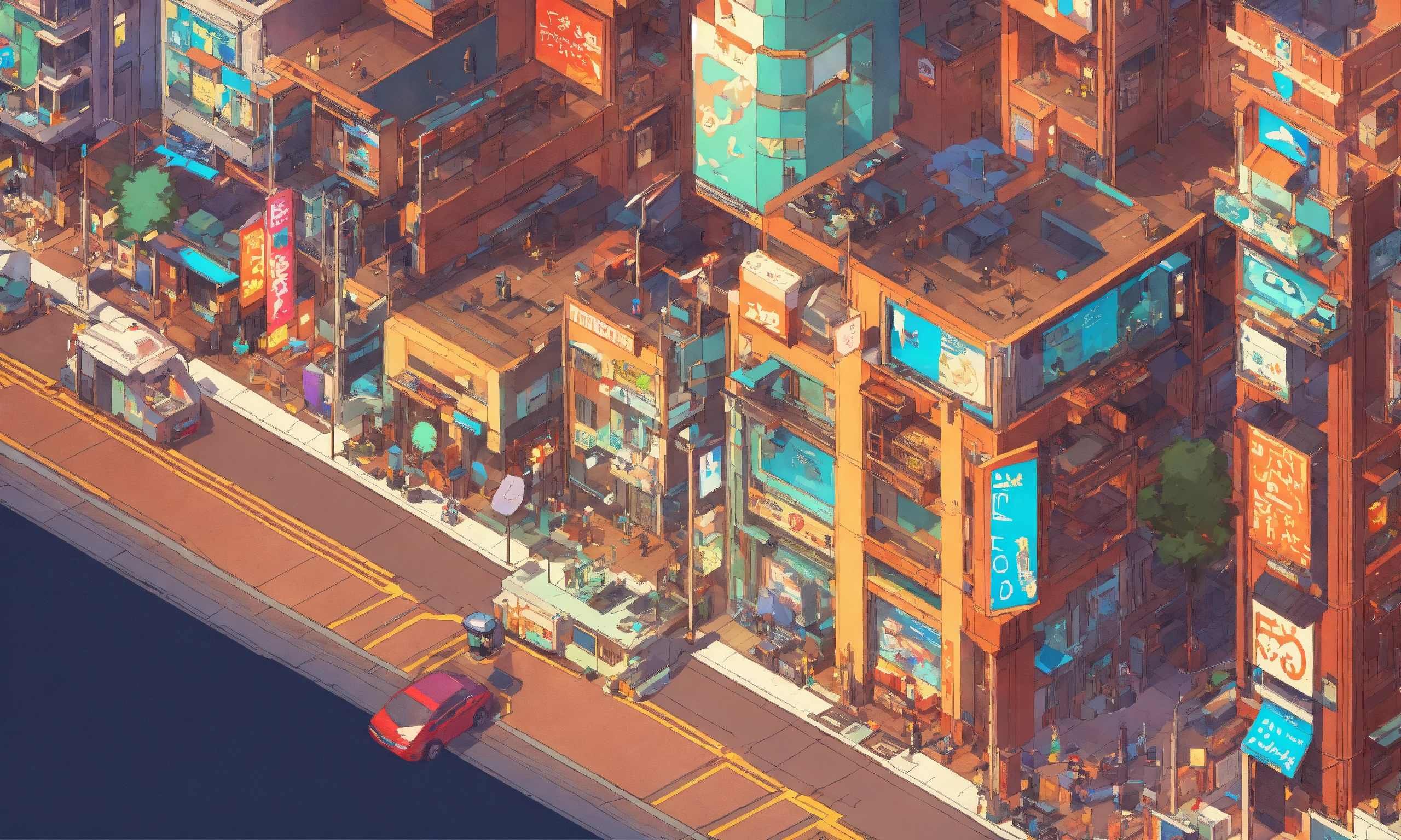 Photo of a isometric tycoon game, robot city, lots of cables, style of laurie greasley, studio ghibli, akira toriyama, james gilleard, genshin impact, trending pixiv fanbox, acrylic palette knife, 4k, vibrant colors, devinart, trending on artstation, low details