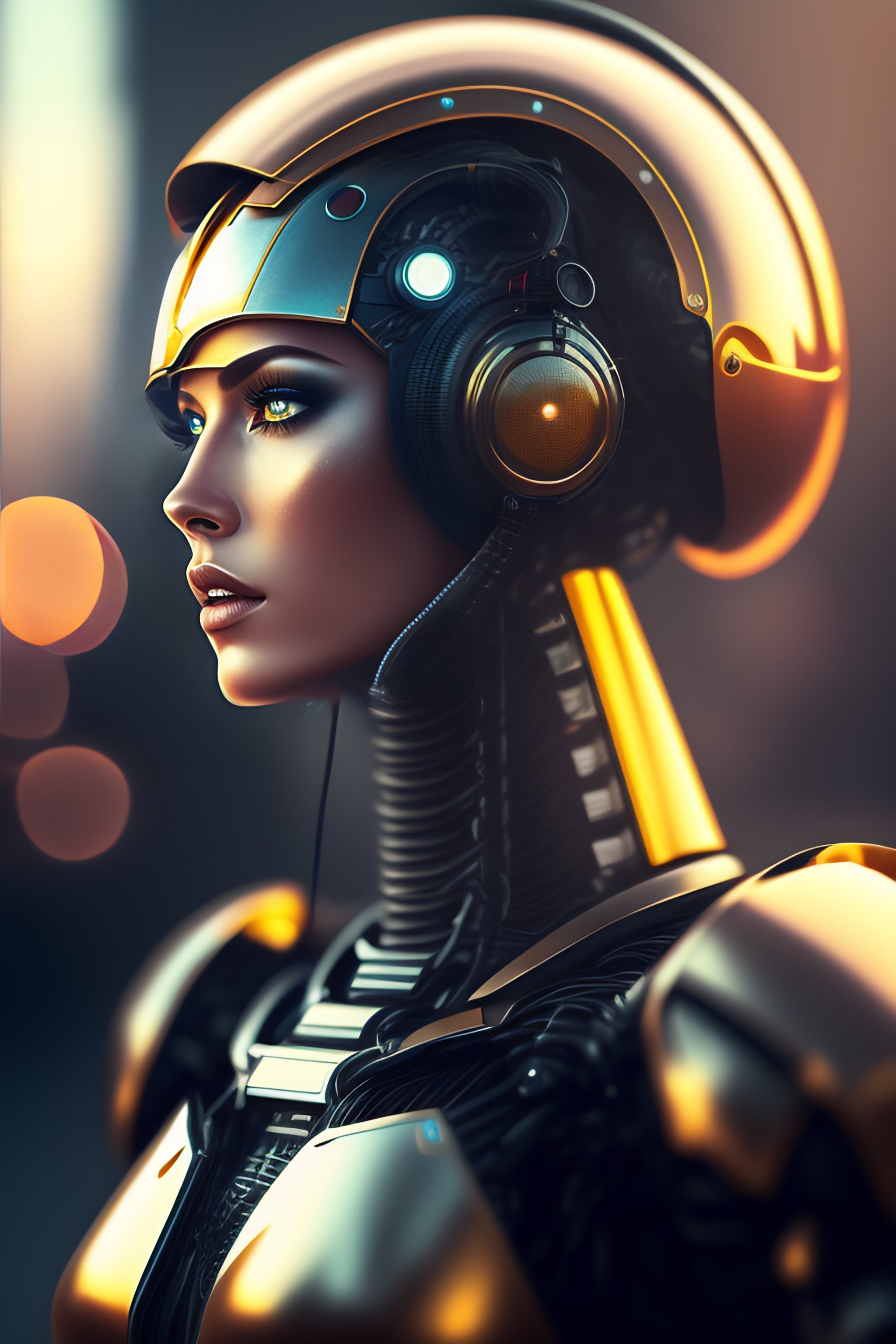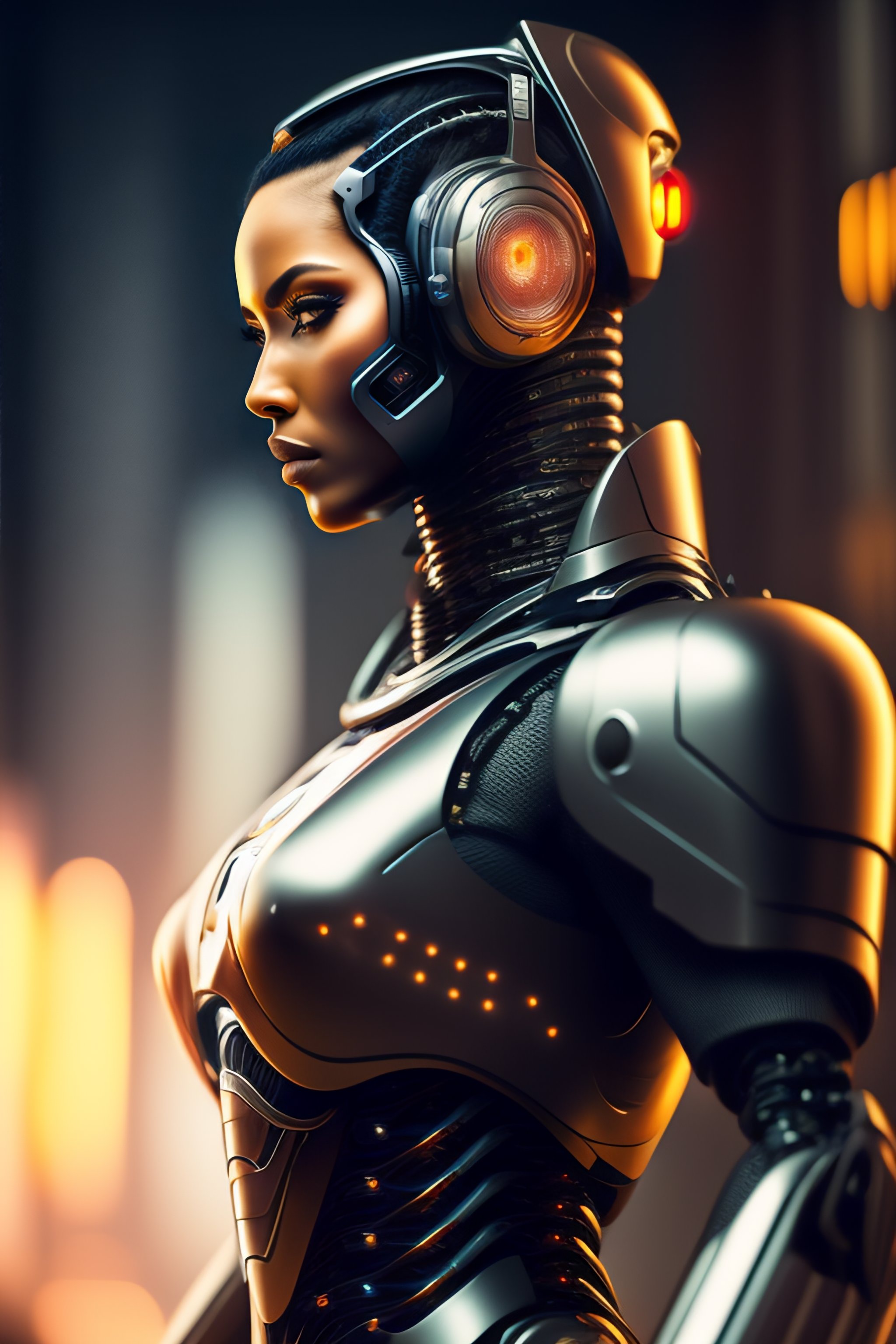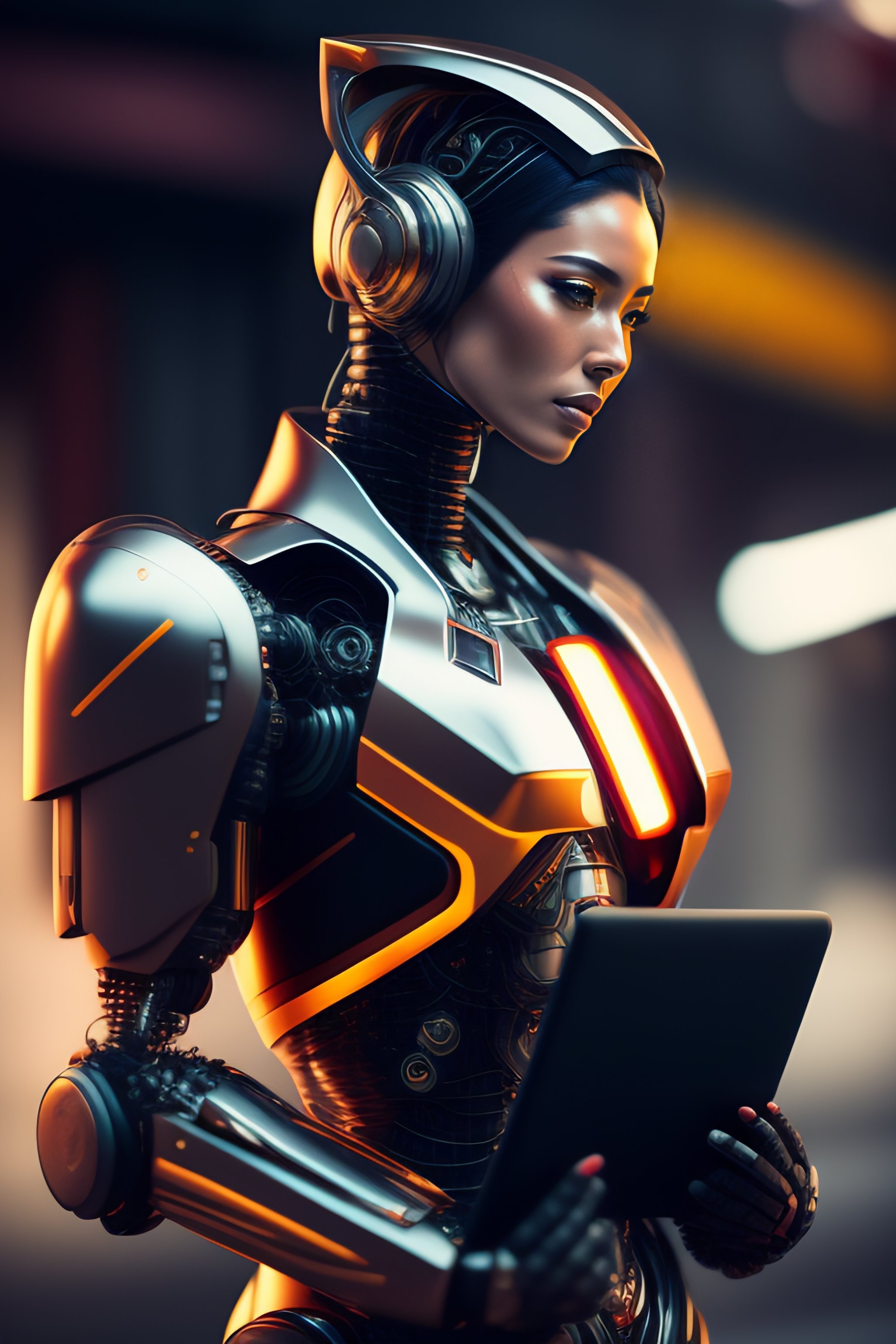 Cyborg robot with computer, a character side portrait, realistic, half body shot, sharp focus, elegant
