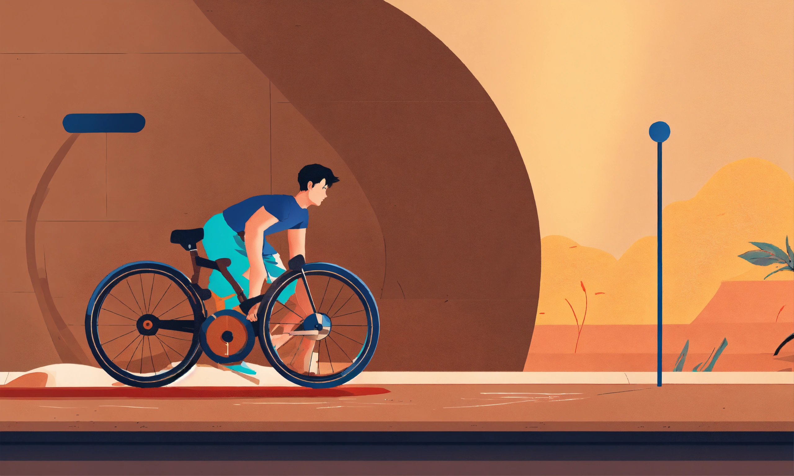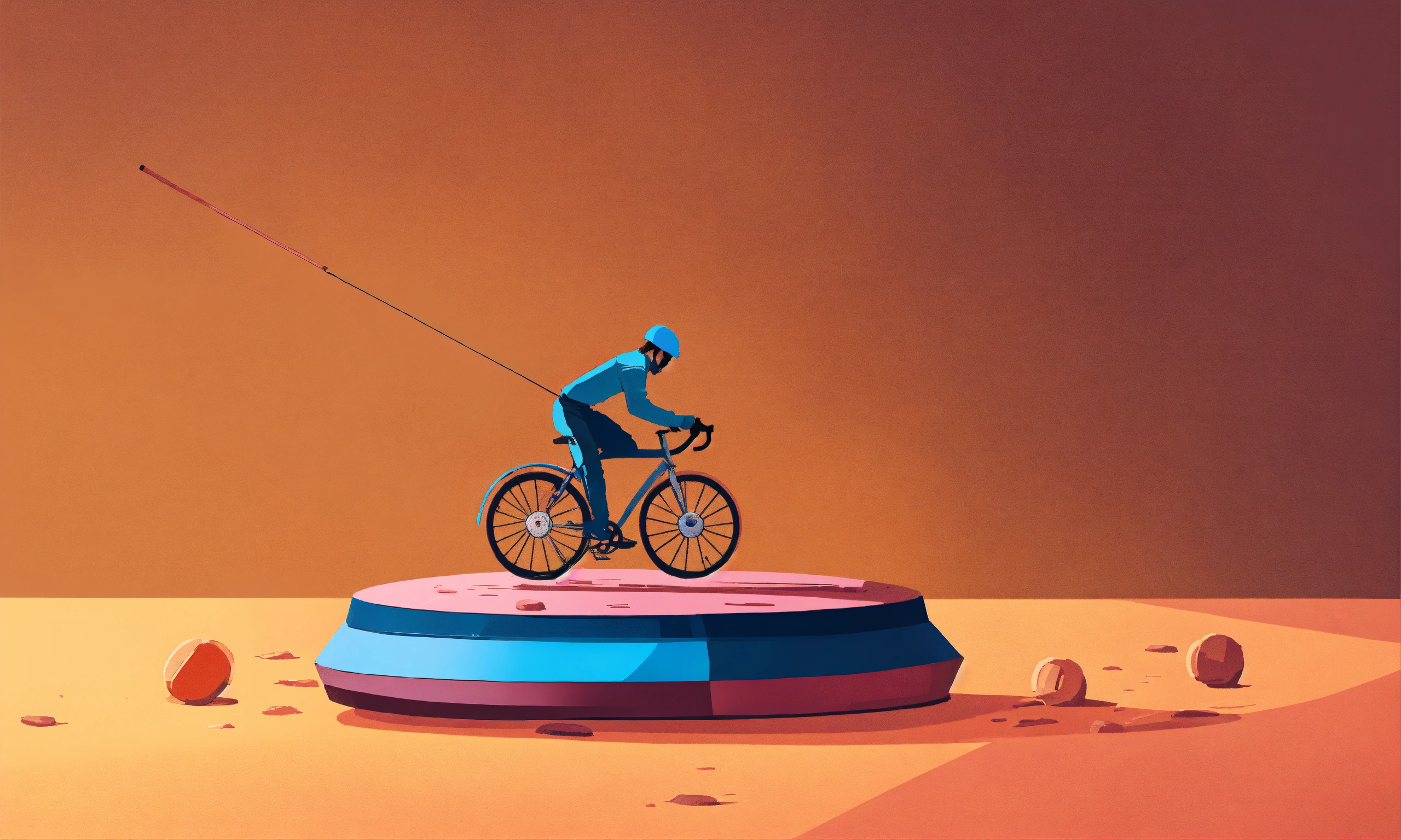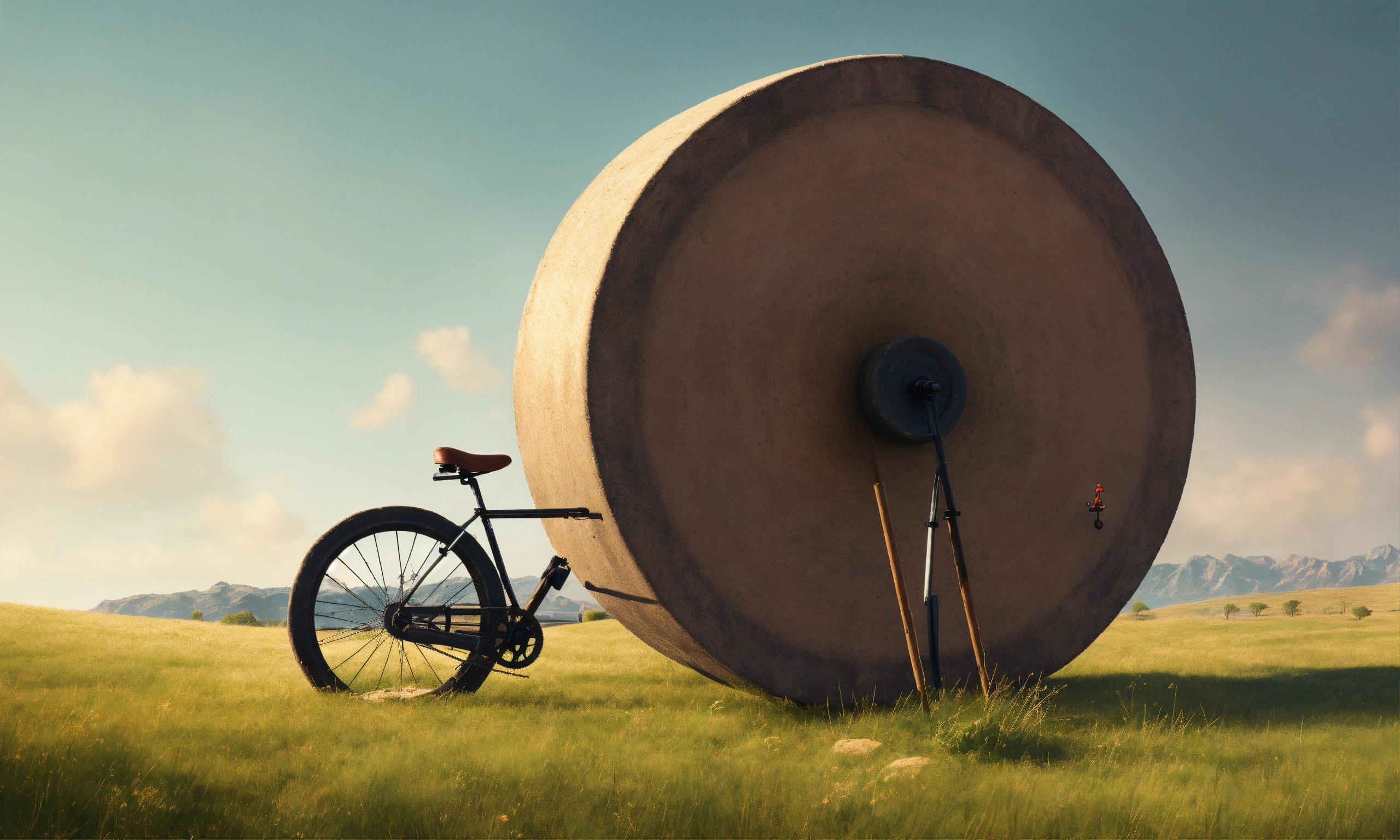 Create an illustration featuring a very small wheel, resembling a millstone, rolling on a straight, horizontal surface. the wheel should be no bigger than a bicycle wheel. show a person pushing the wheel effortlessly with a stick.