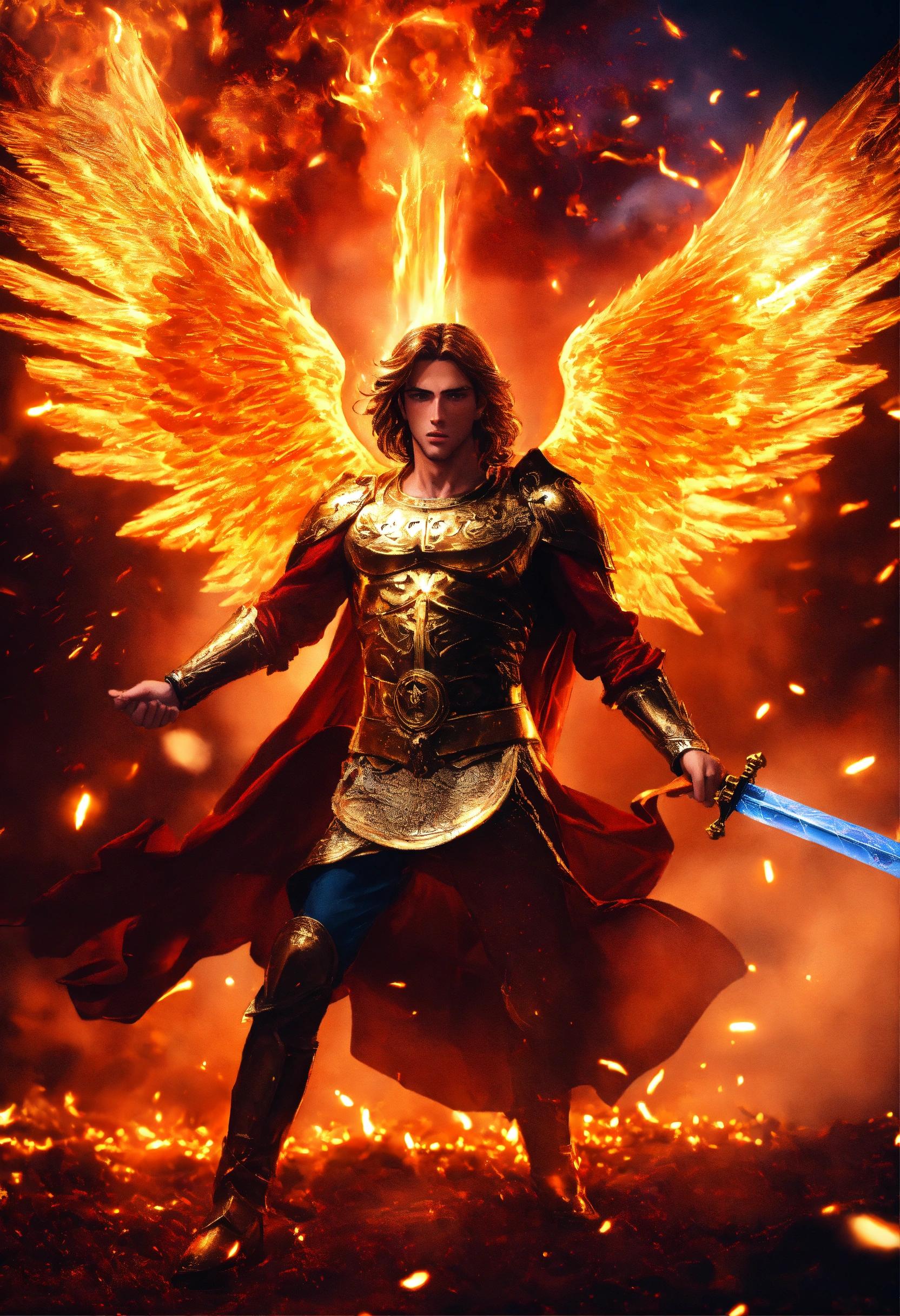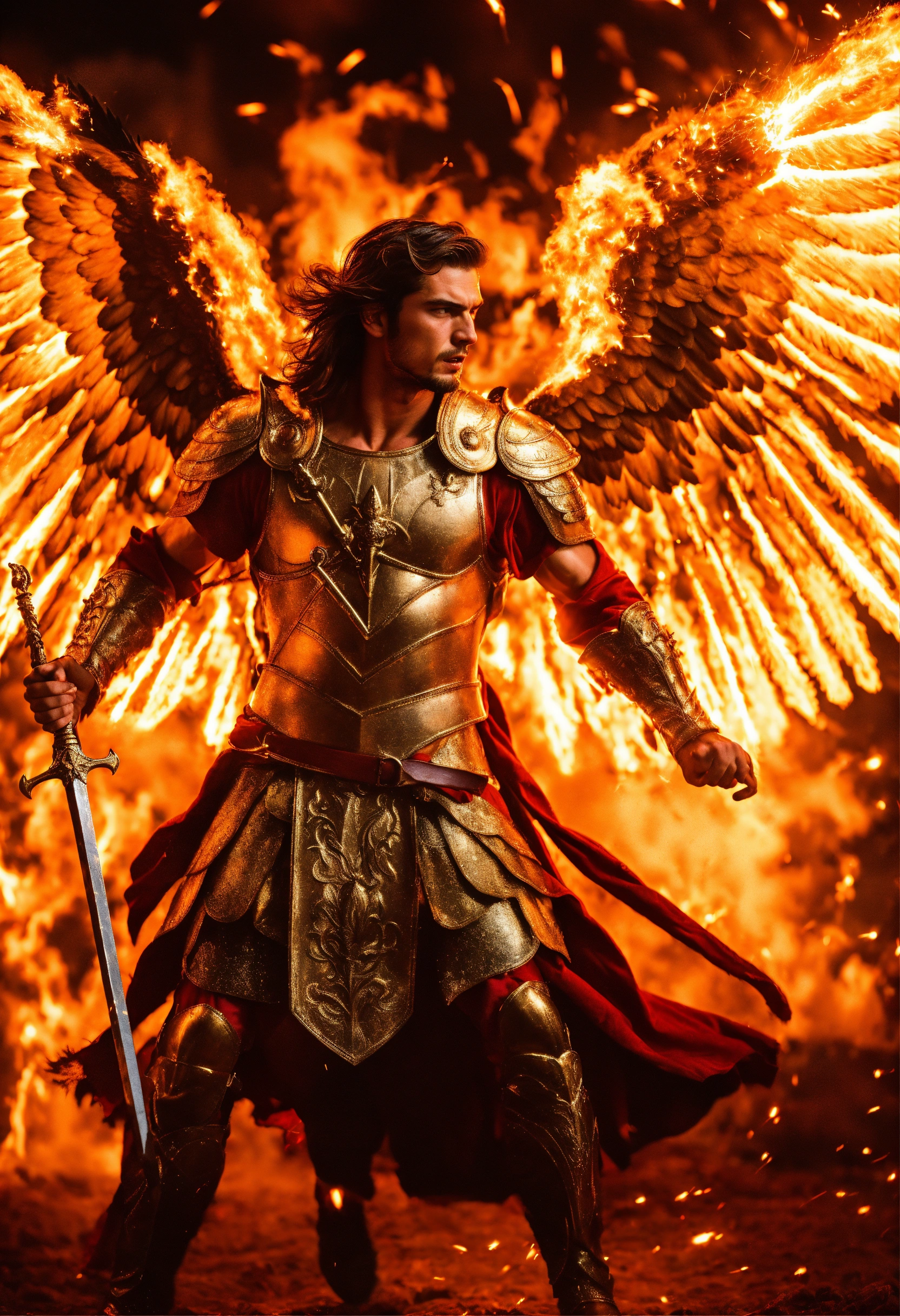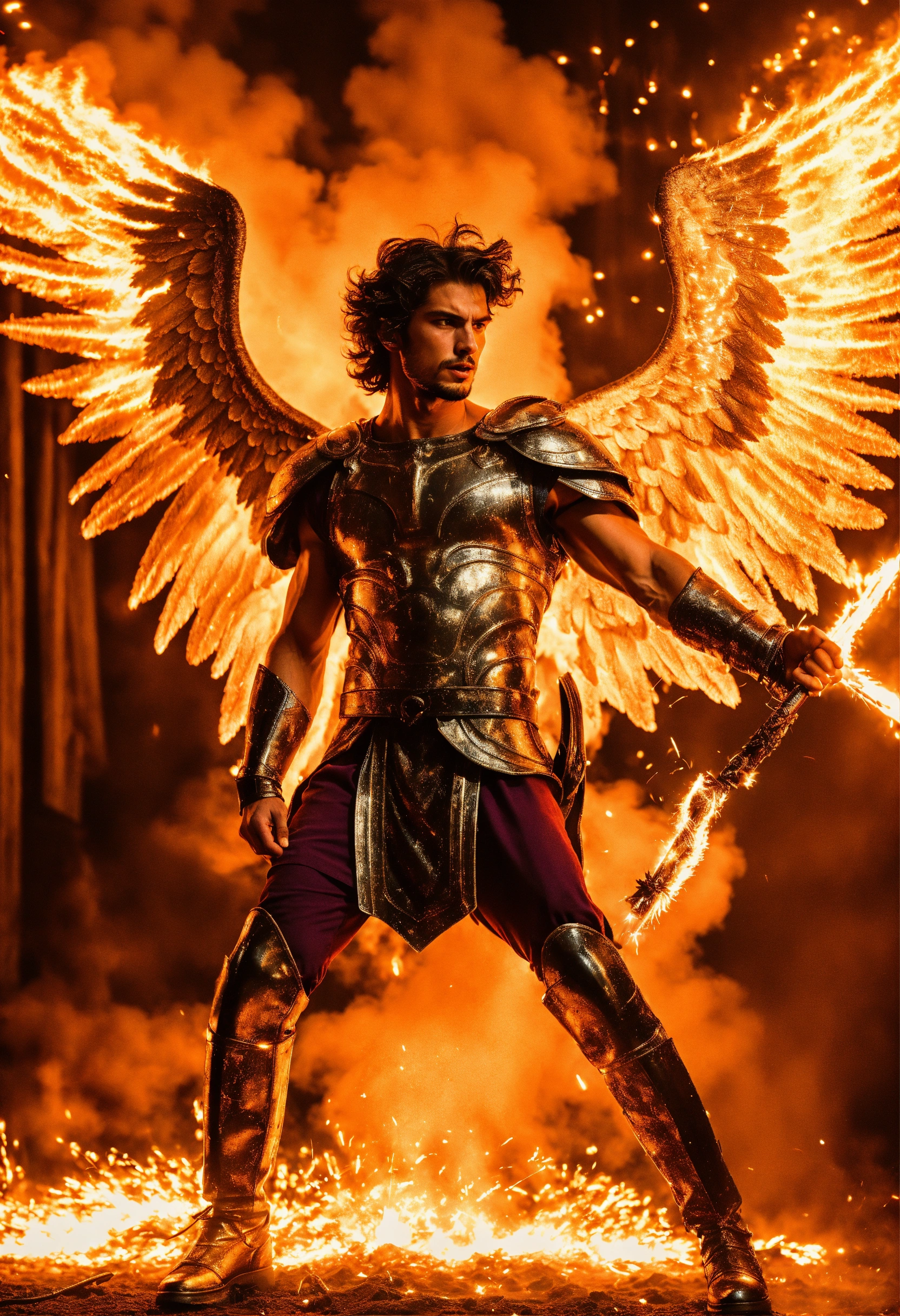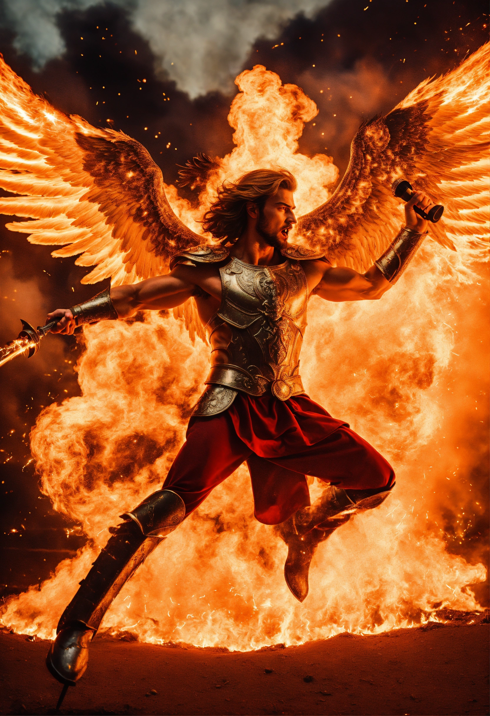 Action photograph, 25 year old supermodel handsome st. michael the archangel attacking satan. background is fiery sparks. michael is victorious.