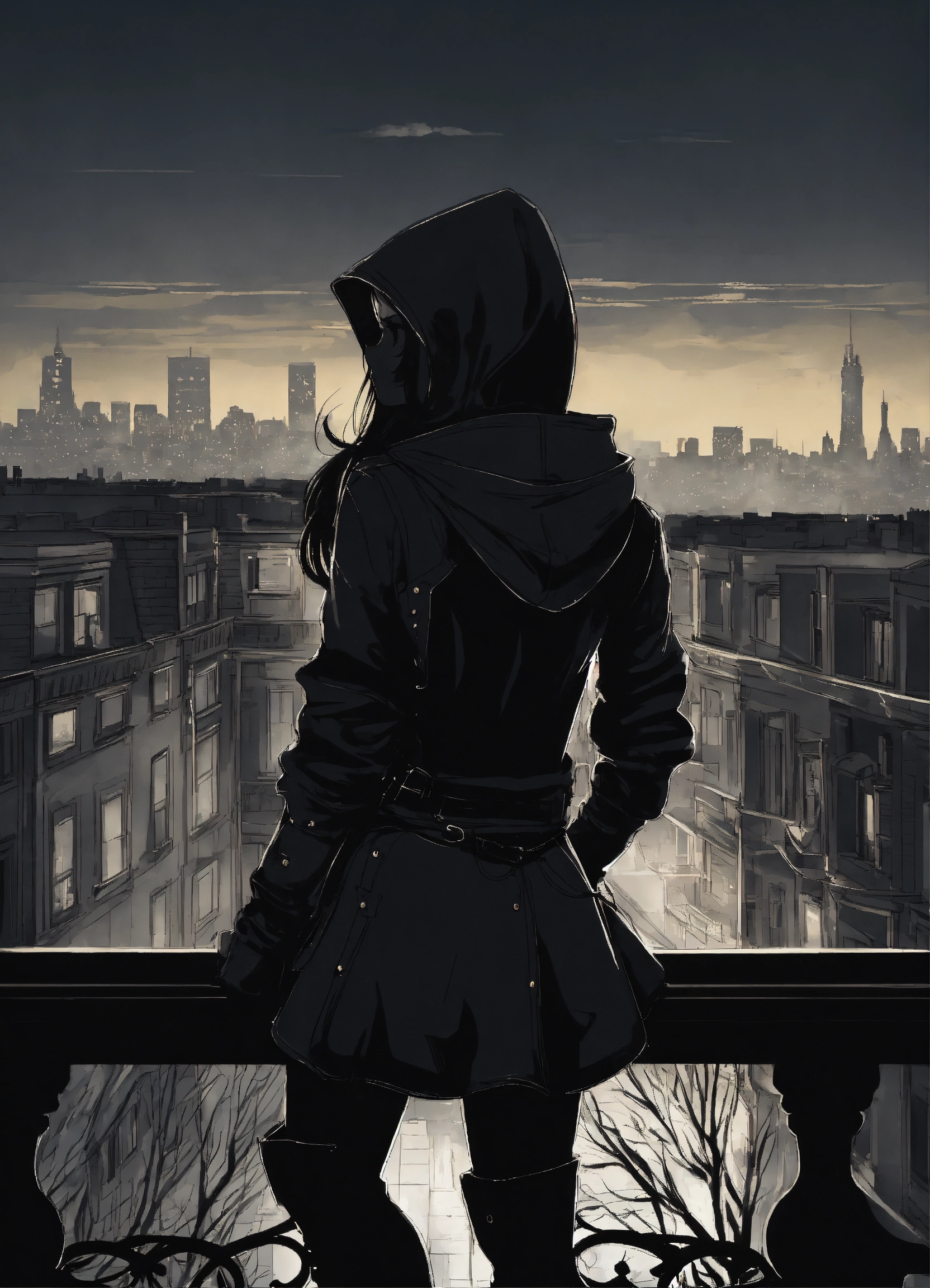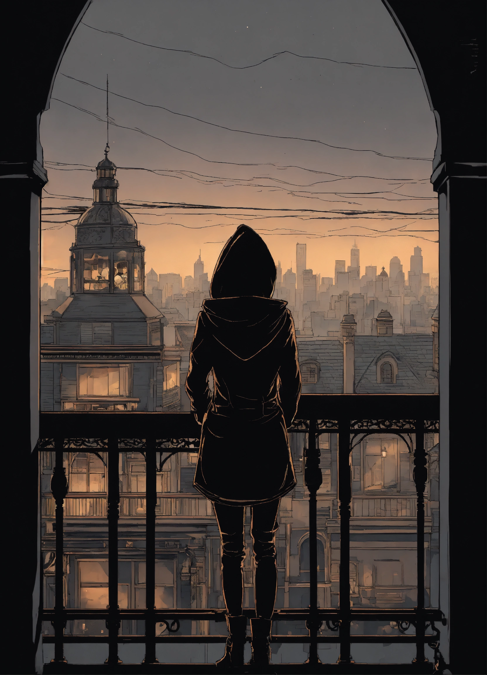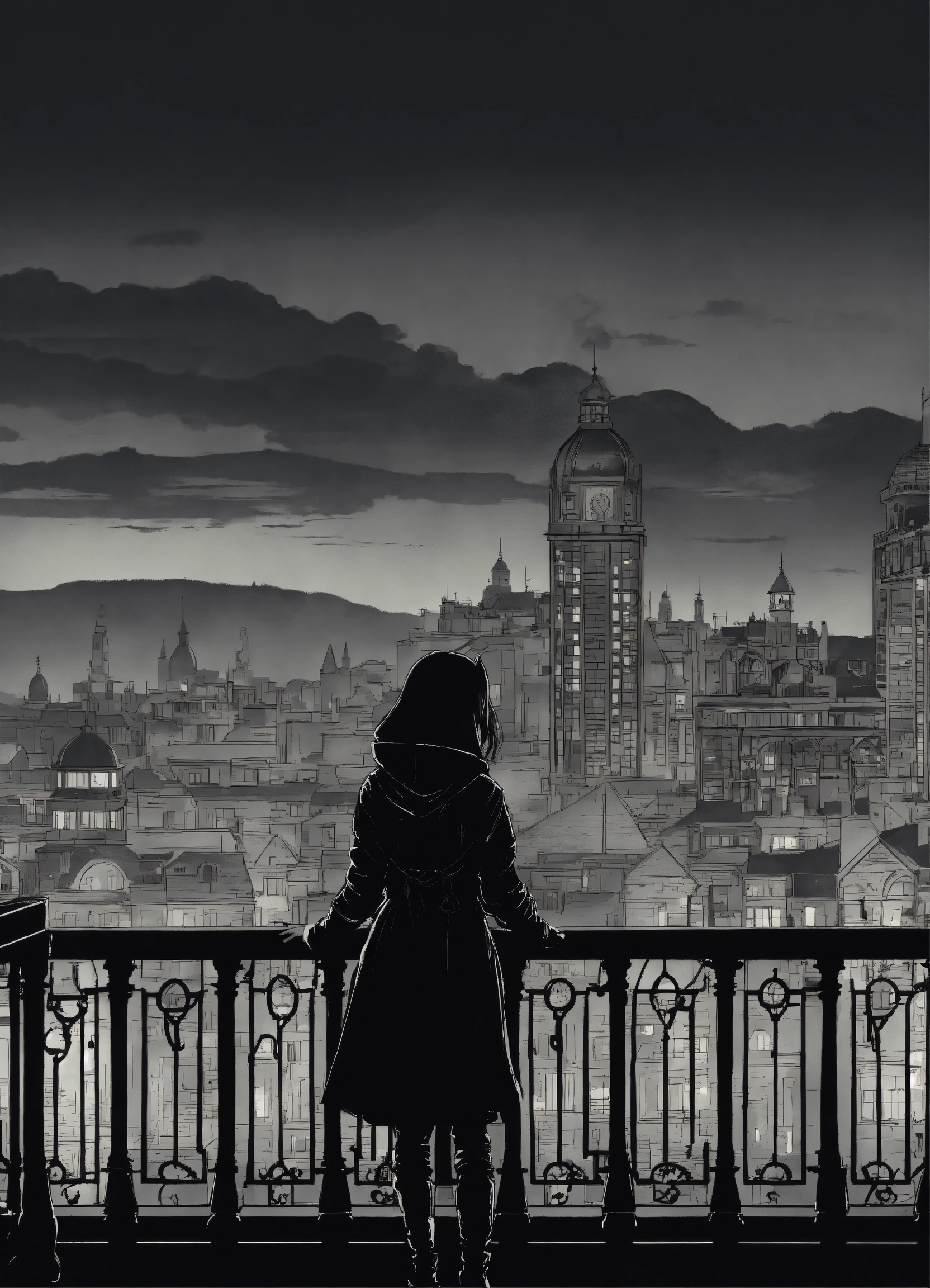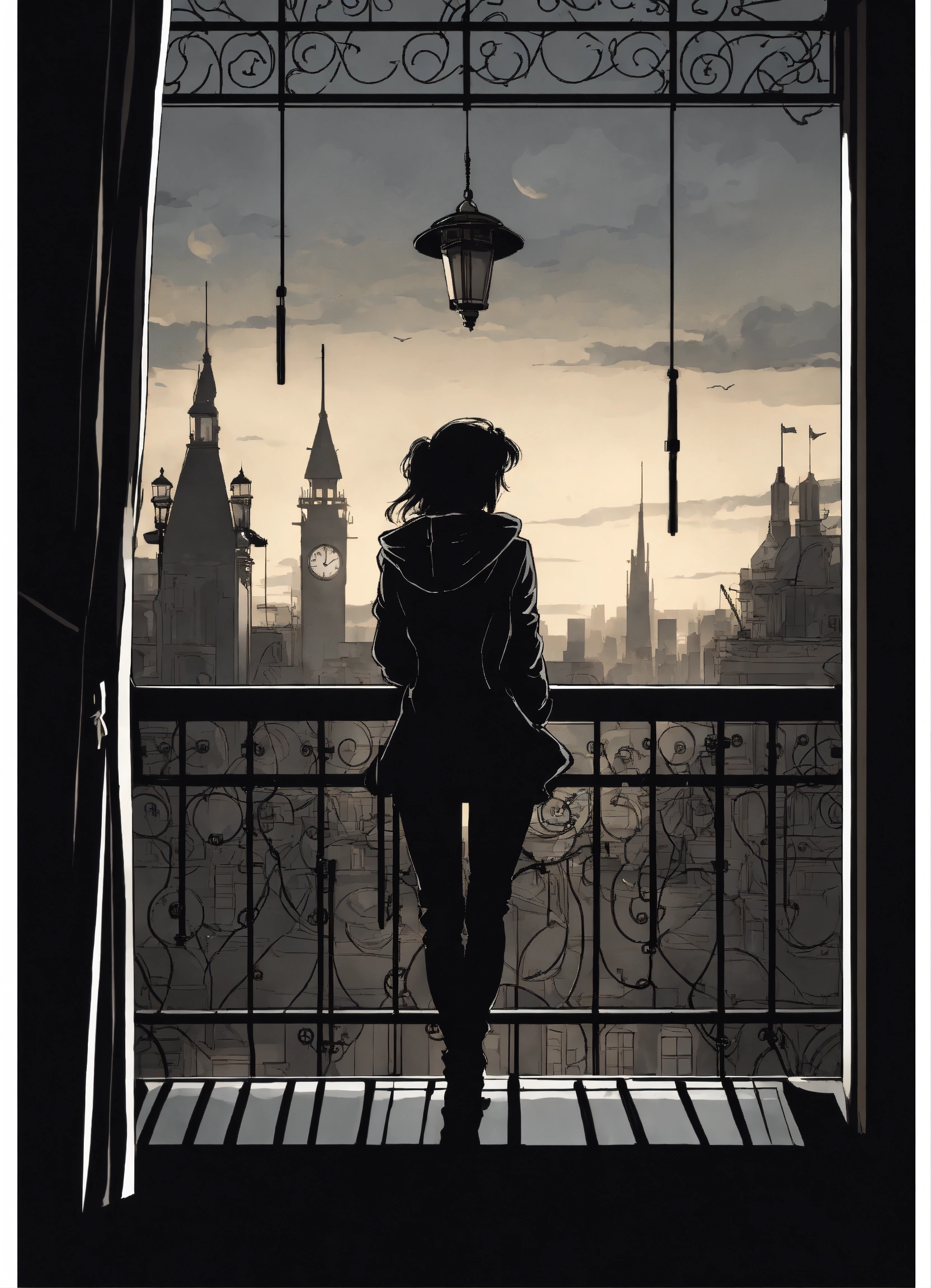 A girl silhouette wearing a hoodie outside a balcony, victorian city skyline at evening, steampunk, realistic style, greyscale beautiful