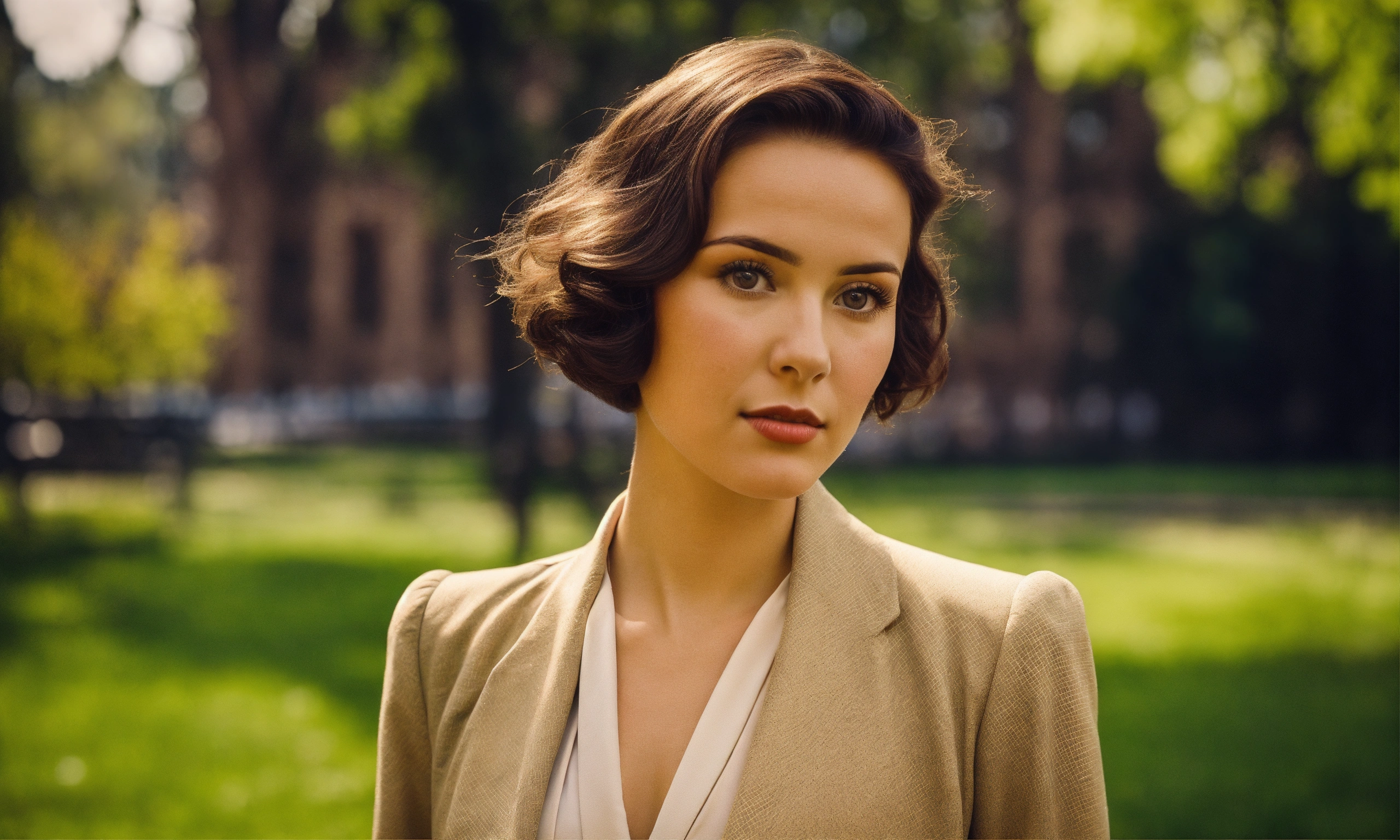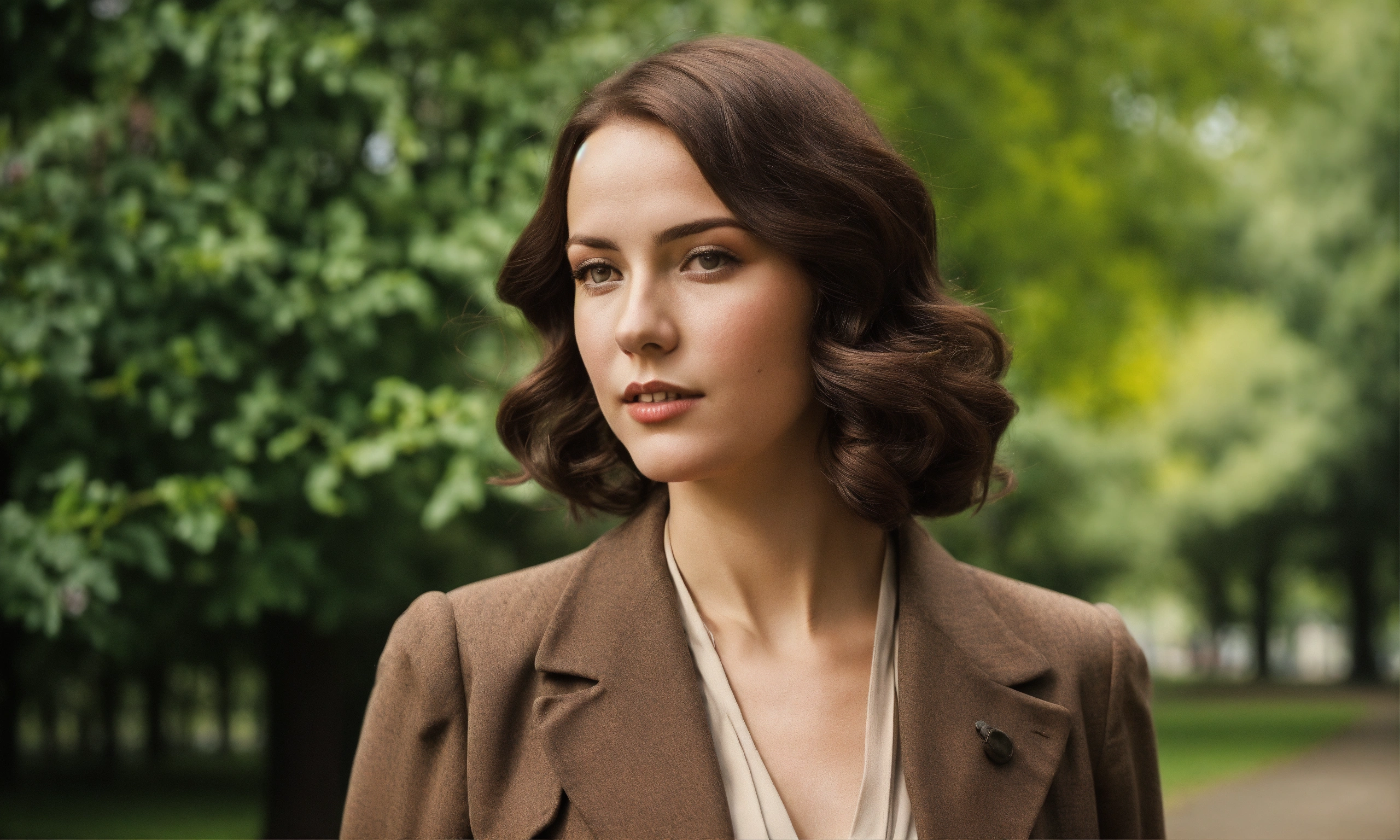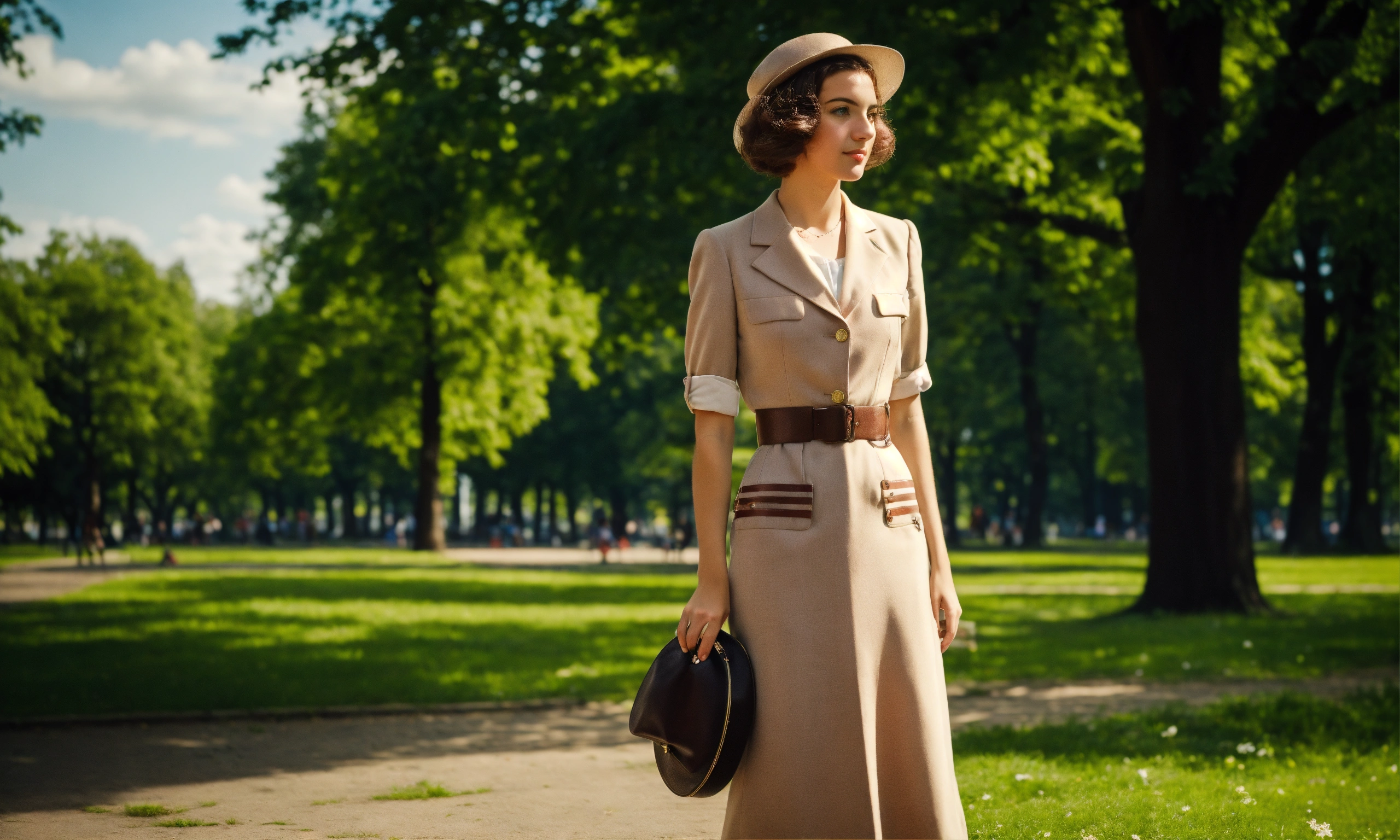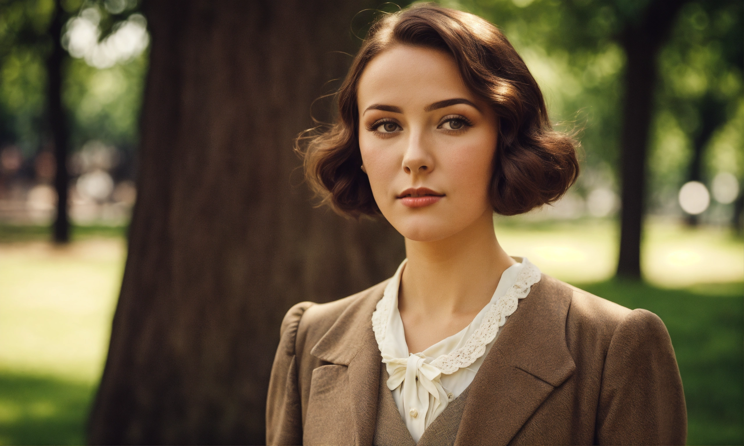 Warszawa 1920-1930, europian brunette girl age 30, in a park, looks at the camera at full height, bald, retro style suit. brown hair. full haight, summer
