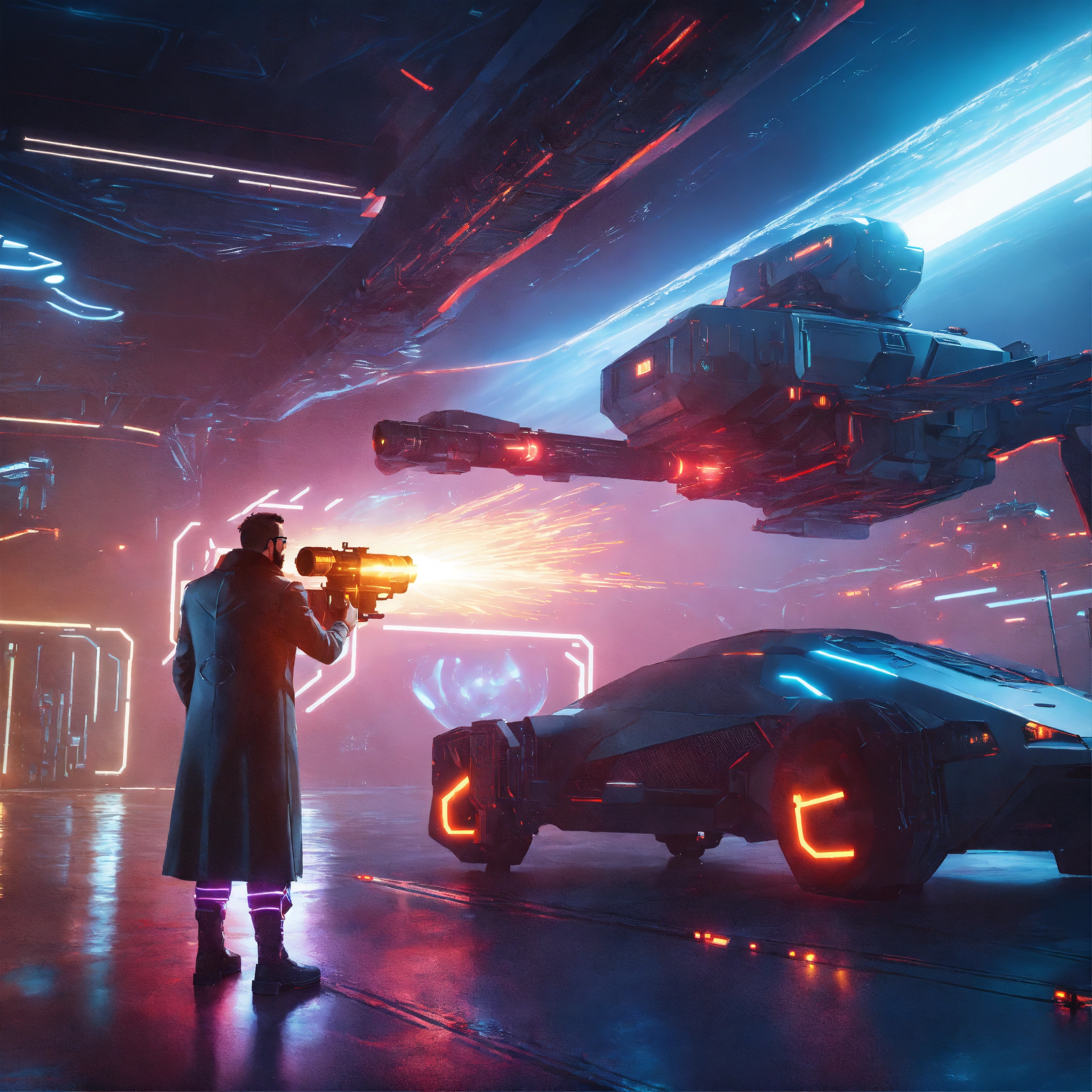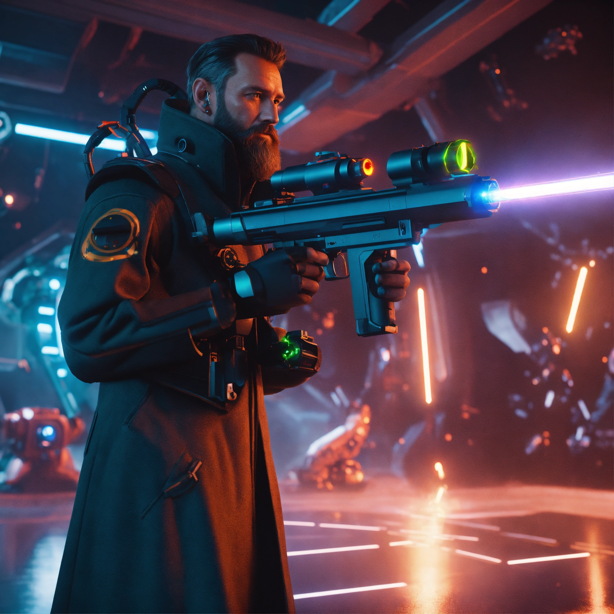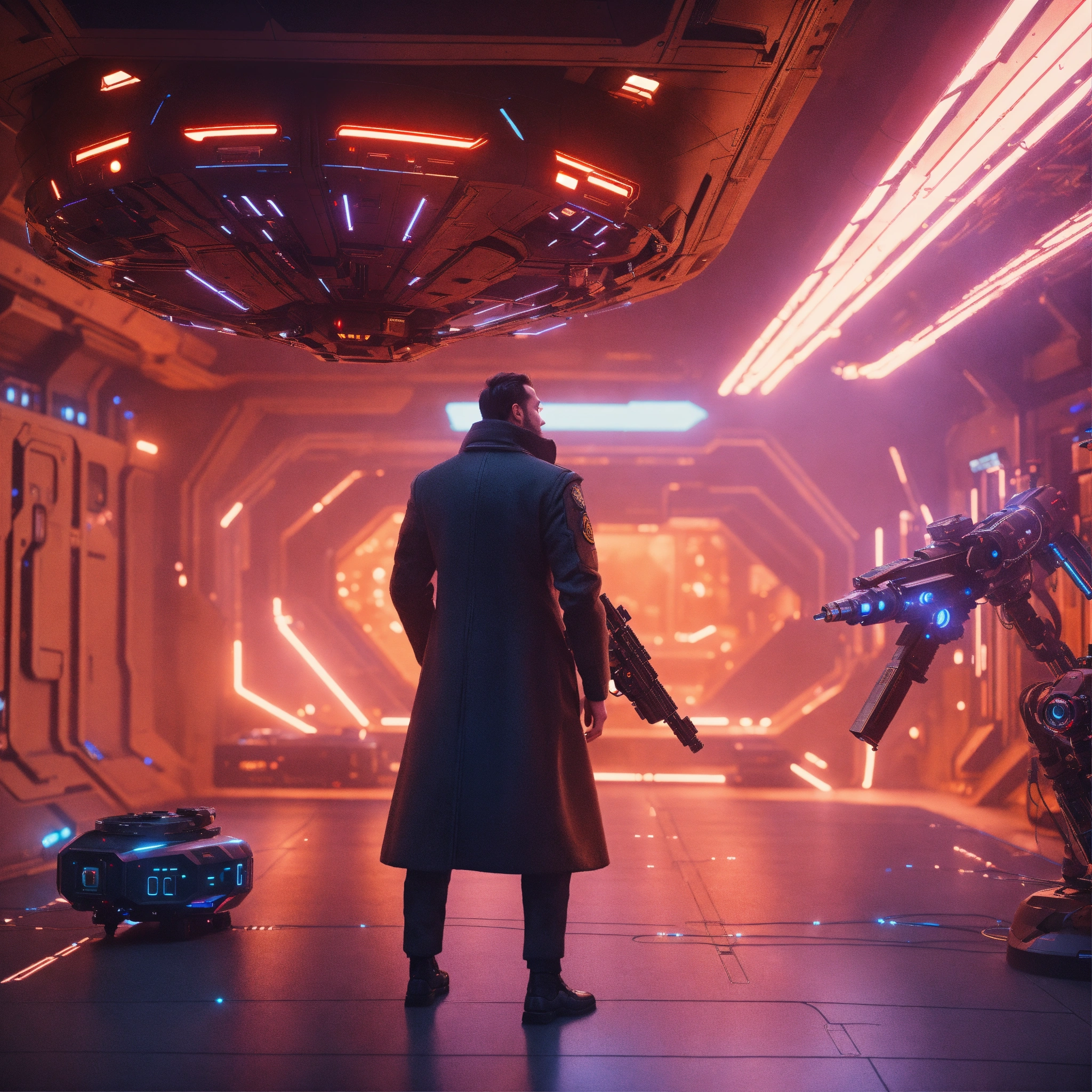 A 45 year old masculine man with trim beard in futuristic long coat shoots a laser blaster at a flying black patrol bot with robotic tentacles inside space port, realistic, futuristic, sci-fi, 8k, unreal engine, pixar