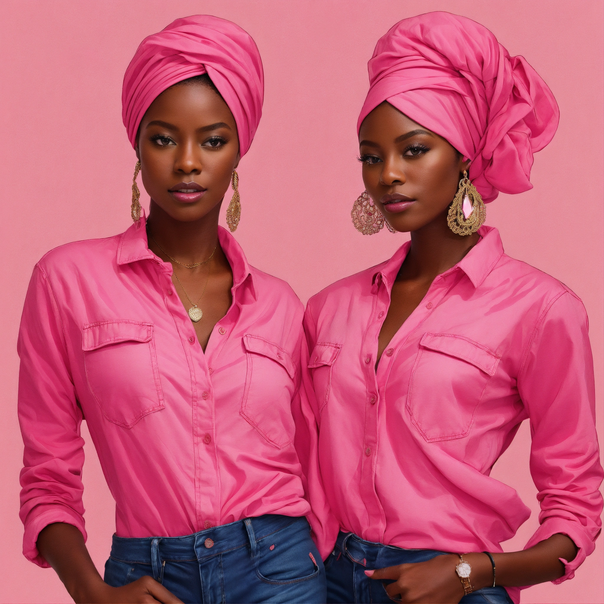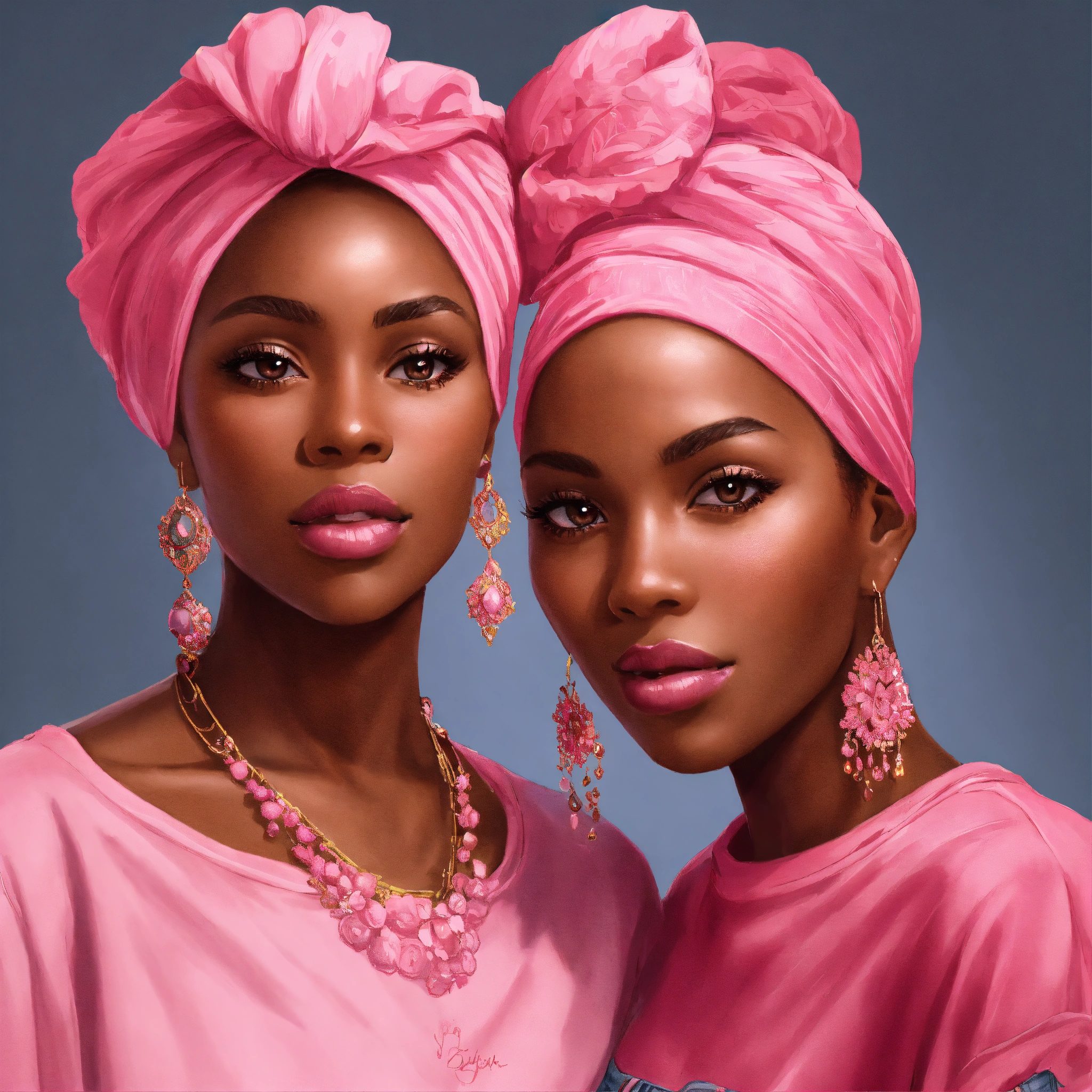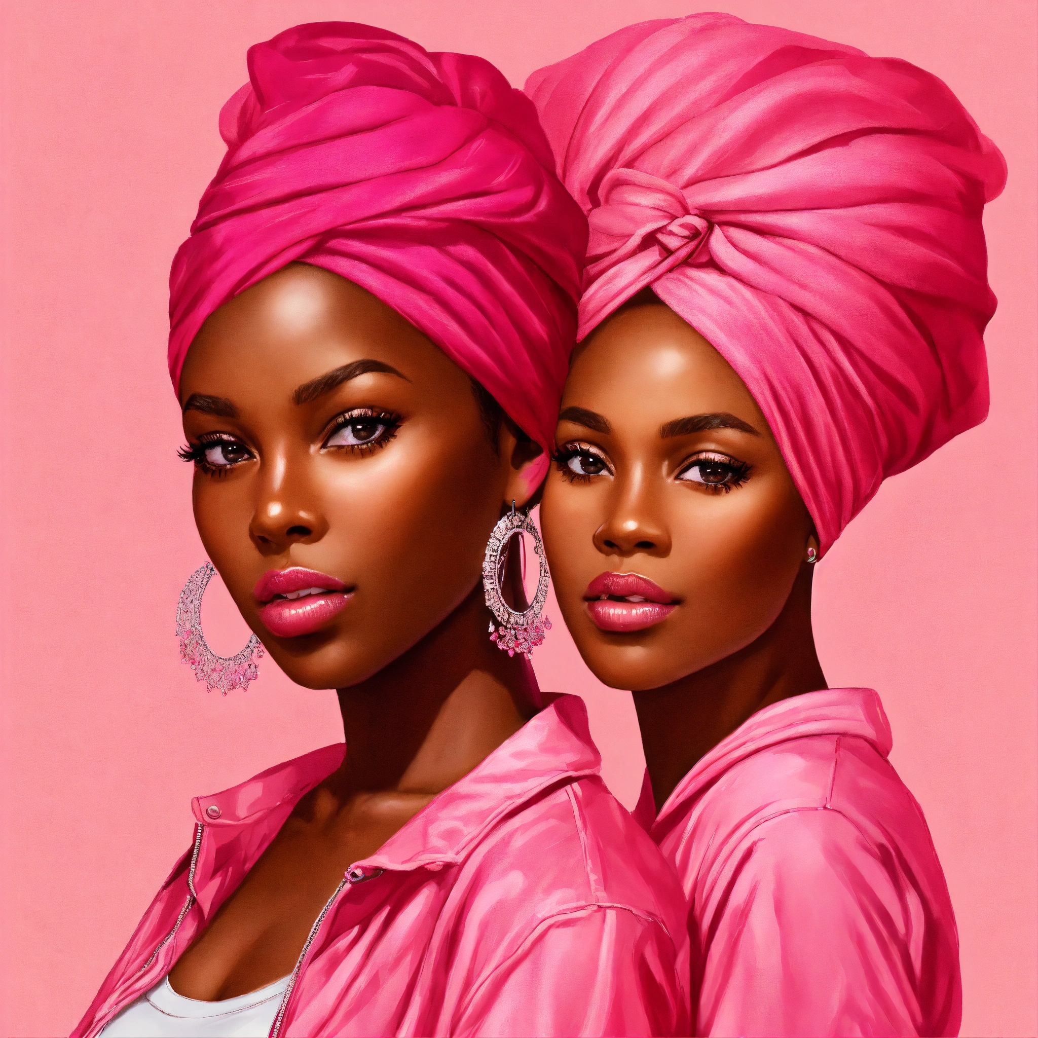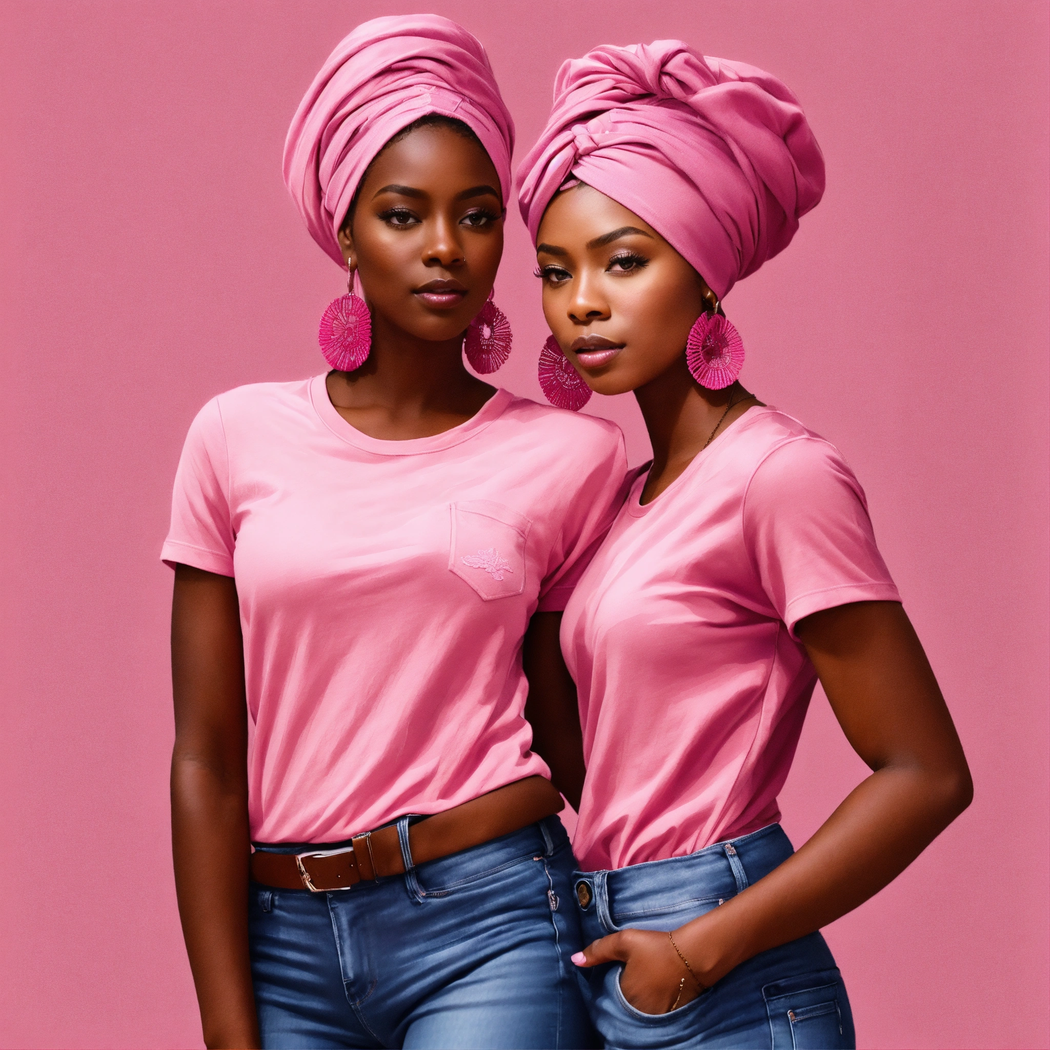 Two dark skinned black women, dressed in the color pink.... with a pink head wrap clipart fully clothe, intricate, casually dressed in jeans and a long sleeved pink t-shirt, highly detailed, digital painting, smooth, sharp focus with transparent backgrounds