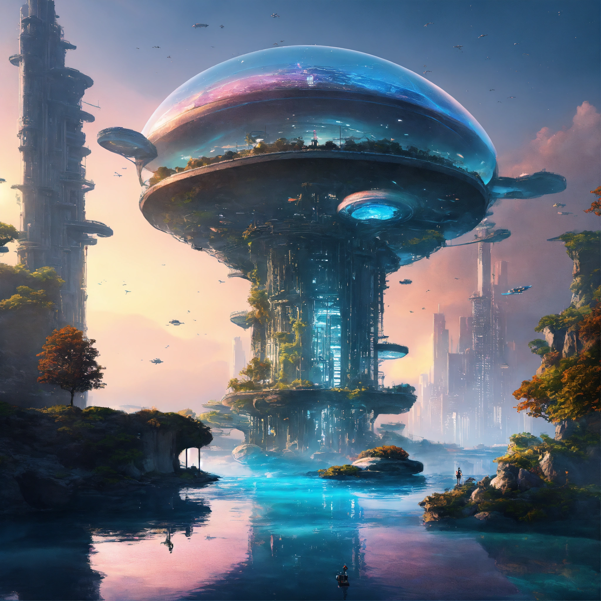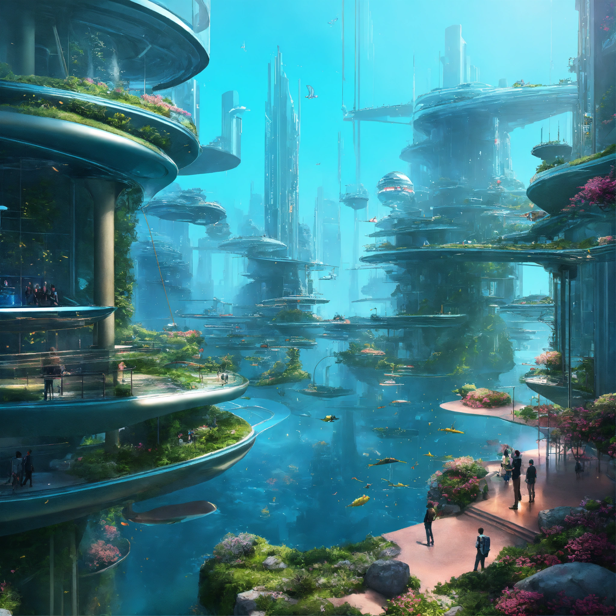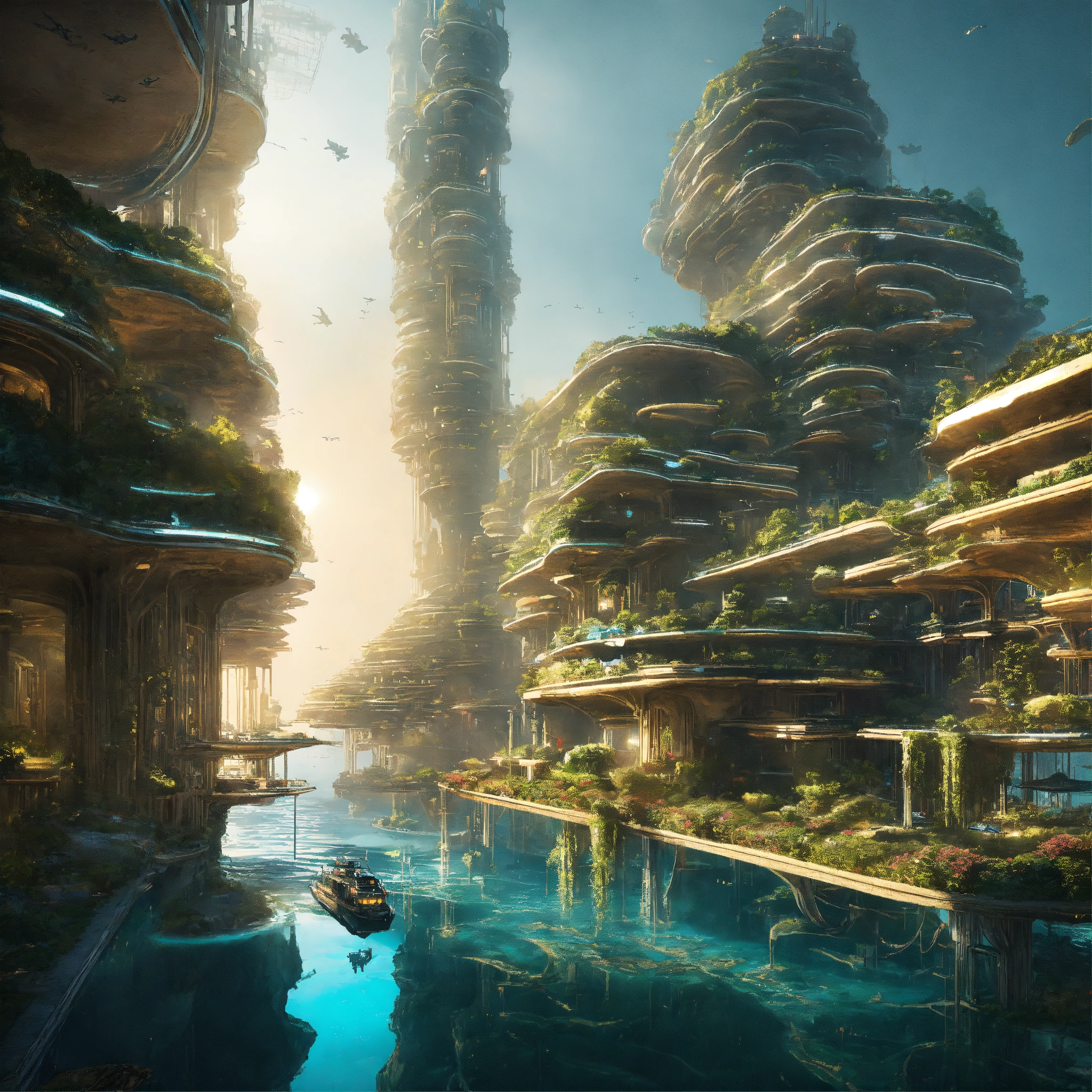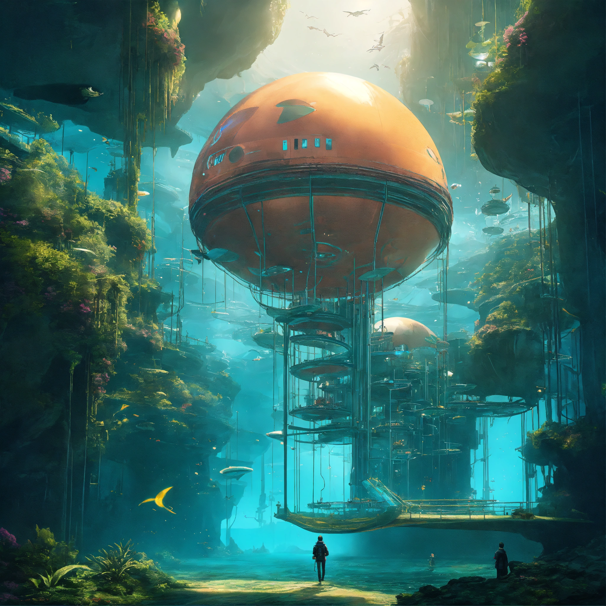 Imaginer une cité submergée futuriste et graphique en t'inspirant du surréalisme, avec un plongeur futuriste explorant les profondeurs.
