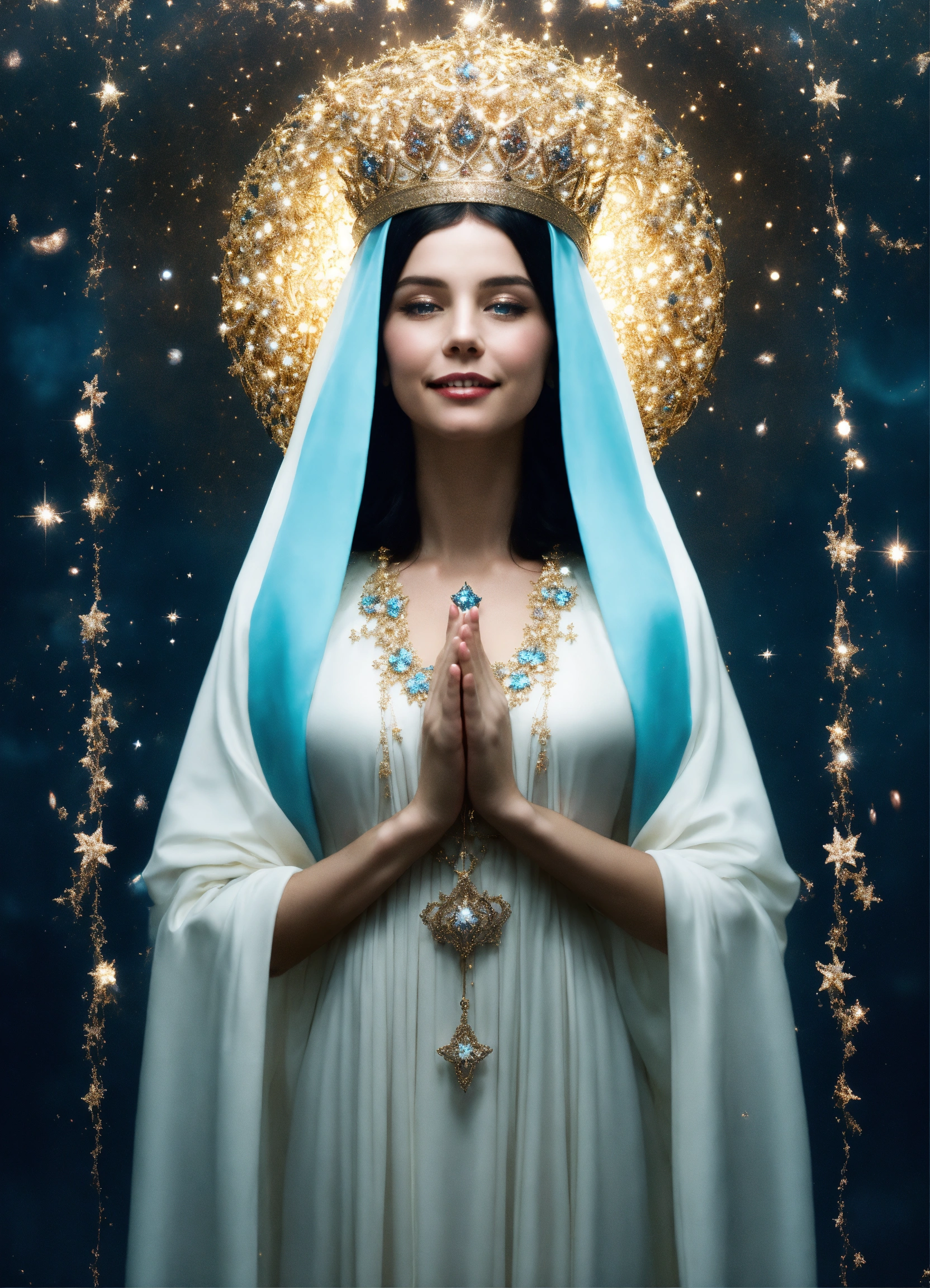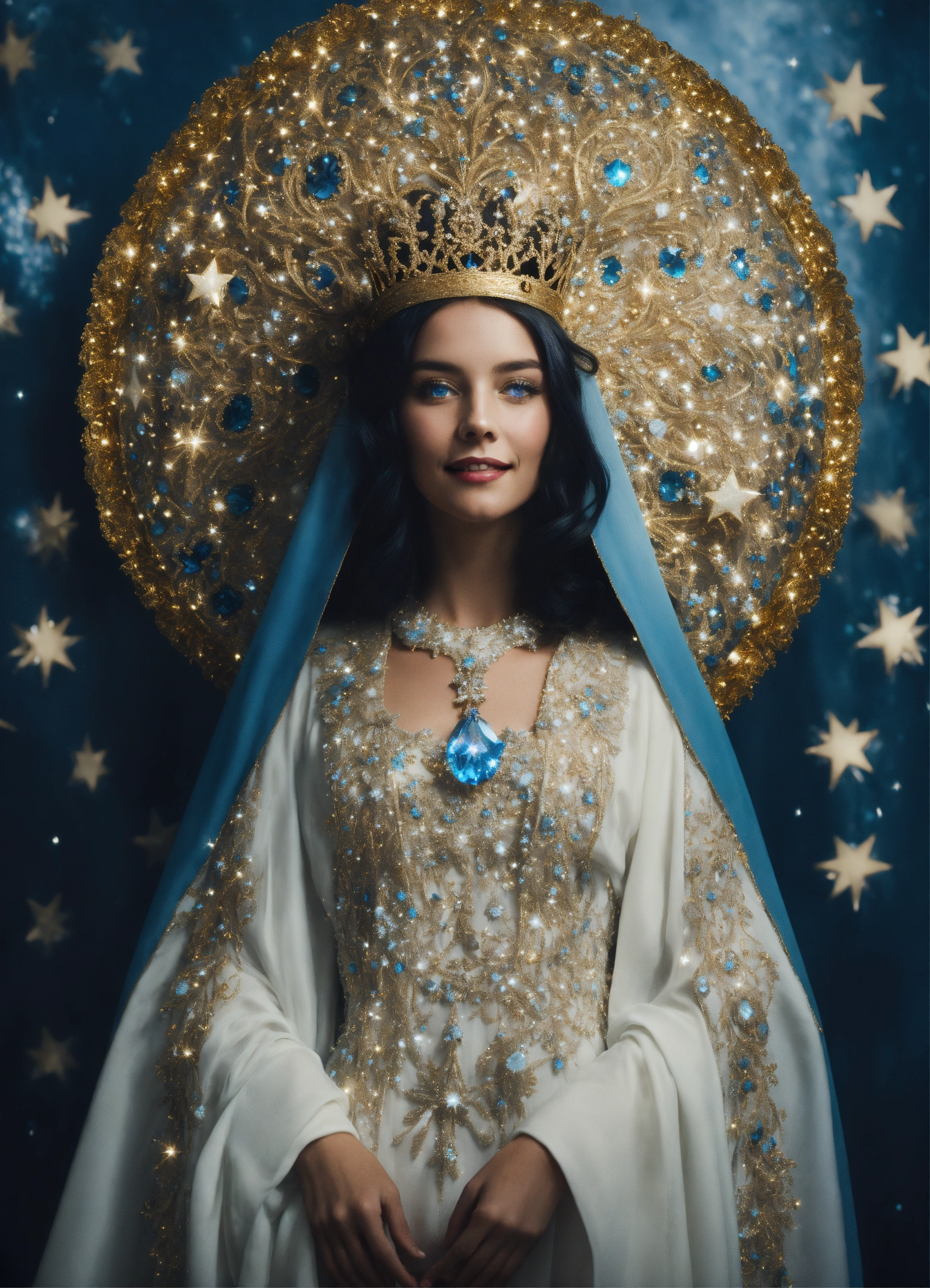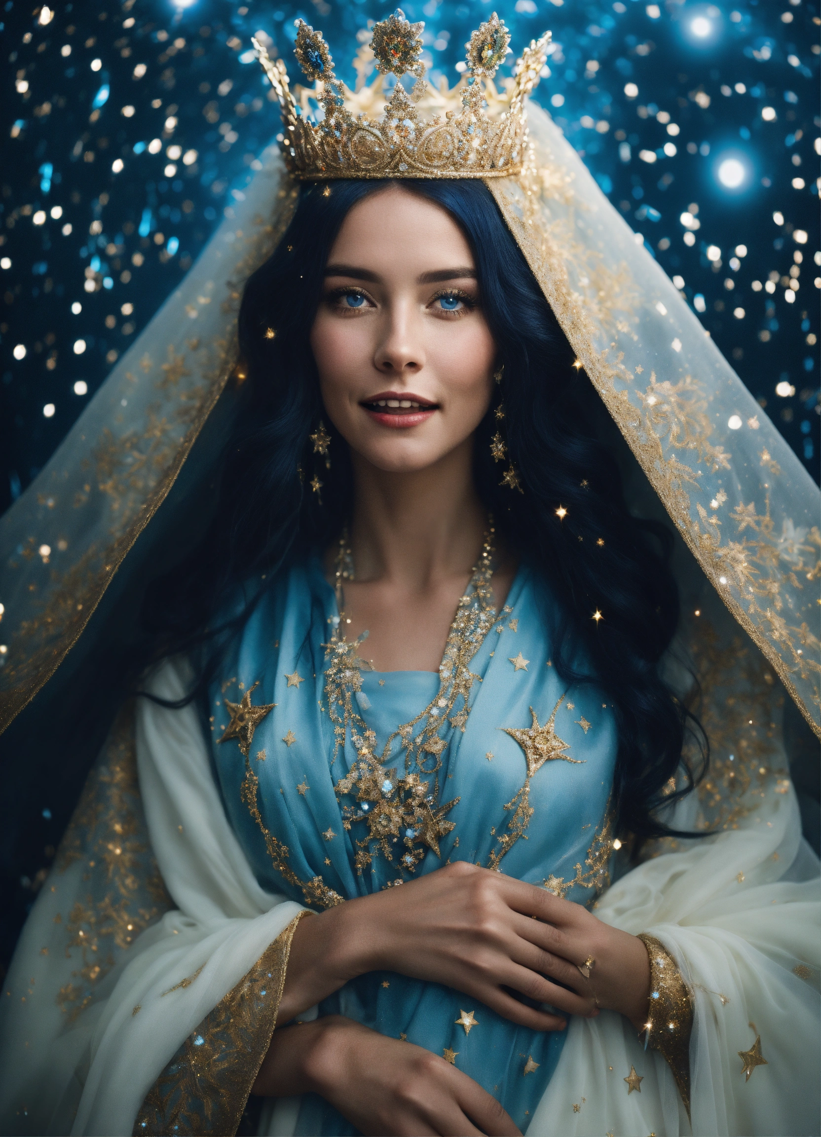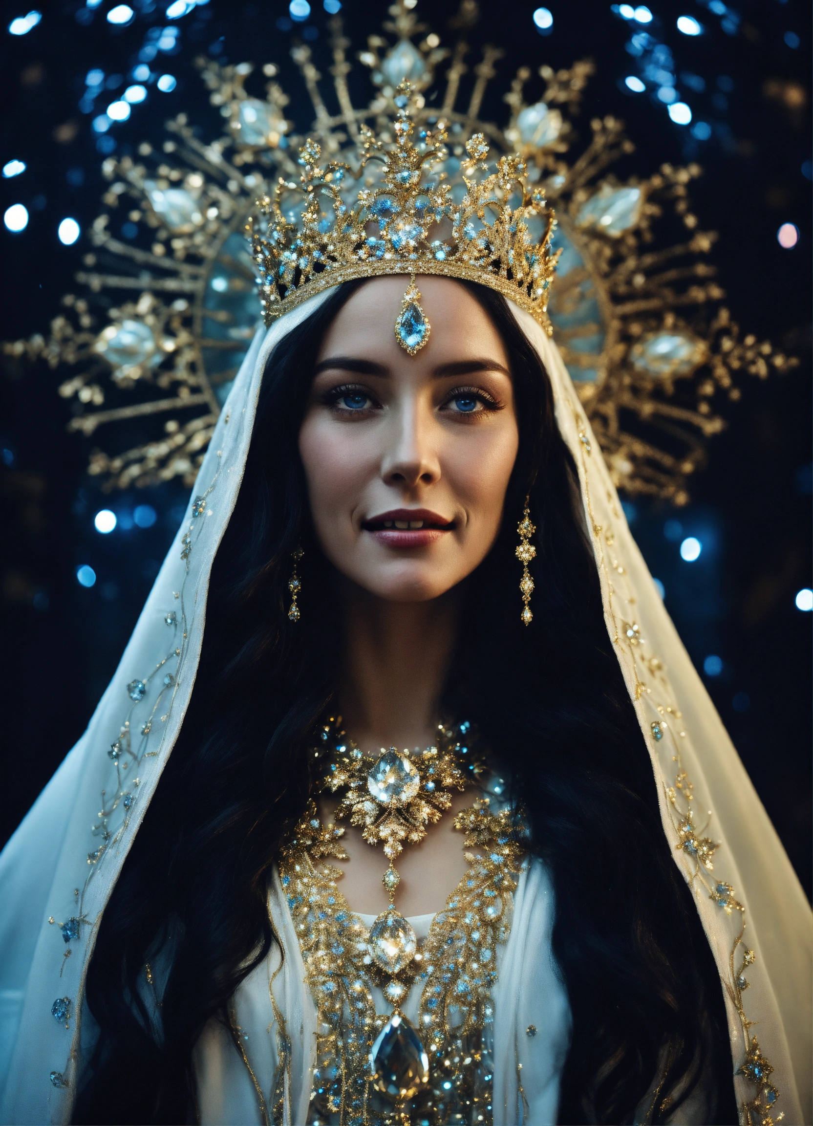 Iconoclastic surrealistic photograph of hauntingly gorgeous kind-faced virgin mary supermodel white joyous, loving kind smile and staring intensely straight ahead directly into camera, wearing sparkling golden crown of stars, black hair, brilliant icy blue eyes centred towards me, wearing long full sparkling diamond blue veil covering her hair, and queenly galaxy white ethereal robes with heavily intricate rose details and high neckline, no chest showing symmetrical, iconic, striking, award winning photo, powerful, emotional, fantasy magazine photo by alessio albi, background is raining sparkling white stars in moonlight. film grain.