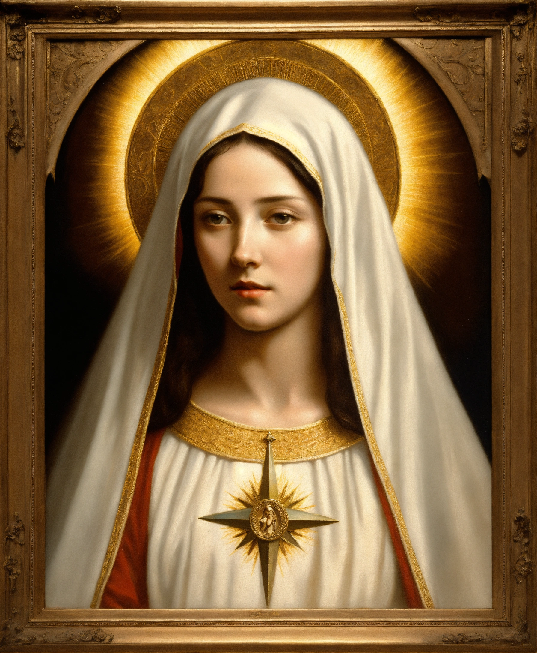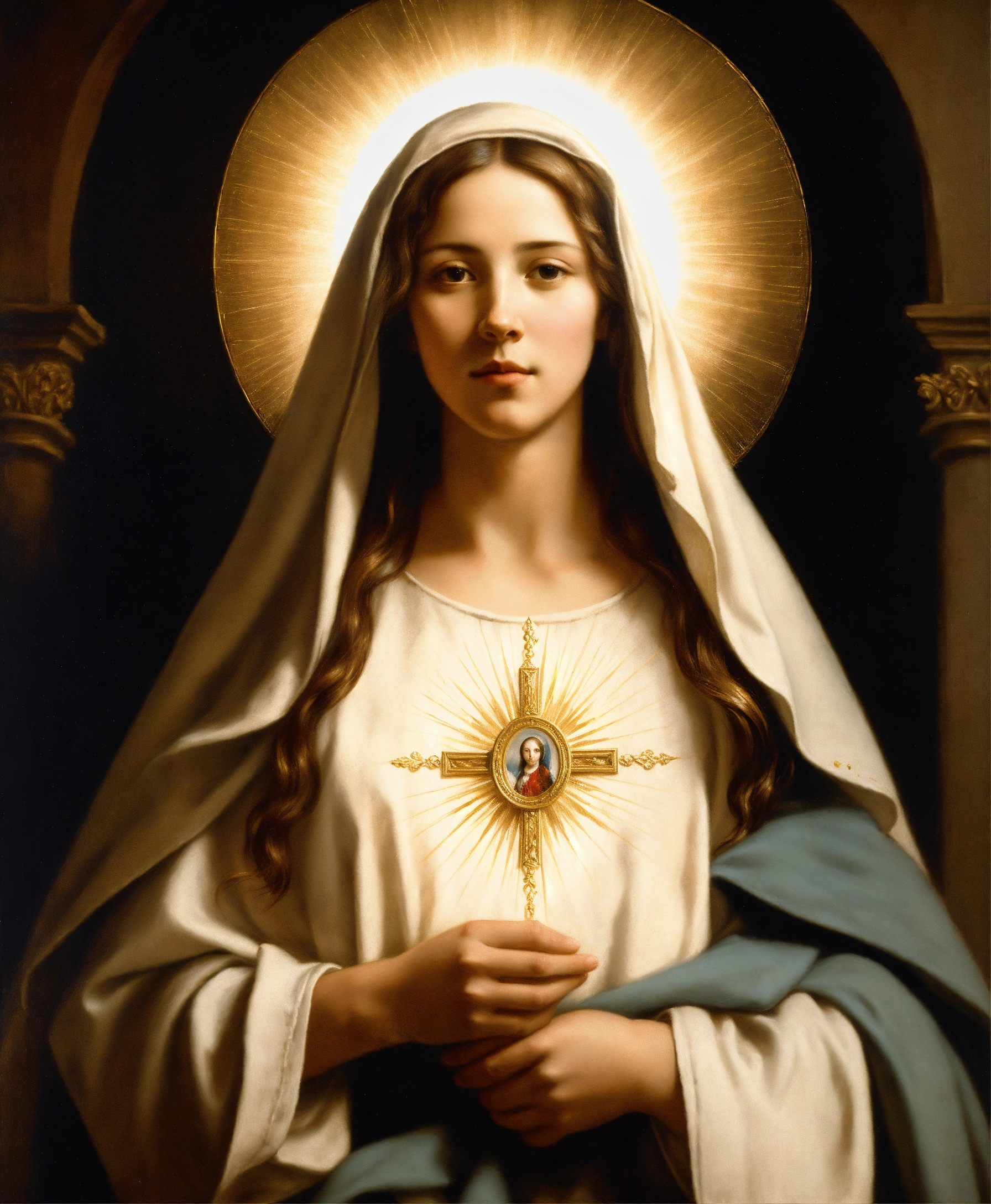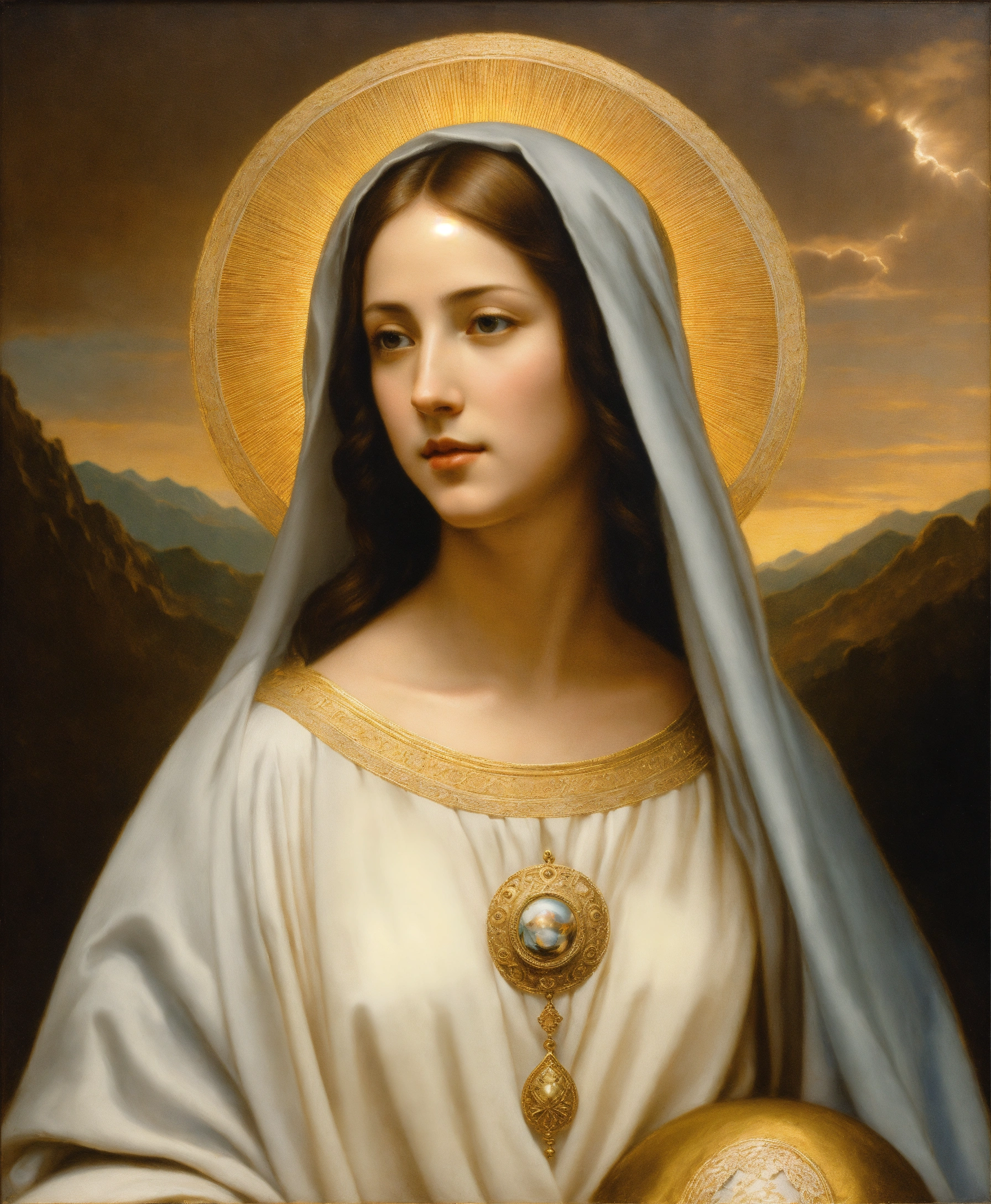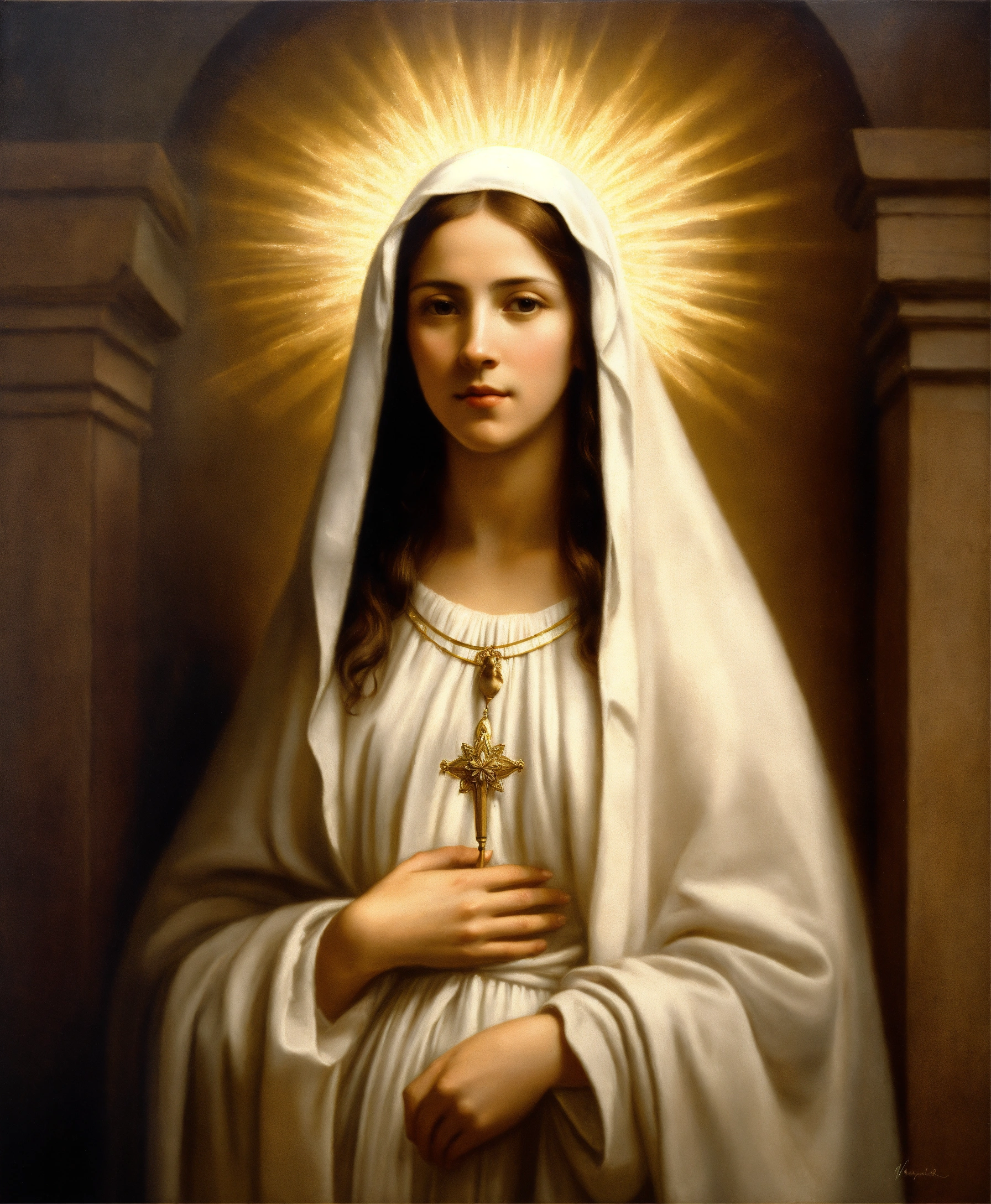 Virgin mary mother of jesus facing the viewer, medium distance frame, with beautiful white robe and halo and rays of light coming out of her head on mountain, modest tunic and veil, tenderness in her facial expression, melancholic, loving, intricate, highly detailed, realistic, arts station, soft, sharp focus, artwork by da vinci, murillo, velázquez, durero, clasic oil pinting style