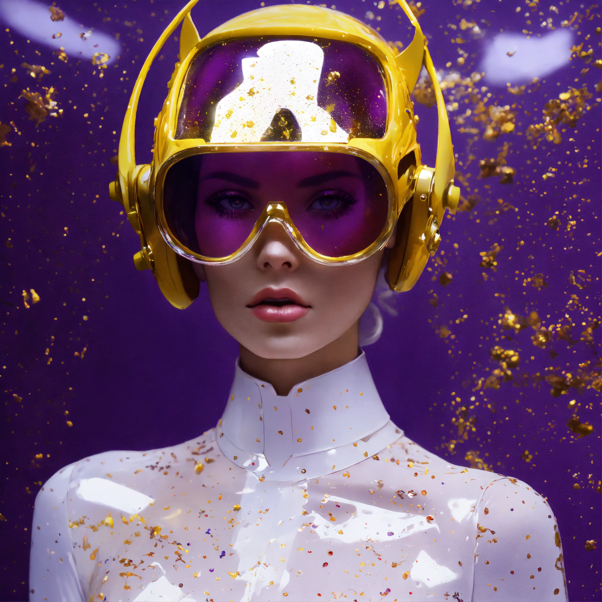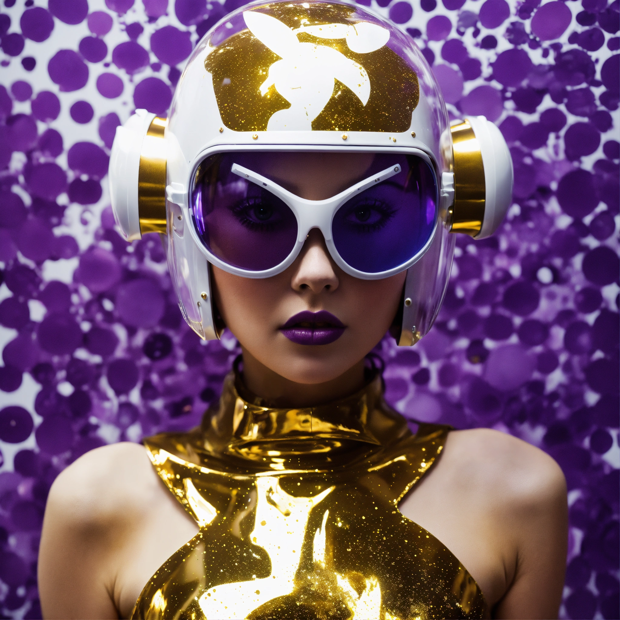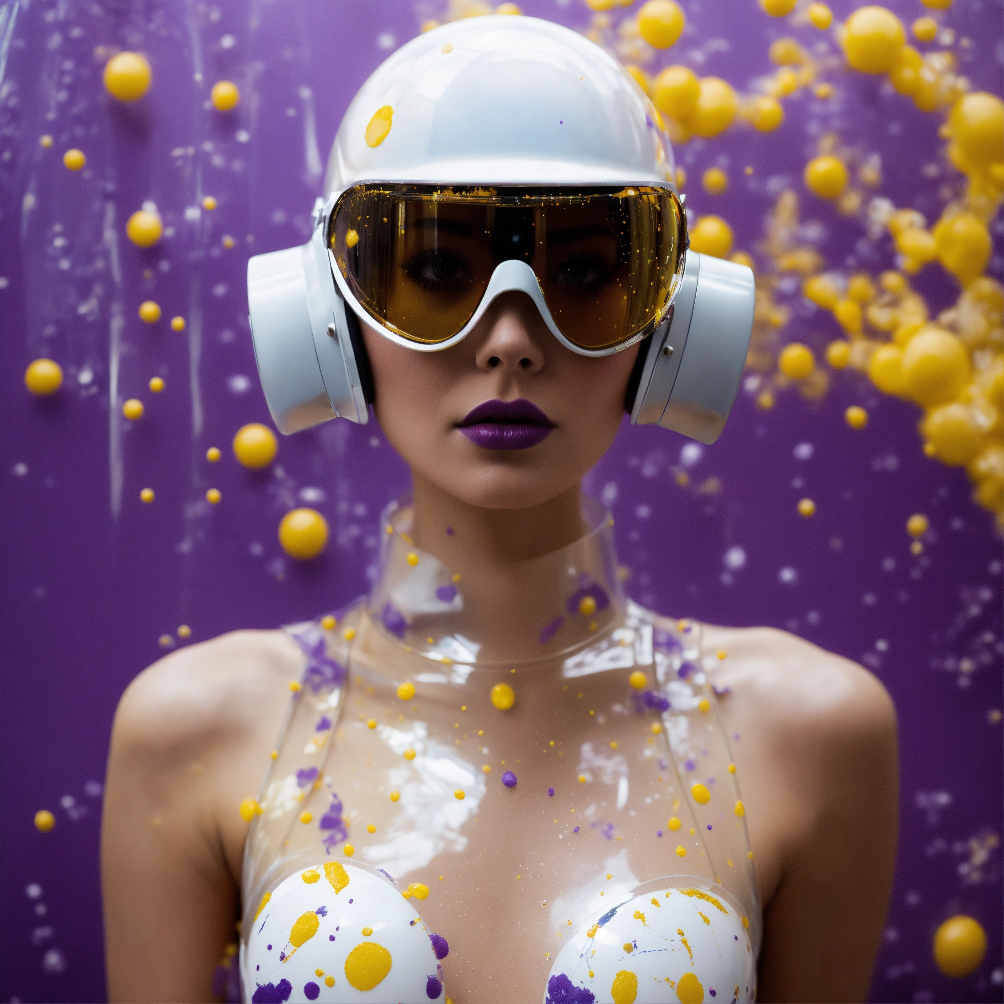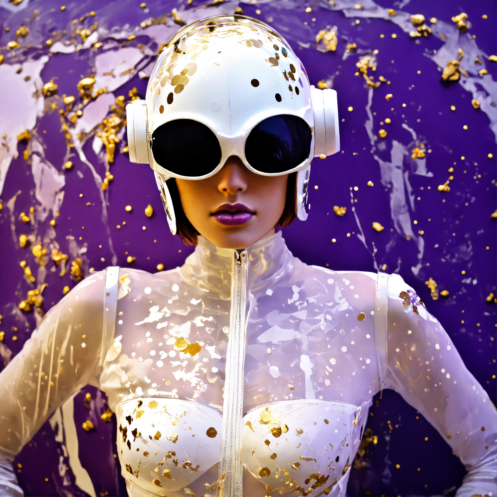 Deflagration of 60's vintage, white, purple, and gold photography, a hi tech sci-fi fashion model woman, with her cat woman plexiglass helmet and sunglasses in a plexiglass bodysuit, emerges from polkadot white ink splatters, 80 degree view, art by sergio lopez, natalie shau, james jean and salvador dali