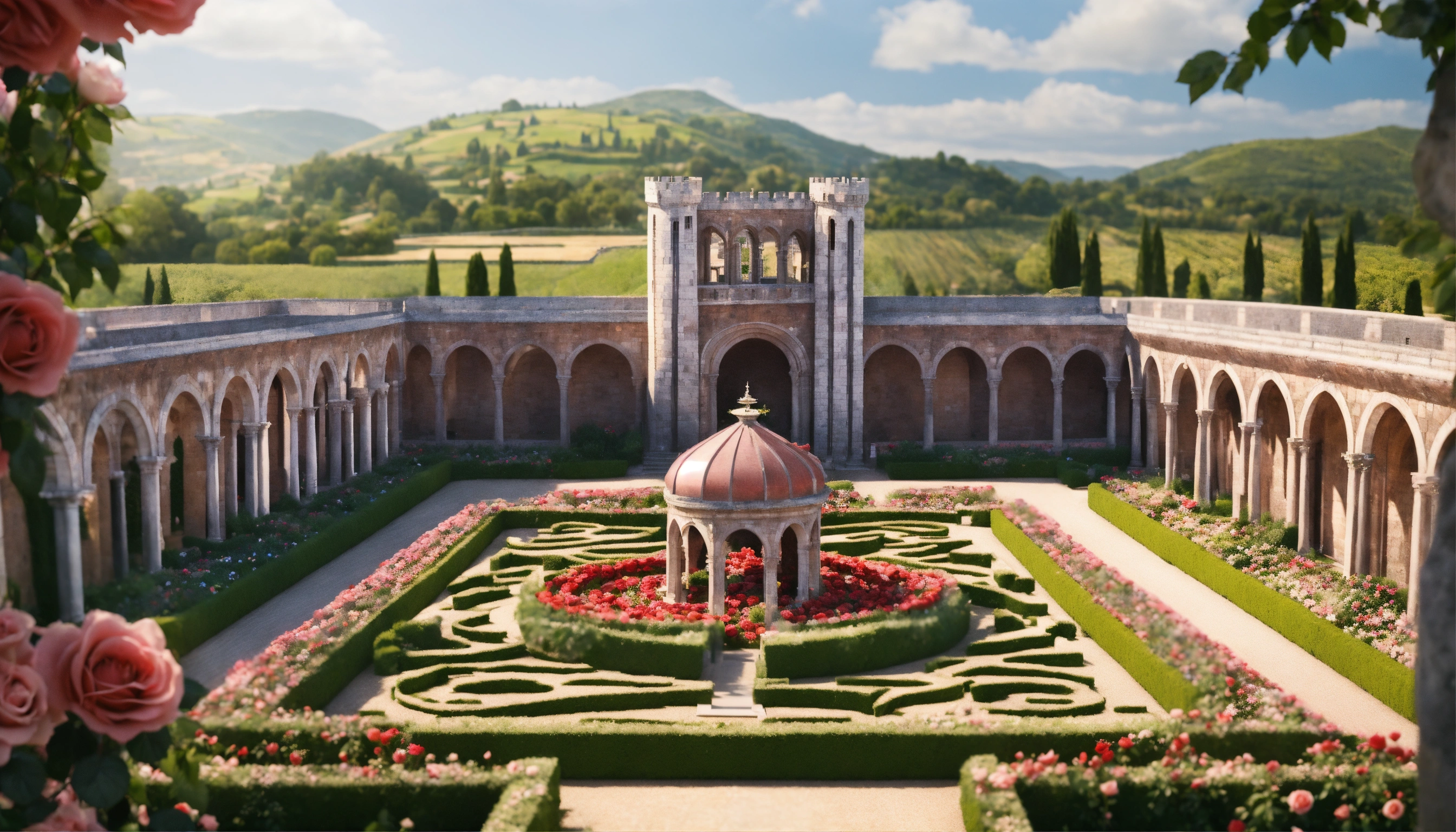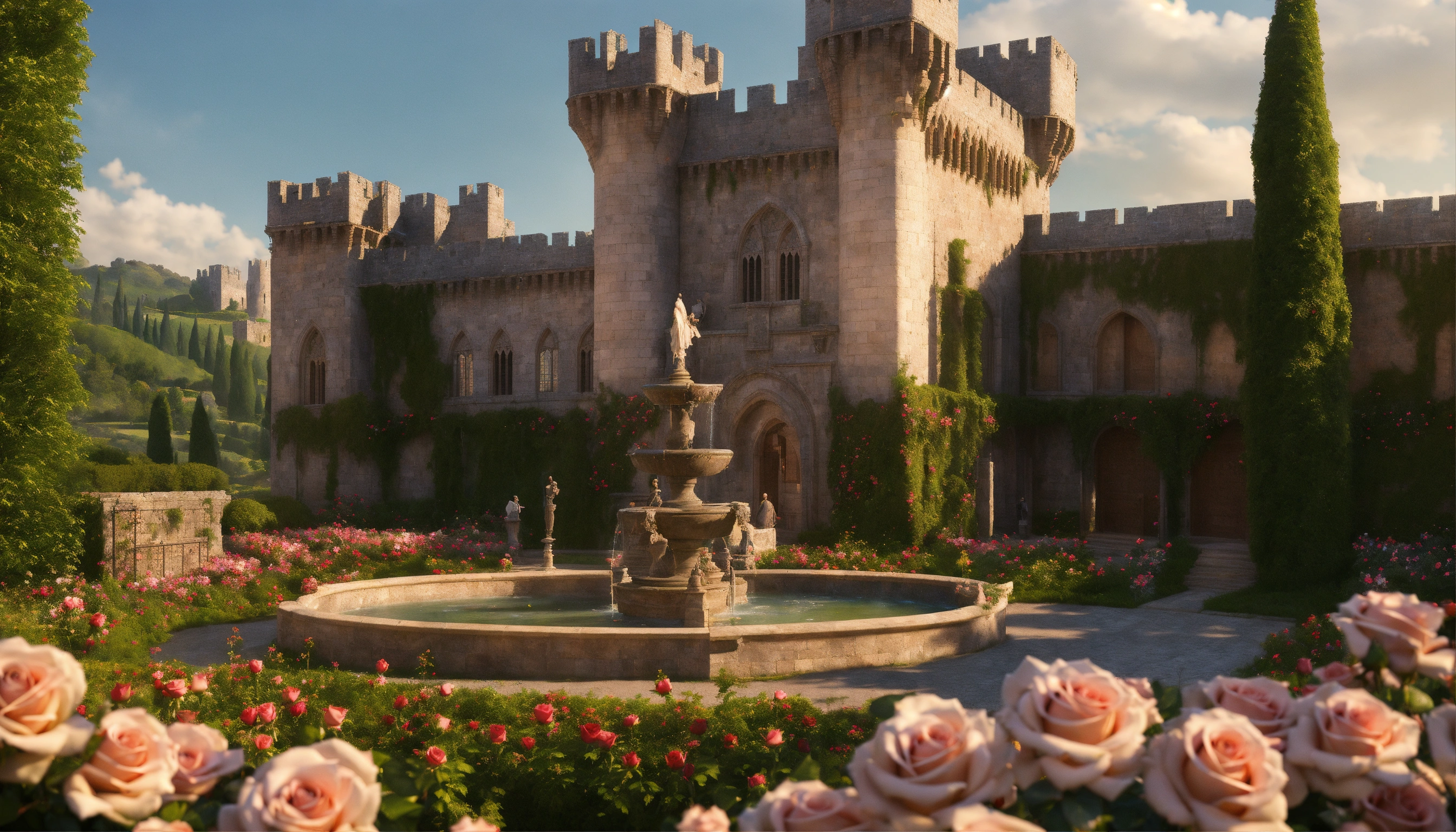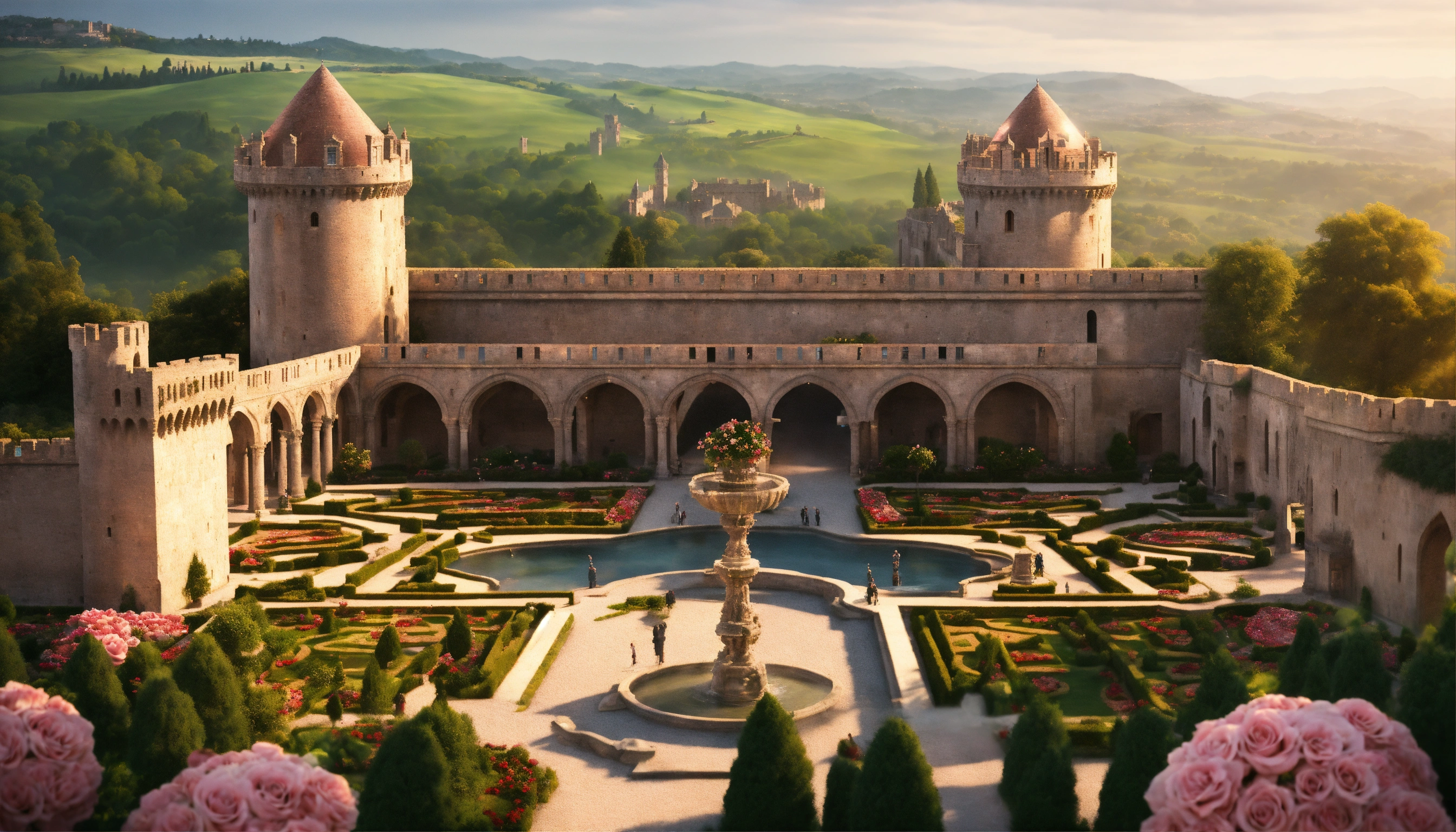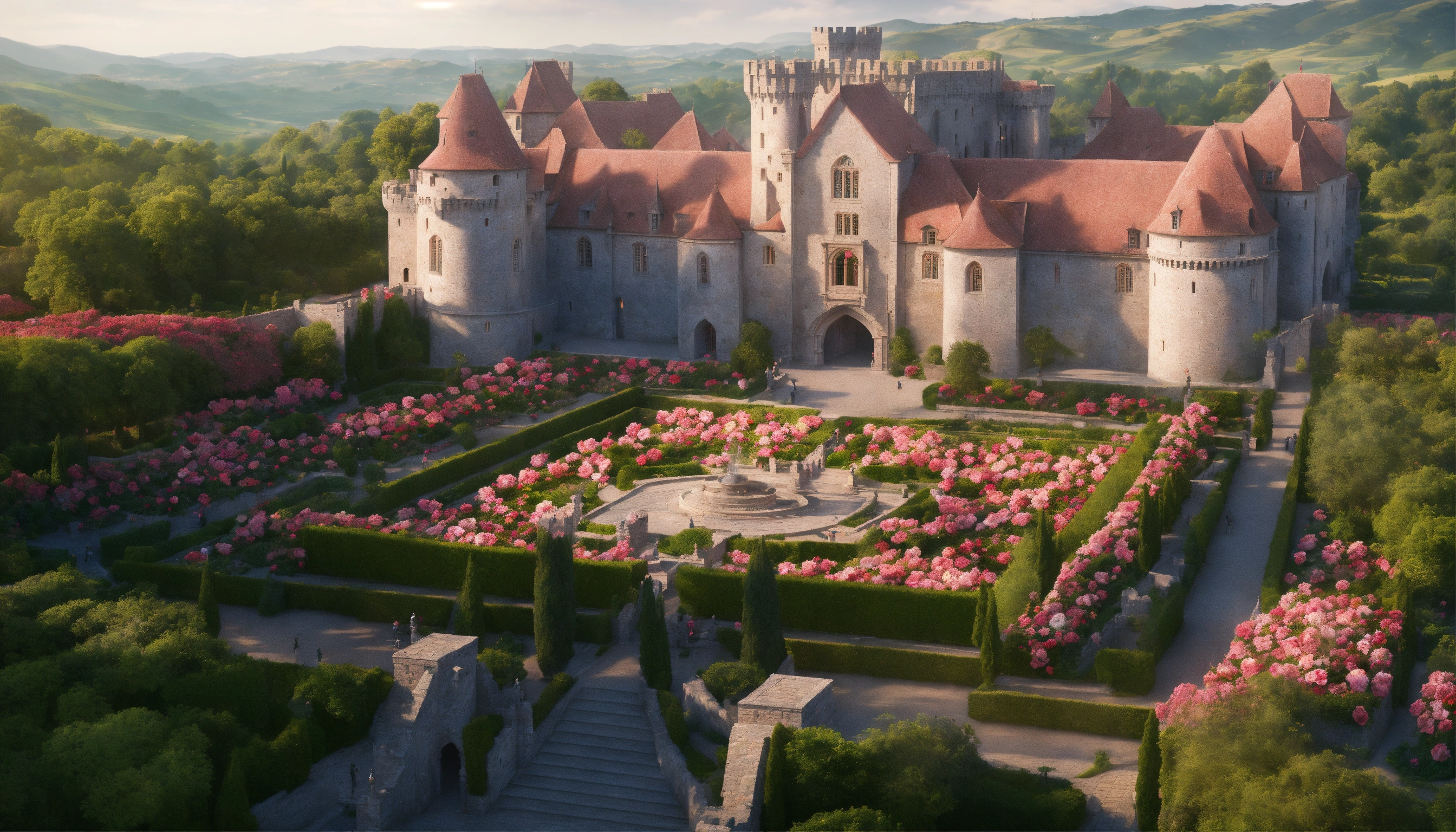 Ultra realistic, photorealistic, palace of roses, medieval castle from a bird's eye view, rose bowers, magnificent rose garden and arcades, magnificent fountain, marble figures, massive crenellated stone wall with wall gate and watchtowers, extensive rose fields on hilly landscapes in the area, very detailled, focus on castle, sharp focus, sharp, ambient lighting