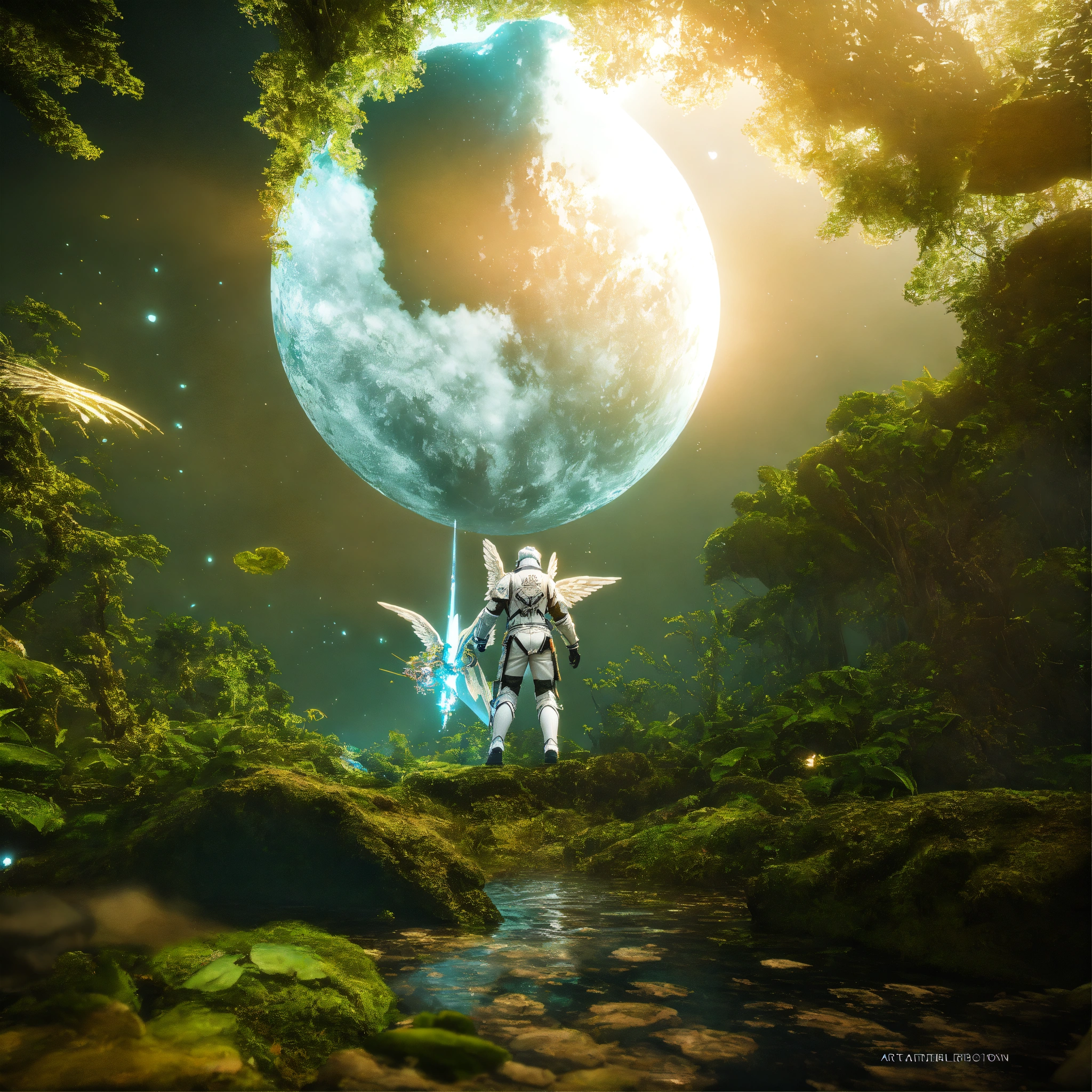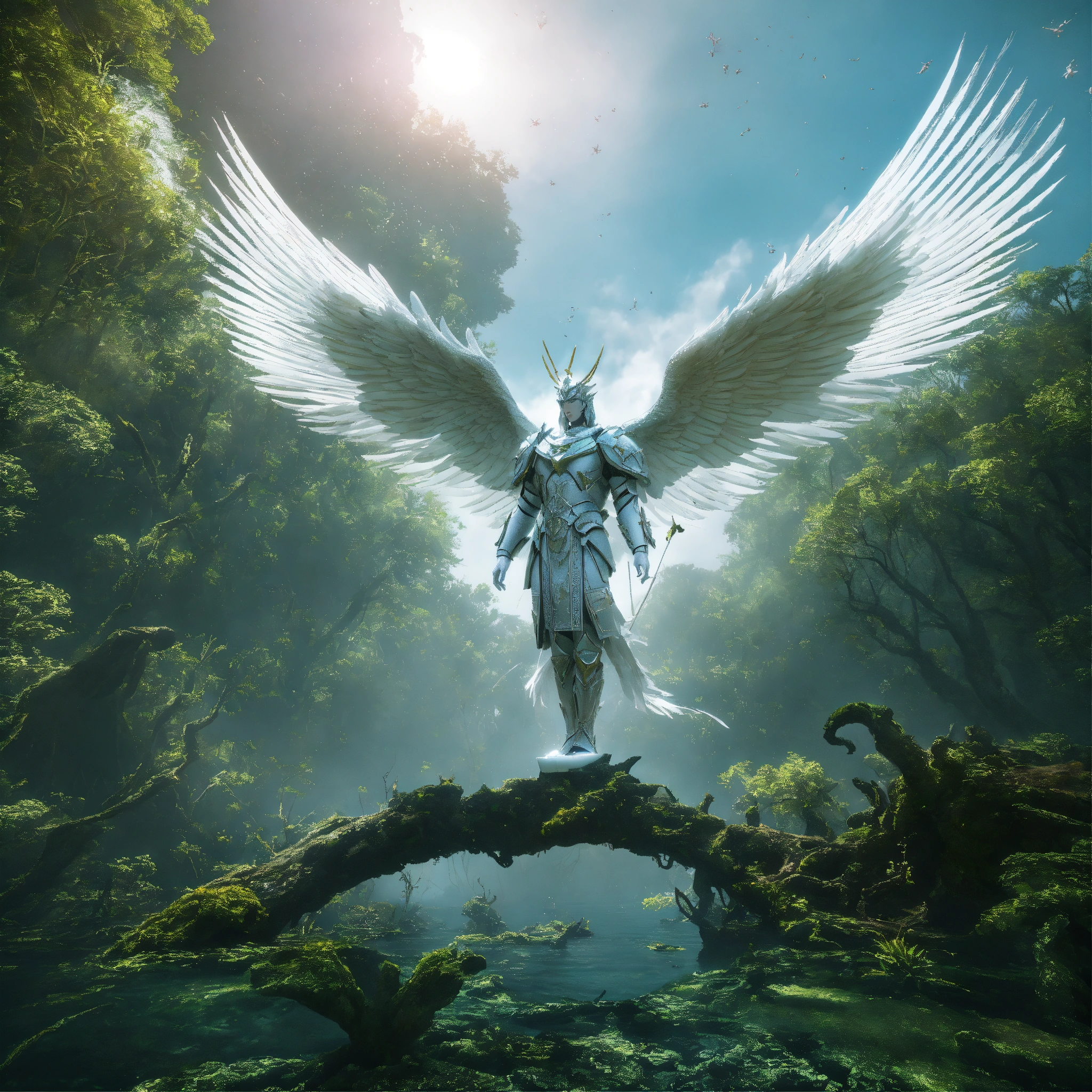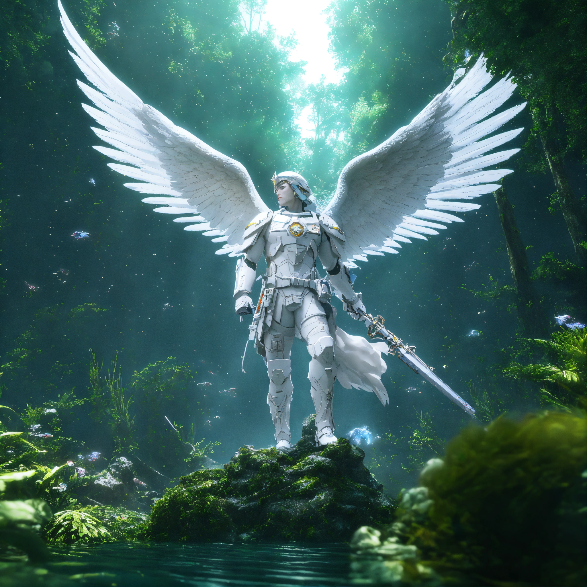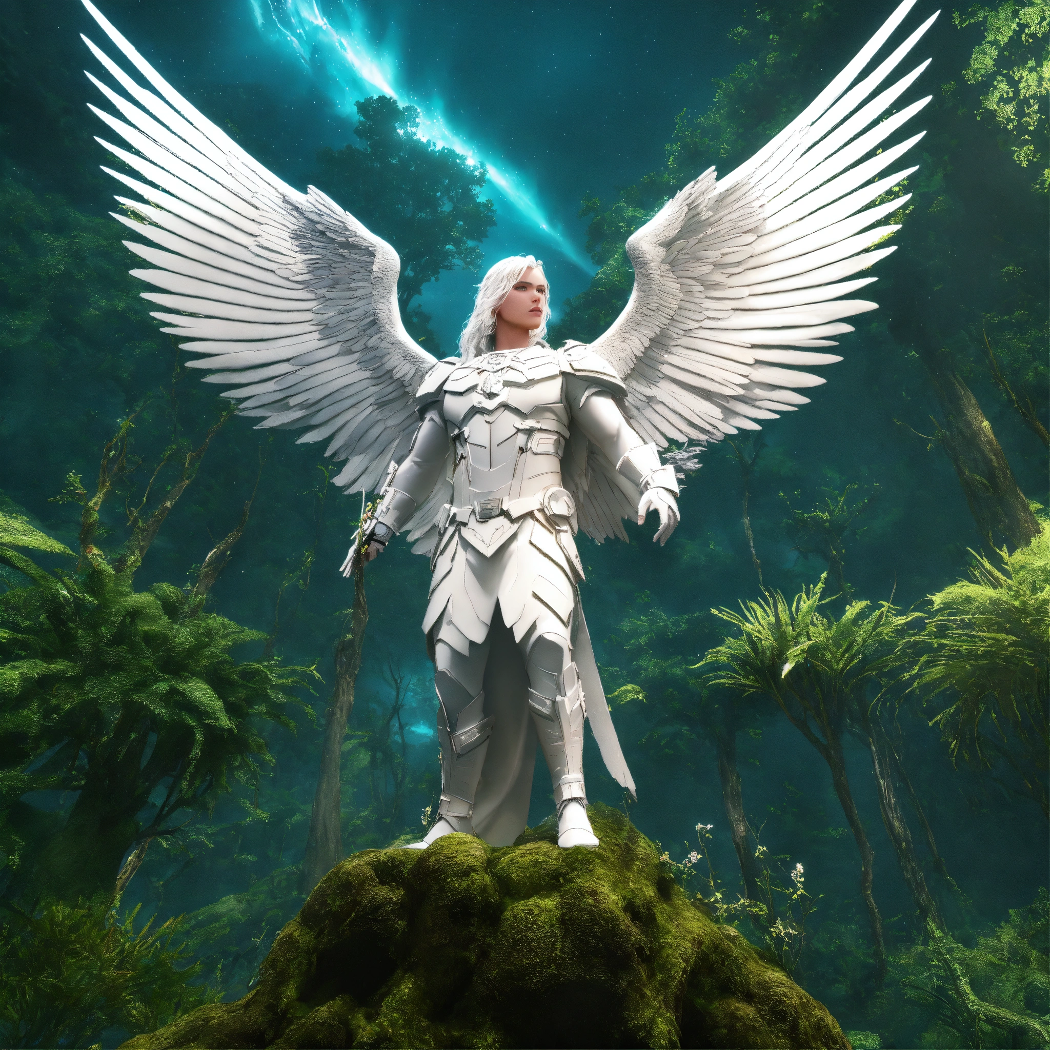 White archangel michael war, reptile in the forest, being reincarnated into a ocean world, sky nebula, artstation scifi 3d scene of a showing forest, maximalism, ambient occlusion, atmospheric haze, unreal engine, hyper realism, realistic shading, cinematic composition, realistic render, octane render, detailed textures, photorealistic, wide shot