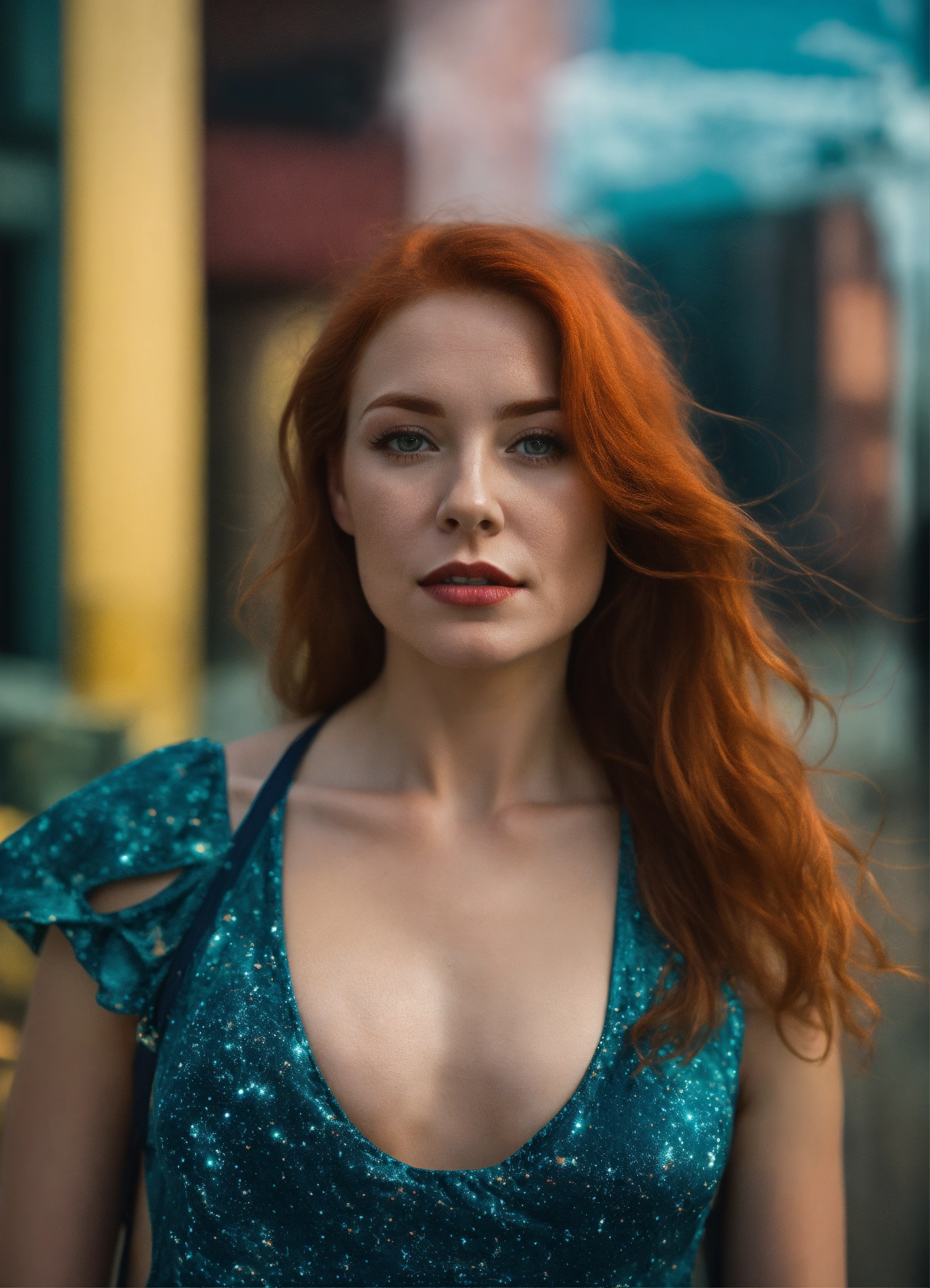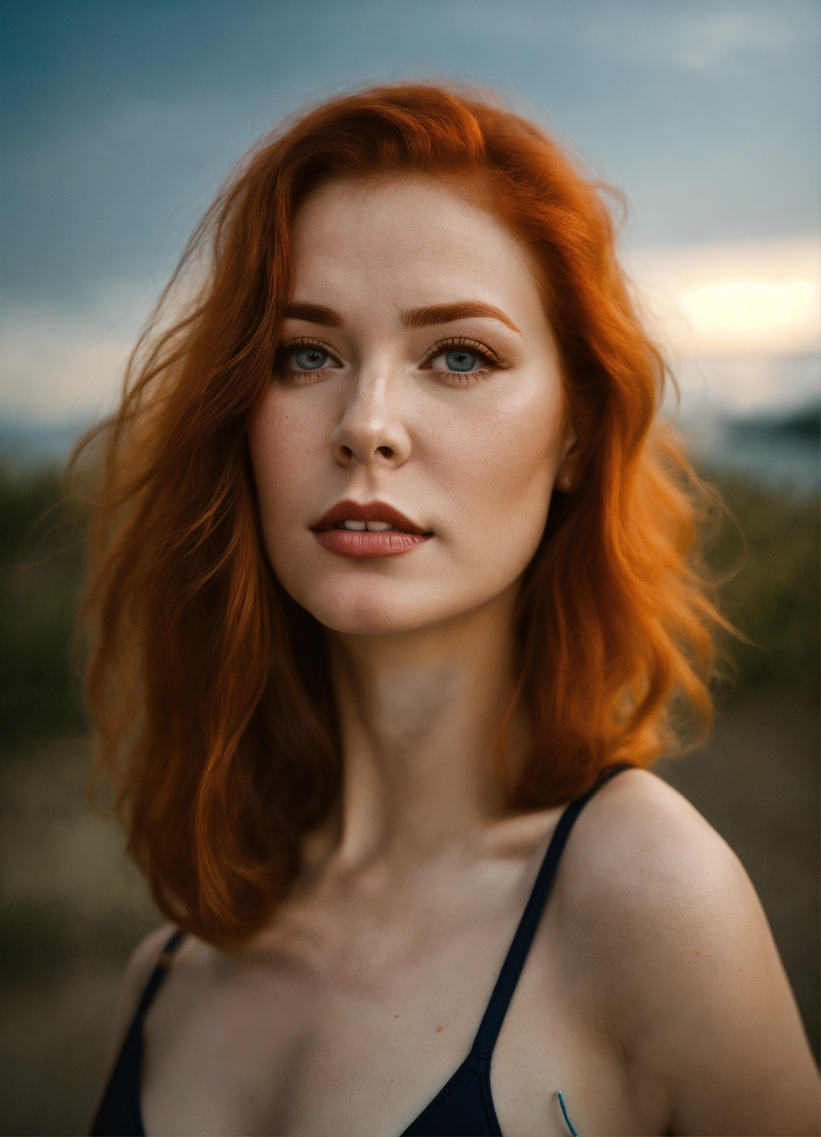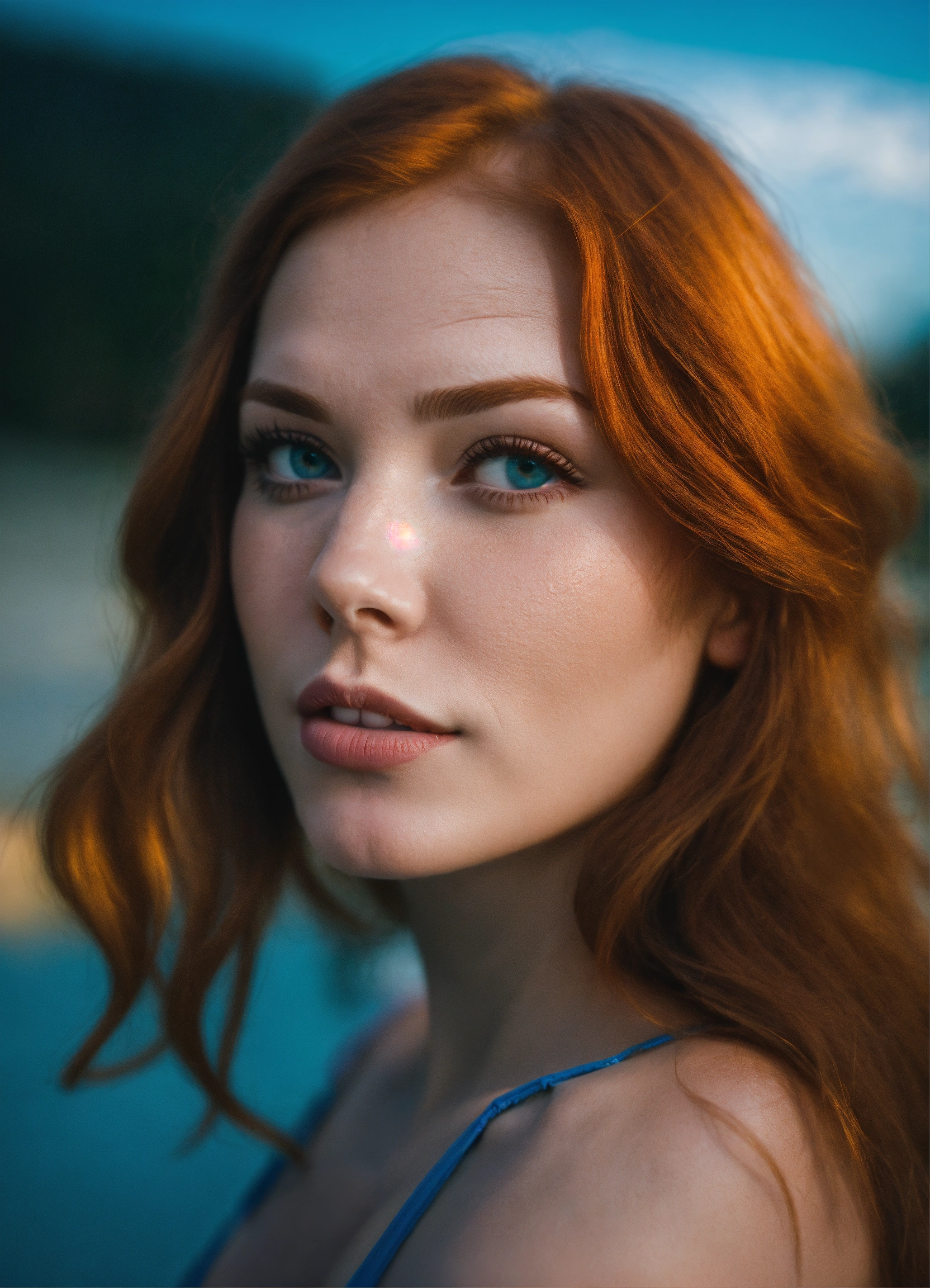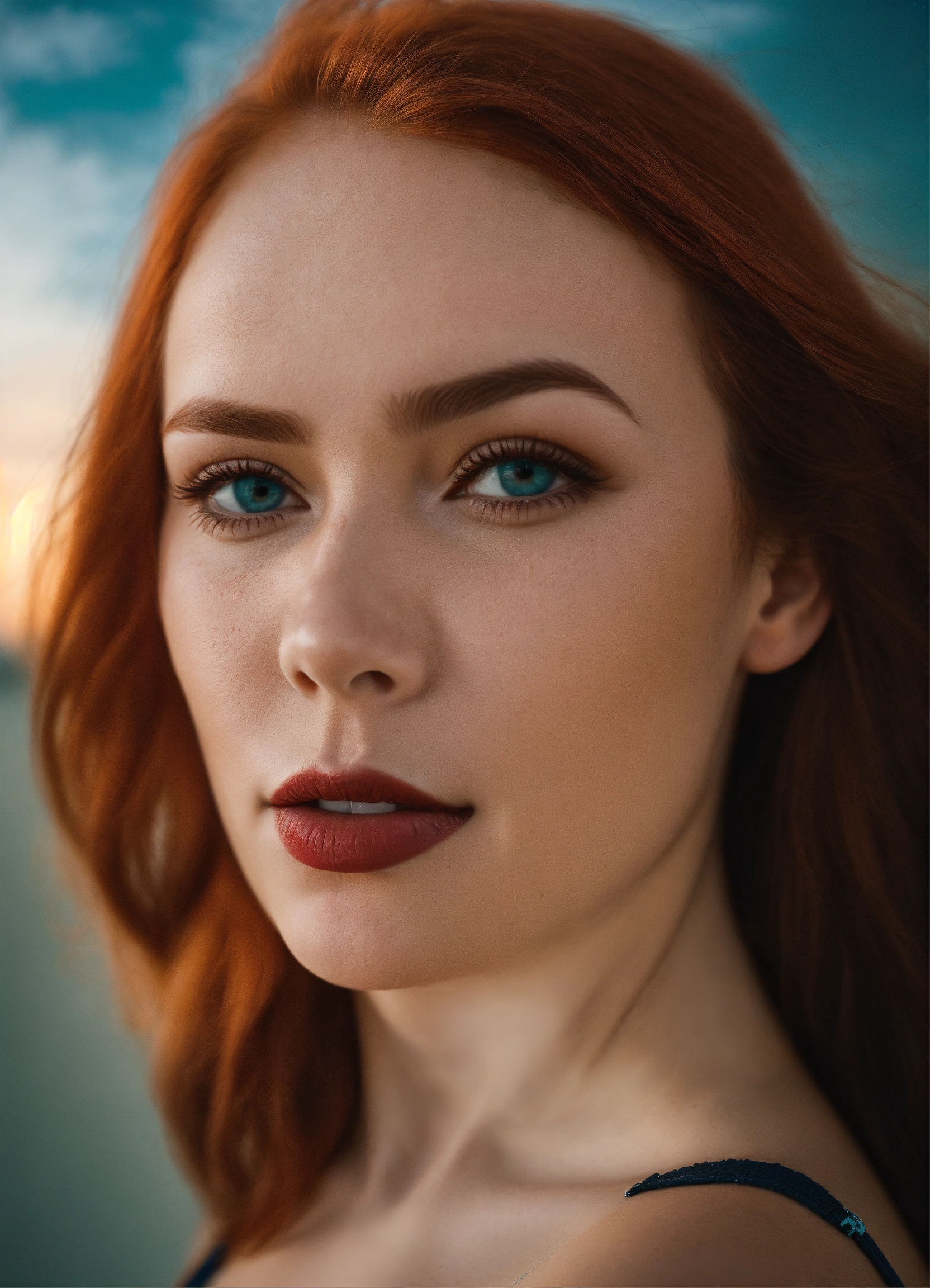 A real photo of a 38 year redhead woman, with full lips and big open eyes. she wears a swimsuit she looks naughty straight into the camera. (head is tilted forwards) in the sky we see the galaxy
