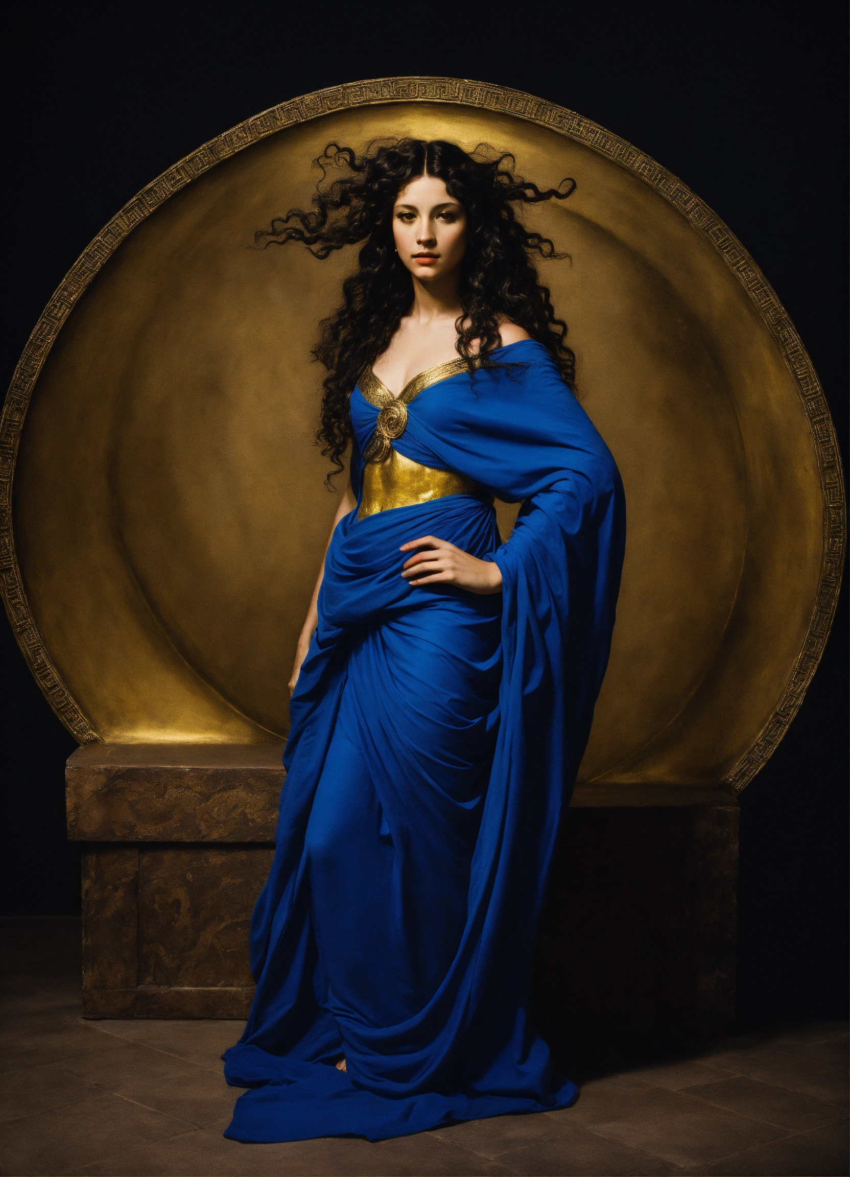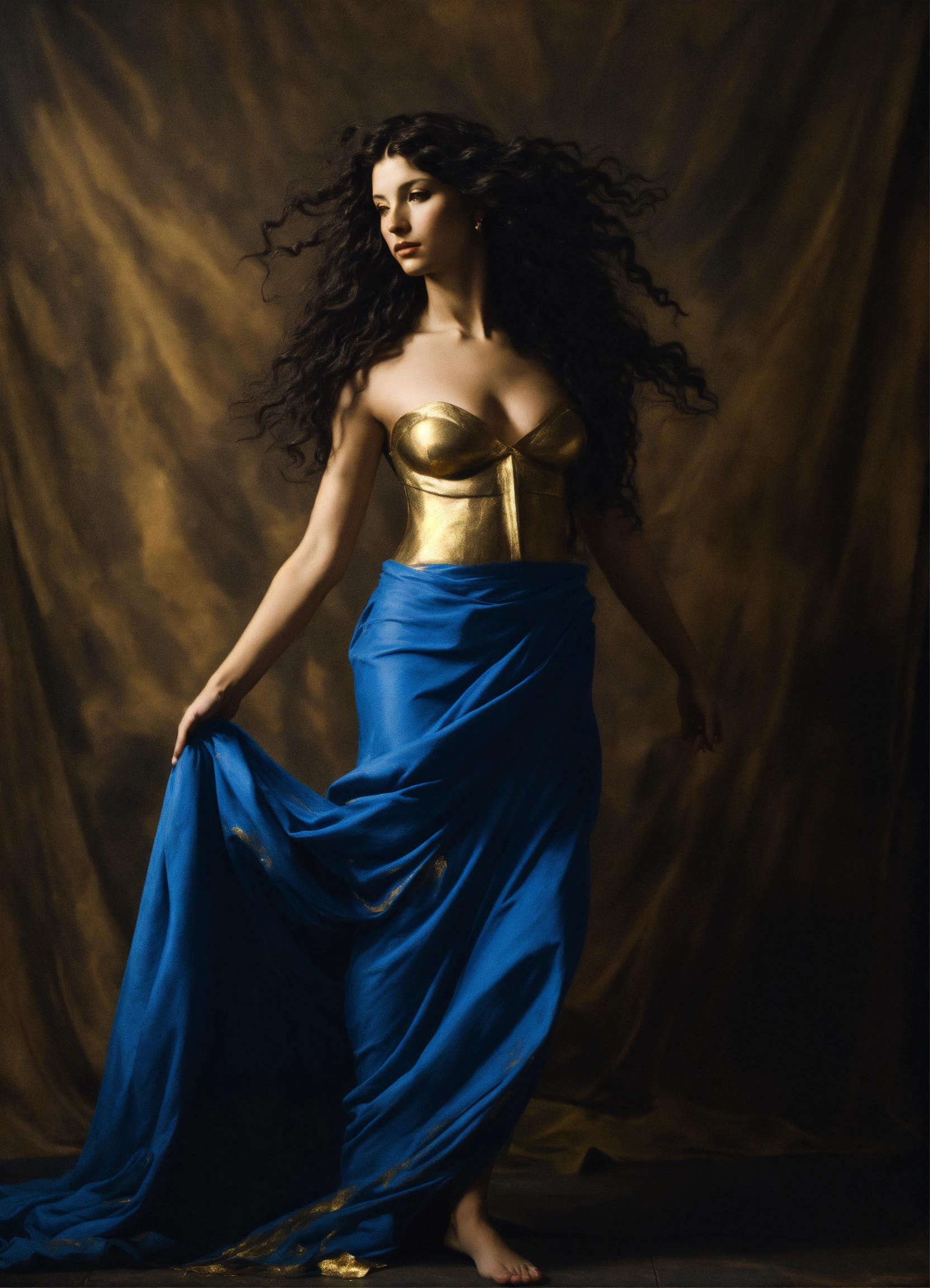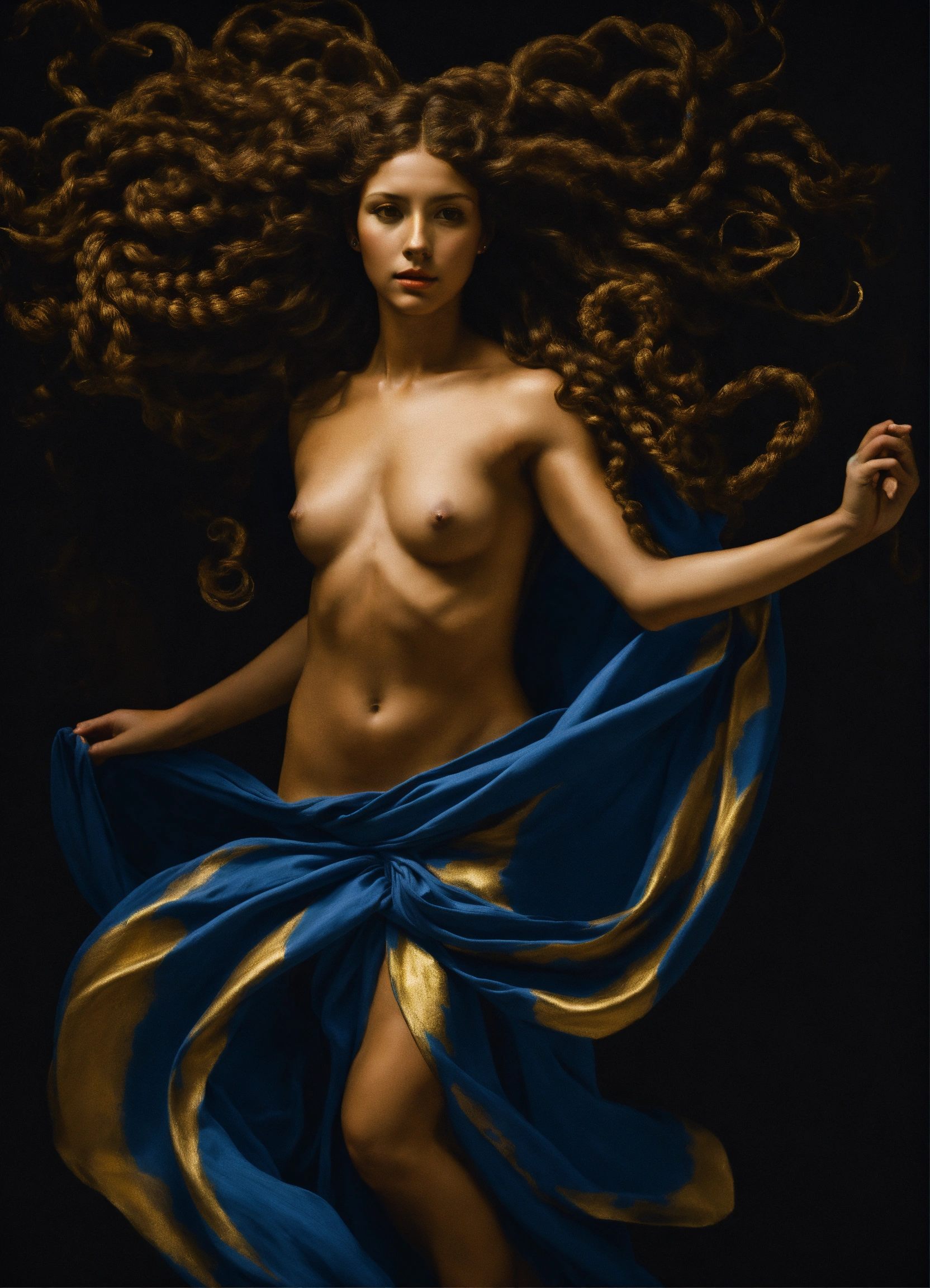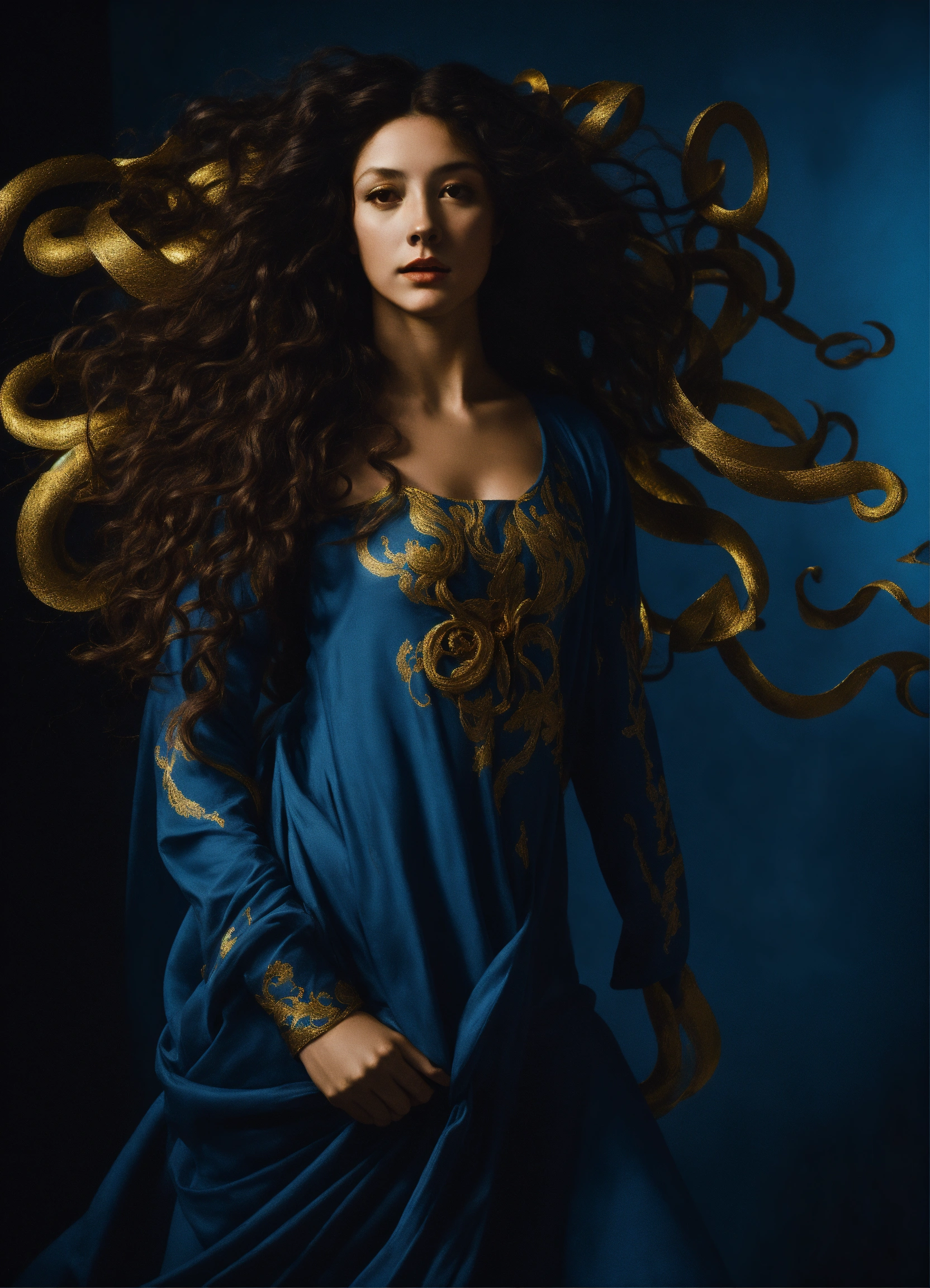 Full-length view, looking straight, natural standing pose, the medusa by caravaggio, antik, greek, with long curly dark hair blowing in the wind, body painted only in blue and gold, perfect studio lightening, film grain, dark background