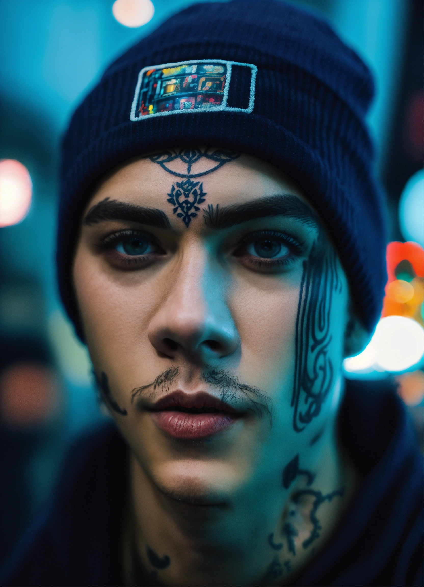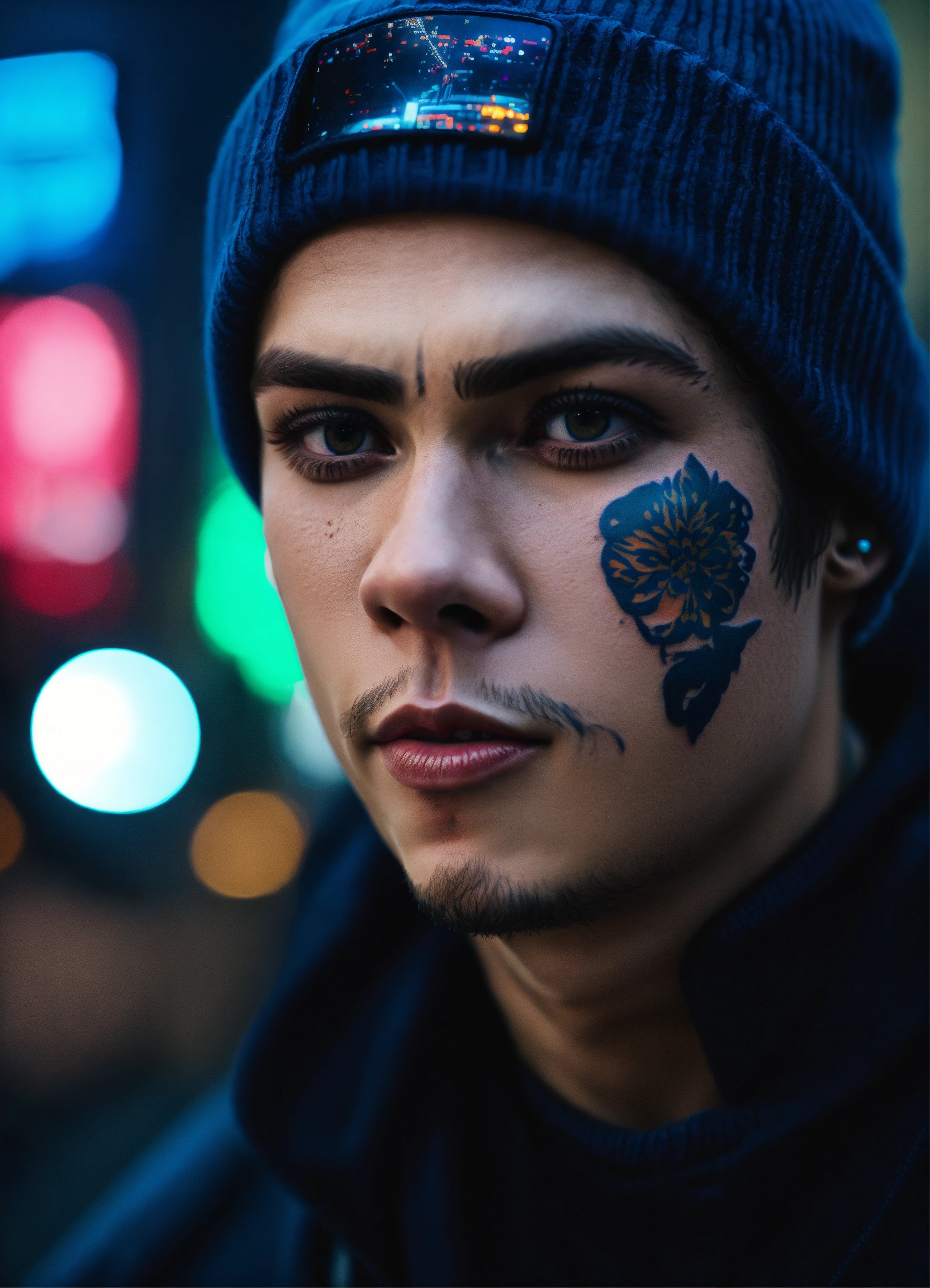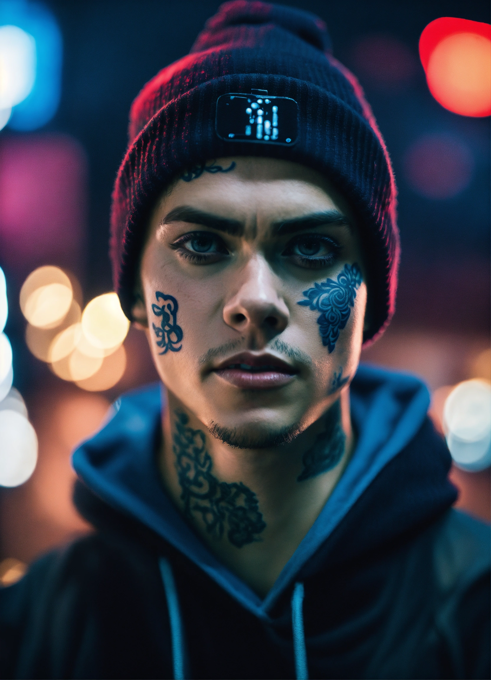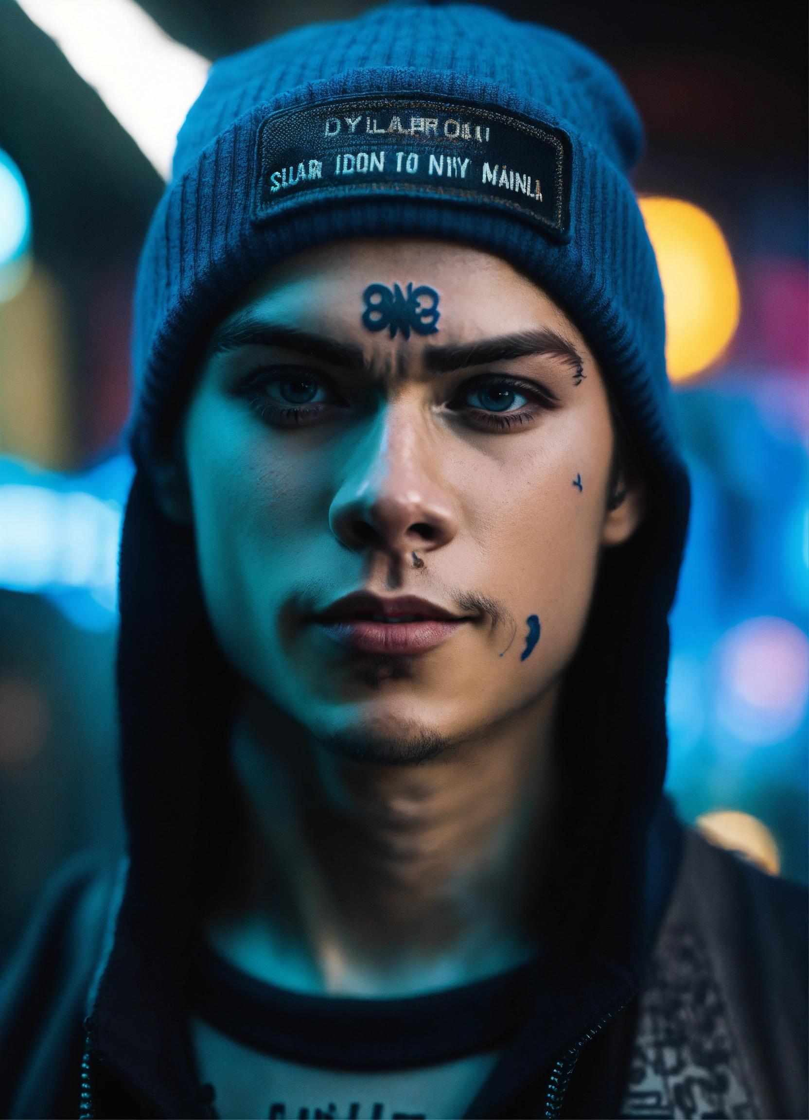 Highly detailed portrait of dylan obrien, blue beanie, face tattoos, black streetwear, cyberpunk, realism, black, grunge aesthetic!!! bokeh