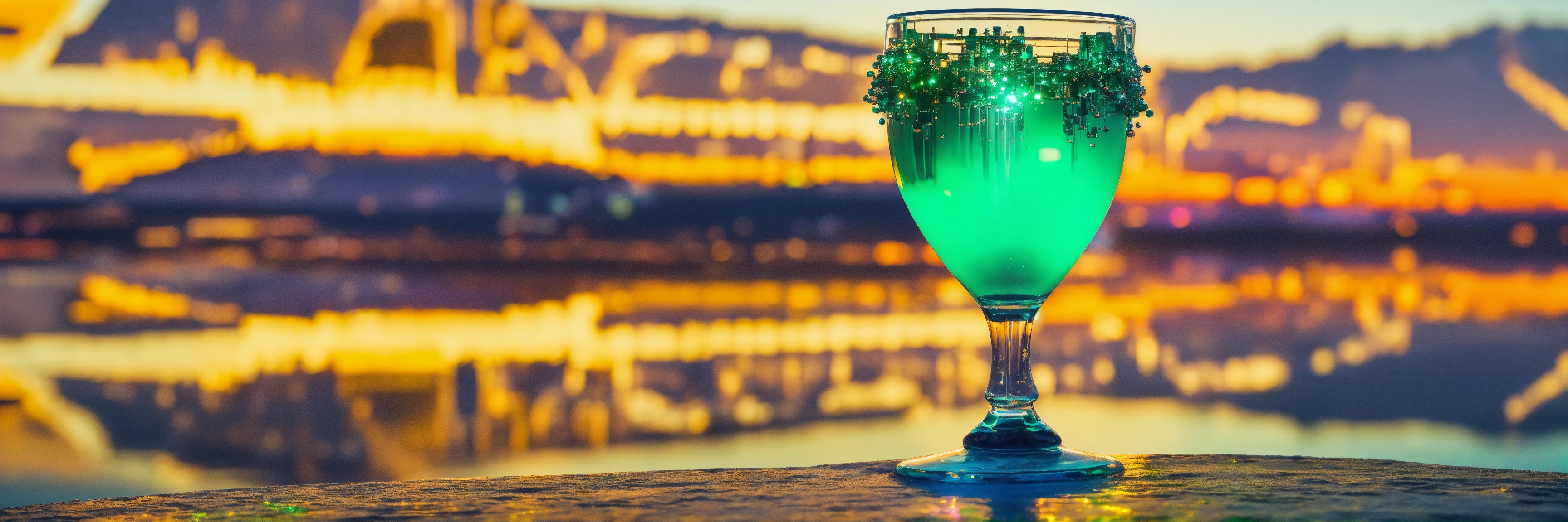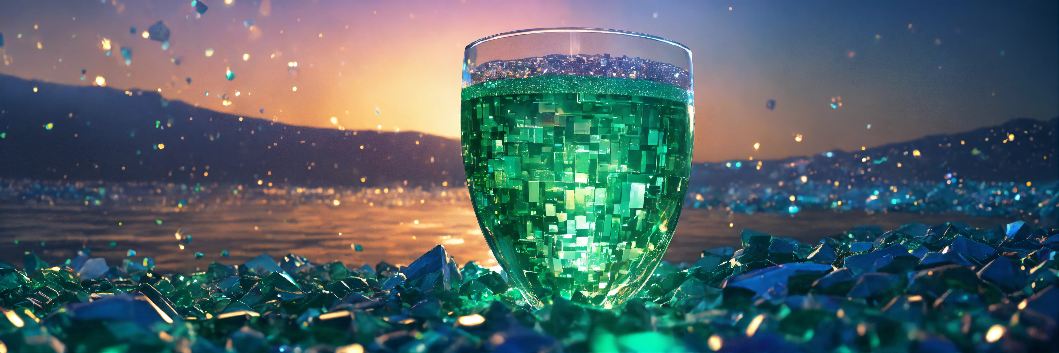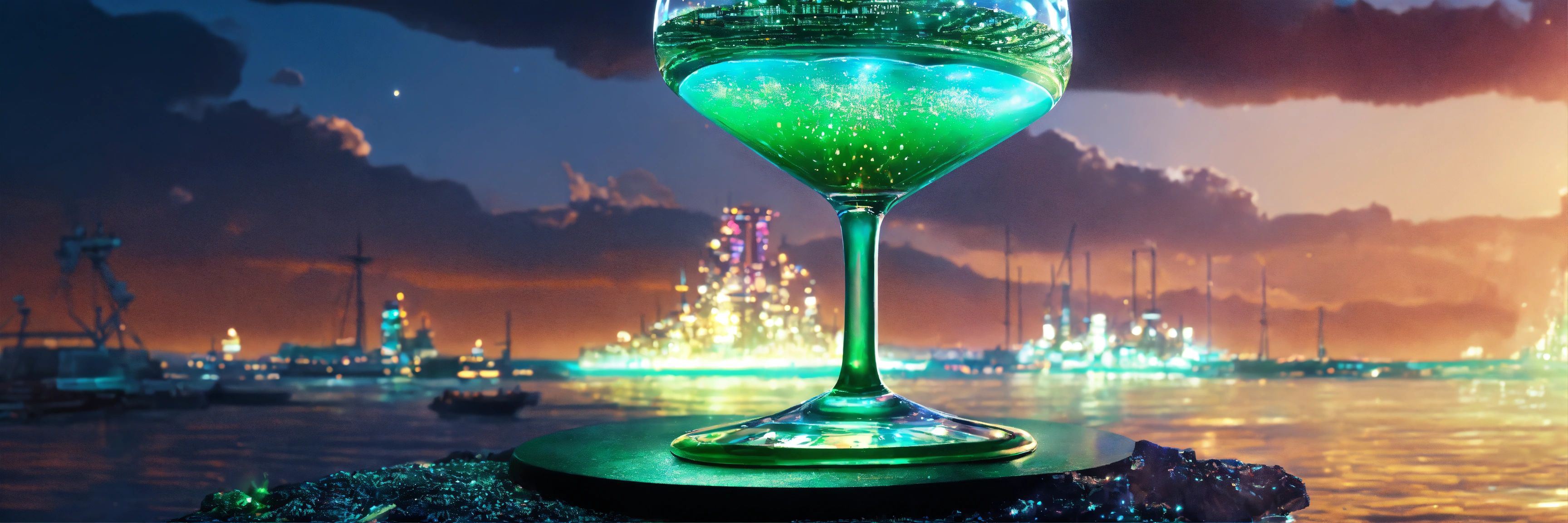 A cyberpunk wine glass in the middle of a ocean, cyberpunk cityscape, sparkling emeralds, water made of sparkling emeralds, white, sparkling emeralds with a futuristic ship inside the cup chains around the cup in 8k, high resolution, --, high definition, elemental, hyperealistic, snowing, sunset in the background, full scale, large, juxtaposition, intergalactic, text vision.