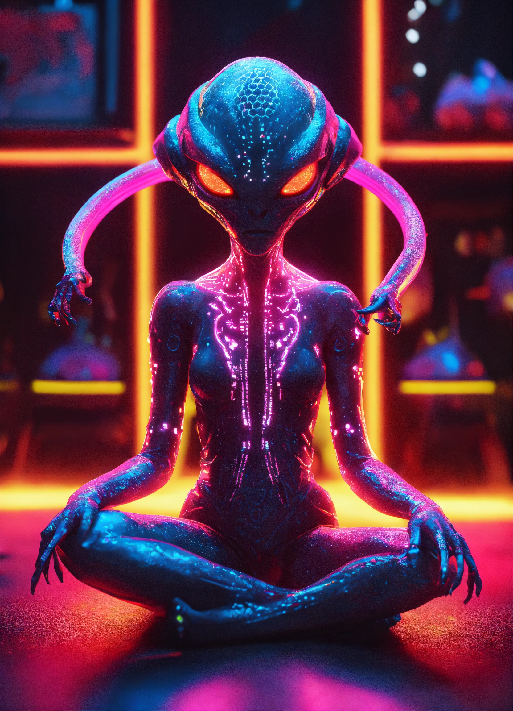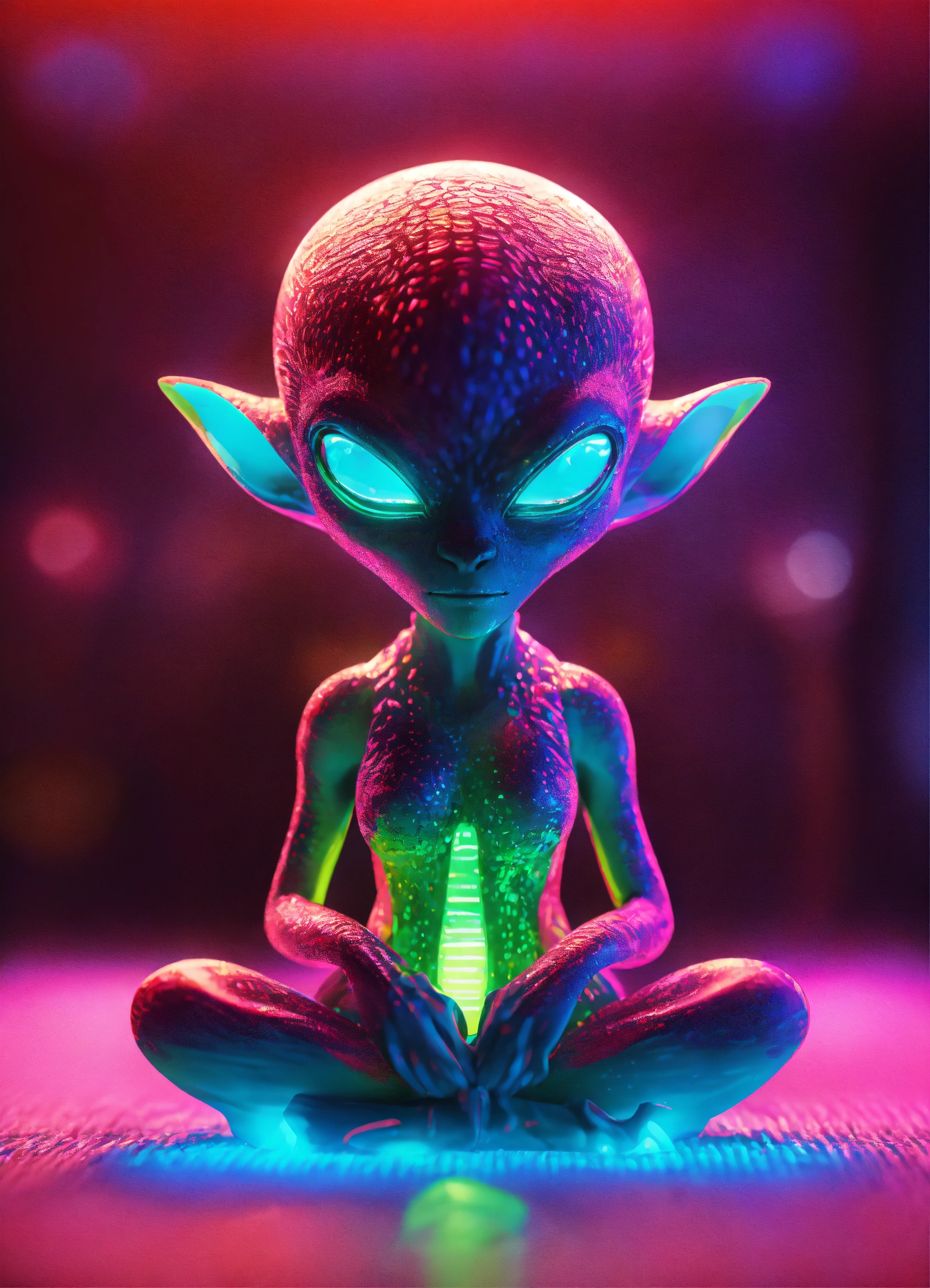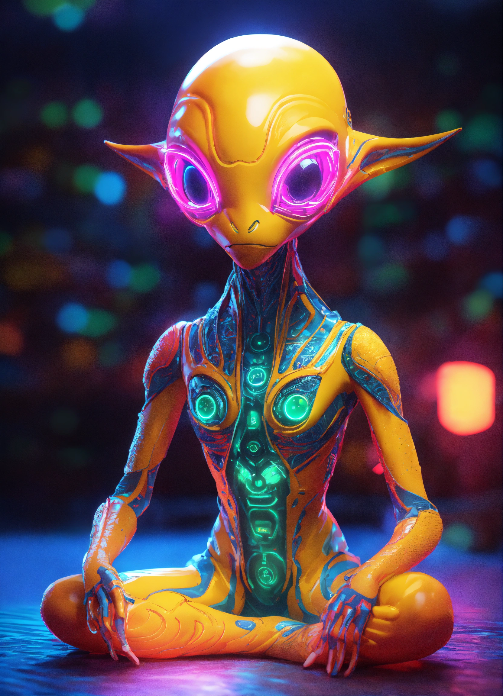 Cute alien monster, full-body, neon glow colors, highly intricate details, 3d, cgi, realistic light, trending on cgsociety, glowing eyes, facing camera, neon details, ultra realistic details, portrait, sci fi atmosphere, global illumination, shadows, octane render, 8 k, ultra sharp, sitting in yoga lotus pose
