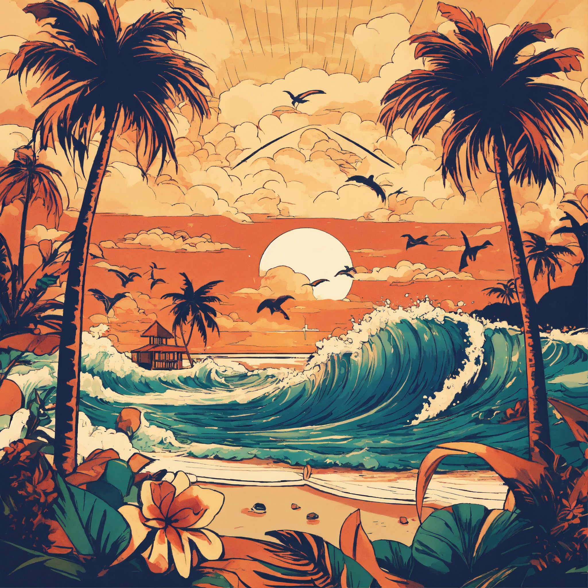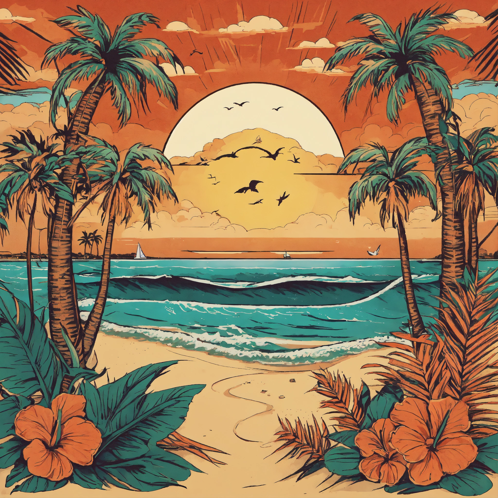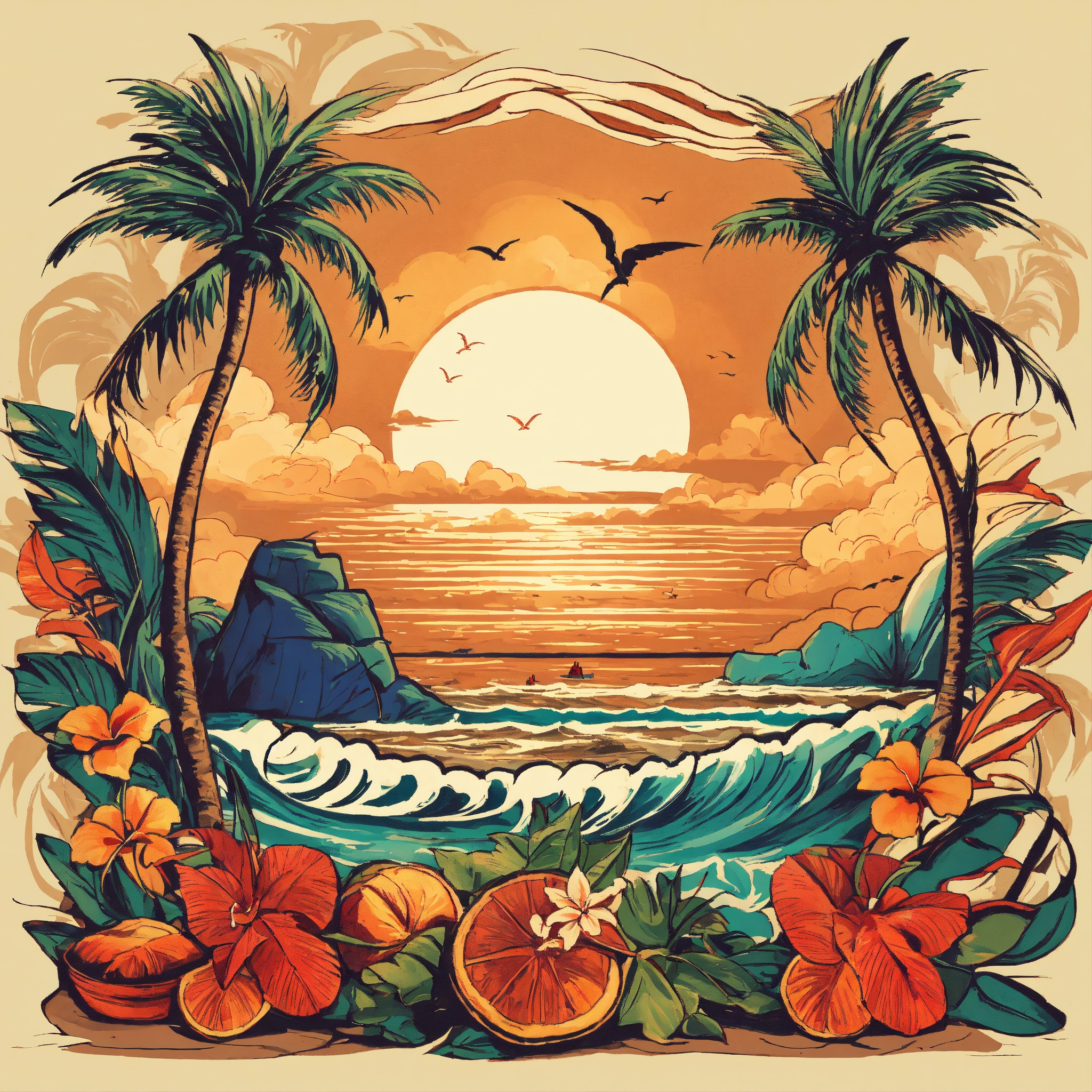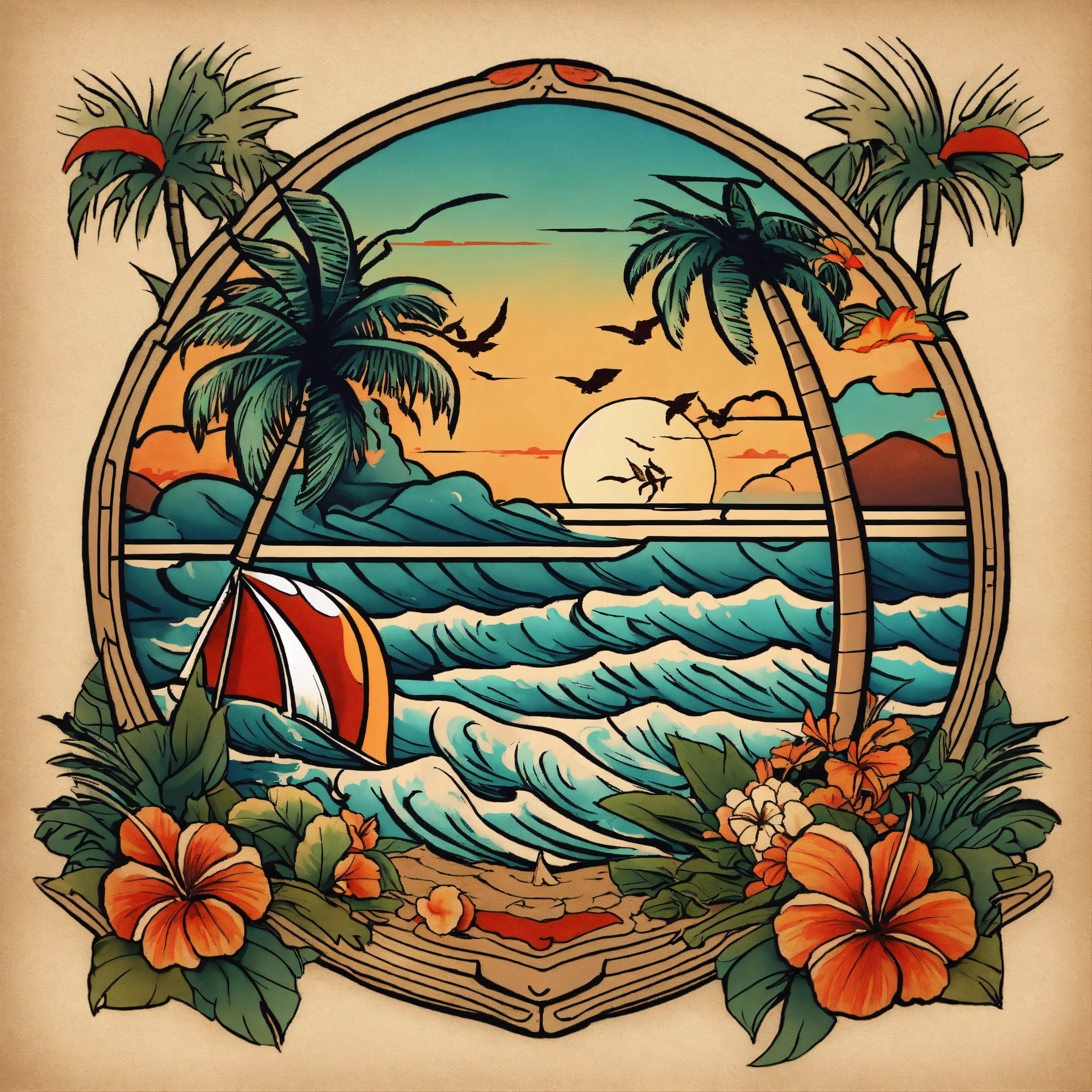 Artistic image type of image tattoo art-inspired digital illustration prompt description create a stunning digital illustration that takes inspiration from the iconic sailor jerry tattoo art style, featuring a beach scene with palm trees, ocean waves, and a lush tropical setting. the artwork will capture the essence of traditional tattoo art with its bold lines and classic motifs, infused with the allure of a tropical paradise.