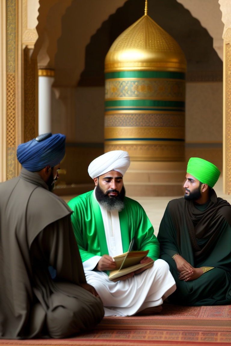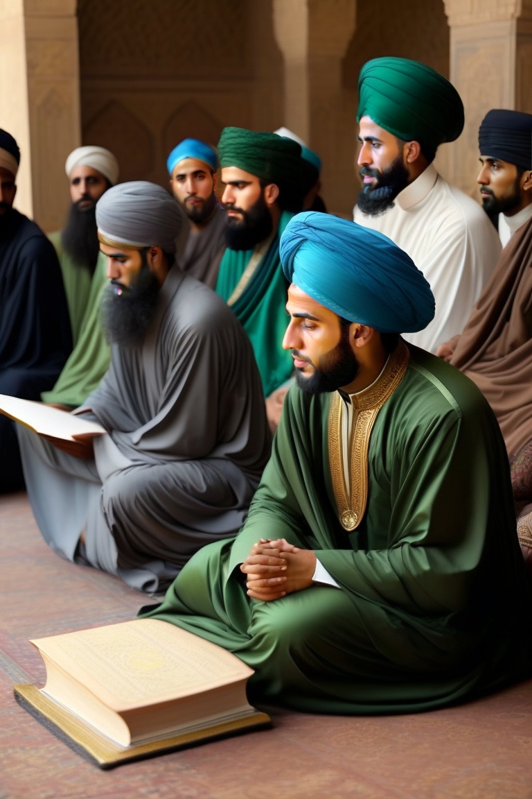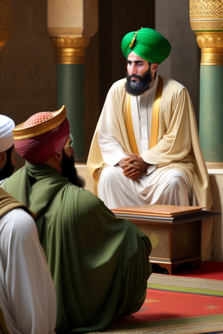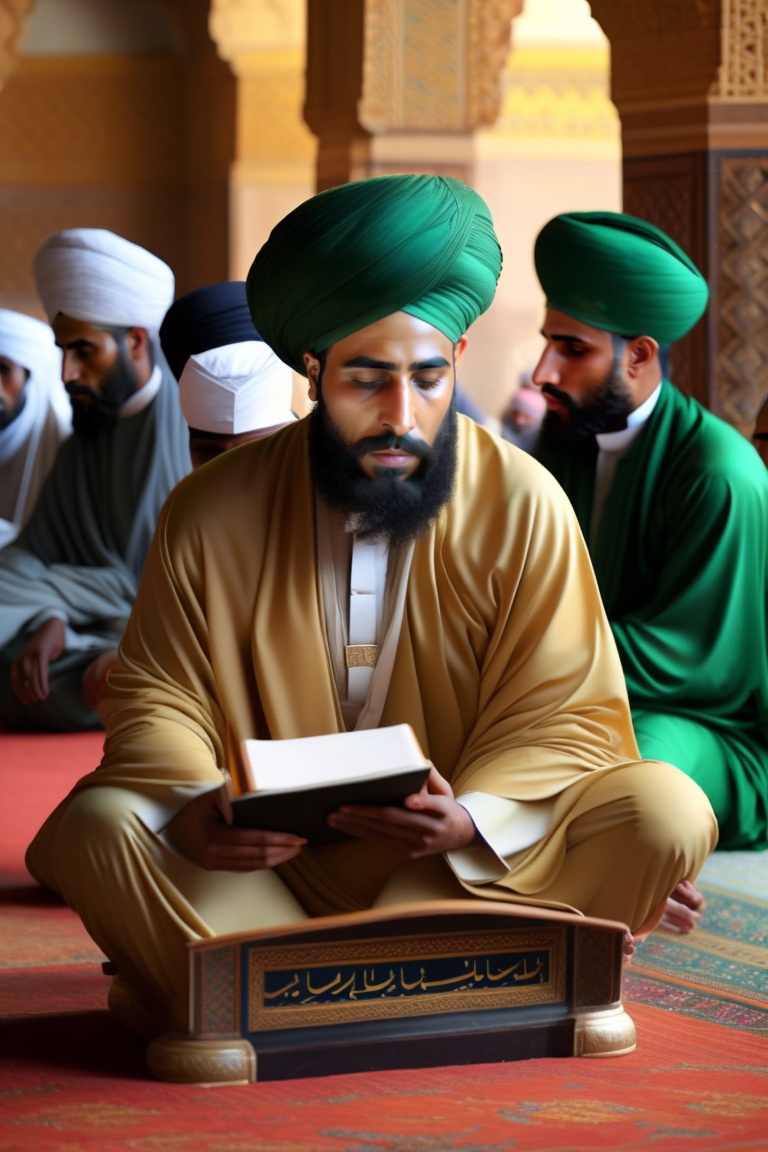 Imam abu hanifa is seated cross-legged, wearing a green robe and a black turban on his head. in front of him, there is a lectern with a book on it. he is giving a lesson on jurisprudence to his four students who are sitting in front of him. they are conducting this lesson inside a mosque in kufa, designed in the architectural style of the abbasid era. all of them are wearing turbans on their heads.